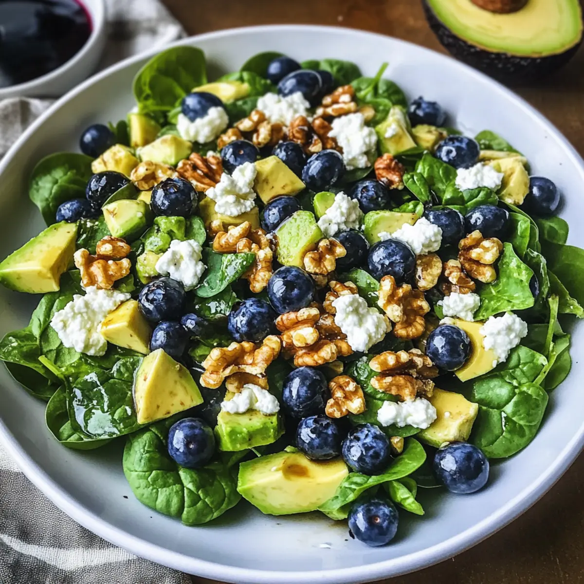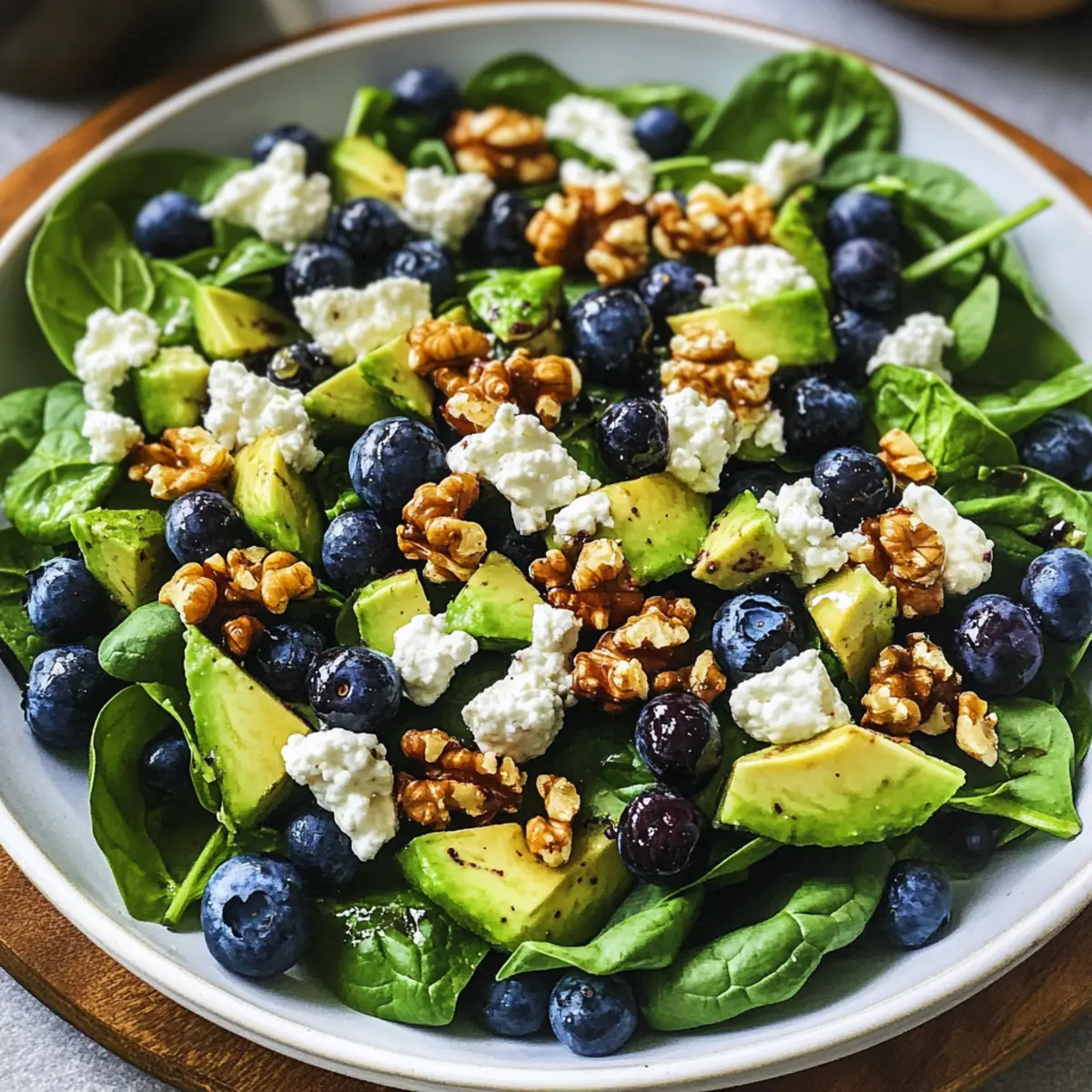 Der Sommer steht vor der Tür und mit ihm die Sehnsucht nach leichten, frischen Gerichten. Heute teile ich mit dir mein Geheimnis für einen köstlichen 20-Minuten Spinat Heidelbeer Salat, der nicht nur die Geschmacksnerven verwöhnt, sondern auch wunderbar gesund ist. Die Kombination aus saftigen Heidelbeeren, cremigem Ziegenkäse und knackigen Walnüssen sorgt für ein Geschmackserlebnis, das perfekt in die warme Jahreszeit passt. Und das Beste daran? Du kannst ihn in nur 20 Minuten zubereiten, was ihn zu einer idealen Wahl für dein nächstes Sommerpicknick oder eine schnelle Beilage macht. Lass uns gemeinsam entdecken, wie einfach es ist, mit wenig Aufwand ein wahres Gaumenschmaus zu kreieren! Bist du bereit für den perfekten Salat? Warum wirst du diesen Salat lieben? Frische Zutaten: Dieser Salat nutzt saftige Heidelbeeren und frischen Spinat, die für einen lebendigen Geschmack sorgen. Leicht zu machen: In nur 20 Minuten zubereitet, ist er der perfekte Helfer für hektische Tage oder spontane Einladungen. Vielfältige Anpassungsmöglichkeiten: Du kannst Zutaten wie Avocado oder Mandeln ganz nach deinem Geschmack variieren. Gesund und nahrhaft: Vollgepackt mit Antioxidantien und gesunden Fetten, ist er nicht nur lecker, sondern auch nährstoffreich. Erfrischender Genuss: Ideal für den Sommer und eine großartige Ergänzung zu gegrilltem Fleisch oder als leichtes Hauptgericht – dieser Spinatsalat wird deine Gäste begeistern! Verpasse nicht auch die Gelegenheit, diesen Spinat Salat Rezept auszuprobieren. 20-Minuten Spinat Heidelbeer Salat Zutaten • Hier findest du die Zutaten für den köstlichen Salat, der in nur 20 Minuten zubereitet ist! Für den Salat Baby-Spinat – Die grüne Basis für den Salat; kann durch Rucola oder einen Frischkäse-Mix ersetzt werden. Frische Heidelbeeren – Fügen Süße und Saftigkeit hinzu; keine Substitution empfohlen, um den vollen Geschmack zu genießen. Rohes Walnüsse – Gewährleisten einen knackigen Biss; können durch Pekannüsse oder Mandeln ersetzt werden. Avocado – Sorgt für Cremigkeit; verwende Limettensaft auf geschnittenem Avocado, um das Braunwerden zu verhindern. Ziegenkäse – Bringt einen herzhaften, cremigen Geschmack; kann gegen Feta-Käse eingetauscht werden, wenn gewünscht. Frische Minze – Fügt eine erfrischende Note hinzu; kann weggelassen werden, wenn nicht verfügbar. Für das Dressing Olivenöl – Die Grundlage des Dressings; verwende extra natives Olivenöl für besseren Geschmack. Balsamico-Essig – Essenziell für die Säure des Dressings; keine Substitution empfohlen. Zitronensaft – Hebt die Frische im Dressing hervor; kann durch Apfelessig ersetzt werden. Knoblauchpulver – Verleiht dem Dressing Tiefe; frischer Knoblauch kann für einen intensiveren Geschmack verwendet werden. Honig – Süßt das Dressing; für vegane Optionen kann ahornsirup verwendet werden. Salz und Pfeffer – Verstärken die Aromen; passe die Menge nach deinem Geschmack an. Mach dich bereit, diesen erfrischenden 20-Minuten Spinat Heidelbeer Salat zu zaubern! Schritt-für-Schritt-Anleitung für den 20-Minuten Spinat Heidelbeer Salat Schritt 1: Dressing zubereiten In einer kleinen Schüssel oder einem Einmachglas, kombiniere 3 Esslöffel Olivenöl, 2 Esslöffel Balsamico-Essig, 1 Esslöffel Zitronensaft, 1 Teelöffel Knoblauchpulver, 1 Esslöffel Honig sowie Salz und Pfeffer nach Geschmack. Schüttle das Glas oder verquirle die Zutaten in der Schüssel kräftig für etwa 30 Sekunden, bis eine homogene Mischung entsteht. Schritt 2: Salatzutaten vorbereiten Wasche das Gemüse gut: 150 g Baby-Spinat und 100 g frische Heidelbeeren. Trockne alles vorsichtig mit einem Küchentuch ab. Schneide die Avocado in Würfel und träufle etwas Limettensaft darüber, um das Braunwerden zu verhindern. Stelle sicher, dass alle Zutaten frisch und knackig sind, um den besten Geschmack im 20-Minuten Spinat Heidelbeer Salat zu erzielen. Schritt 3: Salat zusammenstellen Nimm eine große Schüssel und gebe den vorbereiteten Baby-Spinat, die Heidelbeeren, 50 g gehackte Walnüsse, die geschnittene Avocado sowie 50 g zerbröckelten Ziegenkäse hinein. Füge nach Belieben frische Minzblätter hinzu. Mische die Zutaten vorsichtig, um die Beeren nicht zu zerdrücken, und sorge dafür, dass der Spinat gleichmäßig verteilt wird. Schritt 4: Dressing hinzufügen Gieße das vorbereitete Dressing aus Schritt 1 gleichmäßig über den Salat. Nutze eine große Gabel oder zwei Löffel, um die Zutaten sanft zu vermengen. Achte darauf, dass jedes Blatt Spinat und jede Frucht gut mit dem Dressing überzogen ist, was etwa 1–2 Minuten dauert. Der 20-Minuten Spinat Heidelbeer Salat sollte eine glänzende und frische Optik haben. Schritt 5: Serve und genießen Serviere den Salat sofort auf schönen Tellern oder in Schüsseln. Falls er nicht sofort gegessen wird, stelle das Dressing separat dazu, um die Frische der Zutaten zu erhalten. Der Salat hält sich gut im Kühlschrank, wenn du ihn im Voraus vorbereiten möchtest, aber für das beste Geschmackserlebnis sollte er frisch zubereitet werden. Vorbereitungsanleitung für den 20-Minuten Spinat Heidelbeer Salat Dieser 20-Minuten Spinat Heidelbeer Salat ist ideal für die Mahlzeitenplanung und spart dir Zeit an hektischen Tagen! Du kannst das Dressing bis zu 3 Tage im Voraus zubereiten. Lagere es in einem luftdichten Behälter im Kühlschrank, um die Frische zu erhalten. Die Heidelbeeren und der Baby-Spinat können ebenfalls bereits gewaschen und vorbereitet werden, allerdings empfehle ich, die Avocado erst kurz vor dem Servieren zuzubereiten, um das Braunwerden zu verhindern. Wenn du bereit bist, den Salat zu genießen, mische einfach die vorbereiteten Zutaten in einer Schüssel und füge das Dressing hinzu – so erhältst du einen genießerischen Salat, der genauso lecker ist wie frisch zubereitet! Lagerung und Einfrieren des 20-Minuten Spinat Heidelbeer Salats Fridge: Bewahre den Salat in einem luftdichten Behälter im K