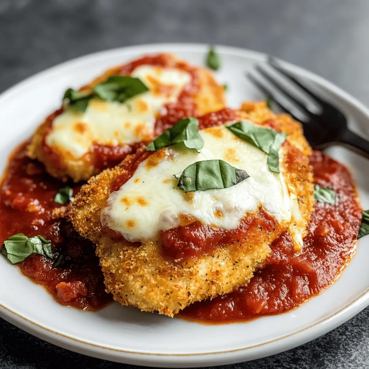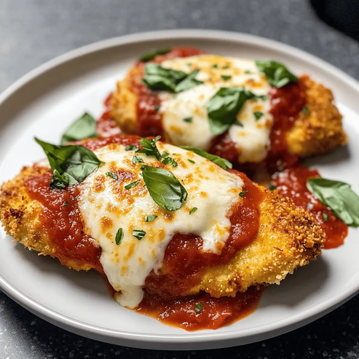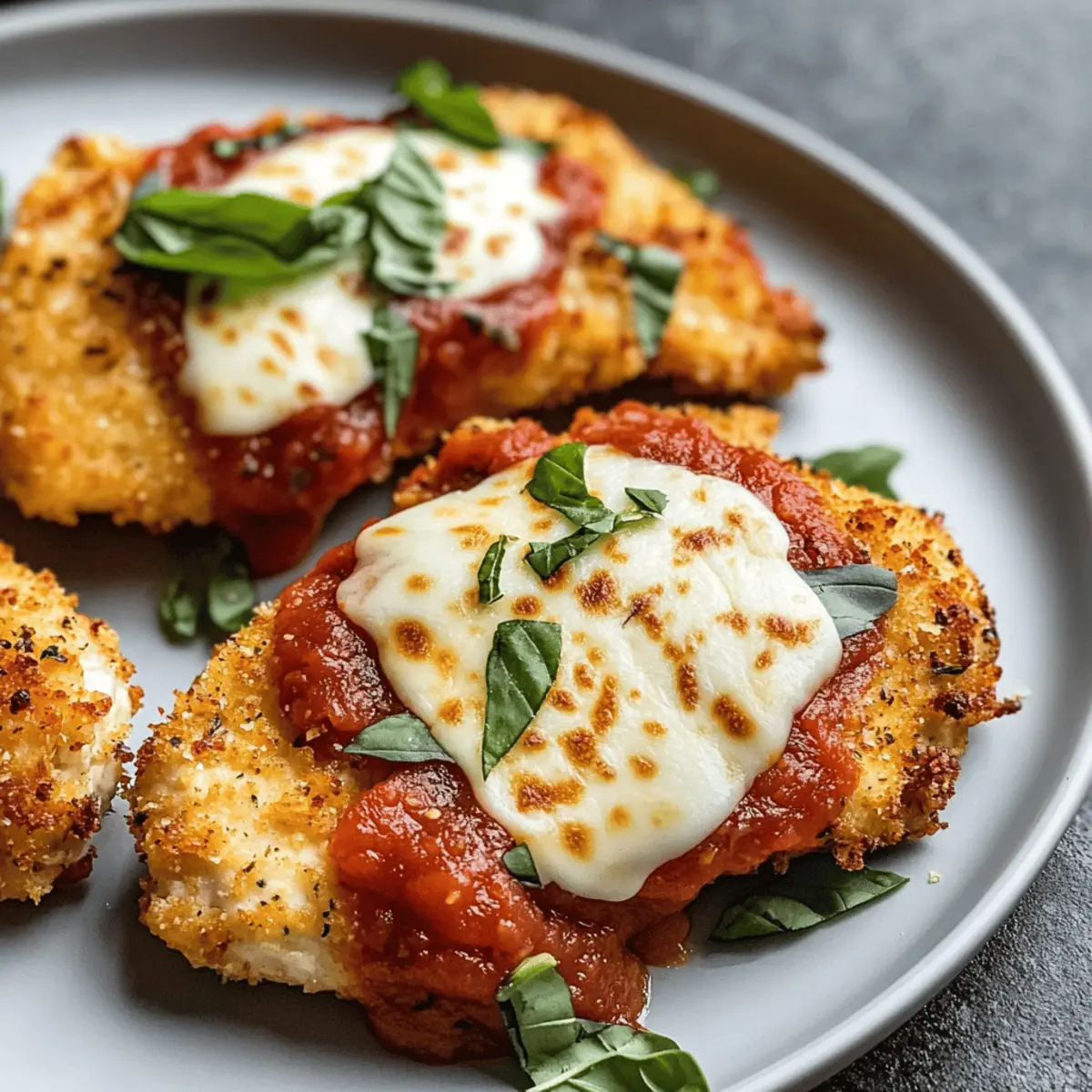 Während ich die Panko-Brösel in die Schüssel kippe, steigt der verführerische Duft von Oregano und Parmesankäse in die Luft. Wer hätte gedacht, dass Hintergrundgeräusche von müden Stimmen in der Küche und lebhafte Gespräche über den besten Restaurantbesuch der letzten Woche mich dazu bringen würden, ein Gericht zu kreieren, das alle begeistert? Mein Luftfritteusen-Hühnchen Parmesan ist nicht nur ein schnelles und gesundes Abendessen, das in unter 30 Minuten zubereitet ist, sondern auch ein echter Publikumsliebling, der die ganze Familie zusammenbringt. Die knusprige Textur und die geschmolzene Käsekruste machen dieses Rezept perfekt für geschäftige Wochentage. Lassen Sie uns gemeinsam entdecken, wie einfach es ist, eine köstliche Mahlzeit zu zaubern, die gleichzeitig den Gaumen erfreut und das Abendessen zu einem besonderen Moment macht! Wer ist bereit für eine Portion? Warum lieben alle dieses Rezept? Einfachheit und Schnelligkeit: In weniger als 30 Minuten haben Sie ein köstliches Gericht auf dem Tisch. Gesunde Option: Die Luftfritteuse sorgt für eine knusprige Textur, ohne das gesamte Öl, das bei herkömmlichen Zubereitungsmethoden benötigt wird. Vielfältige Serviermöglichkeiten: Kombinieren Sie es mit fluffigem Reis oder einem frischen Salat für ein ausgewogenes Erlebnis. Familienfreundlich: Dieses Rezept ist eine Hit bei Kindern und Erwachsenen zugleich! Lassen Sie den verführerischen Duft die Küche erfüllen und genießen Sie eine Runde Komplimente von Ihren Liebsten. Zutaten für Krosses Luftfritteusen-Hühnchen Parmesan • Tauchen Sie ein in die Welt des Geschmacks mit diesen einfachen Zutaten, die Ihr Gericht zum Höhepunkt jedes Essens machen. Für das Hühnchen Hühnchenbrust – Verwenden Sie etwa 1 lb, horizontal aufgeschnitten für gleichmäßiges Garen. Allzweckmehl – Hilft, die Panade an haften zu bleiben; ersetzen Sie es durch Mandel- oder glutenfreies Mehl für eine spannende Variante. Ei – Bindet die Panade an das Hühnchen; stellen Sie sicher, dass es gut verquirlt ist. Für die Panade Panko-Brösel – Sorgen für eine knusprige Textur durch größere Krümel; perfekt für das Air Fryer Erlebnis. Parmesankäse – Verleiht Geschmacksintensität und verbessert die Kruste; frisch gerieben ist der beste Weg. Getrockneter Oregano – Für ein aromatisches Geschmackserlebnis; es bringt mediterranes Flair auf den Teller. Salz – Unverzichtbar für die richtige Würze. Für den Belag Marinara-Sauce – Sorgt für Feuchtigkeit und Geschmack; wählen Sie Ihre Lieblingsmarke für einen persönlichen Touch. Mozzarella-Käse – Schmilzt schön über das Hühnchen; verwenden Sie geriebenen Käse für eine gleichmäßige Verteilung. Frische Basilikumblätter – Bringt beim Servieren eine frische, aromatische Note; genau das, was Ihr Gericht braucht! Lassen Sie sich von diesen einfachen Zutaten inspirieren und zaubern Sie Ihr eigenes, köstliches Luftfritteusen-Hühnchen Parmesan – der Ausgang für ein unvergessliches Abendessen! Schritt-für-Schritt-Anleitung für Krosses Luftfritteusen-Hühnchen Parmesan Step 1: Hühnchen vorbereiten Schneiden Sie die Hühnchenbrust horizontal in zwei Hälften, um dünne Filets zu erhalten. Dies ermöglicht eine gleichmäßige Garzeit und hilft dabei, dass das Hühnchen innen saftig bleibt. Die Vorbereitung ist entscheidend, um das krosse Luftfritteusen-Hühnchen Parmesan perfekt hinzubekommen. Step 2: Panade einrichten Bereiten Sie drei flache Schüsseln vor: eine mit Allzweckmehl, eine mit gut verquirltem Ei und eine dritte mit einer Mischung aus Panko-Bröseln, getrocknetem Oregano, Parmesan und Salz. Diese Struktur macht den Panierprozess einfach und effizient, sodass das Hühnchen gleichmäßig paniert werden kann. Step 3: Panierprozess durchführen Tauchen Sie ein Hühnchenfilet zuerst in das Mehl, schütteln Sie überschüssiges Mehl ab, dann in das geschlagene Ei und schließlich gründlich in die Panko-Mischung, sodass das Hühnchen gleichmäßig bedeckt ist. Dieser Prozess sorgt für eine super knusprige Kruste beim Luftfrittieren und ist der Schlüssel zum besten Krossen Luftfritteusen-Hühnchen Parmesan. Step 4: Kochen Heizen Sie die Luftfritteuse auf 200 °C vor, für etwa 5 Minuten. Legen Sie die panierten Hühnchenfilets in den Korb der Luftfritteuse und garen Sie sie 10 Minuten lang. Wenden Sie das Hühnchen nach der Hälfte der Garzeit, um eine gleichmäßige Bräunung zu erreichen. Achten Sie darauf, dass das Hühnchen eine Innentemperatur von 75 °C erreicht. Step 5: Marinara und Käse auftragen Nach dem Garprozess nehmen Sie das Hühnchen aus der Luftfritteuse und löffeln Sie etwas Marinara-Sauce über jedes Filet. Streuen Sie dann den geriebenen Mozzarella darüber und drücken Sie ihn leicht an, damit er hält. Setzen Sie das Hühnchen für weitere 1-2 Minuten in die Luftfritteuse, bis der Käse geschmolzen ist und sprudelt. Step 6: Servieren Garnieren Sie Ihr fertiges Krosses Luftfritteusen-Hühnchen Parmesan mit frisch zerrissenen Basilikumblättern. Diese aromatische Ergänzung ist nicht nur eine Augenweide, sondern rundet das Geschmackserlebnis perfekt ab. Genießen Sie das Gericht warm und lassen Sie sich von seinem köstlichen, knusprigen Charakter begeistern! Was passt zu Krossem Luftfritteusen-Hühnchen Parmesan? Genießen Sie köstliche Ergänzungen, die das Aroma des knusprigen Hühnchen Parmesan perfekt unterstreichen und eine wunderschöne, abwechslungsreiche Mahlzeit kreieren. Fluffiger Reis: Das sanfte, weiche Reisbett harmoniert ideal mit der würzigen Marinara-Sauce und dem geschmolzenen Käse. So entsteht ein rundum leckeres Geschmackserlebnis. Frischer Kale-Salat: Knackige, grüne Blätter mit einem spritzigen Dressing bringen Frische und Balance auf den Teller und machen das ganze Gericht besonders leicht. Geröstetes Gemüse: Bunte, geröstete Zucchini und Paprika sorgen für zusätzliche Farbtupfer und eine süße Note, die das krosse Hühnchen wunderbar ergänzt. Zu