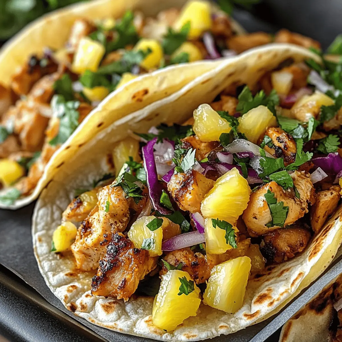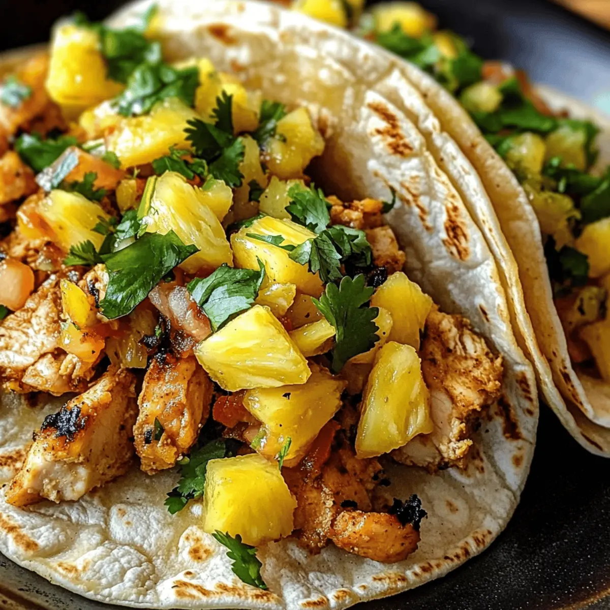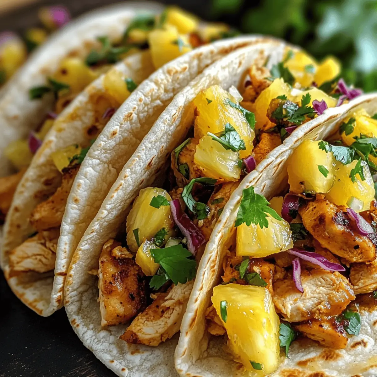 Bei einem sonnigen Abend, als die Grilllust in der Luft lag, stellte ich fest, dass nichts besser passt als eine Portion frischer Tacos. Diese Pineapple Chicken Tacos sind eine köstliche Mischung aus süßen, herzhaften und würzigen Aromen – eine wahre tropische Geschmacksexplosion. Mit saftigem Hühnchen und lebhafter Ananas bringen diese Tacos nicht nur Freude auf den Tisch, sondern sind auch schnell zubereitet und einfach zu variieren. Egal, ob du ein entspanntes Wochendinner planst oder Freunde zu einem gemeinsamen Essen einlädst, diese Tacos sind die perfekte Wahl. Lässt sich auch vegetarisch zubereiten! Mach dich auf den Weg zu einem unvergesslichen Geschmackserlebnis – welche kreativen Toppings wirst du wählen? Warum wirst du diese Tacos lieben? Tropischer Genuss: Diese Tacos sind eine herrliche Kombination aus süß und herzhaft, ideal für jeden Anlass. Einfache Zubereitung: Mit nur wenigen Zutaten und minimalem Aufwand kannst du im Handumdrehen ein Gericht zaubern, das jeden begeistert. Vielseitigkeit: Ob du Hühnchen, Garnelen oder sogar Tofu verwendest, die Anpassungsmöglichkeiten sind unendlich! Gesund und lecker: Diese Tacos sind nicht nur köstlich, sondern auch gesund und nahrhaft – perfekt für alle, die schnelle und gesunde Mahlzeiten lieben. Für jeden geeignet: Mit Optionen für Vegetarier und abwechslungsreichen Toppings, sind sie die ideale Wahl für eine gesellige Runde. Lasst euch von diesen Ananas-Hähnchen-Tacos inspirieren und entdecke auch die köstlichen Rezepte wie Wuerzige Chinakohl Rinderhack oder für ein frisches Abendessen den Spinat Salat Rezept! Ananas-Hähnchen-Taco-Zutaten Für das Hähnchen • Hähnchenbrustfilets ohne Haut – Hauptprotein, das Substanz bietet; kann durch Tofu für eine vegetarische Option ersetzt werden. • Sojasauce – Fügt Umami und Salzigkeit hinzu; verwende Tamari für glutenfreie Variante. • Honig – Süßt und balanciert die Aromen; Ahornsirup kann als veganer Ersatz dienen. • Reisessig – Für Säure und Helligkeit; weißer Essig oder Zitronensaft können im Notfall verwendet werden. • Sesamöl – Verleiht der Marinade Nussigkeit; jedes Pflanzenöl ist ein neutraler Ersatz. • Frischer Ingwer – Fügt Wärme und Komplexität hinzu; gemahlener Ingwer kann verwendet werden, aber die Menge anpassen. • Knoblauch – Liefert aromatischen Geschmack; verwende Knoblauchpulver, wenn frischer nicht verfügbar ist. • Rote Pfefferflocken (optional) – Fügt Schärfe hinzu, kann je nach Vorliebe angepasst werden. Für die Salsa • Frische Ananas – Hauptbestandteil für Süße und Textur; Dosenananas kann verwendet werden, wenn frische nicht verfügbar ist. • Rote Paprika – Fügt Knusprigkeit und Süße hinzu; andere Paprika können je nach Vorliebe ersetzt werden. • Rote Zwiebel – Bietet Schärfe und Farbe; kann durch Frühlingszwiebeln ersetzt werden. • Koriander – Frische Kräuter für Helligkeit, kann für ein anderes Geschmacksprofil weggelassen werden. • Jalapeño (optional) – Fügt Schärfe hinzu, kann für mildere Tacos entfernt werden. • Limettensaft – Sorgt für frische Säure; Zitronensaft kann eine geeignete Alternative sein. • Salz – Verbessert den Gesamtgeschmack. Für die Tacos • Mais- oder Weizentortillas – Basis für die Tacos; glutenfreie Tortillas können die Weizenvarianten ersetzen. • Olivenöl – Wird zum Kochen des Hähnchens verwendet; andere Kochöle können ersetzt werden. • Geriebener Kohl/Coleslaw-Mix – Fügt Textur und Knusprigkeit hinzu; jede Art von Slaw kann verwendet werden. • Optionale Toppings – Avocadoscheiben, Sriracha-Mayo, Limettenviertel für Anpassungen. Lass dich von diesen Ananas-Hähnchen-Tacos inspirieren und probiere die fruchtigen Variationen aus – eine wahre Geschmacksexplosion wartet auf dich! Step-by-Step Instructions für Ananas-Hähnchen-Tacos Step 1: Hähnchen marinieren Verrühre in einer Schüssel die Sojasauce, den Honig, den Reisessig, das Sesamöl, den frischen Ingwer, den Knoblauch und die roten Pfefferflocken. Lege die Hähnchenbrustfilets in die Marinade, sodass sie gut bedeckt sind. Decke die Schüssel ab und stelle sie für mindestens 30 Minuten bis zu 4 Stunden in den Kühlschrank, damit die Aromen gut einziehen können. Step 2: Ananas-Salsa zubereiten In einer separaten Schüssel mische die gewürfelte Ananas, die rote Paprika, die gehackte Zwiebel, den Koriander, die Jalapeño (falls verwendet), den Limettensaft und das Salz. Rühre alles gut um, bis die Zutaten gut vermischt sind, und stelle die Salsa bis zur Weiterverarbeitung in den Kühlschrank, damit die Aromen sich entfalten können. Step 3: Hähnchen kochen Erhitze in einer großen Pfanne etwas Olivenöl bei mittlerer Hitze. Nimm das marinierte Hähnchen aus dem Kühlschrank und lege es in die heiße Pfanne. Brate das Hähnchen 5-7 Minuten pro Seite, bis es goldbraun und durchgegart ist (innere Temperatur sollte 75°C betragen). Lasse das Hähnchen anschließend kurz ruhen. Step 4: Tortillas erwärmen Während das Hähnchen ruht, erwärme die Tortillas nach Wunsch. Eine Möglichkeit ist, sie in einer trockenen Pfanne bei mittlerer Hitze für jeweils 30 Sekunden pro Seite zu erhitzen. Alternativ kannst du sie auch in der Mikrowelle für 10-15 Sekunden erwärmen. Halte sie danach in einem sauberen Geschirrtuch warm. Step 5: Tacos zusammenstellen Nehme eine warme Tortilla und lege eine Schicht geriebenen Kohl oder Coleslaw-Mix hinein. Füge dann das gebratene Hähnchen und die frische Ananas-Salsa darauf hinzu. Du kannst die Tacos nach Belieben mit optionalen Toppings wie Avocadoscheiben, Sriracha-Mayo oder Limettenvierteln garnieren. Serviere die Tacos sofort und genieße den tropischen Genuss! Expert Tips für Ananas-Hähnchen-Tacos • Marinierzeit beachten: Je länger das Hähnchen mariniert, desto intensiver wird der Geschmack. Mindestens 30 Minuten sind ideal, aber 4 Stunden bringen das Beste hervor. • Grillen für Aroma: Wenn möglich