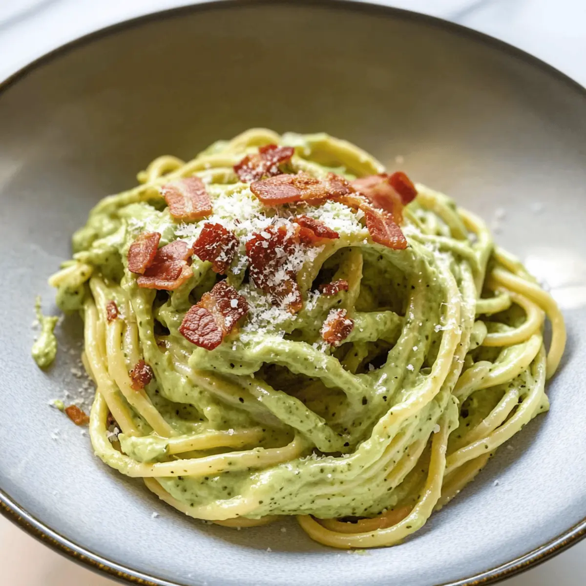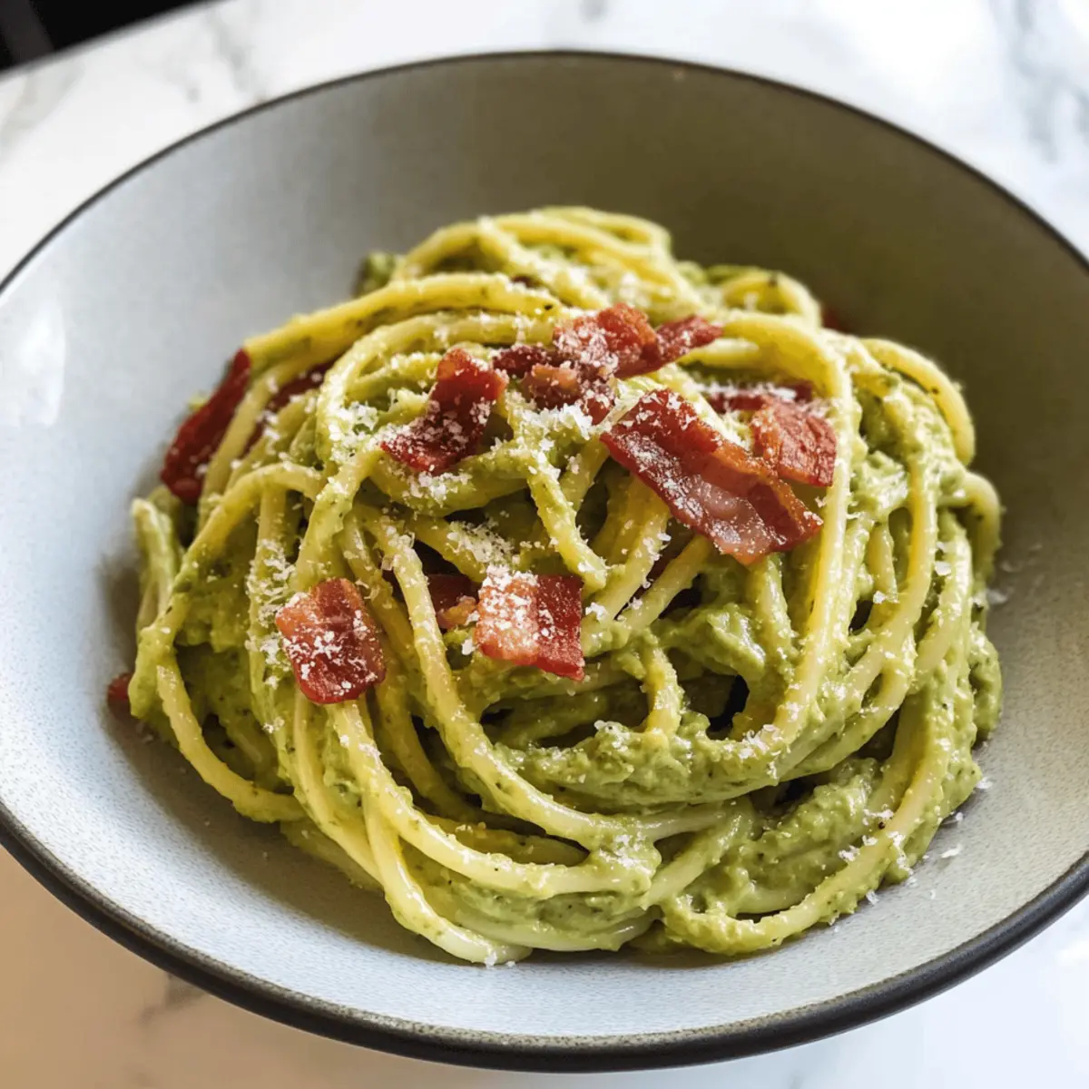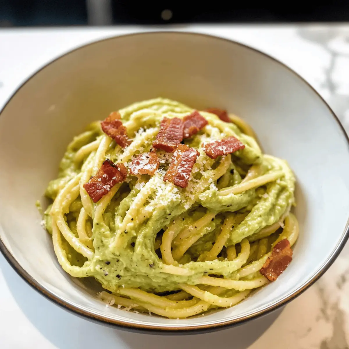 Ein Genuss für die Sinne: Mein Rezept für cremige Avocado Carbonara vereint die Güte frischer Zutaten mit einem Hauch von italienischer Tradition. In weniger als 30 Minuten zubereitet, ist dieses Gericht nicht nur perfekt für hektische Wochentage, sondern auch eine gesunde Option für alle, die sich vom Fast Food abwenden möchten. Durch die Kombination von nährstoffreichen Avocados und sättigenden Linguini kommt hier eine Pasta auf den Tisch, die sowohl herzerwärmend als auch leicht ist. Wer könnte da widerstehen? Lass uns gemeinsam in die Welt dieser schnellen, köstlichen Kreation eintauchen! Warum solltest du Avocado Carbonara probieren? Gesunde Zutaten: Diese Pasta vereint die Nährstoffe von Avocados und Gemüse, was sie zu einer großartigen Wahl für deine Gesundheit macht. Schnelle Zubereitung: In weniger als 30 Minuten bist du bereit, ein köstliches Gericht zu genießen. Perfekt für beschäftigte Tage! Cremiger Genuss: Die Kombination aus Avocado und Ei sorgt für eine samtige Sauce, die perfekt an den Nudeln haftet. Vielseitig anpassbar: Du kannst nach Belieben Gemüse hinzufügen oder die Bacon-Option weglassen, um sie vegetarisch zu machen. Wenn du mehr Abwechslung möchtest, probiere mal das Rezept für Hahnchen Avocado Schmelz oder Avocado Gefuellte Portobello! Perfekte Crowd-Pleaser: Dieses Gericht ist ideal, um Familie und Freunde zu beeindrucken – alle werden nach dem Rezept fragen! Avocado Carbonara Zutaten • Hinweis: Hier sind die köstlichen Zutaten, die du für die Zubereitung von Avocado Carbonara benötigst. Für die Pasta Linguini-Nudeln – Die Basis des Gerichts und entscheidend für die Textur; verwende jede andere Pasta wie Spaghetti bei Bedarf. Pasta-Wasser – Für die Anpassung der Konsistenz; immer einen Teil davon aufbewahren, bevor du die Nudeln abgießt. Für die Sauce Avocados – Sorgen für Cremigkeit und sind reich an gesunden Fetten; achte darauf, dass sie reif sind. Eigelb – Fügt reichhaltigen Geschmack hinzu und hilft, die Sauce zu emulgieren; für eine vegane Option durch Seidentofu ersetzen. Kale – Bringt Nährstoffe und Farbe ins Spiel; kann durch Spinat oder andere Blattgemüse ersetzt werden. Knoblauch – Sorgt für aromatische Tiefe; passe die Menge nach deinem Geschmack an. Olivenöl extra vergine – Verbessert die Cremigkeit; verwende hochwertiges Öl für den besten Geschmack. Zitronensaft – Bringt Frische und Akzente; Limettensaft kann ebenfalls verwendet werden. Koscheres Salz – Wichtig für die Würze; nach Belieben anpassen. Paprika – Für einen Hauch von Räuchergeschmack; geräucherte Paprika kann eine stärkere Note geben. Cayennepfeffer – Fügt etwas Schärfe hinzu; kann weggelassen werden, wenn du es milder magst. Bacon – Gibt einen herzhaften Crunch; für eine vegetarische Variante weglassen und stattdessen knusprige Champignons verwenden. Parmesan-Käse – Für einen umami-reichen Geschmack; ersetze ihn durch Nährhefe für eine milchfreie Option. Jede Zutat in diesem Rezept trägt dazu bei, ein gesundes, cremiges und schnelles Pasta-Gericht zu kreieren, das sowohl für dich selbst als auch für Gäste ein Hit sein wird! Schritt-für-Schritt-Anleitung für Avocado Carbonara Step 1: Nudeln kochen Bringe einen großen Topf mit salzwasser zum Kochen. Füge die Linguini-Nudeln hinzu und koche sie für 8–10 Minuten, bis sie al dente sind. Bevor du die Nudeln abgießt, hebe eine Tasse des Pasta-Wassers auf, um die Konsistenz der Sauce später anzupassen. Abgießen und beiseitestellen. Step 2: Sauce zubereiten In einem Mixer oder einer Küchenmaschine kombinierst du Avocados, Eigelb, Kale, Knoblauch, Olivenöl, Zitronensaft, Salz, Paprika und Cayennepfeffer. Püriere die Mischung für 1–2 Minuten, bis sie eine glatte und cremige Konsistenz erreicht. Achte darauf, alle Zutaten gut zu vermengen, um eine einheitliche Sauce zu erhalten. Step 3: Sauce anpassen Lass den Mixer laufen und füge langsam das aufbewahrte Pasta-Wasser hinzu. Mache dies schrittweise, bis die Sauce die gewünschte cremige Konsistenz hat. Dies dauert etwa 1–2 Minuten. Achte darauf, dass die Sauce nicht zu dünn wird, damit sie gut an den Nudeln haftet. Step 4: Nudeln mit der Sauce vermengen Nachdem du die linguini abgetropft hast, gib sie in eine große Schüssel. Gieße die cremige Avocado-Sauce über die warmen Nudeln. Mische alles gründlich, bis die Nudeln gleichmäßig mit der Sauce bedeckt sind. Achte darauf, dass die Nudeln gut mit der Sauce vermischt sind, um jeden Bissen zu genießen. Step 5: Finalisieren und servieren Füge den zerbröselten Bacon (oder die Ersatzoption für Vegetarier) und den geriebenen Parmesan zur Pasta hinzu. Rühre alles gut durch, damit sich der Bacon und der Käse gleichmäßig verteilen. Serviere die Avocado Carbonara sofort heiß, garniert mit zusätzlichem Käse, Bacon und einem Hauch von frisch gemahlenem Pfeffer. Was passt gut zu Avocado Carbonara? Erlebe, wie sich die Aromen und Texturen ergänzen, während du dein Herzstück kreativ vervollständigst. Knuspriges Baguette: Der perfekte Begleiter, um die cremige Sauce aufzusaugen und deinem Essen eine herzhafte Note zu verleihen. Frischer grüner Salat: Ein leichter, knackiger Salat mit tomatigen und zitronigen Noten bietet einen schönen Kontrast zur Cremigkeit und hebt das gesamte Erlebnis hervor. Gebackene Zucchini-Streifen: Diese zarten, leicht süßlichen Streifen bringen eine wunderbare Textur und schmackhafte Tiefe in Kombination mit dem Pasta-Gericht. Weißer Sangria: Ein spritziges, fruchtiges Getränk, das die Frische der Avocado Carbonara unterstreicht und perfekt für gesellige Abende ist. Zitronen-Mousse: Für den süßen Abschluss sorgt eine luftige Zitronen-Mousse für den idealen Kontrast zur herzhaften Pasta und erfrischt den Gaumen. Geröstete Kichererbsen: Knusprig und aromatisch, sie bringen Protein und einen zusätzlichen Crunch, der die geschmeidige Sauce ergänzt. Diese Kombinationen bieten dir eine bunte Palette a