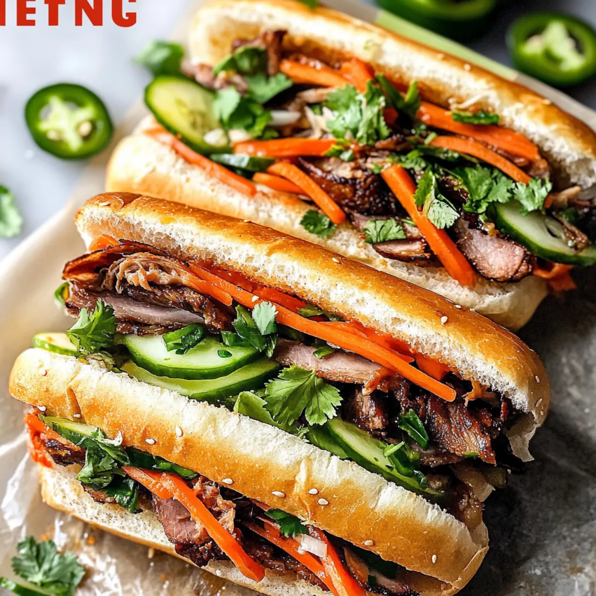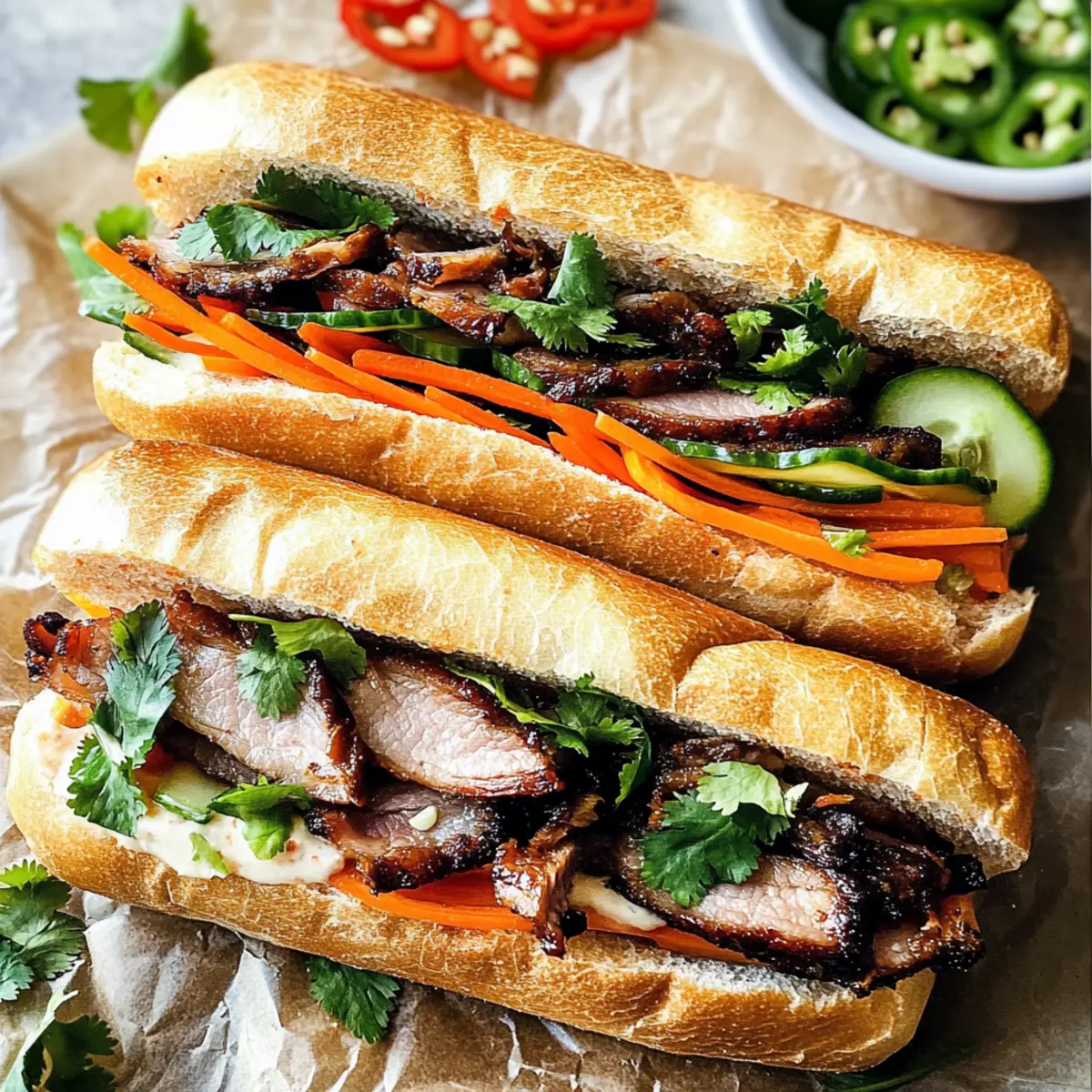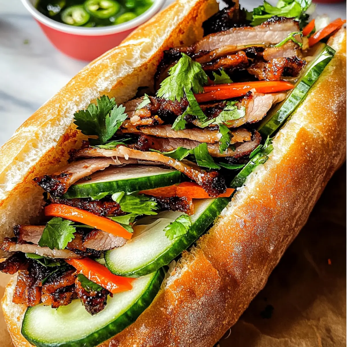 Als ich das erste Mal in Vietnam war, hat ein Banh Mi Sandwich ganz neue Geschmackshorizonte für mich eröffnet. Die Kombination aus knuspriger Baguettetextur und zart mariniertem Lemongrass-Schweinefleisch war einfach überwältigend. Diese leckere Kreation bringt Süßes, Saures, Scharfes und Umami perfekt zusammen und macht sie zu einem echten Genuss. Mit diesem Rezept für einen Banh Mi Sandwich wirst du im Handumdrehen ein restaurantwürdiges Gericht zaubern, das auch deine Gäste begeistern wird. Ein weiterer Vorteil? Die Zubereitung ist schnell und einfach, ideal für alle, die sich von Fast Food verabschieden möchten! Was könnte besser sein als ein köstliches, selbstgemachtes Sandwich, das du nach deinem Geschmack abwandeln kannst? Warum wirst du dieses Rezept lieben? Einfachheit: Die Zubereitung dieses Banh Mi Sandwich ist unkompliziert und erfordert nur grundlegende Kochkenntnisse. Vielfalt: Du kannst die Zutaten nach deinen Vorlieben anpassen, sei es mit Hähnchen, Tofu oder unterschiedlichen eingelegten Gemüsen. Unvergesslicher Geschmack: Die Kombination aus zart mariniertem Fleisch, knackigem Gemüse und würziger Mayo sorgt für ein Geschmackserlebnis, das deine Geschmacksknospen jubeln lässt. Schnell zubereitet: Mit nur wenigen Schritten zauberst du im Handumdrehen ein köstliches Gericht für Familie oder Freunde, ideal für gesellige Abende. Gesunde Alternative: Dieses Sandwich ist eine nahrhafte, selbstgemachte Option, die perfekt gegen das Fast-Food-Einerlei ankämpft. Probiere auch diese anderen Variationen, um noch mehr kreative Ideen zu entdecken! Bahn Mi Sandwich Zutaten Für das Fleisch • Schweinefilet – Hauptprotein, das schnell gart und saftige Schichten liefert. • Schalotten – Fügen zarten Süße zur Marinade hinzu; können auch durch die Hälfte einer gelben Zwiebel ersetzt werden. • Lemongrass – Verleiht einen einzigartigen, zitrusartigen Geschmack, der für die Authentizität wichtig ist; alternativ 1 Esslöffel Lemongrass-Paste pro Stängel verwenden. • Fischsauce – Fügt Umami-Tiefe hinzu; essentiell für den traditionellen Geschmack, macht das Sandwich jedoch nicht fischig. • Austernsauce – Balanciert Süße und Salzigkeit in der Marinade; optimiere mit Marken wie Lee Kum Kee. • Limettensaft – Frische bringt die Aromen der Marinade zum Strahlen. • Ahornsirup & brauner Zucker – Sorgen für Süße, die die säuerlichen Aromen ausbalanciert; reiner Ahornsirup wird empfohlen. • Ingwer – Fügt Wärme und Tiefe hinzu; frische Ingwerwurzel ist am besten. • Knoblauch – sorgt für robusten Geschmack in der Marinade; Knoblauchpulver kann ebenfalls verwendet werden. • Geröstetes Sesamöl – Verstärkt die Marinade mit einem nussigen Aroma; wähle geröstetes Öl für den besten Geschmack. • Chilipaste – Fügt Schärfe hinzu; passe die Menge deinem persönlichen Geschmack an. • Gewürze (gemahlener Koriander & Chinesisches 5-Gewürz) – Komplementieren die Marinade mit komplexen Aromen und sind wichtig für die Authentizität, besonders ohne Pâté. Für das Gemüse • Reisessig – Zum Einlegen von Gemüse; ungewürzten wählen. • Zucker & Salz – Balancieren die Säure in den eingelegten Gemüse. • Karotten & Daikon-Rettich – Wichtig für Crunch und Säure, in Stifte geschnitten für die beste Textur; normale Radieschen können auch verwendet werden. Für das Sandwich • Baguettes – Das Grundgerüst des Sandwiches; knusprig und luftig sollte es sein; vietnamesische Baguettes sind ideal, aber jede knusprige Rolle funktioniert. • Mayonnaise – Dient als Aufstrich; kann mit Chilipaste verfeinert werden. • Gurke – Fügt erfrischenden Crunch hinzu; längs geschnitten für einfache Zubereitung. • Jalapeños – Geben Schärfe; dünn schneiden, um den Schärfegrad zu kontrollieren. • Koriander – Diese frische Kräuter bringen Licht und frische Note in das Sandwich. Mit diesen Zutaten bist du bestens gerüstet, um ein köstliches Bahn Mi Sandwich zu kreieren, das deine Geschmacksknospen verzaubern wird! Schritt-für-Schritt-Anleitung für das Bahn Mi Sandwich Step 1: Marinade vorbereiten Vermenge in einer Schüssel gehacktes Lemongrass, Schalotten, Fischsauce, Austernsauce, Limettensaft, Ahornsirup, braunen Zucker, frischen Ingwer, Knoblauch, geröstetes Sesamöl, Chilipaste sowie gemahlenen Koriander und Chinesisches 5-Gewürz. Rühre die Mischung gut um, bis alles gut vermengt ist. Diese Aromastoffe bringen das Schweinefleisch zum Strahlen und verleihen deinem Bahn Mi Sandwich die perfekten Aromen. Step 2: Schweinefilet marinieren Schneide das Schweinefilet längs in dünne Scheiben. Platziere die Fleischstücke in der vorbereiteten Marinade und stelle sicher, dass sie gleichmäßig überzogen sind. Lasse das Fleisch mindestens 4 bis 8 Stunden im Kühlschrank marinieren, damit die Aromen tief eindringen. Je länger du es marinerst, desto intensiver wird der Geschmack deines Bahn Mi Sandwich. Step 3: Gemüse einlegen Bringe in einem kleinen Topf Reisessig, Wasser und Zucker zum Kochen, um die Marinade für die eingelegten Gemüse vorzubereiten. Gieße diese Mischung über die in Stifte geschnittenen Karotten und Daikon-Rettiche in einem verschließbaren Behälter. Lasse das Gemüse für mindestens 1 Stunde im Kühlschrank ziehen, um die perfekte Balance aus Süße und Säure zu erreichen. Step 4: Schweinefilet braten Erhitze eine Grillpfanne bei mittlerer bis hoher Temperatur. Brate die marinierten Stücke des Schweinefilets 1 bis 2 Minuten auf jeder Seite, bis sie goldbraun und durchgegart sind. Achte darauf, dass das Fleisch saftig bleibt und sich leicht zerteilen lässt. Diese zarten Stücke bilden die köstliche Basis für dein Bahn Mi Sandwich. Step 5: Baguettes rösten Röste die Baguettes leicht im Ofen oder im Toaster, bis sie außen knusprig und innen luftig sind. Dies dauert nicht länger als 3-5 Minuten. Durch das Rösten wird verhindert, dass das Brot durch die feuchten Füllungen we