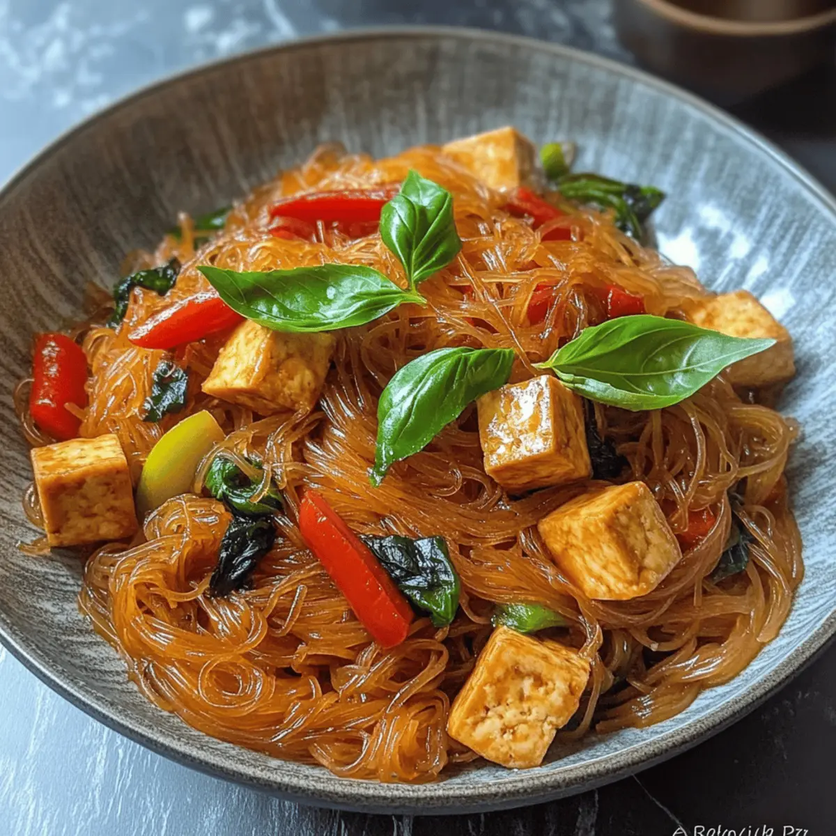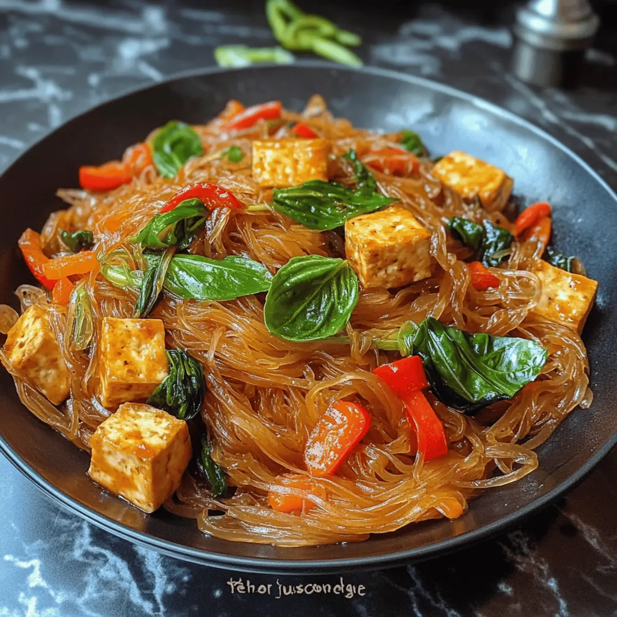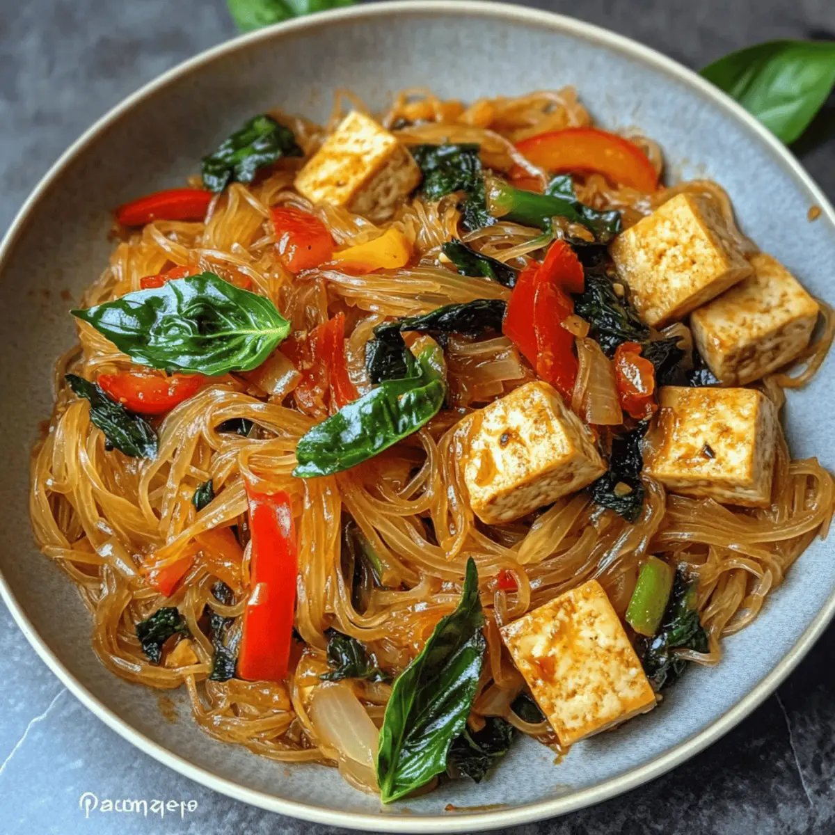 Wenn ich an die Aromen der asiatischen Küche denke, überkommt mich sofort ein Gefühl von Wärme und Glückseligkeit. Diese Vegan Basil and Tofu Vermicelli Noodles vereinen die lebendige Fusion von thailändischen und philippinischen Geschmäckern in einem Gericht, das sowohl einfach zuzubereiten als auch voller gesunder Zutaten ist. Mit den zähen, bohnenbasierten Nudeln und dem aromatischen Basilikum ist es nicht nur ein schneller Genuss für hektische Abende, sondern auch eine köstliche Möglichkeit, das Essen etwas spannender zu gestalten. Das Beste daran? Diese vielseitige Rezeptur lässt sich ganz nach Belieben mit verschiedenen Proteinen und Gemüsesorten abwandeln. Neugierig, wie Sie diese frische, geschmackvolle Schüssel auf den Tisch bringen können? Warum sind diese Nudeln ein Muss? Einfachheit: Die Zubereitung ist unkompliziert und erfordert nur grundlegende Kochkenntnisse. Vielfältig: Dieses Rezept ermöglicht zahlreiche Variationen, sei es mit Tofu, Tempeh oder sogar Hühnchen. Frischer Geschmack: Die Kombination aus aromatischem Basilikum und knackigem Gemüse sorgt für ein wahres Geschmackserlebnis. Gesundheitlich vorteilhaft: Mit etwa 209 Kalorien pro Portion ist dieses Gericht eine leichte, aber sättigende Option. Schnell zubereitet: Perfekt für hektische Abende, da es in kürzester Zeit auf dem Tisch steht. Ein Hit für alle: Egal, ob Veganer oder Flexitarier, diese Nudeln werden jeden begeistern, der frische und leckere Gerichte liebt. Kombinieren Sie sie mit einem Kaesekuchen Rezept Das für ein perfektes Abendessen! Basilikum-Tofu-Vermicelli-Nudeln Zutaten • Um diese köstlichen Basilikum-Tofu-Vermicelli-Nudeln zuzubereiten, benötigen Sie die folgenden Zutaten: Für die Nudeln Trockene Vermicelli oder Bohnenfäden – Diese bilden die Basis des Gerichts und sorgen für eine zähe Textur. Sie können auch Reis-Vermicelli oder Süßkartoffelnudeln verwenden. Für die Sauce Sojasauce – Für die würzige Tiefe. Verwenden Sie natriumarme Sojasauce, um den Salzgehalt zu reduzieren. Vegetarische Austernsauce/Stir-Fry-Sauce – Fügt umami Geschmack hinzu. Für eine glutenfreie Option verwenden Sie eine tamari-basierte Sauce. Kokoszucker – Verleiht Süße und balanciert die salzigen Komponenten. Sie können auch braunen Zucker oder Ahornsirup verwenden. Dunkle Sojasauce – Trägt zur Farbe und Reichhaltigkeit des Gerichts bei. Sie können sie weglassen, wenn sie nicht verfügbar ist, und mehr reguläre Sojasauce verwenden. Sriracha/Andere Chilisauce – Für den Schärfegrad; passen Sie die Menge je nach Schärfewunsch an. Für die Hauptzutaten Extra fester Tofu – Dient als Proteinquelle; kann für Variation durch Tempeh oder Seitan ersetzt werden. Neutrales Öl – Zum Braten des Tofus und der Gemüse. Verwenden Sie Sonnenblumen- oder Rapsöl. Paprika – Fügt Süße und Knusprigkeit hinzu; jede Farbe oder Sorte kann verwendet werden. Zwiebel – Bietet Geschmack und Aroma; süße Zwiebel ist vorzuziehen. Knoblauch – Verbessert den Gesamtschmack; frischer, gehackter Knoblauch wird empfohlen. Frisches thailändisches und heiliges Basilikum – Verleiht ein duftendes, kräuteriges Aroma; kann bei Bedarf durch süßes Basilikum ersetzt werden. Genießen Sie diese köstlichen Basilikum-Tofu-Vermicelli-Nudeln und lassen Sie sich von der Einfachheit und Vielfalt des Rezepts begeistern! Step-by-Step Instructions for Basilikum-Tofu-Vermicelli-Nudeln Step 1: Nudeln vorbereiten Weichen Sie die trockenen Vermicelli oder Bohnenfäden in einem großen Topf mit kochendem Wasser für 8-10 Minuten ein, bis sie zäh und weich sind. Achten Sie darauf, die Nudeln regelmäßig zu überprüfen, damit sie nicht überkochen. Nach dem Einweichen abgießen und zur Seite stellen. Step 2: Sauce zubereiten In einer Schüssel kombinieren Sie die Sojasauce, vegetarische Austernsauce, Kokoszucker, dunkle Sojasauce und Sriracha. Rühren Sie die Mischung gut um, bis der Zucker vollständig aufgelöst ist. Stellen Sie die Sauce beiseite und bereiten Sie die nächsten Schritte für die Basilikum-Tofu-Vermicelli-Nudeln vor. Step 3: Tofu braten Drücken und würfeln Sie den extra festen Tofu und erhitzen Sie in einer großen Pfanne bei mittlerer Hitze einen Esslöffel neutrales Öl. Braten Sie die Tofuwürfel für etwa 5-7 Minuten, bis sie goldbraun und knusprig sind. Fügen Sie einen Schuss Sojasauce hinzu, um den Tofu gleichmäßig zu beschichten. Step 4: Gemüse hinzufügen Schieben Sie den gebratenen Tofu an den Rand der Pfanne und geben Sie bei Bedarf etwas mehr Öl hinzu. Fügen Sie die in Scheiben geschnittenen Paprika, die Zwiebel und den gehackten Knoblauch hinzu und braten Sie alles unter Rühren 3-5 Minuten, bis das Gemüse zart ist. Mischen Sie dabei die Hälfte der Basilikumblätter unter. Step 5: Nudeln und Sauce kombinieren Jetzt können Sie die vorbereiteten Vermicelli oder Bohnenfäden zusammen mit der zuvor zubereiteten Sauce in die Pfanne geben. Rühren Sie sorgfältig um, damit die Nudeln gleichmäßig mit der Sauce überzogen sind. Kochen Sie alles zusammen für weitere 4-5 Minuten, um die Aromen zu vereinen. Step 6: Fertigstellen Probieren Sie die Basilikum-Tofu-Vermicelli-Nudeln und passen Sie die Gewürze nach Geschmack an. Fügen Sie die restlichen Basilikumblätter kurz vor dem Servieren zu, um den frischen Geschmack zu bewahren. Servieren Sie die Nudeln heiß und genießen Sie das köstliche Ergebnis! Bereiten Sie Ihre Basilikum-Tofu-Vermicelli-Nudeln im Voraus vor Diese Basilikum-Tofu-Vermicelli-Nudeln sind ideal für die Vorbereitung im Voraus! Sie können die Soße bis zu 3 Tage im Voraus zubereiten und im Kühlschrank aufbewahren, wodurch Sie wertvolle Zeit sparen. Weichen Sie die Vermicelli-Nudeln bis zu 24 Stunden vorher in kaltem Wasser ein, damit sie beim Kochen schneller durchziehen. Wenn Sie die Nudeln später zubereiten, tragen Sie dazu bei, dass sie ihre zähe Textur beibehalten. Bereiten Sie auch das Gemüse und den Tofu vor, indem Sie alles schneid