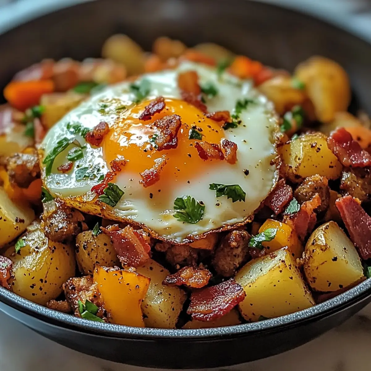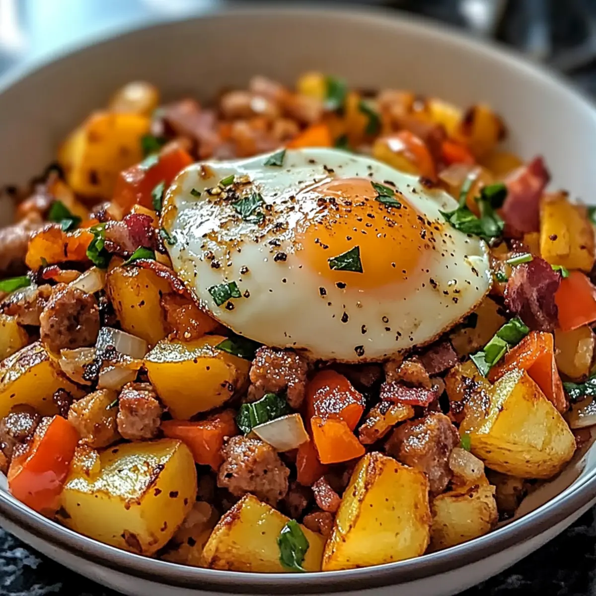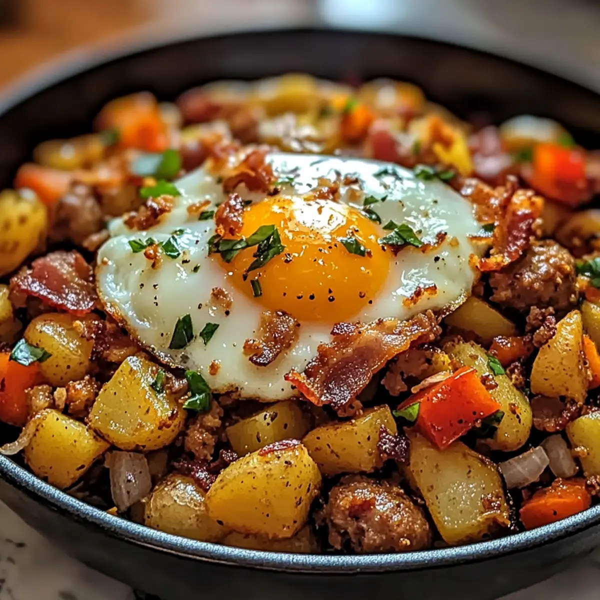 Stellen Sie sich vor, wie der verführerische Duft von beladenem Frühstücks-Hash durch Ihre Küche zieht und die Vorfreude auf ein herzhaftes Frühstück weckt. Dieser vielseitige Brunch-Klassiker vereint die knusprigen Texturen von Kartoffeln, die Würze von Wurst und ein köstliches Ei – alles harmonisch auf einem Teller vereint. Das Rezept für beladenen Frühstücks-Hash ist nicht nur schnell zubereitet, sondern auch eine perfekte Möglichkeit, Reste kreativ zu verwerten. Egal, ob Sie es mit verschiedenen Gemüsesorten anpassen oder eine vegetarische Variante ausprobieren, das Gericht bleibt ein echter Genuss. Wer könnte da widerstehen? Bereit, einen neuen Favoriten für den Frühstückstisch zu entdecken? Warum du dieses Rezept lieben wirst Vielseitigkeit: Beladener Frühstücks-Hash ist ein wahres Chamäleon in der Küche – er lässt sich ganz nach deinem Geschmack anpassen. Schnelle Zubereitung: Mit minimalem Aufwand zauberst du ein herzhaftes Gericht, das perfekt für hektische Morgen ist. Komfortfood: Die Kombination aus knusprigen Kartoffeln und würziger Wurst bietet einen himmlischen Genuss, der sowohl zum Frühstück als auch zum Abendessen schmeckt. Resteverwertung: Ideal, um übrig gebliebene Zutaten kreativ zu verarbeiten! Familienfreundlich: Dieses Gericht begeistert Groß und Klein, perfekt für einen gemeinsamen Brunch am Wochenende. Hol dir auch das Rezept für Spinatsalat Mit Feta als erfrischende Beilage dazu! Beladener Frühstücks-Hash Zutaten • Entdecken Sie die köstlichen Grundlage für Ihr neues Lieblingsfrühstück! Kartoffeln (2 lbs, Yukon Gold oder Russet, gewürfelt): Bilden die Basis und Herzhaftigkeit des Gerichts. Kann gegen Süßkartoffeln für eine süßere Note ersetzt werden. Gekochte Wurst (1 lb, Frühstückswurst oder Chorizo, zerkrümelt): Fügt Protein und reichhaltigen Geschmack hinzu. Vorgegarte Varianten sparen Zeit. Bacon (8 Stück, gekocht und zerkrümelt): Bringt einen rauchigen Geschmack. Kann für eine leichtere Version weggelassen oder durch Putenbacon ersetzt werden. Zwiebel (1 große, gewürfelt): Verbessert die Geschmacksbasis und sorgt für Süße. Schalotten können als Alternative dienen. Paprika (2, jede Farbe, gewürfelt): Führt Knusprigkeit und lebendige Farben ein. Verwenden Sie jede bevorzugte Sorte für Anpassungen. Knoblauch (2 Zehen, gehackt): Fügt ein aromatisches Geschmacksprofil hinzu. Knoblauchpulver kann als Alternative verwendet werden. Eier (6-8, groß): Bringt Reichhaltigkeit und Protein. Kann gegen Eierersatz für eine kalorienärmere Option verwendet werden. Käse (1 Tasse, geriebener Cheddar, Monterey Jack oder Pepper Jack): Fügt Cremigkeit und Geschmack hinzu. Nährhefe kann als vegane Käsealternative dienen. Olivenöl (3 Esslöffel): Wird zum Anbraten verwendet und bringt Reichhaltigkeit. Kann durch Avocadoöl für einen anderen Geschmack ersetzt werden. Gewürze (Salz, schwarzer Pfeffer, Paprika, Zwiebelpulver, Knoblauchpulver, nach Geschmack): Verstärkt das gesamte Geschmacksprofil. Nach persönlichen Vorlieben anpassen. Frische Kräuter (Optional, gehackte Petersilie, Schnittlauch oder Koriander, zum Garnieren): Bringt Frische in das Gericht. Kann für eine einfachere Präsentation weggelassen werden. Schritt-für-Schritt-Anleitung für Beladenen Frühstücks-Hash Step 1: Kartoffeln vorbereiten Die Kartoffeln in Würfel schneiden und für etwa 15 Minuten in kaltem Wasser einweichen, um die Stärke zu entfernen. Dies sorgt dafür, dass sie beim Braten knusprig werden. Anschließend gut abtrocknen und bereitstellen. Step 2: Bacon braten (falls roh) In einer großen Pfanne bei mittlerer Hitze das Olivenöl erhitzen. Den Bacon hinzufügen und ca. 5-7 Minuten braten, bis er knusprig ist. Den Bacon aus der Pfanne nehmen, auf Küchenpapier abtropfen lassen und in kleine Stücke zerkrümeln. Step 3: Zwiebeln und Paprika sautieren Im verbliebenen Fett der Pfanne die gewürfelten Zwiebeln und Paprika etwa 5 Minuten lang anbraten, bis sie weich und leicht gebräunt sind. Dabei regelmäßig umrühren, um ein Anbrennen zu verhindern. Diese Mischung sorgt für zusätzliche Geschmacksnuancen im Beladenen Frühstücks-Hash. Step 4: Knoblauch und Gewürze hinzufügen Den gehackten Knoblauch und die Gewürze wie Salz, Pfeffer und Paprika hinzufügen. Für etwa 1-2 Minuten anbraten, bis der Knoblauch duftet. Diese Aromastoffe verstärken die Aromen des Gerichts und bereiten die Basis für die Kartoffeln. Step 5: Kartoffeln kochen Die gewürfelten Kartoffeln in die Pfanne geben und bei mittlerer Hitze anbraten. Etwa 15-20 Minuten braten, bis sie goldbraun und knusprig sind. Gelegentlich wenden, damit sie gleichmäßig garen und nichts anbrennt. Step 6: Gekochte Wurst und Bacon einmischen Die zerkrümelte Wurst und den gebratenen Bacon in die Pfanne geben und gut mit den Kartoffeln vermengen. Weiter braten für weitere 5 Minuten, damit die Aromen gut miteinander verschmelzen. Step 7: Käse hinzufügen (optional) Falls gewünscht, den geriebenen Käse über die Mischung streuen und zugedeckt weitergaren, bis er schmilzt, etwa 2-3 Minuten. Dies gibt dem Beladenen Frühstücks-Hash eine cremige Textur und zusätzlichen Geschmack. Step 8: Eier kochen (optional, im Hash) Mit einem Löffel kleine Vertiefungen in die Kartoffelmischung drücken und ein Ei in jede Vertiefung schlagen. Den Deckel auf die Pfanne setzen und die Eier etwa 5-7 Minuten garen, bis das Eiweiß fest ist, während das Eigelb weich bleibt. Step 9: Servieren und garnieren Den Beladenen Frühstücks-Hash auf Teller verteilen und nach Belieben mit frischen Kräutern garnieren. Die Kombination aus knusprigen Kartoffeln, würziger Wurst und perfekt gegarten Eiern sorgt für einen unvergesslichen Brunch! Planung für den Beladenen Frühstücks-Hash: So bereitest du vor! Die Zubereitung des beladenen Frühstücks-Hash kann bis zu 3 Tage im Voraus erfolgen, was dir wertvolle Zeit an hektischen Morgen spart. Beginne damit, die Kartoffeln zu schälen und gewü