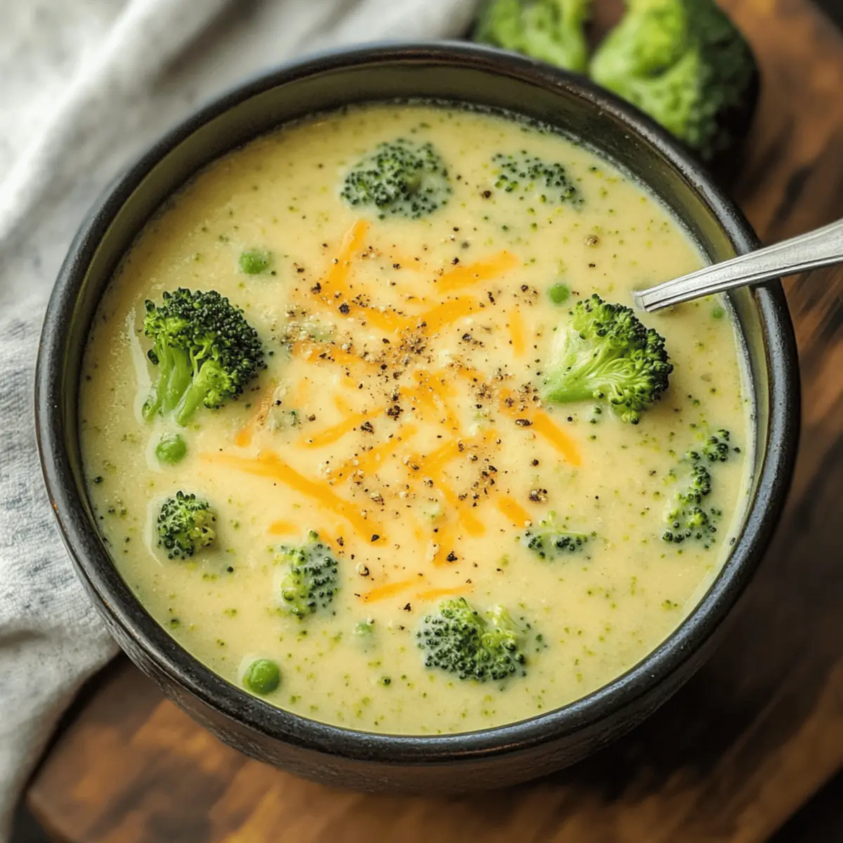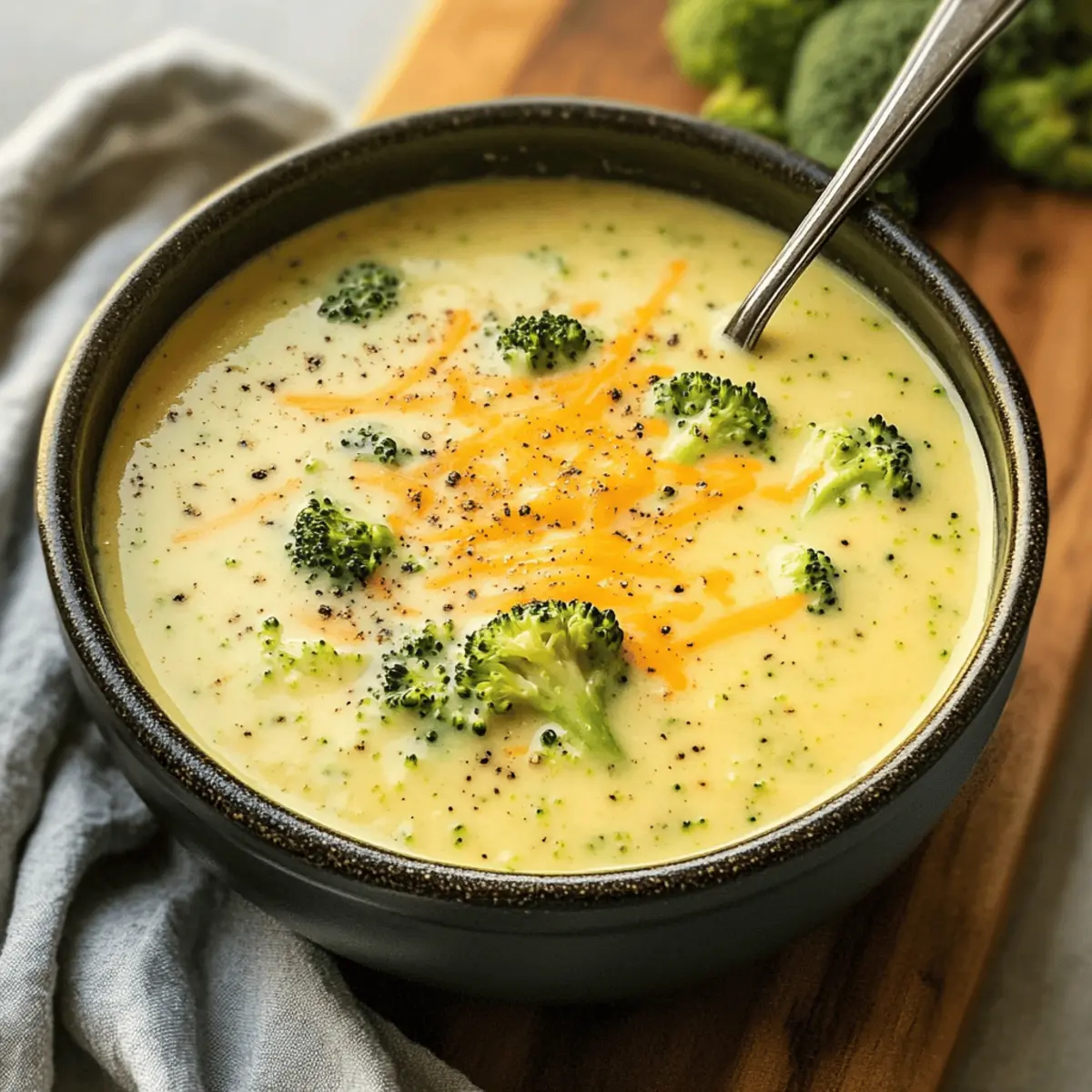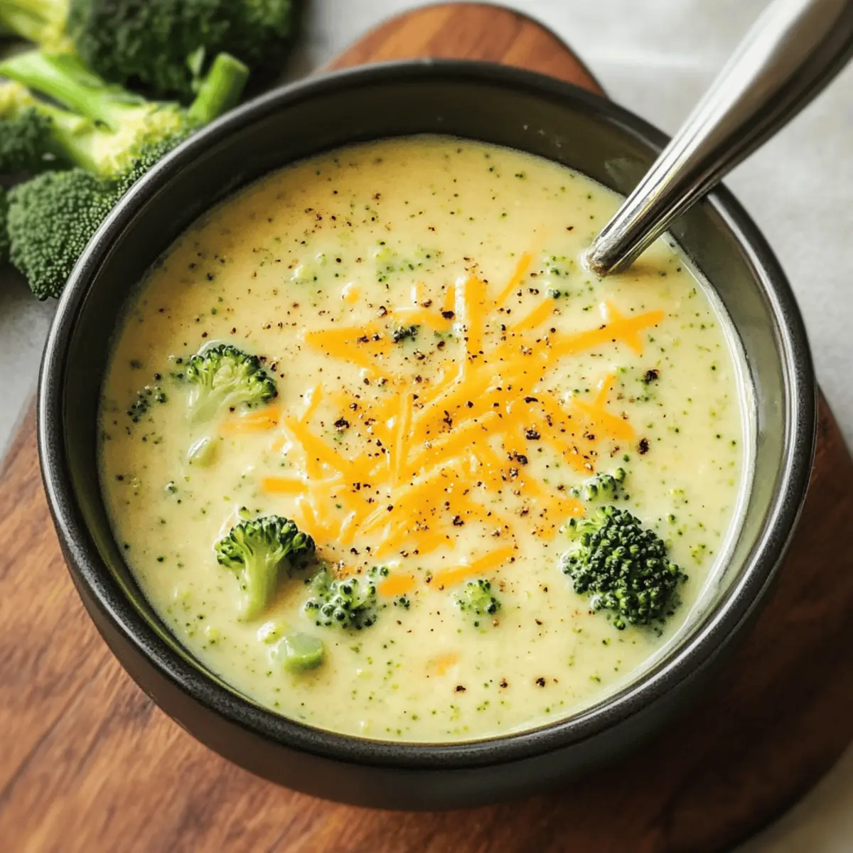 Die kühle Brise und das Rascheln der herbstlichen Blätter laden uns ein, unsere gemütlichsten Rezepte z hervorholen. Enthüllt wird heute der Star unserer Küche: die cremige Brokkoli-Cheddar-Suppe. Dieses Rezept verwandelt frische Zutaten in ein schnelles und herzhaftes Gericht, das in nur 30 Minuten auf dem Tisch steht. Es ist nicht nur eine Genussreise für Käseliebhaber, sondern auch ein wahres Komfortessen, das sich perfekt für gesellige Abende oder kalte Tage eignet. Egal, ob Sie die klassische Variante oder eine vegane Finesse ausprobieren möchten – diese Suppe hat für jeden Geschmack etwas zu bieten. Seid ihr bereit, euren eigenen Behälter mit köstlicher Cremigkeit zu füllen? Warum ist diese Suppe besonders? Schnelligkeit: In nur 30 Minuten ist Ihre köstliche Suppe fertig, ideal für stressige Tage. Cremige Textur: Die Kombination aus Käse und Gemüse sorgt für ein samtiges Mundgefühl, das jeder liebt. Vielfältige Optionen: Egal ob klassisch oder vegan, passen Sie das Rezept nach Belieben an! Nährstoffreich: Mit frischem Brokkoli versorgt Sie diese Suppe mit wichtigen Vitaminen. Lassen Sie sich auch von anderen herzhaften Optionen wie unserem Pasta Salat Rezept oder der Potsticker Suppe Gemüse inspirieren! Perfekt für Gäste: Eine schmackhafte Vorspeise, die bei jeder Zusammenkunft begeistert. Brokkoli-Cheddar-Suppen-Zutaten • Wichtig: Hier sind die Zutaten, die Sie benötigen, um Ihre köstliche Brokkoli-Cheddar-Suppe zuzubereiten. Für die Basis: Ungesalzene Butter – sorgt für einen reichhaltigen Geschmack; ersetzen Sie sie durch Olivenöl für eine milchfreie Variante. Gelbe Zwiebel – bietet eine süße Geschmacksbasis; verwenden Sie Schalotten für einen milderen Geschmack. Meersalz – verstärkt den Gesamteindruck; nach Geschmack anpassen. Schwarzer Pfeffer – fügt eine leichte Schärfe hinzu; weißer Pfeffer kann für einen milderen Geschmack verwendet werden. Knoblauchzehen – bringt aromatische Tiefe; ersetzen Sie sie durch Knoblauchpulver (1/8 TL pro Zehe). Für die Konsistenz: Allzweckmehl – verdickt die Suppe; verwenden Sie zur glutenfreien Option Maisstärke oder eine glutenfreie Mehlmischung. Vollmilch oder ungesüßte Mandeldrink – sorgt für Cremigkeit; für die milchfreie Option verwenden Sie Mandeldrink oder andere pflanzliche Milch. Für den Geschmack: Gemüsebrühe – fügt Geschmack und Flüssigkeit hinzu; Hühnerbrühe kann für die nicht-vegetarische Variante verwendet werden. Zerkleinerte Brokkoliröschen – Hauptzutat; frisch oder gefroren; andere grüne Gemüse können ersetzt werden. Große Karotte – verleiht Süße und Farbe; Parsnips können für einen anderen Geschmack verwendet werden. Dijon-Senf – verstärkt den Geschmack mit einer Prise Säure; im Notfall kann gelber Senf verwendet werden. Für die Krönung: Geriebener Cheddar-Käse – Schlüsselzutat für Cremigkeit und Reichhaltigkeit; verwenden Sie veganen Cheddar für eine milchfreie Variante. Hausgemachte Croutons – optionale Topping für Knusprigkeit; im Handel gekaufte sind praktisch. Diese Zutaten werden Ihnen helfen, eine köstliche Brokkoli-Cheddar-Suppe zuzubereiten, die perfekt für kalte Tage ist! Schritt-für-Schritt-Anleitung zur Brokkoli-Käse-Suppe Step 1: Basis anbraten In einem großen Topf bei mittlerer Hitze die ungesalzene Butter schmelzen. Fügen Sie die gewürfelte gelbe Zwiebel, Meersalz und schwarzen Pfeffer hinzu und braten Sie alles 5 Minuten lang an, bis die Zwiebel weich und leicht goldbraun ist. Step 2: Aromaten hinzufügen Nachdem die Zwiebel weich ist, geben Sie die gehackten Knoblauchzehen hinzu. Rühren Sie alles kräftig um und lassen Sie den Knoblauch 1 Minute lang mitbraten, bis er aromatisch ist und eine goldene Farbe annimmt. Step 3: Roux herstellen Fügen Sie das Allzweckmehl hinzu und whiskern Sie kontinuierlich, um Klumpen zu vermeiden. Lassen Sie das Mehl 1-2 Minuten lang unter ständigem Rühren kochen, bis es eine goldene Farbe angenommen hat und ein angenehmer Geruch aufsteigt. Step 4: Flüssigkeiten einarbeiten Langsam die Vollmilch oder den ungesüßten Mandeldrink unter ständigem Rühren hinzufügen. Nachdem die Milch gut eingezogen ist, fügen Sie langsam die Gemüsebrühe, Brokkoliröschen, die gewürfelte Karotte und Dijon-Senf hinzu. Rühren Sie alles gründlich um, um die Zutaten zu kombinieren. Step 5: Simmern lassen Bringen Sie die Mischung zum Köcheln und lassen Sie sie 15-20 Minuten lang köcheln, bis die Brokkoliröschen zart sind und eine leuchtend grüne Farbe angenommen haben. Rühren Sie gelegentlich um, damit nichts am Boden des Topfes anhaftet. Step 6: Käse hinzufügen Wenn das Gemüse zart ist, reduzieren Sie die Hitze und streuen Sie den geriebenen Cheddar-Käse gleichmäßig über die Suppe. Rühren Sie vorsichtig um, bis der Käse geschmolzen und die Suppe cremig ist. Achten Sie darauf, dass die Suppe nicht mehr kocht, um ein Trennen zu vermeiden. Step 7: Abschmecken und Servieren Schmecken Sie die Brokkoli-Käse-Suppe ab und passen Sie die Gewürze nach Belieben an. Servieren Sie die Suppe heiß, garniert mit optionalen hausgemachten Croutons für zusätzlichen Crunch und genießen Sie die cremige und herzliche Textur! Was passt gut zur Brokkoli-Cheddar-Suppe? Die perfekte Ergänzung zu Ihrer cremigen Delikatesse sorgt für ein ausgewogenes und köstliches Abendessen. Knuspriges Brot: Ein Stück frisch gebackenes Brot bietet die ideale Möglichkeit, die leckere Suppe aufzutunken und sättigt wunderbar. Das Brot bringt eine herzliche Textur ins Spiel, die jeder lieben wird. Frische Feldsalat: Ein harter, knackiger Salat mit einem leichten Dressing sorgt für eine schöne Balance zur Cremigkeit der Suppe. Dabei bleibt der Genuss frisch und luftig, ideal für gesunde Essgewohnheiten. Hausgemachte Croutons: Die knusprigen Stückchen sind perfekt, um der Suppe eine schöne Textur zu verleihen. Sie können sie leicht selbst zubereiten oder bequem im Handel kaufen – ein Rundum-Geschmacks