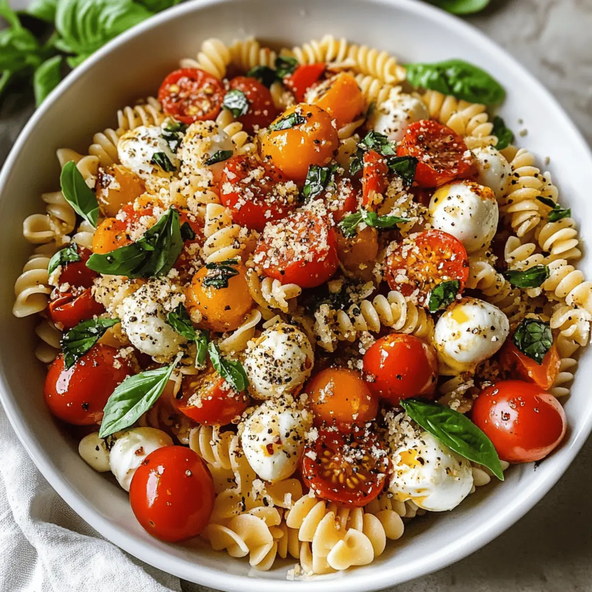 Ein erfrischender Bruschetta Pasta Salat mit Mozzarella-Bällchen für heiße Sommertage. Ideal für gesellige Anlässe.