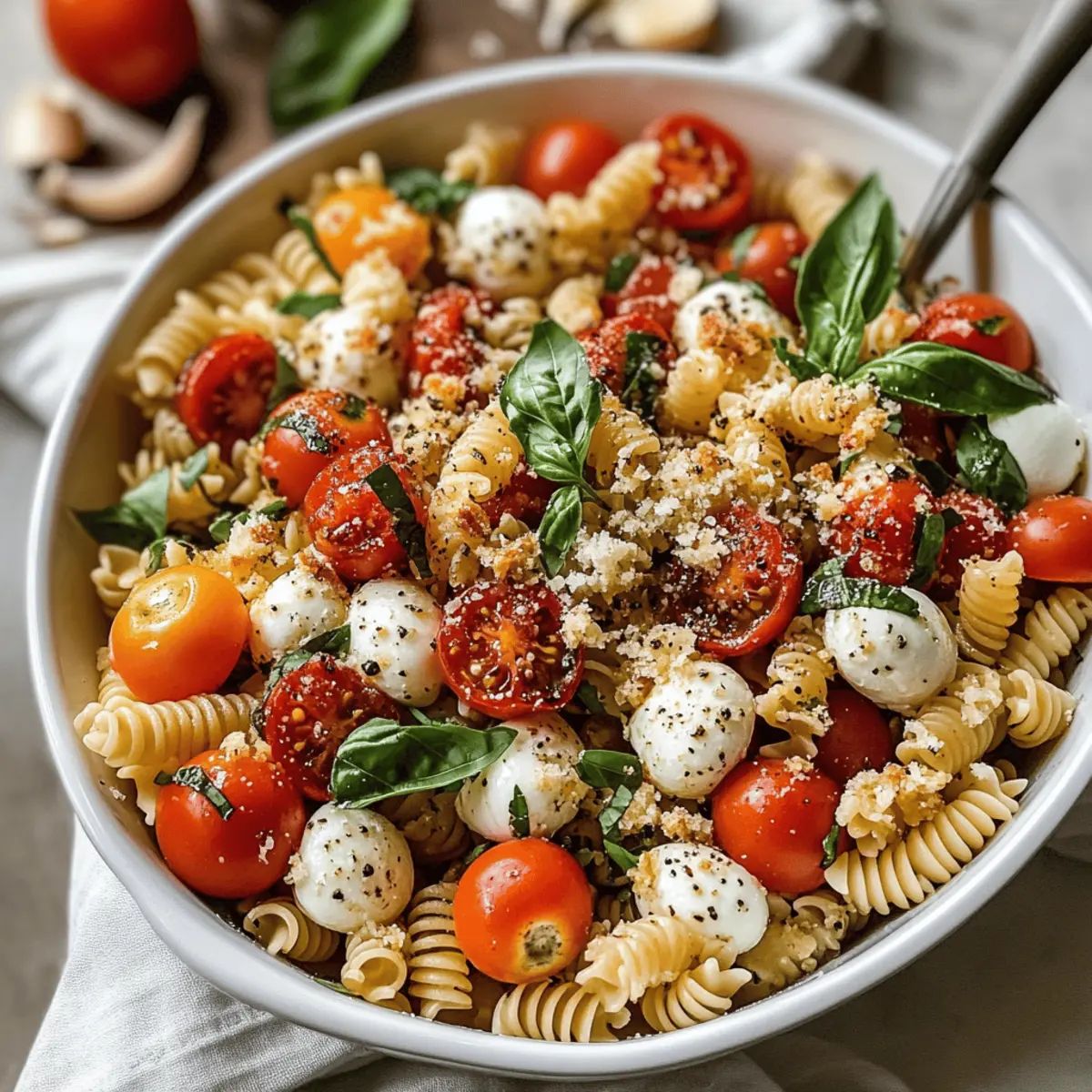 Füge die abgekühlte Pasta zur Tomaten-Mozzarella-Mischung in der Schüssel hinzu. Vermische alles vorsichtig, damit die Zutaten gleichmäßig verteilt sind. Zum Schluss die knusprigen Brotbrösel hinzufügen und vorsichtig untermischen. Schmecke alles nochmals ab und serviere den Bruschetta Pasta Salat entweder sofort oder stelle ihn für eine erfrischende Mahlzeit in den Kühlschrank.