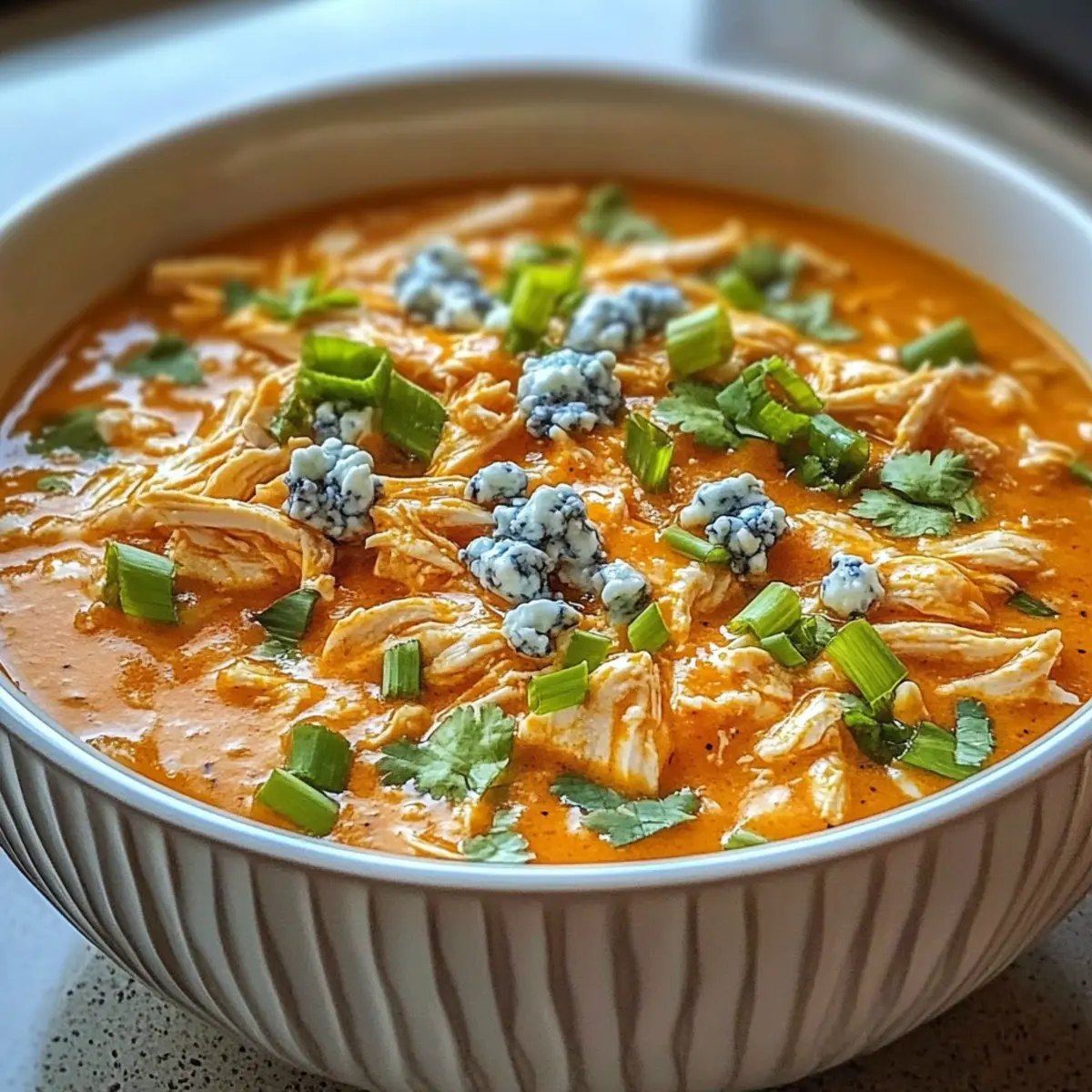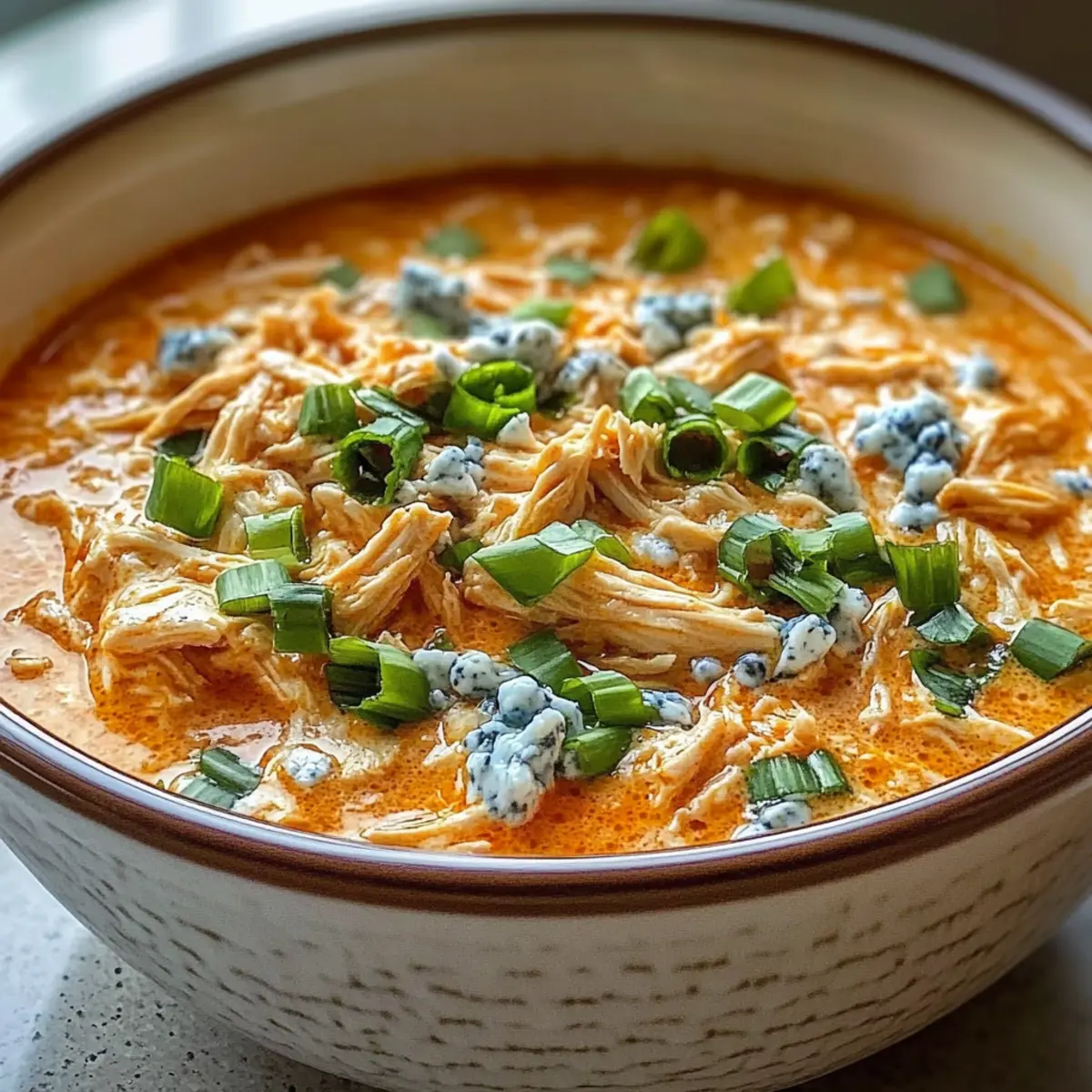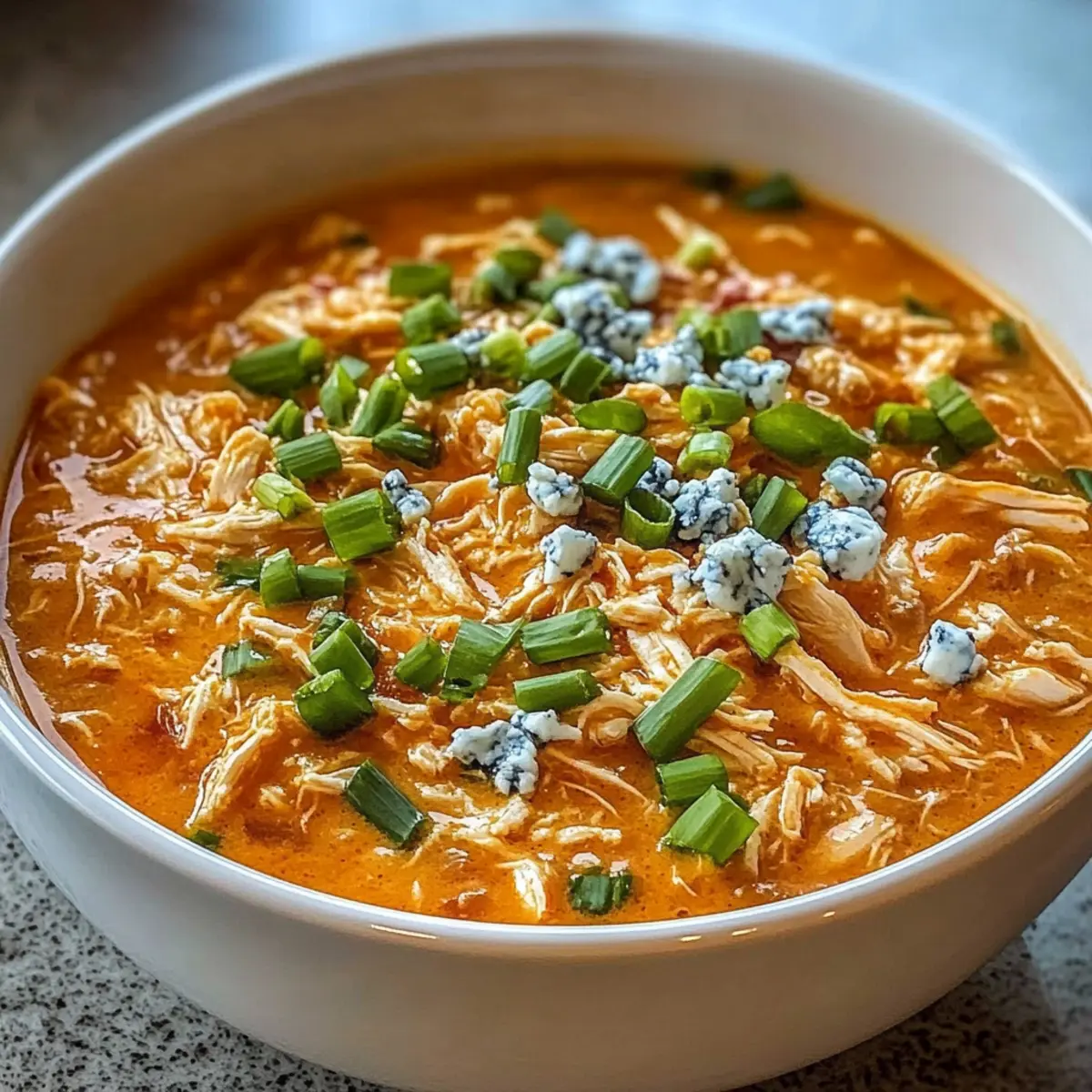 An einem gemütlichen Abend, während der Regen gegen die Fenster prasselt, gibt es nichts Besseres als eine Schüssel voll Wärme und Geschmack. Heute lade ich euch ein, meine Buffalo-Hühnchen-Dip-Suppe zuzubereiten, die euch mit ihrem herzhaften Aroma gleich in den Bann ziehen wird. Diese einfache Slow-Cooker-Rezeptur vereint zartes, geschreddertes Hühnerfleisch, eine würzige Brühe und die cremige Raffinesse von Frischkäse und Cheddar. Die besten Nachrichten? Ihr benötigt dafür nicht viel Zeit in der Küche, und sie ist ein absolutes Wohlfühlessen, das garantiert die ganze Familie begeistert. Ob bei einem spannenden Spielabend oder an kalten Tagen – diese Suppe sorgt immer für ein Lächeln. Neugierig, wie ihr dieses köstliche Rezept zaubern könnt? Bleibt dran! Warum ist diese Suppe ein Muss? Einfachheit: Dieses Rezept im Slow Cooker ist unkompliziert und erfordert nur grundlegende Kochfähigkeiten, sodass auch weniger erfahrene Köche Freude daran haben. Wohltuende Aromen: Eine harmonische Mischung aus Würze und Cremigkeit, die garantiert die Geschmacksknospen verführt. Vielseitig: Passen Sie die Schärfe nach Ihrem Geschmack an oder verwenden Sie Abwandlungen wie griechischen Joghurt für eine leichtere Variante. Schnell gekochte Entspannung: Lassen Sie den Slow Cooker seine Magie entfalten, während Sie anderen Aktivitäten nachgehen. Perfekt für Geselligkeit: Ob bei Spielabenden oder Familienessen, diese Suppe ist ein Publikumsrenner – jeder wird nach Nachschlag fragen! Buffalo-Hühnchen-Dip-Suppe Zutaten • Diese köstliche Buffalo-Hühnchen-Dip-Suppe kombiniert verschiedene Zutaten zu einem herzhaften Erlebnis. Für die Brühe • Hühnerbrust – das Hauptprotein, verwenden Sie entbeinte, hautlose Hühnerbrust für ein zartes Ergebnis. • Zwiebel – sorgt für eine aromatische Basis; klein gewürfelt, um den Geschmack der Brühe zu intensivieren. • Knoblauch – verleiht Tiefe; frischen, gehackten Knoblauch verwenden für optimalen Geschmack. • Hühnerbrühe mit niedrigem Natriumgehalt – die Basisflüssigkeit; sorgt dafür, dass die Suppe nicht zu salzig ist. Für die Cremigkeit • Frischkäse – sorgt für eine cremige Textur; kann durch griechischen Joghurt ersetzt werden für eine leichtere Version. • Cheddar-Käse – bringt einen scharfen Geschmack; verwenden Sie fettarmen Cheddar, wenn gewünscht. Für die Würze • Buffalo-Sauce – verleiht der Suppe ihren charakteristischen scharfen Geschmack; nach Belieben anpassen. • Räucherpaprika – fügt eine warme, rauchige Note hinzu; kann bei Bedarf durch normale Paprika ersetzt werden. • Schwarzer Pfeffer & Salz – verbessern die Aromen; nach Geschmack anpassen. Für die Garnitur • Frühlingszwiebeln & Blauschimmelkäse – sorgen für Frische und einen pikanten Kick; optional, aber empfohlen. Schritt-für-Schritt-Anleitung für Buffalo-Hühnchen-Dip-Suppe Step 1: Basis vorbereiten Lege die Hühnerbrüste, die gewürfelte Zwiebel und den gehackten Knoblauch in den Slow Cooker. Diese Aromagrundlage sorgt dafür, dass die Aromen gut durchziehen. Stelle sicher, dass das Huhn gleichmäßig verteilt ist und die Zwiebeln und der Knoblauch schön darauf liegen. Step 2: Geschmack aufbauen Gieße die Hühnerbrühe und die Buffalo-Sauce hinzu, gefolgt von der räucherigen Paprika, dem schwarzen Pfeffer und dem Salz. Rühre vorsichtig um, damit sich alle Zutaten gut vermischen, und achte darauf, die Hühnerbrüste nicht zu zerreißen. Schließe den Deckel und stelle den Slow Cooker auf „Low“, um die Aromen bei 4 Stunden sanft ziehen zu lassen. Step 3: Huhn kochen Nach 4 Stunden sollte das Huhn so zart sein, dass es leicht auseinanderfällt. Überprüfe, ob es eine Kerntemperatur von 75 °C erreicht hat. Nimm das Huhn vorsichtig mit einer Zange oder einem Schaumlöffel heraus und lege es auf ein Brett, um es später zu zerkleinern. Step 4: Huhn zerkleinern Zerreibe das Huhn mit zwei Gabeln, bis es gut geschreddert ist. Dies sorgt für die perfekte Textur in deiner Buffalo-Hühnchen-Dip-Suppe. Gib das zerkleinerte Huhn zurück in den Slow Cooker und rühre es gut um, damit es sich mit der Brühe verbindet. Step 5: Milchprodukte einarbeiten Füge den Frischkäse, den Cheddar-Käse und ggf. den griechischen Joghurt hinzu. Rühre kontinuierlich, bis sich die Käse vollständig aufgelöst haben und eine cremige Konsistenz entsteht. Dies könnte einige Minuten dauern, also sei geduldig und genieße die köstlichen Aromen, die sich entfalten. Step 6: Gewürze anpassen Probiere die Suppe und passe die Aromen nach deinem Geschmack an. Füge eventuell etwas mehr Salz, Pfeffer oder Buffalo-Sauce hinzu, um die gewünschte Schärfe zu erreichen. Dieser Schritt ist wichtig, um sicherzustellen, dass deine Buffalo-Hühnchen-Dip-Suppe genau die richtige Würze hat. Step 7: Servieren Lade die Suppe in Schüsseln und garniere sie mit frischen Frühlingszwiebeln und zerbröckeltem Blauschimmelkäse. Diese Garnitur ist nicht nur dekorativ, sondern verleiht deiner Suppe auch eine erfrischende Note. Serviere die Suppe heiß und genieße sie mit zusätzlichen Beilagen wie Tortilla-Chips oder Selleriestangen. Vorbereitung für die Buffalo-Hühnchen-Dip-Suppe Die Buffalo-Hühnchen-Dip-Suppe ist perfekt für die Wochenplanung! Du kannst die Hühnerbrüste, Zwiebeln und Knoblauch bis zu 24 Stunden im Voraus in den Slow Cooker legen und dann mit der Brühe und der Buffalo-Sauce ergänzen. Einfach abdecken und im Kühlschrank aufbewahren. Am nächsten Tag einfach alles kochen und das Hühnerfleisch nach 4 Stunden zart zerkleinern. Beim Incorporieren der Milchprodukte solltest du sicherstellen, dass du ständig rührst, um eine cremige Konsistenz zu erhalten. Wenn du die Suppe aufbewahrst, lasse sie abkühlen und verwahre sie in einem luftdichten Behälter – so bleibt sie bis zu 4 Tage frisch und genauso lecker wie am ersten Tag! Buffalo-Hühnchen-Dip-Suppe Variationen Lass deiner Kreativität freien Lauf und passe diese kö