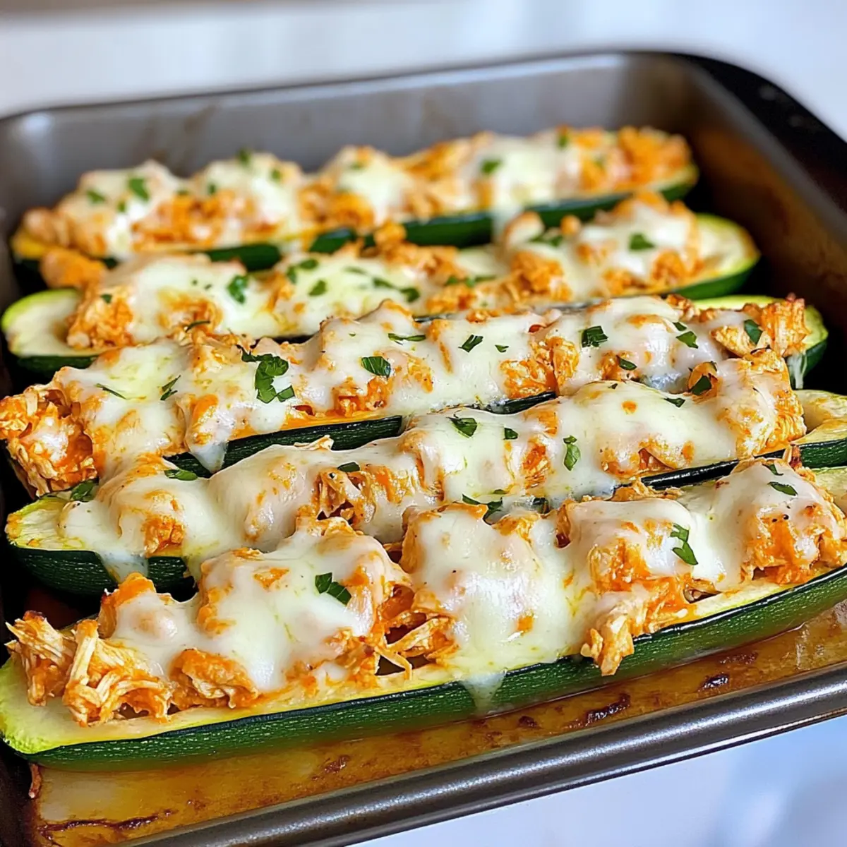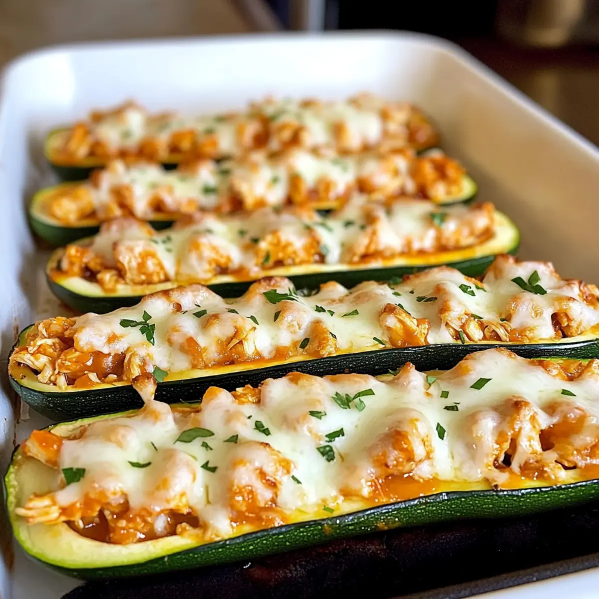 Entdecke, wie du mit diesem Rezept für Buffalo-Hühnchen-Zucchini-Boote eine leckere, low-carb Mahlzeit zauberst!