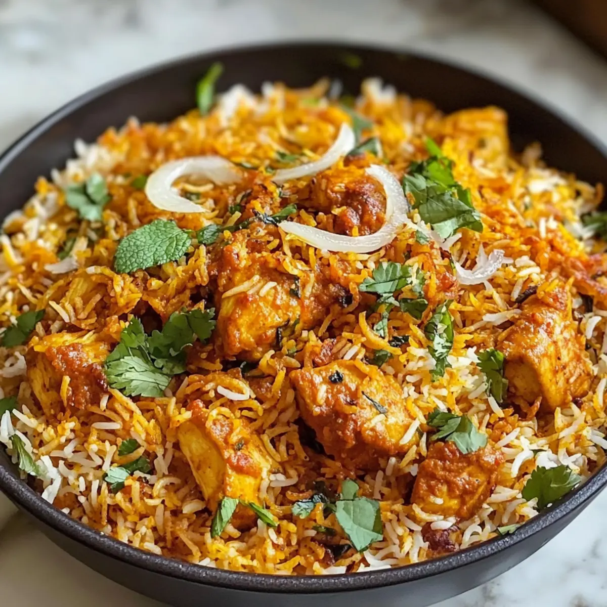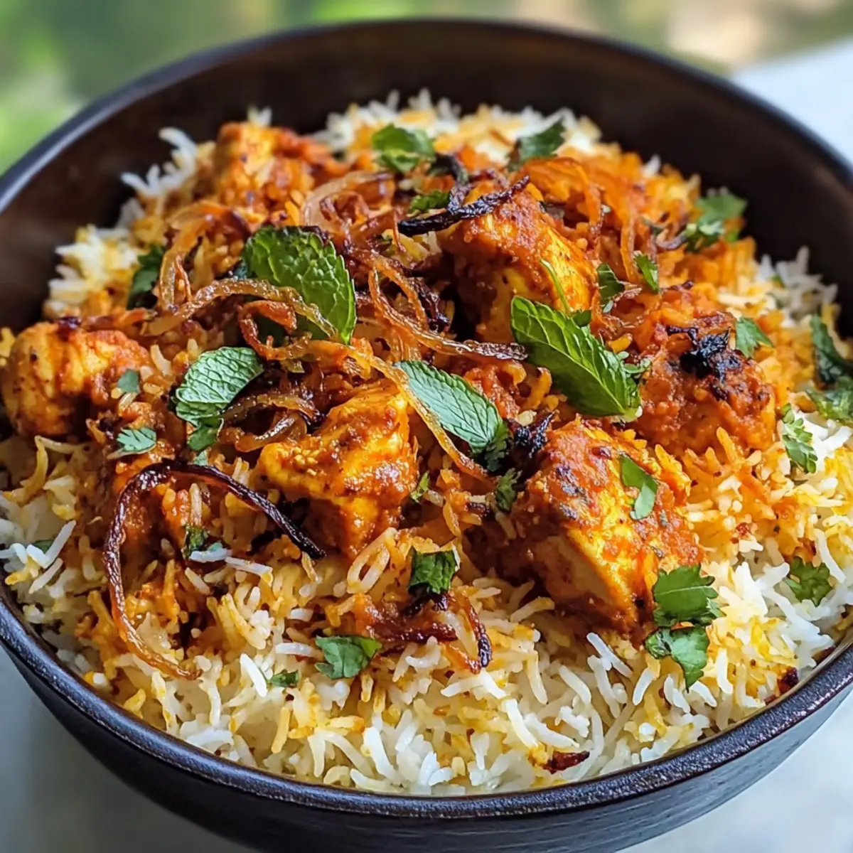 Ein verführerisches Aroma zieht durch die Küche: Hier steht ein Gericht bereit, das nicht nur den Gaumen verwöhnt, sondern auch die Sinne verführt – Butter Chicken Biryani. Diese köstliche Kombination aus zartem, gewürztem Hühnchen in einer cremigen Tomatensoße, geschichtet mit fluffigem Basmati-Reis, ist alleine schon ein Festmahl. Was dieses Rezept besonders macht? Es ist nicht nur ein kinderfreundliches Familienessen, sondern lässt sich auch ganz einfach vorbereiten, sodass Sie mehr Zeit mit Ihren Liebsten verbringen können. Die Mischung aus frischen Kräutern und knusprigen Zwiebeln macht jede Portion zu einem Erlebnis. Neugierig geworden, wie Sie diese geschmackvolle Versuchung selbst zubereiten können? Lassen Sie uns gemeinsam in die Welt der indischen Küche eintauchen! Warum werden Sie dieses Rezept lieben? Köstliche Aromen: Die harmonische Kombination aus Gewürzen, frischem Koriander und cremiger Tomatensoße hebt den Geschmack auf ein ganz neues Level. Familienfreundlich: Dieses Gericht begeistert sowohl Kinder als auch Erwachsene, perfekt für ein gemeinsames Abendessen. Ein Topf, wenig Aufwand: Mit Butter Chicken Biryani zaubern Sie ein komplettes Menü mit nur einem Kochgeschirr – einfacher geht’s nicht! Vielfältig anpassbar: Sie können ganz einfach Gemüse oder Paneer hinzufügen, um es vegetarisch zu gestalten. Vorratsfreundlich: Ideal zum Vorbereiten – Sie können es im Kühlschrank aufbewahren und es bleibt auch nach ein paar Tagen noch köstlich! Ein Festmahl zu jedem Anlass: Egal ob für ein Familienfest oder einen gemütlichen Abend, dieses Gericht sorgt für zufriedene Gesichter rund um den Tisch. Butter Chicken Biryani Zutaten Hier sind die wichtigsten Zutaten für Ihr köstliches Butter Chicken Biryani, mit Tipps, wie Sie das Gericht noch besser machen können! Für das Hühnchen Hühnchenbrust – Zartes Protein, Hühnchenschenkel ergeben saftigere Ergebnisse. Achten Sie auf gleichmäßige Stücke für ein gleichmäßiges Garen. Ingwer-Knoblauch-Paste – Fügt Tiefe und Geschmack hinzu. Frisch ist am besten, aber auch fertige Paste ist in Ordnung. Jahrundertsahne – Sorgt für eine cremige Konsistenz in der Soße. Joghurt – Ideal zum Marinieren, sorgt für einen leicht säuerlichen Geschmack und zartes Fleisch. Für die Gewürze Kurkuma-Pulver – Verleiht Farbe und einen erdigen Geschmack. Koriander-Pulver – Bietet Wärme und subtile Würze. Rotes Chilipulver – Fügt Schärfe hinzu; die Menge kann nach Geschmack angepasst werden. Garam Masala Pulver – Der finale Geschmacksverstärker; nach Geschmack anpassen. Kasuri Methi – Getrocknete Bockshornkleeblätter für authentischen Geschmack. Für den Reis Basmati-Reis – Für eine fluffige Textur, vor dem Kochen einweichen für beste Ergebnisse. Wasser – Essentiell für das Kochen des Reises; sorgt für perfekt gegarten Reis. Für die Soße Zwiebel – Bildet die Grundlage der Masala, sorgt für Süße und Geschmack. Tomaten – Fügen Säure und Feuchtigkeit zur Soße hinzu. Cashews – Trägt zur Cremigkeit der Masala bei. Alternativ können Mandeln verwendet werden. Für das Finish Frische Minzblätter – Für Frische und Aroma; können durch Koriander ersetzt werden, wenn gewünscht. Crispy Fried Onions – Garnierung für Textur und Geschmack. Mit diesen Zutaten sind Sie bestens gerüstet, um ein unvergessliches Butter Chicken Biryani zuzubereiten. Genießen Sie die Aromen der indischen Küche und schaffen Sie Erinnerungen, die Ihre Familie immer wieder zurück an den Tisch bringen werden! Step-by-Step Instructions for Butter Chicken Biryani Step 1: Hühnchen marinieren Mischen Sie in einer Schüssel das Hühnchen mit der Ingwer-Knoblauch-Paste, Kurkuma, Koriander, rotem Chilipulver und Salz gründlich. Lassen Sie die Mischung für 30 bis 60 Minuten ziehen, damit die Gewürze gut einziehen können. Decken Sie die Schüssel ab und stellen Sie sie in den Kühlschrank, während Sie die anderen Schritte vorbereiten. Step 2: Reis einweichen Waschen Sie den Basmati-Reis gründlich unter fließendem Wasser, bis das Wasser klar bleibt. Lassen Sie den Reis für 30 Minuten in kaltem Wasser einweichen. Dieser Schritt sorgt dafür, dass der Reis später beim Kochen schön locker und fluffig wird, was für das Butter Chicken Biryani wichtig ist. Step 3: Reis blanchieren Bringen Sie in einem großen Topf Wasser zum Kochen und fügen Sie eine Prise Salz, die eingeweichten Reis, frische Minzblätter und einige ganze Gewürze wie Nelken, Zimt und Kardamom hinzu. Kochen Sie den Reis für 8-10 Minuten, bis er etwa zu 70 % gar ist. Der Reis sollte noch einen leichten Biss haben. Abgießen und beiseite stellen. Step 4: Hühnchen kochen Heizen Sie die Heißluftfritteuse auf 200°C vor. Legen Sie das marinierte Hühnchen gleichmäßig in den Korb der Fritteuse und garen Sie es für etwa 9 Minuten. Achten Sie darauf, dass das Hühnchen außen goldbraun und durchgegart ist. Die Außenseite sollte knusprig und die Innenseite zart sein. Step 5: Masala zubereiten Mischen Sie in einem Mixer die Zwiebeln, Tomaten, Ingwer-Knoblauch-Paste und Cashews zu einer glatten Paste. Erhitzen Sie in einem großen Topf etwas Öl, fügen Sie Kreuzkümmelsamen hinzu und braten Sie sie an, bis sie duften. Gießen Sie dann die Paste hinein und kochen Sie alles, bis die Mischung eine goldene Farbe erreicht und aromatisch ist. Step 6: Hühnchen und Masala verbinden Fügen Sie das vorgegarte Hühnchen in den Topf mit der Masala-Mischung hinzu und mischen Sie alles gut. Rühren Sie dann Joghurt hinein und lassen Sie es einige Minuten bei mittlerer Hitze köcheln, um die Aromen zu vereinen. Das Hühnchen sollte gut mit der Masala-Sauce bedeckt sein. Step 7: Biryani schichten Verteilen Sie den blanchierten Reis gleichmäßig über das Hühnchen im Topf. Streuen Sie Garam Masala darüber und garnieren Sie das Gericht mit frischen Minzblättern und den knusprigen Zwiebeln. Diese Schicht sorgt für zusätzliche Geschmacksdimensio