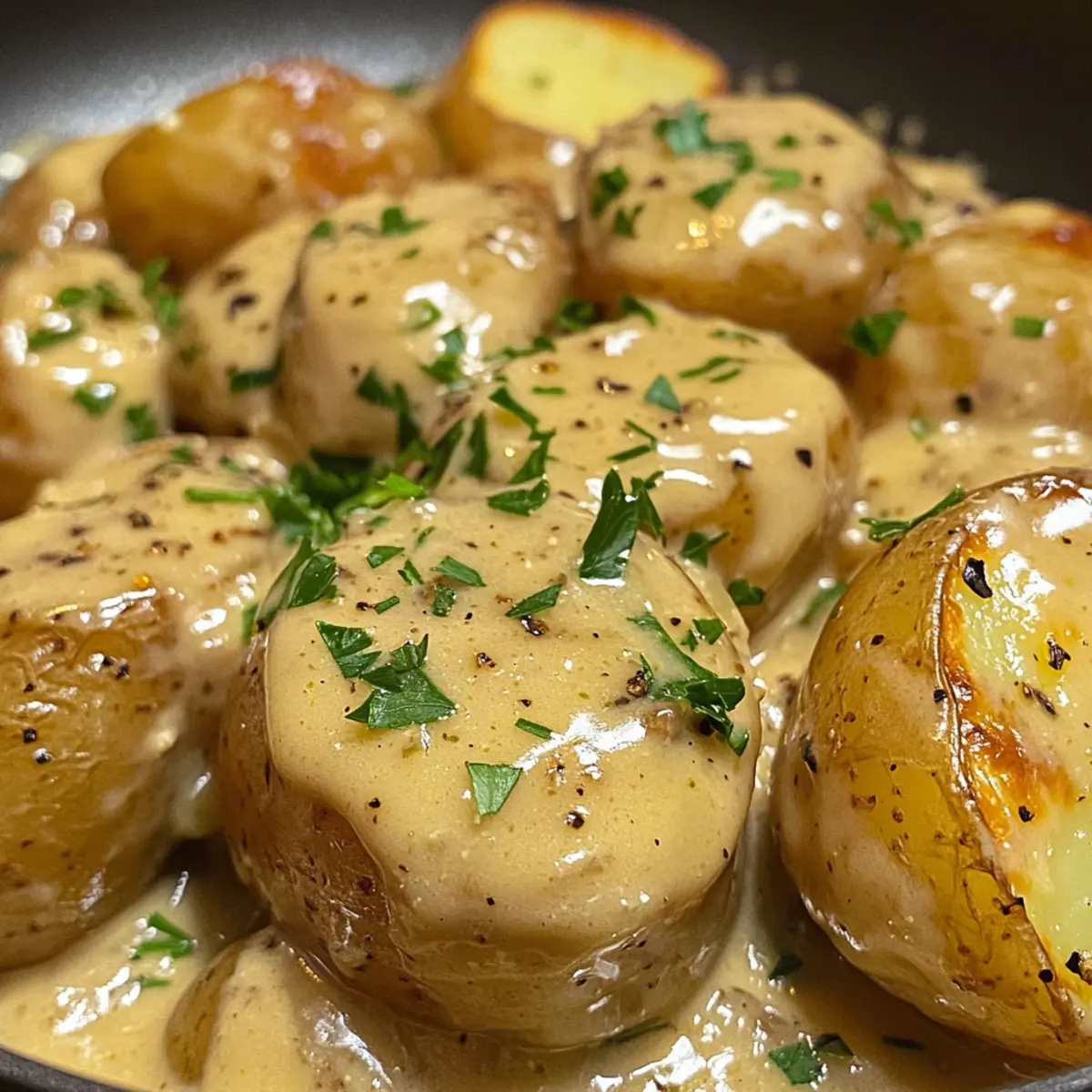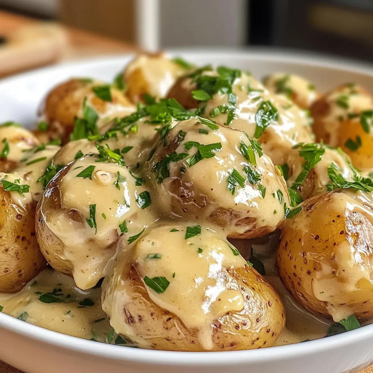 Perfekte Beilage: Diese cremigen Knoblauchsauce Baby-Kartoffeln passen hervorragend zu gegrilltem Fleisch oder frischen Salaten.