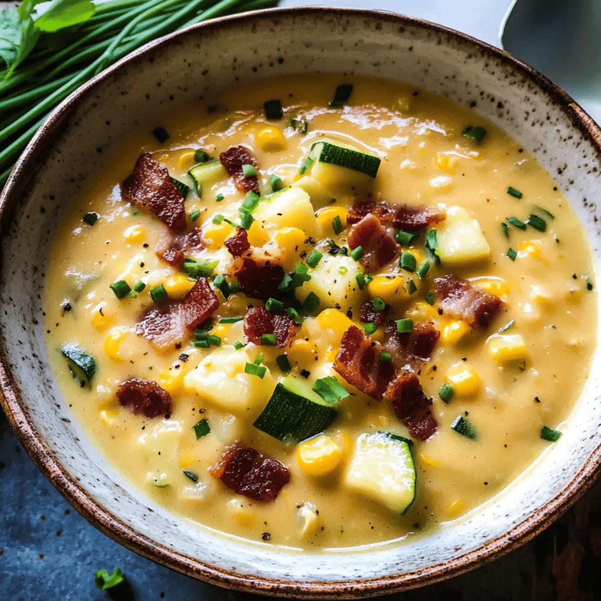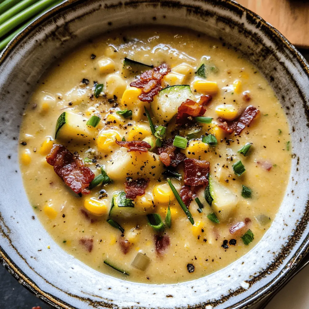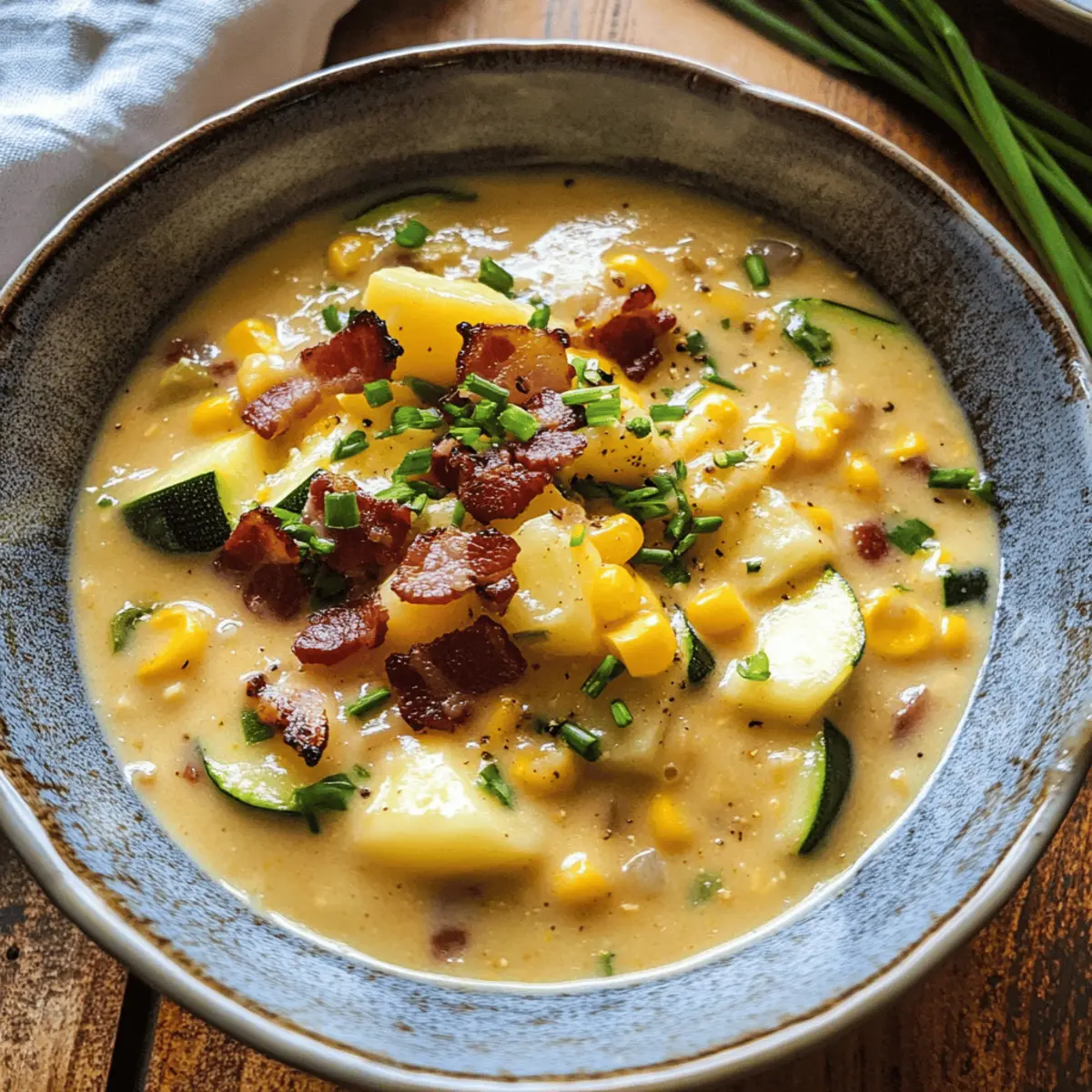 Wie der Duft von frisch gebratenem Bacon in der Luft schwebt, fühlt man sofort die Behaglichkeit eines warmen Sommers. Diese cremige Mais-, Zucchini- und Bacon-Chowder ist nicht nur ein Gericht, sondern ein Hochgenuss an Aromen und Texturen, die die Seele wärmen. Mit der Süße des Maises und der Cremigkeit des Käses wird das Rezept zum perfekten Trostessen für laue Sommerabende. Man benötigt weniger als eine Stunde, um diese köstliche Chowder zuzubereiten, die sich hervorragend mit einem frischen Salat kombinieren lässt. Seid ihr bereit, eure Küche in einen Ort der Gemütlichkeit zu verwandeln? Warum ist diese Chowder ein Muss? Köstliche Aromen: Die Kombination aus süßem Mais, frischer Zucchini und rauchigem Bacon verleiht dieser Chowder einen unvergleichlichen Geschmack, der Ihre Geschmacksknospen verzaubert. Einfach und schnell: In weniger als einer Stunde zaubern Sie dieses herzliche Gericht, ideal für geschäftige Abende oder gesellige Zusammenkünfte. Variationsmöglichkeiten: Mit variablen Zutaten wie Jalapeños oder anderen Gemüsesorten lässt sich dieses Rezept vielseitig anpassen – perfekt für jede Geschmacksrichtung! Probieren Sie auch die krosse Zucchini Chips als Beilage! Gesellige Mahlzeit: Ideal für die ganze Familie oder Freunde – jeder wird sich nach einer zweiten Portion sehnen! Vielseitig und gesund: Dieses Rezept kann leicht glutenfrei zubereitet werden, sodass jeder genießen kann. Zutaten für die Chowder Diese cremige Mais-Zucchini-Suppe wird mit einfachen, frischen Zutaten zubereitet, die das Beste aus dem Sommer herausholen. Für den Sauté: Dick geschnittener Bacon – sorgt für einen herzhaften, rauchigen Geschmack; verwenden Sie Putenbacon für eine leichtere Variante. Gesalzene Butter – gibt Reichtum und hilft beim Sautieren der Zwiebeln; alternativ eignet sich Olivenöl für eine milchfreie Variante. Gelbe Zwiebel – bietet eine süße und tiefe Geschmacksnote; Sie können auch Schalotten verwenden, wenn gewünscht. Für die Chowder: Zucchini – bringt einen frischen Geschmack und eine tolle Textur; ersetzen Sie sie durch gelbe Kürbisse, wenn Sie möchten. Gelbe Maiskörner – die Hauptzutat, die Süße hinzufügt; frischen Mais verwenden, aber gefrorenen gibt es auch in der Not. Knoblauch – sorgt für aromatische Tiefe; Knoblauchpulver kann bei Bedarf als Ersatz verwendet werden. Frischer Thymian – fügt eine erdige, kräuterige Note hinzu; Oregano kann alternativ verwendet werden. Geräuchertes Paprika – verstärkt den Geschmack mit einem Hauch von Rauchigkeit; reguläres Paprika funktioniert auch, hat aber keinen Rauchgeschmack. Rote Peper flakes – bringt eine subtile Schärfe; passen Sie nach Ihrem Geschmack an. Russische Kartoffeln – sorgen für Fülle und Cremigkeit; verwenden Sie Yukon Gold oder Süßkartoffeln als Ersatz. Niedrig natriumhaltige Hühnerbrühe – die Basis für die Chowder; Gemüsebrühe kann für eine vegetarische Option ersetzt werden. Vollmilch oder Sahne – sorgt für eine reichhaltige Textur; Halbfettmilch kann als leichtere Alternative verwendet werden. Honig – balanciert die Süße; kann weggelassen werden, wenn gewünscht. Geriebener Gouda – fügt Cremigkeit und Geschmack hinzu; verwenden Sie geräucherten Gouda für einen intensiveren Geschmack oder andere schmelzbare Käsesorten. Geriebener Cheddar – bietet einen vertrauten Geschmack; kann durch eine scharfe Sorte für mehr Intensität ersetzt werden. Gehackte Schnittlauch – zur Garnierung und Frische; Frühlingszwiebeln funktionieren auch im Notfall. Mit dieser geschmackvollen Zutatenliste kann die Zubereitung der cremigen Mais-Zucchini-Suppe beginnen! Schritt-für-Schritt-Anleitung für die cremige Mais-Zucchini-Suppe Schritt 1: Bacon anbraten In einem großen Topf bei mittlerer Hitze den gehackten Bacon anbraten, bis er knusprig ist, etwa 5-7 Minuten. Entfernen Sie den Bacon und lassen Sie ihn auf einem Küchentuch abtropfen, während Sie 1 Esslöffel des Fetts im Topf reservieren. Der Topf sollte jetzt schön eingefettet sein, um das Aromatisieren der Zwiebeln zu erleichtern. Schritt 2: Zwiebeln und Zucchini sautieren Fügen Sie zur gleichen Pfanne die gesalzene Butter, die gewürfelte Zwiebel und die Zucchini hinzu. Sautieren Sie diese Mischung 5 Minuten lang oder bis die Zwiebeln weich und duftend sind. Achten Sie darauf, dass die Zucchini nicht zu weich wird, damit sie ihr volles Aroma behält. Schritt 3: Gewürze hinzufügen Rühren Sie nun die frischen Maiskörner, den gehackten Knoblauch, den Thymian, das geräucherte Paprika und die roten Pfefferflocken ein. Kochen Sie die Mischung für weitere 2 Minuten, bis alles gut vermischt und aromatisch ist. Dieser Schritt hebt die Aromen der cremigen Mais-Zucchini-Suppe auf ein neues Level und sorgt für ein einladendes Aroma in der Küche. Schritt 4: Kartoffeln und Brühe zubereiten Fügen Sie nun die gewürfelten Kartoffeln und die niedrig natriumhaltige Hühnerbrühe hinzu. Decken Sie den Topf ab und bringen Sie die Mischung zum Kochen. Lassen Sie die Chowder 10-15 Minuten köcheln, bis die Kartoffeln weich sind. Um die richtige Konsistenz zu erreichen, können Sie mit einer Gabel leicht testen, ob die Kartoffeln anfälliger werden. Schritt 5: Teilweise pürieren Verwenden Sie einen Stabmixer, um die Chowder zu pürieren, bis sie größtenteils glatt ist, etwa 30-60 Sekunden lang. Sie können diese cremige Mais-Zucchini-Suppe nach Geschmack anpassen, indem Sie mehr oder weniger pürieren, je nachdem, ob Sie eine stückige oder glatte Konsistenz bevorzugen. Schritt 6: Sahne und Käse einrühren Geben Sie nun die Sahne, den Honig, den geriebenen Gouda und den Cheddar-Käse in den Topf. Lassen Sie die Mischung 5 Minuten lang bei schwacher Hitze köcheln, bis die Käsesorten geschmolzen sind und sich die Chowder leicht verdickt hat. Rühren Sie gut um, um eine cremige und köstliche Basis zu erreichen. Schritt 7: Garnieren und servieren Fügen Sie schließlich die gehackten Schni