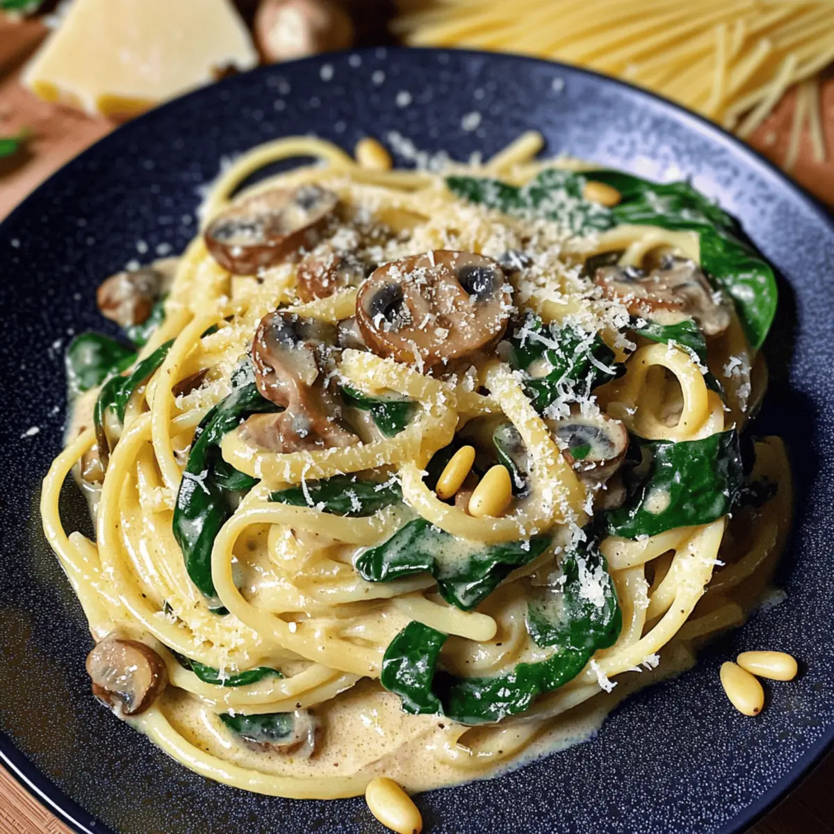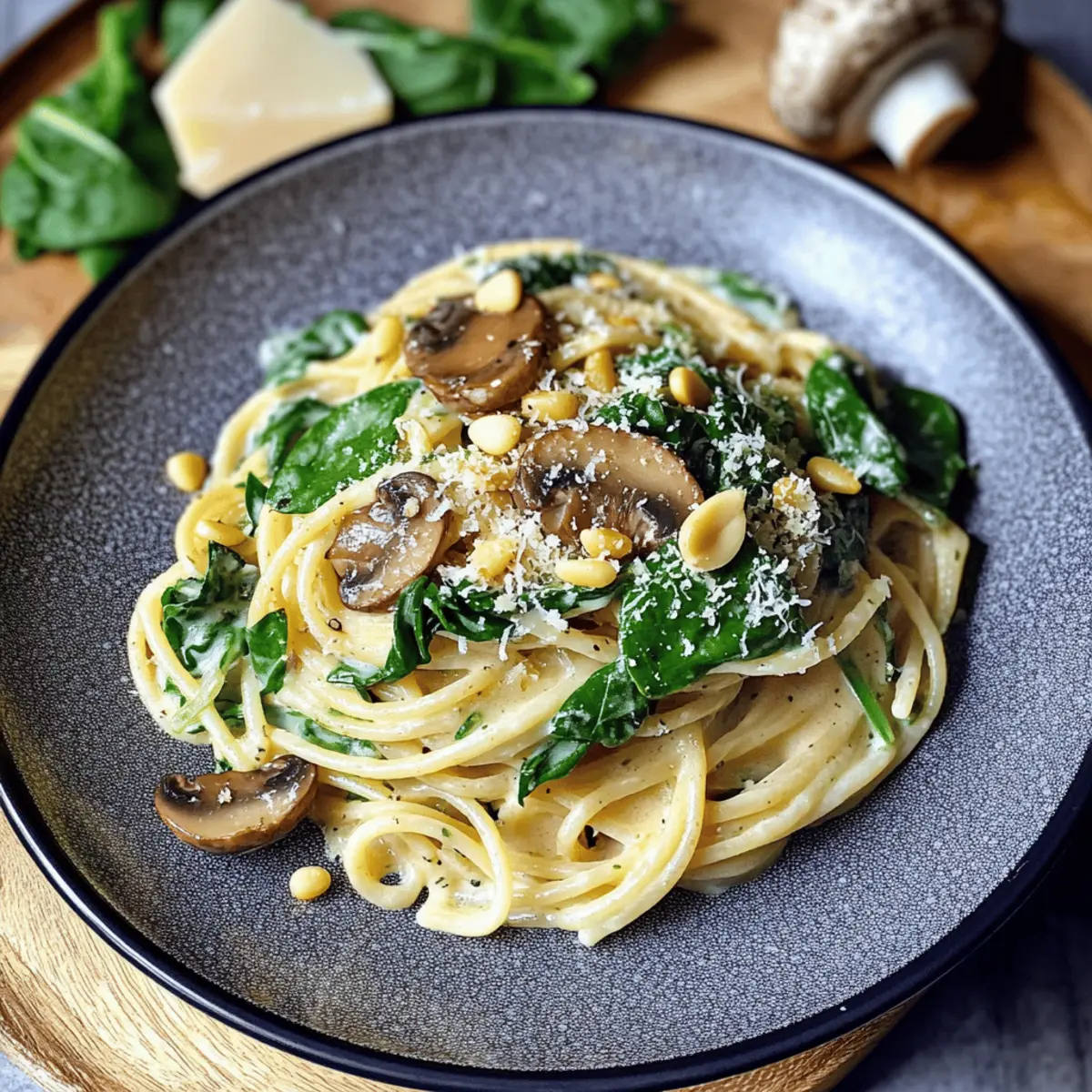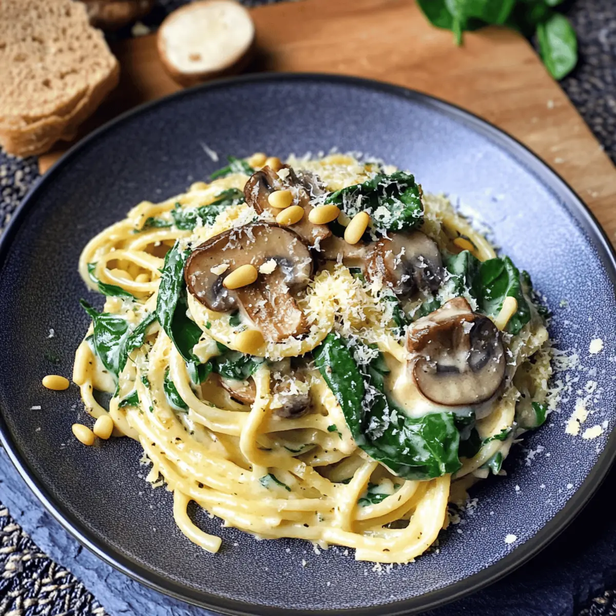 Die Aromen eines gemütlichen Abends in Italien faszinieren mich jedes Mal aufs Neue, besonders wenn ich an cremige Pilz- und Spinatpasta denke. Dieses Gericht vereint zarte Linguine mit einer samtigen Parmesansoße, die nicht nur vegetarisch, sondern auch blitzschnell zubereitet ist. Perfekt für Menschen, die sich nach einem herzhaften Komfortgericht sehnen, ohne viel Aufwand zu betreiben. Die Kombination aus umami-reichen Crimini-Pilzen und frischem Spinat macht dieses Rezept zu einer wahren Gaumenfreude und eignet sich ideal für ein entspanntes Dinner mit Familie und Freunden. Lust auf ein herzhaftes Geschmackserlebnis, das nicht nur den Magen, sondern auch die Seele nährt? Warum wirst du dieses Rezept lieben? Einfache Zubereitung: Die Schritte sind klar und benötigen nur grundlegende Kochkenntnisse. Reichhaltiger Geschmack: Die Kombination aus Pilzen und frischem Spinat sorgt für ein umami-reiches Erlebnis. Perfekte Texturen: Die cremige Sauce umschmeichelt die al dente Linguine und sorgt für ein tolles Mundgefühl. Vielseitigkeit: Füge ganz nach Lust und Laune Hähnchen oder Garnelen hinzu, um das Rezept anzupassen, oder probiere es mit einer Seite wie dem Spinatsalat mit Feta und Cranberries, um noch mehr Abwechslung zu schaffen. Schnell und effizient: In nur 30 Minuten ist dieses köstliche Gericht servierbereit und ideal für hektische Abende. Zutaten für cremige Pilz-Spinat-Pasta • Entdecke die wichtigsten Zutaten für dieses köstliche Rezept! Für die Sauce Olivenöl – Ideal zum Sautieren von Pilzen und Knoblauch; kann durch neutrales Öl ersetzt werden. Crimini-Pilze (8-10, in Scheiben) – Hauptgeschmacksträger, die für umami sorgen; können auch durch Shiitake, Portobello oder Kastanienpilze ersetzt werden. Knoblauch (2 Zehen, gehackt) – Verleiht aromatische Tiefe; frisch ist bevorzugt gegenüber Pulver. Kochsahne (1 Tasse) – Entsteht die cremige Sauce; Vollfettcreme funktioniert am besten, alternativ kann Halbfettcreme oder Milch verwendet werden. Hühnerbrühwürfel (⅓) – Fügt Tiefe hinzu; kann mit Gemüsebrühe für eine vegane Option ersetzt werden. Getrocknete Basilikumblätter (½ Teelöffel) – Geschmacksträger; italienische Kräuter können als Ersatz verwendet werden. Schwarzer Pfeffer (½ Teelöffel, gemahlen) – Für Würze und Geschmack; nach Belieben anpassen. Für die Pasta und Spinat Linguine (150g) – Basis des Gerichts, bietet eine perfekte Textur für die Sauce; Ersatzmöglichkeiten sind Tagliatelle, Pappardelle, Penne oder Fusilli. Baby-Spinat (1 Tasse) – Frische Blätter, die in der Pasta welken und Nährstoffe hinzufügen. Für das Topping Pinienkerne (2 Esslöffel, geröstet) – Fügt eine nussige Textur hinzu; optional, aber empfohlen für zusätzlichen Crunch. Kann durch Walnüsse ersetzt oder weggelassen werden. Parmesan (¼ Tasse + extra zum Bestreuen) – Verleiht der Sauce einen reichhaltigen, nussigen Geschmack; stark im Geschmack und nicht ersetzbar – Grana Padano kann als Alternative genutzt werden. Schritt-für-Schritt-Anleitung für cremige Pilz-Spinat-Pasta Step 1: Pasta kochen Kochen Sie die Linguine gemäß den Anweisungen auf der Verpackung in leicht gesalzenem Wasser, bis sie al dente sind. Achten Sie darauf, die Pasta rechtzeitig zu kochen, damit sie mit der Sauce fertig ist. Gießen Sie die Linguine ab, aber spülen Sie sie nicht, damit die Stärke an der Pasta haftet und die Sauce besser bindet. Step 2: Pilze sautieren Erhitzen Sie in einer großen Pfanne bei mittlerer bis hoher Hitze etwas Olivenöl. Fügen Sie die in Scheiben geschnittenen Crimini-Pilze hinzu und braten Sie sie an, bis sie goldbraun und karamellisiert sind, etwa 5-7 Minuten. Rühren Sie gelegentlich um, um ein gleichmäßiges Garen zu gewährleisten und ein Anbrennen zu vermeiden. Step 3: Knoblauch hinzufügen Streuen Sie den gehackten Knoblauch über die Pilze in der Pfanne und lassen Sie ihn für etwa 2 Minuten mitbraten, bis er aromatisch ist, aber nicht braun wird. Achten Sie darauf, die Hitze nicht zu hoch einzustellen, da verbrannter Knoblauch den Geschmack der dipsauernden cremigen Pilz-Spinat-Pasta beeinträchtigen kann. Step 4: Sauce zubereiten Gießen Sie nun die Kochsahne in die Pfanne zu den Pilzen und dem Knoblauch. Fügen Sie den Hühnerbrühwürfel, schwarzen Pfeffer und die getrockneten Basilikumblätter hinzu. Lassen Sie die Mischung auf mittlerer Hitze 4-5 Minuten köcheln, bis sie leicht eindickt und cremig wird. Rühren Sie ständig um, um ein Anbrennen zu verhindern. Step 5: Käse einrühren Streuen Sie den geriebenen Parmesan in die Sauce und rühren Sie kräftig um, bis er vollständig geschmolzen ist und die Sauce schön cremig wird. Der Käse verleiht der cremigen Pilz-Spinat-Pasta ihren charakteristischen würzigen und nussigen Geschmack. Probieren Sie die Sauce und passen Sie nach Belieben Pfeffer an. Step 6: Pasta kombinieren Fügen Sie die abgetropfte Linguine direkt in die Pfanne mit der cremigen Sauce hinzu. Verwenden Sie eine Zange, um die Pasta sorgfältig zu wenden, sodass jede Nudel mit der Sauce überzogen wird. Diese Verbindung von Pasta und Sauce ist entscheidend für das Geschmackserlebnis der cremigen Pilz-Spinat-Pasta. Step 7: Spinat hinzufügen Nehmen Sie die Pfanne von der Hitze und mischen Sie den Baby-Spinat unter die Pasta. Der Spinat wird schnell zusammenfallen und wird in die Pasta integriert, während er frische Aromen und eine lebendige Farbe hinzufügt. Dieser Schritt ist sowohl für den Geschmack als auch für die Nährstoffe wichtig. Step 8: Fertigstellen Rösten Sie die Pinienkerne in einer separaten Pfanne bei niedriger Hitze goldbraun, gleichzeitig während der letzten Schritte der Zubereitung. Servieren Sie die cremige Pilz-Spinat-Pasta in Schalen und streuen Sie die gerösteten Pinienkerne und zusätzlich Parmesan darüber, um einen köstlichen Crunch und einen eleganten Look zu erzielen. Variationen & Alternativen Mach deine cremige Pilz-Spinat-Pasta noch einzigartiger mit di