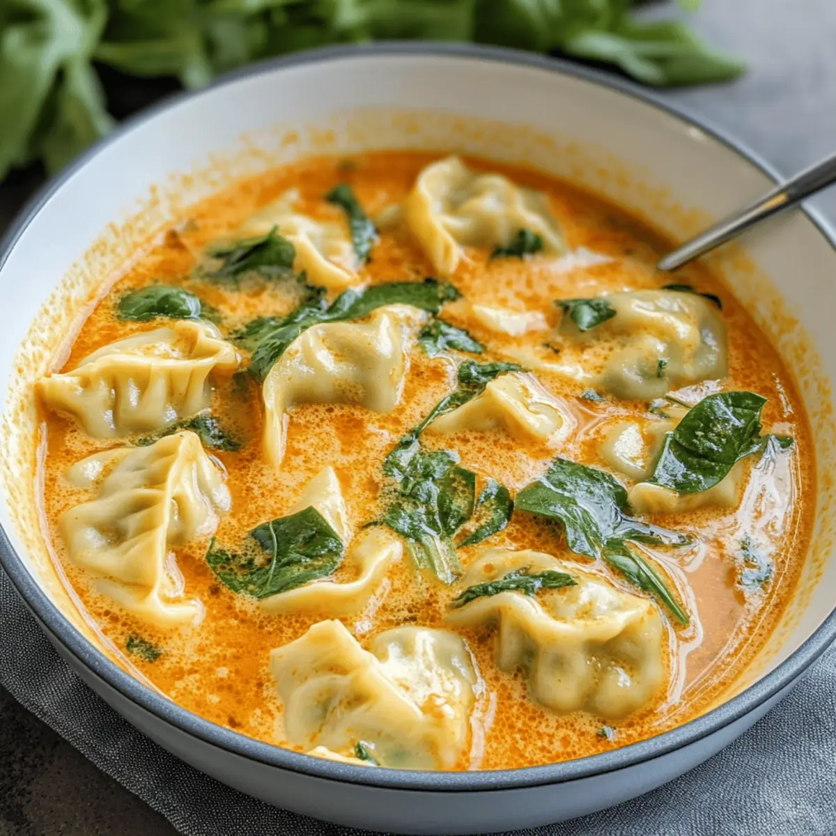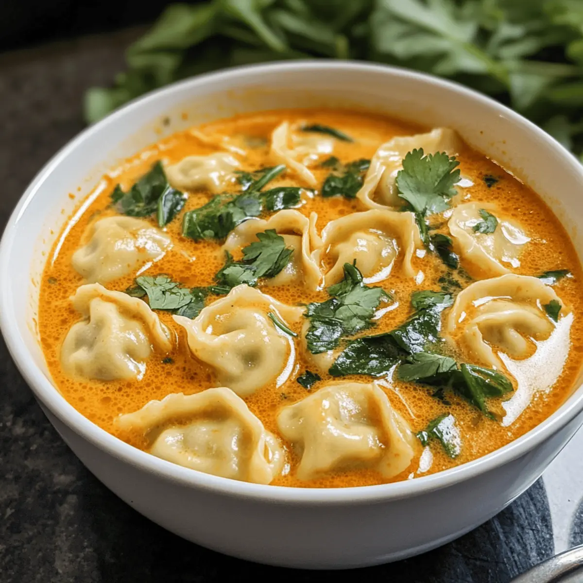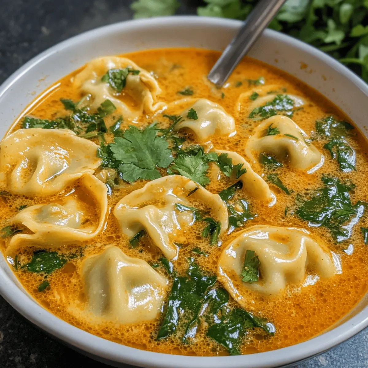 Die Aromen Thailands in einer warmen, einladenden Schüssel – was kann es Schöneres geben? Diese Creme Thai Dumplingsuppe kombiniert die Reichtümer der thailändischen Küche mit dem Komfort einer herzhaften Speise, die in weniger als 30 Minuten zubereitet werden kann. Mit einem cremigen Kokosnuss-Curry-Brühe, zarten Dumplings und aromatischen Zutaten wie Zitronengras und Ingwer ist sie die ideale Wahl für ein schnelles Abendessen unter der Woche oder um Gäste zu beeindrucken. Das Beste daran? Die Suppe ist nicht nur äußerst schmackhaft, sondern auch anpassbar und enthält Optionen für Vegetarier. Wer könnte da schon widerstehen? Lass uns eintauchen und herausfinden, wie du diese köstliche Kreation zu Hause zaubern kannst! Warum wirst du diese Suppe lieben? Wärme und Trost: Diese Cremige Thai-Dumpling-Suppe ist wie eine Umarmung in einer Schüssel, perfekt für kalte Abende. Schnell zubereitet: Mit einer Zubereitungszeit von weniger als 30 Minuten ist sie ideal für hektische Wochentage. Flexibilität: Verwandle die Suppe ganz nach deinem Geschmack: sei es mit zusätzlichen Gemüsesorten oder durch den Austausch der Dumplings gegen Tofu oder Hühnchen. Aromatische Frische: Die Kombination aus Zitronengras und Ingwer sorgt für eine erfrischende Geschmacksnote, die das Gericht besonders macht. Vegetarische Optionen: Diese Suppe ist anpassbar und bietet köstliche Optionen für Vegetarier. Probiere auch mal unsere Wuerzige Chinakohl Rinderhack oder mit Scharfe Knoblauch Rindersteak für eine herzhaftere Variante! Cremige Thai-Dumpling-Suppen-Zutaten Hinweis: Bereite dich vor, dein Zuhause mit dem köstlichen Aroma dieser cremigen Thai-Dumpling-Suppe zu erfüllen! Für die Brühe • Thai-Rote-Curry-Paste – Sie sorgt für die Basisgeschmackstiefe; wähle je nach gewünschter Schärfe zwischen Thai Kitchen (mild) und Maesri (authentisch). • Kokosmilch – Fügt eine herrliche Cremigkeit hinzu; verwende die Vollfettversion für die beste Konsistenz. • Hühnerbrühe – Die herzhafte Flüssigkeitsbasis; für eine vegetarische Option wechsle zu Gemüsebrühe. • Fischsauce – Bringt umami Tiefe; bei Fischverzicht kann Sojasauce verwendet werden. Für die Dumplings • Eingefrorene Dumplings (Teigtaschen/Wontons) – Das Hauptprotein für Textur und Sättigung; probiere Marken wie Bibigo oder Trader Joe’s. Selbstgemachte Dumplings sind auch eine großartige Wahl. Aromen hinzufügen • Frisches Zitronengras/Ingwer – Sorgt für aromatische Frische; verwende Paste, wenn frische Zutaten nicht verfügbar sind. • Gemüse (optional) – Füge Spinat oder andere grüne Sorten hinzu, um die Nährstoffe zu erhöhen. Für das Topping • Koriander – Für frische Noten und einen schönen Farbkontrast. • Limettensaft – Bringt eine spritzige Frische; perfekt, um die Aromen zu intensivieren. • Knusprige Elemente – Schaffe einen spannenden Texturkontrast für ein unvergessliches Esserlebnis. Mit diesen Zutaten kannst du die perfekt cremige Thai-Dumpling-Suppe kreieren, die nicht nur deine Geschmacksknospen verwöhnt, sondern auch in kürzester Zeit auf den Tisch kommt! Schritt-für-Schritt-Anleitung für die Cremige Thai-Dumpling-Suppe Step 1: Brühe vorbereiten Erhitze in einem großen Topf bei mittlerer Hitze die Kokosmilch und die Hühnerbrühe langsam, bis sie sanft köcheln. Achte darauf, dass die Brühe heiß, aber nicht kochend ist, damit sie ihre Cremigkeit behält. Rühre gelegentlich um, um ein Anbrennen zu verhindern und genieße das Aroma, das sich entfaltet. Step 2: Aromen hinzufügen Stir in die warmen Brühe die Thai-Rote-Curry-Paste und die Fischsauce. Lasse die Mischung etwa 2-3 Minuten köcheln, bis sich die Aromen gut vermengt haben. Passt die Schärfe nach Belieben an, und achte darauf, dass die Brühe einen wunderschönen, aromatischen Duft ausstrahlt. Step 3: Zitronengras und Ingwer einfügen Füge das frische Zitronengras und den Ingwer zur Brühe hinzu und lasse die Mischung weitere 5 Minuten leicht köcheln. Die Hitze hilft, die ätherischen Öle der aromatischen Zutaten freizusetzen, was für eine wunderbare Duftnote sorgt. Achte darauf, dass sich die Brühe gut mit den Aromen durchzieht. Step 4: Dumplings kochen Gib die gefrorenen Dumplings direkt aus dem Gefrierfach in die Brühe und koche sie für etwa 5-8 Minuten. Sie sind fertig, wenn sie aufschwimmen und eine zarte, plumpige Textur erreicht haben. Rühre vorsichtig um, damit die Dumplings nicht am Boden des Topfes haften bleiben. Step 5: Abschmecken und servieren Schmecke die Brühe der Cremigen Thai-Dumpling-Suppe ab und passe die Würze nach deinem Geschmack an. Füge die frisch gehackten grünen Blätter hinzu, falls du diese verwendest, und lasse sie kurz in der heißen Brühe zusammenfallen. Step 6: Anrichten Serviere die Suppe heiß und garniere sie nach Belieben mit frischem Koriander, einem Spritzer Limettensaft und knusprigen Elementen. Bewundere die lebhaften Farben und fülle deine Schüsseln großzügig mit dieser wärmenden, einladenden Cremigen Thai-Dumpling-Suppe, die jeden Bissen zu einem Genuss macht. Was passt gut zur Cremigen Thai-Dumpling-Suppe? Die Verbindung von Aromen und Texturen kann ein einfaches Abendessen in ein unvergessliches Erlebnis verwandeln. Frischer Gurkensalat: Erfrischende Noten und knackige Textur harmonieren perfekt mit der cremigen Suppe und bringen eine leichte Frische ins Spiel. Ein einfaches Dressing aus Limette und Sesamöl vollendet ihn. Knuspriges Baguette: Das knusprige Brot eignet sich hervorragend, um die würzige Brühe aufzusaugen, und sorgt für einen befriedigenden Kontrast zu den zarten Dumplings. Gebackene Frühlingsrollen: Diese sind eine fantastische Ergänzung, da ihr knuspriger Biss den cremigen Charakter der Suppe ausgleicht. Sie können leicht selbst gemacht oder gekauft werden. Kokosnuss-Limonade: Ein erfrischendes Getränk mit einem Hauch von tropischer Süße, das die Aromen der Suppe verstärkt und für einen zusätzlichen Hauc