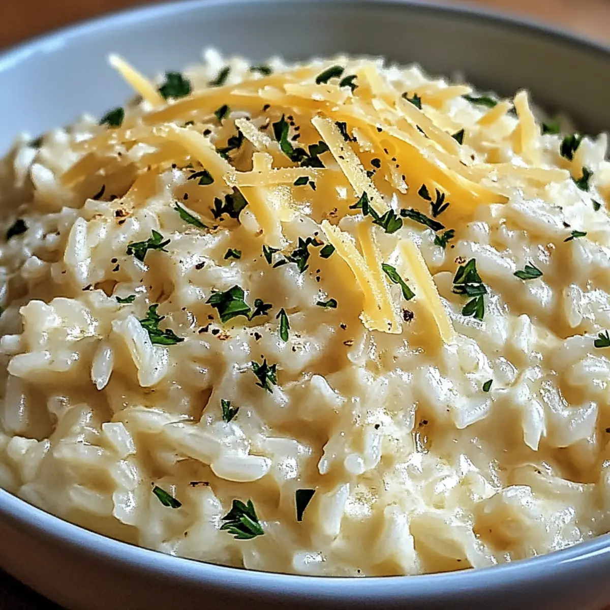 Es gibt einen besonderen Moment in der Küche, wenn die ersten Aromen von gebratenen Zwiebeln und geschmolzenem Butter in die Luft steigen. Dieser verführerische Duft kündigt an, dass gleich etwas Einmaliges entsteht – unser cremiger Parmesanreis. Diese köstliche Beilage verbindet cremige Textur mit einem Hauch von Zitrone und verwandelt einfache Zutaten in ein unkompliziertes, aber raffiniertes Gericht. Perfekt für stressige Wochentage, lässt sich der Cremige Parmesanreis in nur 30 Minuten zubereiten und passt wunderbar zu jeder Proteinquelle oder Gemüsebeilage. Egal, ob du deinen Lieben ein schnelles Familienessen zaubern oder Gäste beeindrucken möchtest, dieses Rezept wird garantiert zum neuen Lieblingsgericht auf dem Tisch! Was hast du für Kombinationen im Kopf? Warum wirst du dieses Rezept lieben? Schnelle Zubereitung: In nur 30 Minuten zauberst du eine köstliche Beilage, die jeder genießen kann. Vielseitigkeit: Dieser cremige Parmesanreis passt hervorragend zu zahlreichen Gerichten wie Cremiger Lachs Florentiner oder geschmortem Hähnchen. Einfachheit: Die Zutaten sind leicht verfügbar und du brauchst keine speziellen Kochkenntnisse. Erhöhter Komfort: Die cremige Textur und der zarte Parmesan machen jede Portion unwiderstehlich. Kreative Variationen: Du kannst ihn mit frischem Gemüse oder Kräutern anpassen – die Möglichkeiten sind grenzenlos! Mit diesem Rezept bringst du ein Stück Gemütlichkeit in deine Küche! Cremiger Parmesanreis Zutaten Für den Reis • 1 Tasse Langkornreis – Die Basis des Gerichts, die perfekt die Aromen aufnimmt; verwende keinen braunen oder instant Reis für maximalen Cremigkeitsgrad. • 4 Esslöffel Butter – Verleiht ein reichhaltiges Aroma; alternativ kannst du Olivenöl für eine leichtere Option verwenden. • 1 kleine Zwiebel, fein gewürfelt – Sorgt für süßliche Note und Aroma; bis zur Transparenz anbraten. • ½ Teelöffel Knoblauchpulver – Intensiviert den herzhaften Geschmack; frisch gehackter Knoblauch bringt zusätzlichen Pfiff. • ½ Teelöffel Salz – Balanciert die Aromen; nach Geschmack anpassen, abhängig von der Salzigkeit der Brühe. • 1 ¼ Tassen Brühe (Hühner- oder Gemüsebrühe) – Liefert essentielle Flüssigkeit und Geschmack; nutze Gemüsebrühe für eine vegetarische Version. • 1 ½ Tassen Milch (geteilt) – Sorgt für Cremigkeit; 2% Milch wird empfohlen. • 1 Esslöffel Zitronensaft – Verleiht einen frischen Kick; je nach Geschmack anpassen. • ½ Tasse frisch geriebener Parmesan – Essentiell für die cremige Textur; frisch geriebener Käse hat den besten Geschmack. • 1 Esslöffel frische Petersilie, gehackt – Dient als Garnitur für Farbe und Frische. Optional: Für Variationen • Gekochtes Gemüse (z.B. Erbsen oder Spinat) – Für zusätzliche Farbe und Nährstoffe, einfach kurz vor dem Servieren unterheben. • Frische Kräuter (z.B. Basilikum oder Thymian) – Experimentiere mit verschiedenen Geschmäckern zur Verbesserung des Aromas. • Gekochtes Hähnchen oder Garnelen – Füge diese in den letzten Minuten des Kochens hinzu, um eine proteinreiche Mahlzeit zu kreieren. Mit diesen Zutaten bereitest du den cremigen Parmesanreis zu – ein Rezept, das sowohl einfach als auch köstlich ist! Schritt-für-Schritt-Anleitung für Cremiger Parmesanreis Step 1: Butter schmelzen Schmelze in einem mittelgroßen Topf oder einem Dutch Oven 4 Esslöffel Butter bei mittlerer Hitze, bis sie leicht schäumt und blubbert. Achte darauf, dass die Butter nicht bräunt, um den reinen Geschmack zu bewahren. Der Topf sollte heiß genug sein, um die Zwiebeln perfekt anzubraten. Step 2: Zwiebeln sautieren Füge die fein gewürfelte Zwiebel hinzu und brate sie für 2-3 Minuten an, bis sie durchsichtig und weich ist. Rühre regelmäßig um, um eine gleichmäßige Garung zu gewährleisten. Der köstliche Duft der Zwiebeln wird dir sofort das Wasser im Mund zusammenlaufen lassen. Step 3: Reis rösten Gib 1 Tasse Langkornreis, ½ Teelöffel Knoblauchpulver und ½ Teelöffel Salz in den Topf. Lasse die Mischung für etwa 1 Minute anrösten, damit der Reis die Aromen aufnehmen und nuttige Noten entwickeln kann. Rühre gut um, damit die Körner gleichmäßig bedeckt sind. Step 4: Brühe und Milch hinzufügen Gieße 1 ¼ Tassen Brühe (Hühner- oder Gemüsebrühe) und 1 ¼ Tassen Milch in den Topf, und hebe ¼ Tasse Milch für später auf. Bring alles zum Kochen, während du gelegentlich umrührst. Die Mischung sollte sprudelnd sein, um die Garzeit zu starten. Step 5: Köcheln lassen Reduziere die Hitze auf niedrig und decke den Topf ab. Lasse den Cremigen Parmesanreis für etwa 20 Minuten bei schwacher Hitze köcheln. Rühre zwischendurch um, um sicherzustellen, dass der Reis nicht am Boden anhaftet und gleichmäßig gar wird. Step 6: Gargrad prüfen Überprüfe nach 20 Minuten die Zartheit des Reises. Er sollte weich, aber nicht matschig sein. Falls er noch fest ist, decke ihn ab und lasse ihn für weitere 1-2 Minuten kochen. Achte auf die Textur, um die perfekte Konsistenz zu erreichen. Step 7: Milch und Käse einrühren Nimm den Topf vom Herd und füge die reservierte ¼ Tasse Milch, 1 Esslöffel Zitronensaft und ½ Tasse frisch geriebenen Parmesan hinzu. Rühre alles gut um, bis der Käse geschmolzen ist und eine cremige, gleichmäßige Masse entsteht. Der cremige Parmesanreis wird jetzt eine unwiderstehliche Textur erhalten. Step 8: Garnieren und Servieren Gib 1 Esslöffel frische, gehackte Petersilie über den Reis, um ihm Farbe und Frische zu verleihen. Serviere den cremigen Parmesanreis sofort, um die köstliche Cremigkeit zu genießen. Das Gericht wird deine Gäste und Familie gleichermaßen begeistern! Expert Tips für Cremigen Parmesanreis Butter richtig schmelzen: Achte darauf, dass die Butter beim Schmelzen nicht bräunt, um den reinen Geschmack zu bewahren. Ein sauberer Geschmack macht den cremigen Parmesanreis noch schmackhafter. Perfekte Reiskonsistenz: Überprüfe den Gargrad des Reises