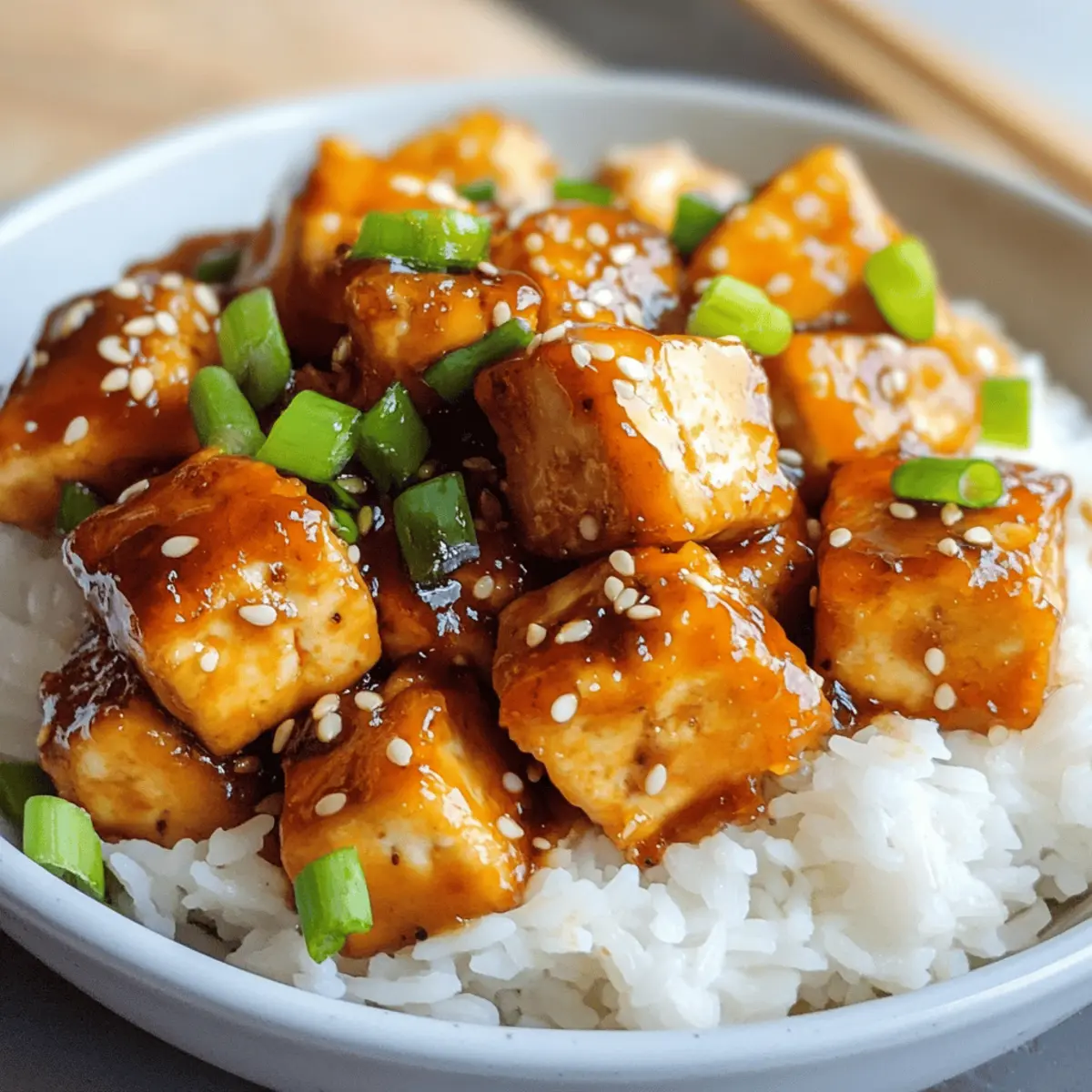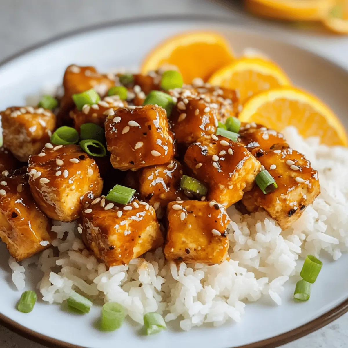 Als ich neulich in der Küche stand und den köstlichen Duft von frisch gebackenem Tofu wahrnahm, wurde mir sofort klar, dass ich den klassischen orangefarbenen Hähnchen-Geschmack neu interpretiere. Das Rezept für meinen knusprigen gebackenen Orangentofu ist eine gesunde, vegane Alternative, die perfekt in den hektischen Alltag passt. in nur 30 Minuten hast du eine schmackhafte Mahlzeit auf dem Tisch, die nicht nur die Geschmacksknospen erfreut, sondern auch glutenfrei und voller pflanzlicher Nährstoffe ist. Diese knusprige Variante bringt frische Farbe und neuen Schwung in dein Kochrepertoire. Bist du bereit, deinen Gaumen mit einer unwiderstehlichen Mischung aus süß, sauer und herzhaft zu verzaubern? Warum wirst du dieses Rezept lieben? Einfachheit: Die Zubereitung ist unkompliziert und benötigt nur grundlegende Kochkenntnisse. Herzhafter Geschmack: Die Kombination aus einer verfänglichen orangenen Glasur und knusprigem Tofu sorgt für ein intensives Geschmackserlebnis. Vegan und glutenfrei: Diese gesunde Variante ist perfekt für alle, die auf tierische Produkte und Gluten verzichten möchten. Schnelle Zubereitung: Mit nur 30 Minuten Gesamtzeit ist es ideal für beschäftigte Tage. Vielseitigkeit: Du kannst das Rezept ganz nach deinem Geschmack anpassen, indem du gesunde Beilagen wie gedämpftes Gemüse oder Blumenkohlreis hinzufügst oder die Orange durch andere Zitrusfrüchte ersetzt. Wenn du mehr über die Zubereitung von köstlichen veganen Gerichten erfahren möchtest, schau dir auch unser Zitronen Brownies Rezept an, das einfach unwiderstehlich ist! Zutaten für knusprigen gebackenen Orangentofu • Für den Tofu Tofu – verwende extra festen Tofu für die beste Textur. Salz – verstärkt den Geschmack; nach Belieben anpassen. • Für die Panade Maisstärke – sorgt für eine knusprige Beschichtung; kann durch Pfeilwurzpulver ersetzt werden. Kochöl (z.B. Avocadoöl) – hilft beim Frittieren oder Sprühen des Tofus für zusätzliche Knusprigkeit. • Für die Sauce Orangensaft – das Hauptgeschmackselement; frisch gepresst ist am besten, aber auch Flaschenvariante geht. Wasser – verdünnt die Sauce für das richtige Gleichgewicht. Knoblauch – verleiht Tiefe; frisch ist am wirkungsvollsten. Kokoszucker – süßt die Sauce, brauner Zucker kann verwendet werden als Ersatz. Tamari oder Sojasauce – liefert Umami-Geschmack; Tamari bleibt glutenfrei. Limettensaft – hebt den Geschmack; Zitronensaft kann ersetzt werden. Reisessig – sorgt für Säure; kann auch durch Apfelessig substituiert werden. Geröstetes Sesamöl – bietet einen reichen, nussigen Geschmack; normales Sesamöl geht auch. • Für das Servieren Reis oder Blumenkohlreis – empfehlene Basis; Blumenkohlreis ist eine kohlenhydratarme Variante. Gedämpftes Gemüse (z.B. Brokkoli, Bok Choy) – optionale Beilagen für eine vollständige Mahlzeit. Sesamsamen & Frühlingszwiebeln – Garnituren, die den Geschmack und das Aussehen verbessern. Mit diesen Zutaten wirst du auf jeden Fall den perfekten knusprigen gebackenen Orangentofu zubereiten, der eine köstliche und gesunde Alternative zu Fast Food bietet. Schritt-für-Schritt-Anleitung für knusprigen gebackenen Orangentofu Step 1: Tofu vorbereiten Drücke den extra festen Tofu, um überschüssige Feuchtigkeit zu entfernen, und trockne ihn gründlich ab. Schneide den Tofu in gleichmäßige Stücke, wobei die unregelmäßigen Ränder für mehr Textur sorgen. Lege die Stücke beiseite und stelle sicher, dass sie gut abgetropft sind, damit sie beim Backen knuspriger werden. Step 2: Panade herstellen Gib die Tofustücke in eine große Schüssel und streue die Maisstärke und eine Prise Salz darüber. Wende die Stücke gründlich, bis sie gleichmäßig mit der Mischung überzogen sind. Diese knusprige Panade sorgt beim Backen für die perfekte Textur und Geschmack des knusprigen gebackenen Orangentofu. Step 3: Tofu backen Heize den Ofen auf 200°C vor und lege ein Backblech mit Backpapier aus. Platziere die panierten Tofustücke gleichmäßig auf dem Blech, ohne dass sie sich berühren. Sprühe die Stücke leicht mit dem Kochöl ein und backe sie 20 Minuten lang, bis sie goldbraun sind, und wende sie nach der Hälfte der Zeit, um eine gleichmäßige Bräunung zu gewährleisten. Step 4: Sauce zubereiten In einem kleinen Topf mische den frisch gepressten Orangensaft, Wasser, gehackten Knoblauch, Kokoszucker, Tamari, Limettensaft, Reisessig und das geröstete Sesamöl. Erhitze die Mischung bei niedriger Temperatur und lasse sie sanft köcheln, bis die Sauce dick wird und die Aromen sich entfalten, etwa 5 bis 10 Minuten. Step 5: Tofu mit Sauce kombinieren Nehme das Backblech mit dem knusprigen gebackenem Orangentofu aus dem Ofen. Gib die vorbereitete Sauce in die Schüssel mit dem Tofu und wende sie vorsichtig, bis alle Stücke gut mit der orangenen Glasur bedeckt sind. Achte darauf, die Tofustücke nicht zu zerbrechen und eine gleichmäßige Beschichtung zu gewährleisten. Step 6: Anrichten und servieren Serviere den knusprigen gebackenen Orangentofu über einer Basis aus Reis oder Blumenkohlreis. Garniere das Gericht nach Belieben mit frisch gerösteten Sesamsamen und gehackten Frühlingszwiebeln. Füge optional gedämpftes Gemüse wie Brokkoli oder Bok Choy hinzu, um eine gesunde und ausgewogene Mahlzeit zu vervollständigen. Meal Prep für knusprigen gebackenen Orangentofu Die Zubereitung von knusprigem gebackenem Orangentofu ist ideal für beschäftigte Köche, die Zeit sparen wollen! Du kannst den Tofu bis zu 24 Stunden im Voraus vorbereiten, indem du ihn presst, zuschneidest und in Maisstärke wälzt. Lagere die panierten Tofustücke in einem luftdichten Behälter im Kühlschrank, um die Qualität zu bewahren. Die Sauce kann ebenfalls bis zu 3 Tage im Voraus zubereitet werden; einfach im Kühlschrank aufbewahren. Wenn es Zeit ist, das Gericht zu genießen, heize den Ofen auf 200°C vor, backe den Tofu nach den Anweisungen und kombiniere ihn mit der zuv