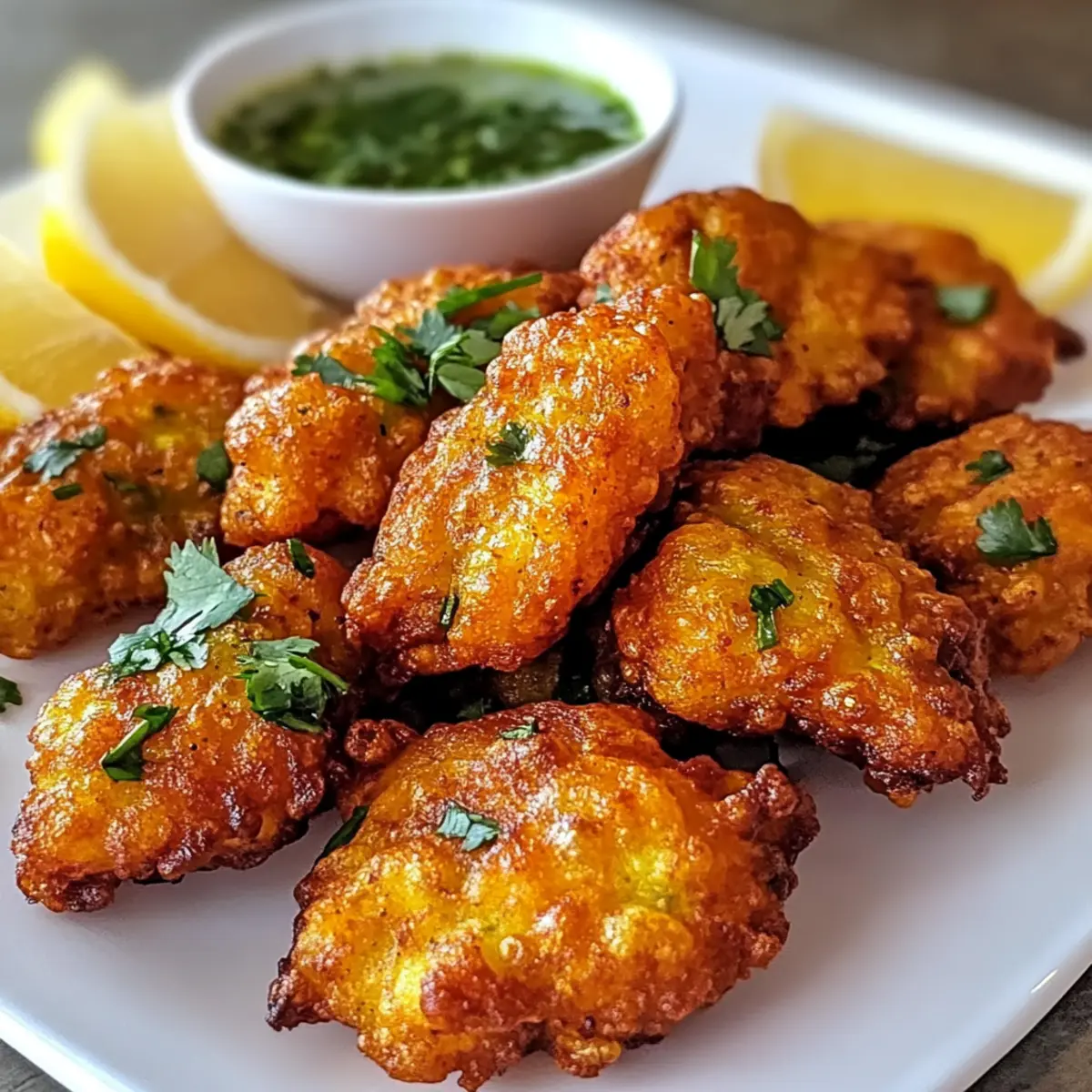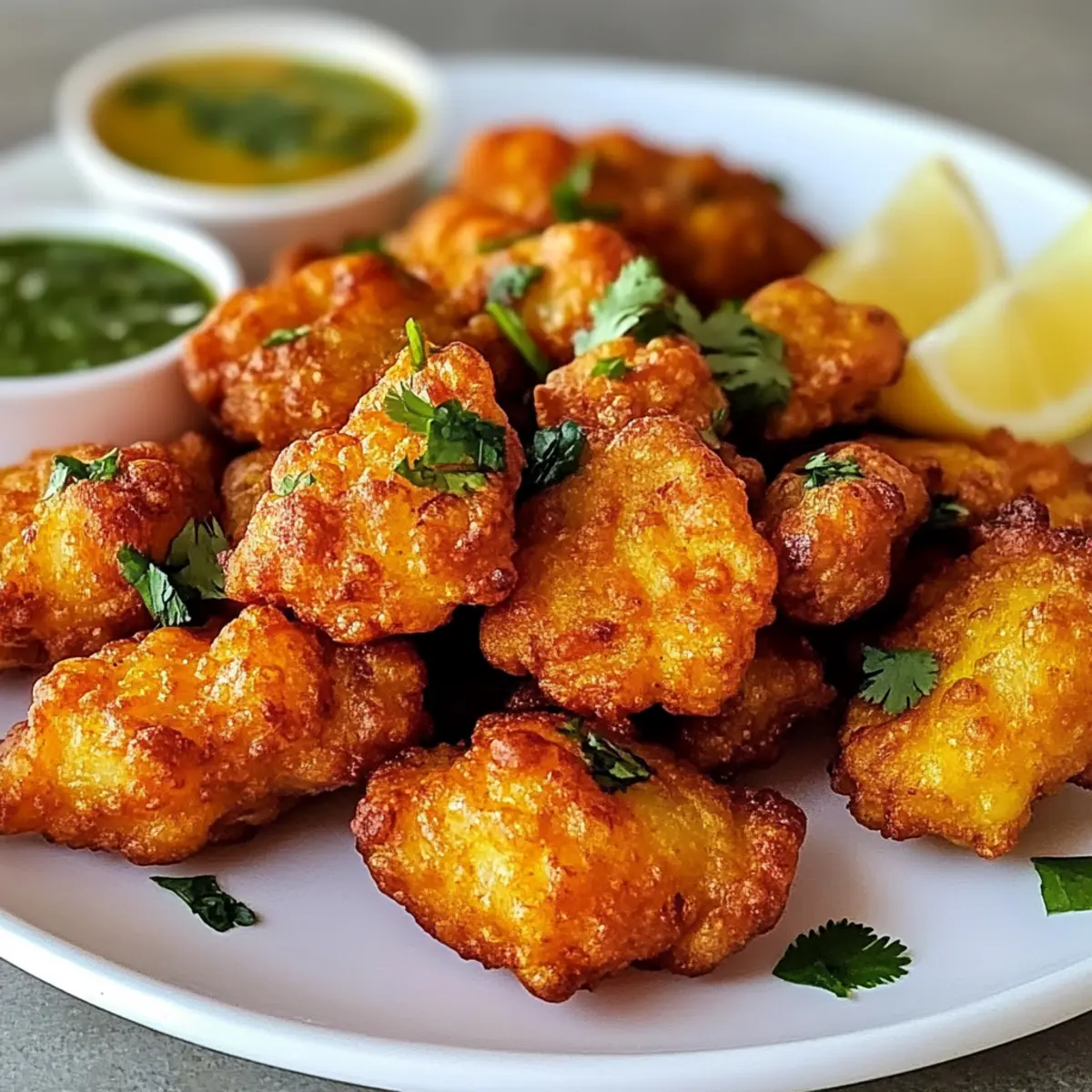 Wenn der herrliche Duft von frisch frittiertem Fisch durch die Küche zieht, kann ich einfach nicht widerstehen, gleich eine Portion Crispy Fisch Pakora zuzubereiten! Diese köstlichen Snacks sind mehr als nur eine Gaumenfreude – sie sind eine Einladung, die Aromen Indiens und Pakistans direkt auf den Tisch zu bringen. In weniger als 30 Minuten auf den Tisch gezaubert, sind sie nicht nur schnell und unkompliziert, sondern lassen sich auch je nach Geschmack anpassen – ob mit verschiedenen Fischen oder einer vegetarischen Variante. Mit einer knusprigen Hülle und einer zarten Füllung sind diese Pakoras perfekt für gesellige Abende oder einfach als kleiner Genuss für zwischendurch. Ich kann es kaum erwarten, sie mit etwas süßem Tamarinden-Chutney zu servieren – wie wäre es mit dir? Warum wirst du diese Pakoras lieben? Köstlicher Crunch: Die Crispy Fisch Pakoras bieten einen unwiderstehlichen, knusprigen Biss, der das Herz eines jeden Snack-Liebhabers höher schlagen lässt. Vielfältige Varianten: Egal, ob du Fisch-Liebhaber oder Vegetarier bist, die Rezeptvariationen ermöglichen es dir, nach Lust und Laune zu experimentieren. Schnelle Zubereitung: In weniger als 30 Minuten sind diese Pakoras fertig – ideal für spontane Einladungen oder eine schnelle Mahlzeit. Geselligkeit garantiert: Perfekt für gesellige Abende, lassen sich die Pakoras wunderbar mit Freunden und Familie teilen. Warum nicht noch ein paar Dips ausprobieren? Du könntest sie mit scharfer Knoblauch Rindersteak Pasta kombinieren, um die Geschmackskombination zu erweitern. Gesunde Snacks: Mit glutenfreien Optionen sind diese Pakoras nicht nur lecker, sondern passen auch zu unterschiedlichen diätetischen Bedürfnissen. Mach dich bereit, deine Küche in eine kleine indische Snack-Oase zu verwandeln! Crispy Fisch Pakora Zutaten Für den Teig: Kichererbsenmehl: – Unverzichtbar für die knusprige Hülle. Reismehl: – Steigert die Knusprigkeit des Teigs; kann durch Maisstärke ersetzt werden. Wasser: – Nach Bedarf hinzufügen, um eine dickflüssige, glatte Konsistenz zu erreichen. Grüne Chilis (in Scheiben): – Verleiht einen scharfen Kick; nach Geschmack anpassen. Frischer Koriander (gehackt): – Für eine frische Note und Farbe. Gewürze (Salz, rote Chilischote, Kreuzkümmel, Kurkumapulver): – Für zusätzliche Geschmackstiefe und Komplexität. Für den Fisch: Boneless White Fish: – Das Hauptzutat, einfach zuzubereiten und reich an Proteinen; geeignete Optionen sind Kabeljau oder Tilapia. Salz: – Hebt den natürlichen Geschmack des Fisches; nach Belieben anpassen. Ingwer (gehackt): – Fügt wärmende, tiefgehende Aromen hinzu. Knoblauch (gehackt): – Bringt ein aromatisches und kräftiges Element ins Spiel. Zitronensaft: – Zartet den Fisch und hebt die Aromen; keine längere Marinierzeit, um ein Zerfallen des Fisches zu vermeiden. Mit diesen Zutaten zauberst du die perfekte Crispy Fisch Pakora. Lass deiner Kreativität freien Lauf und passe die Gewürze nach deinem Geschmack an! Schritt-für-Schritt-Anleitung für Crispy Fisch Pakora Schritt 1: Fisch marinieren Zuerst schneiden Sie den boneless white fish in Stücke und geben ihn in eine Schüssel. Fügen Sie Salz, Ingwer, Knoblauch und Zitronensaft hinzu. Mischen Sie alles gut durch und lassen Sie den Fisch für 10–15 Minuten marinieren, damit er die Aromen aufnehmen kann. Achten Sie darauf, ihn nicht zu lange marinieren zu lassen, damit er nicht zerfällt. Schritt 2: Teig vorbereiten In einer separaten Schüssel vermengen Sie Kichererbsenmehl, Reismehl, grüne Chilis, frischen Koriander und die Gewürze. Fügen Sie nach Bedarf langsam Wasser hinzu, bis eine dickflüssige, glatte Konsistenz erreicht ist. Der Teig sollte gut haften, aber nicht zu dünn sein, damit die Crispy Fisch Pakora schön knusprig wird. Schritt 3: Öl erhitzen Erhitzen Sie reichlich Öl in einer tiefen Pfanne auf 175–180 °C (350–360 °F). Um die Temperatur zu testen, geben Sie einen kleinen Löffel Teig hinein; er sollte sofort aufsteigen und blubbern. Achten Sie darauf, dass das Öl heiß genug ist, um die perfekte Textur der Pakoras zu gewährleisten und ein Durchweichen zu vermeiden. Schritt 4: Fisch frittieren Nehmen Sie die marinierten Fischstücke und tauchen Sie sie in den vorher vorbereiteten Teig. Frittieren Sie die Pakora Stücke in kleinen Portionen für etwa 2–3 Minuten, bis sie goldbraun und knusprig sind. Vermeiden Sie, die Pfanne zu überladen, um eine gleichmäßige Frittierung zu gewährleisten und ein Ankleben zu verhindern. Schritt 5: Abtropfen und servieren Sobald die Crispy Fisch Pakora goldbraun und knusprig sind, entfernen Sie sie mit einem Schaumheber und lassen Sie das überschüssige Öl auf einem Kühlregal abtropfen. Für zusätzlichen Geschmack können Sie die Pakoras mit Chaat Masala bestreuen und sie zusammen mit Zitronenspalten und süßem Tamarinden-Chutney servieren. Was passt zu Crispy Fisch Pakora? Erlebe die perfekte Kombination, wenn du diese knusprigen Köstlichkeiten mit weiteren delikaten Beilagen servierst, die deine Gäste begeistern werden! Kollagenreiche Brühe: Diese soul-warming Brühe ergänzt die Pakoras wunderbar und bietet einen herzhaften Kontrast zur knusprigen Textur, ideal für einen gemütlichen Abend. Frischer Salat: Ein knackiger Gurken- und Tomatensalat mit einer spritzigen Zitronenvinaigrette bringt Frische und Leichtigkeit auf den Tisch. Er hebt den Geschmack der Pakoras und sorgt für einen perfekten Ausgleich. Würziges Mint-Chutney: Das kühle, aromatische Minz-Chutney gibt den Pakoras einen zusätzlichen Frischekick, während die Schärfe der Gewürze harmonisch ergänzt wird. Ein Genuss für jede Geschmacksnerv! Lemon Wedges: Das Pressen frischer Zitronenspalten über die heißen Pakoras intensiviert die Aromen und gibt dem Gericht eine fröhliche, spritzige Note. Schmeckt besonders gut mit dem süßen Tamarinden-Chutney. Kokosnuss-Curry-Dip: Ein cremiger Dip mit Kokosmilch und Currypaste bringt ein