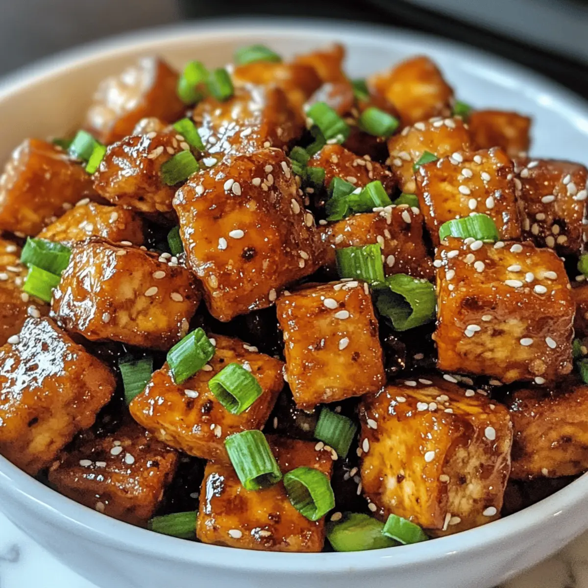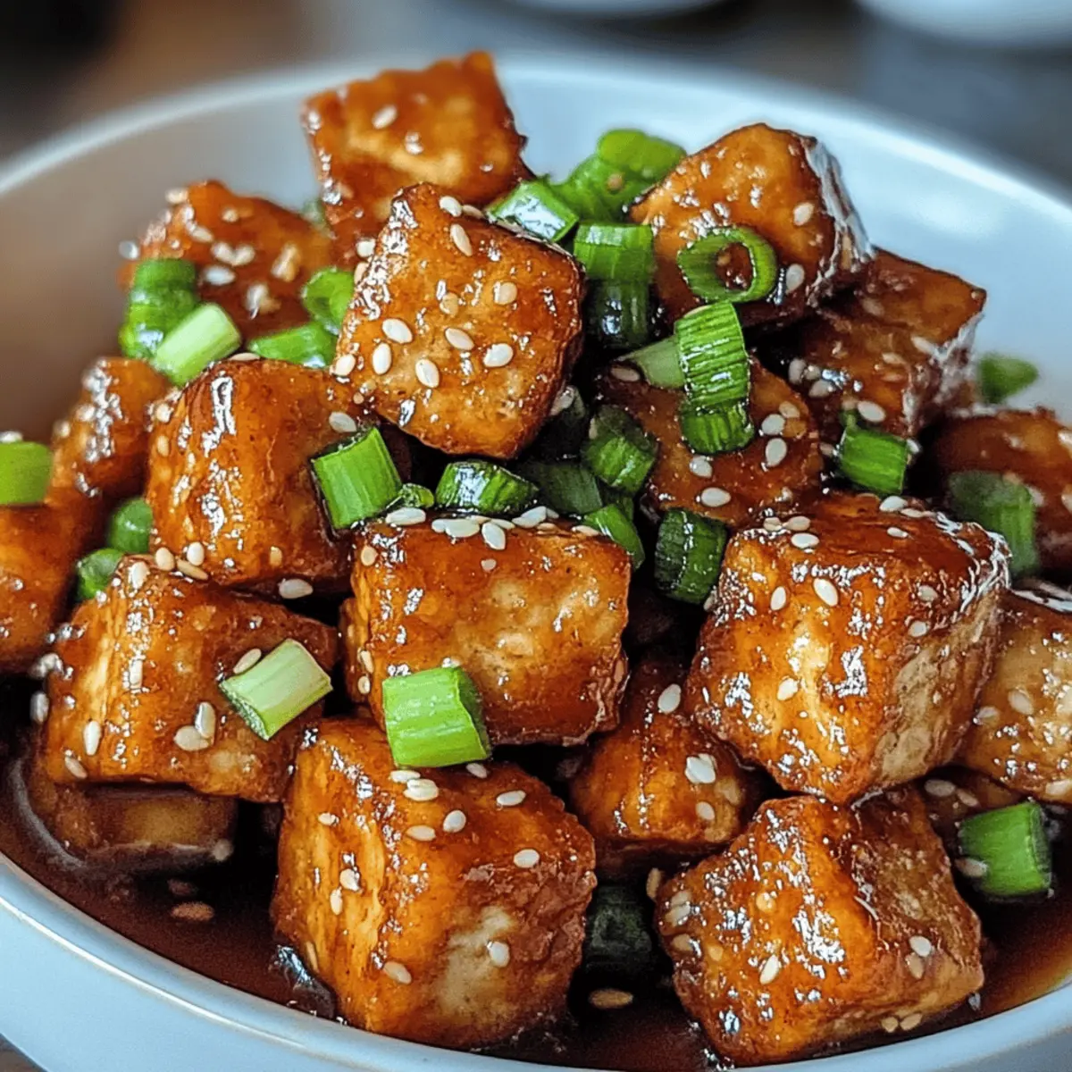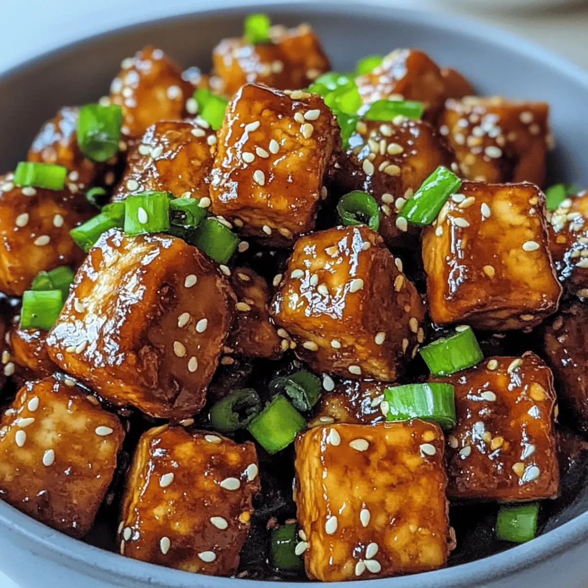 Es gibt kaum etwas Befriedigenderes, als selbstgemachtes Essen, das sowohl köstlich als auch gesund ist. Heute lade ich euch ein, in die Welt des knusprigen Honigknoblauch-Tofus einzutauchen – ein Gericht, das selbst Tofu-Liebhaber in wahre Fans verwandelt. Diese köstlichen, goldbraunen Nuggets sind dank der süßen Honig- und herzhaften Knoblauchnote jede Mühe wert. Besonders an hektischen Abenden ist dieses pflanzenbasierte Rezept nicht nur schnell zubereitet, sondern auch perfekt für gesellige Abende mit Freunden und Familie. Wer könnte da widerstehen? Seid ihr bereit, die Küche zu erobern und eure Geschmacksknospen zu verwöhnen? Warum wird dieses Rezept lieben? Einfachheit: Die Zubereitung ist kinderleicht und erfordert nur wenige Zutaten, die ihr wahrscheinlich schon zu Hause habt. Vielseitigkeit: Ob als Hauptgericht oder als Beilage, dieses Tofu-Gericht passt zu vielen verschiedenen Gerichten und Anlässen. Knuspriger Genuss: Die Kombination aus goldbraunem Tofu und der süß-herzhaften Honig-Knoblauch-Soße sorgt für ein Geschmackserlebnis, das jeder lieben wird. Gesund und nahrhaft: Plant-based und voller Proteine, ist dieses Gericht nicht nur lecker, sondern auch gut für die Gesundheit. Wenn ihr nach weiteren pflanzlichen Ideen sucht, könnte Minestrone Suppe Rezept auch fantastisch zu diesem Tofu passen! Crispy Honig Knoblauch Tofu Zutaten • Diese Zutaten sind perfekt, um das Aroma des Crispy Honig Knoblauch Tofu zu entfalten. Für den Tofu Extra-fester Tofu – sorgt für die nötige Struktur und verhindert, dass der Tofu beim Braten zerfällt. Vermeidet weichen oder seidenen Tofu. Maisstärke – beschichtet den Tofu für eine knusprige Textur. Unerlässlich für den goldenen Crunch. Kochöl – wird zum Braten des Tofus verwendet; etwa ½ Tasse ist nötig. Für die Soße Sojasauce – verleiht Umami und Salzigkeit. Tamari kann als glutenfreie Alternative verwendet werden. Reisessig – bietet Säure und Balance; kann bei Bedarf durch Apfelessig oder Weißweinessig ersetzt werden. Honig – süßt die Soße und sorgt für den wohlschmeckenden Geschmack. Für eine vegane Variante kann Ahornsirup oder Agavendicksaft verwendet werden. Knoblauch – sorgt für ein aromatisches Aroma; frisch ist für den besten Geschmack empfehlenswert. Frischer Ingwer – verstärkt die Soße mit einer warmen, würzigen Note; frisch geriebener Ingwer ist vorzuziehen. Rote Pfefferflocken (optional) – fügt dem Gericht Schärfe und Würze hinzu; nach Geschmack anpassen. Sesamöl – verleiht der Soße Nussigkeit; kann bei Bedarf durch ein anderes Pflanzenöl ersetzt werden. Für die Garnitur Sesamsamen (optional) – für die Garnitur; sorgt für visuelle Attraktivität und einen leichten Crunch. Grüne Zwiebeln (optional) – frische Garnitur, die Farbe und Geschmack hinzufügt. Schritt-für-Schritt-Anleitung für Crispy Honig Knoblauch Tofu Step 1: Tofu pressen Wickle den Extra-festen Tofu in ein sauberes Küchentuch und beschwere ihn mit einem schweren Gegenstand, z. B. einer Pfanne, um überschüssige Feuchtigkeit zu entfernen. Lass den Tofu mindestens 30 Minuten lang pressen, bis er gut entwässert ist. Dadurch erhält der Crispy Honig Knoblauch Tofu eine perfekte Textur beim Braten. Step 2: Tofu vorbereiten Schneide den gepressten Tofu in mundgerechte Nuggets. Achte darauf, dass alle Stücke gleichmäßig groß sind, damit sie gleichmäßig braten können. Die goldbraunen Tofuwürfel werden später toll knusprig, was den Crispy Honig Knoblauch Tofu besonders macht. Step 3: Tofu panieren Gib die Tofu-Stücke in eine Schüssel und vermenge sie gründlich mit der Maisstärke, sodass sie gleichmäßig beschichtet sind. Diese Schicht sorgt dafür, dass der Tofu beim Braten einen köstlichen Crunch erhält. Stelle sicher, dass jedes Stück gut eingepudert ist, um maximalen Knusper zu erzielen. Step 4: Soße zubereiten In einer Schüssel die Sojasauce, den Reisessig, den Honig, den gehackten Knoblauch, den geriebenen Ingwer und optional die roten Pfefferflocken gut vermengen. Rühre alles gut um, bis die Zutaten gut integriert sind. Diese Honig-Knoblauch-Soße wird dem Crispy Honig Knoblauch Tofu seinen einzigartigen Geschmack verleihen. Step 5: Tofu braten Erhitze etwa ½ Tasse Kochöl in einer großen Pfanne bei mittlerer Hitze. Sobald das Öl heiß ist, lege die Tofu-Nuggets vorsichtig hinein und brate sie für etwa 4-5 Minuten auf jeder Seite, bis sie goldbraun und knusprig sind. Achte darauf, dass sie nicht überfüllt werden, damit sie gleichmäßig braten können. Step 6: Kombinieren Lass den gebratenen Tofu auf einem Papiertuch abtropfen, um überschüssiges Öl zu entfernen. Gib die knusprigen Tofu-Stücke in die Schüssel mit der vorbereiteten Honig-Knoblauch-Soße und schwenke sie vorsichtig, bis sie gleichmäßig bedeckt sind. Diese Kombination macht den Crispy Honig Knoblauch Tofu unwiderstehlich. Step 7: Servieren Garnieren den Crispy Honig Knoblauch Tofu nach Belieben mit Sesamsamen und frischen, gehackten grünen Zwiebeln. Dieser finale Schliff sorgt für einen schönen Kontrast und zusätzliches Aroma. Serviere die Tofu-Nuggets sofort, während sie noch heiß und knusprig sind, und genieße dein köstliches Gericht! Lagerungstipps für Crispy Honig Knoblauch Tofu Zimmertemperatur: Servieren Sie den Tofu frisch zubereitet für den besten Geschmack. Wenn etwas übrig bleibt, lassen Sie ihn abkühlen und bewahren Sie ihn nicht länger als 2 Stunden bei Raumtemperatur auf. Kühlschrank: Bewahren Sie Reste in einem luftdichten Behälter im Kühlschrank auf, wo sie bis zu 3 Tage haltbar sind. Der Tofu verliert zwar etwas an Knusprigkeit, bleibt aber dennoch genießbar. Gefrierer: Für längere Lagerung kann der Tofu eingefroren werden. Legen Sie die Tofu-Nuggets in einem Behälter oder gefrierfesten Beutel und frieren Sie sie ein, wo sie bis zu 2 Monate halten. Wiedererwärmen: Um den knusprigen Effekt zurückzubekommen, backen Sie die Reste im Ofen bei 180°C für etwa 10-