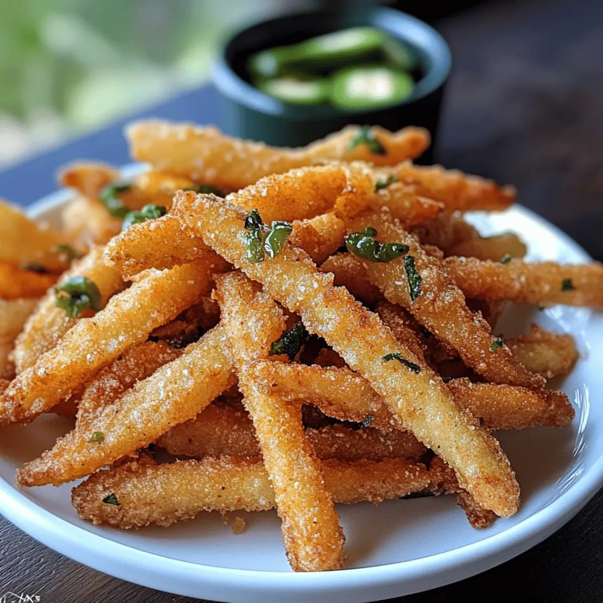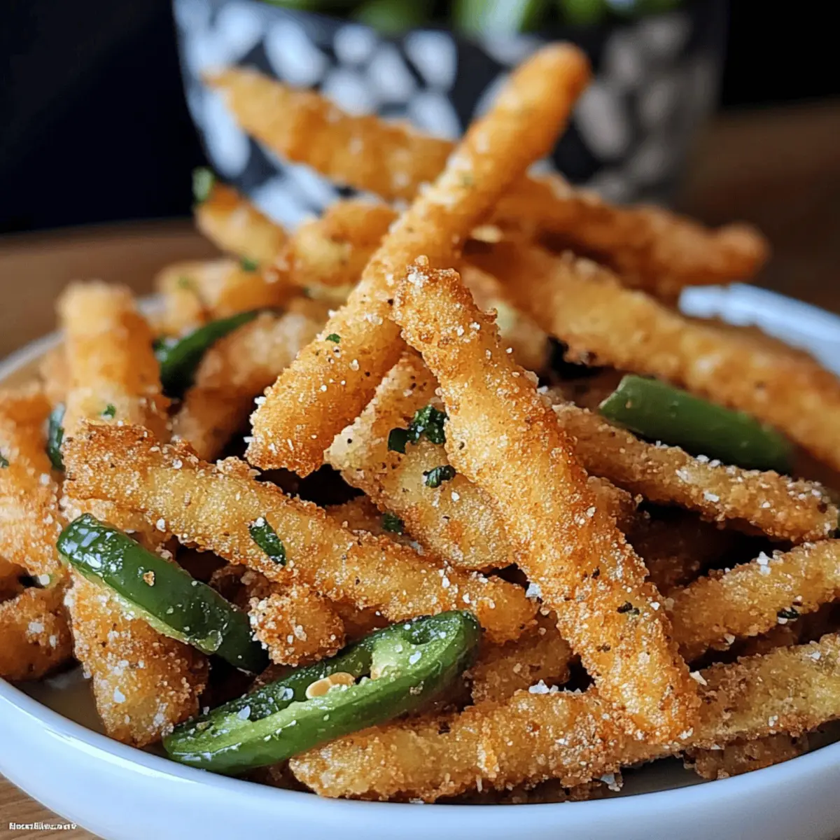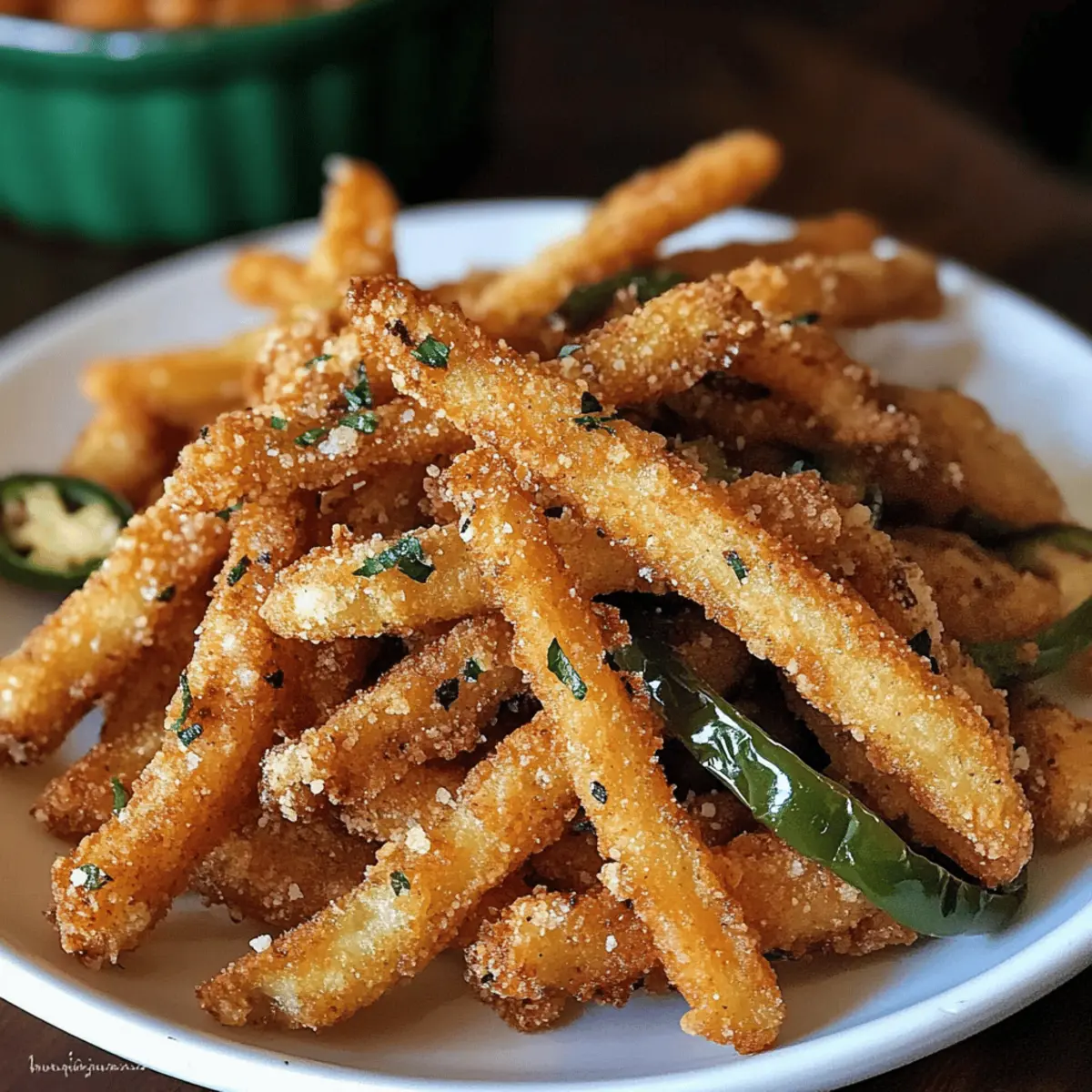 Ich kann gar nicht aufhören, an diese perfekten, knusprigen Jalapeño-Pommes zu denken! Wenn der Hunger kommt und die Geschmacksnerven nach etwas Aufregendem verlangen, zaubert dieses Rezept die ideale Lösung. Diese Pommes sind nicht nur ein himmlischer Snack für Spieltage oder Familienfeiern, sondern auch unglaublich einfach zuzubereiten. Innerhalb kürzester Zeit versehen sie dein Zuhause mit einer unwiderstehlichen Mischung aus salzigen und würzigen Aromen. Mit einer knusprigen Außenschicht und einer angenehm scharfen Note sind sie der ideale Weg, um deine Snack-Erfahrung auf das nächste Level zu heben. Bist du bereit, deine Gäste mit einem köstlichen, heißen Teller dieser Pommes zu überraschen? Warum sind diese Pommes unwiderstehlich? Einzigartig: Diese Crispy Jalapeño Fries bringen eine aufregende Geschmackskombination auf deinen Teller, die du nicht verpassen möchtest. Einfachheit: Mit wenigen Zutaten und einfachen Schritten sind sie schnell zubereitet – perfekt für spontane Snacks. Vielseitig: Ob zu einer Mahlzeit oder als Party-Appetizer, sie passen immer. Konsistenz: Die knusprige Textur und die würzige Schärfe sorgen für ein Geschmackserlebnis, das deine Gäste lieben werden. Probiere auch unser Jalapeno Pommes Rezept für eine köstliche Variante! Crispy Jalapeño Fries Zutaten Für die Pommes • Jalapeños – sorgen für die nötige Schärfe und Geschmack; säubere und schneide sie in dünne Streifen, um die Würze perfekt zur Geltung zu bringen. • Allzweckmehl – dient als Beschichtung, damit der Teig haftet und Struktur gibt. • Buttermilch – verleiht den Pommes Feuchtigkeit und Reichtum, was den Geschmack verbessert. • Ei – bindet die Buttermilch-Mischung für den Beschichtungsprozess. • Panko-Brösel – sorgen für extra Knusprigkeit dank ihrer luftigen Textur; du kannst sie jedoch durch normale Brösel ersetzen, wenn du magst. • Tempura-Teigmischung – bringt eine leichte, knusprige Textur in die Panade. • Knoblauchpulver – fügt Tiefe und Geschmack hinzu. • Slap Ya Mama Würzmischung – eine Mischung aus Cajun-Gewürzen für zusätzlichen Pfiff (du kannst sie auch mit deiner bevorzugten Gewürzmischung ersetzen). • Schwarzer Pfeffer – verstärkt den Gesamtgeschmack. • Pflanzenöl – zum Frittieren; stelle sicher, dass es richtig erhitzt wird, um knusprige Ergebnisse zu erzielen. Für die Dips • Ranch-Dressing – ergänzt die Würze der Pommes perfekt. • Blauschimmelkäse-Dip – für ein cremiges und würziges Geschmackserlebnis. Schritt-für-Schritt-Anleitung für Crispy Jalapeño Fries Step 1: Öl erhitzen Erhitze in einer großen Pfanne bei mittelhoher Hitze ausreichend Pflanzenöl, um die Pommes zu frittieren. Du kannst die richtige Temperatur überprüfen, indem du ein kleines Stück Teig ins heiße Öl gibst – es sollte sofort zischen. Achte darauf, dass das Öl nicht zu heiß wird, um ein Verbrennen der Pommes zu vermeiden. Step 2: Jalapeños vorbereiten Trage Handschuhe und wasche die Jalapeños gründlich. Entferne die Stiele und schneide die Peperoni in dünne, lange Streifen. Wenn du es schärfer magst, lasse die Samen an den Streifen; für mildere Pommes kannst du die Samen entfernen. Setze die geschnittenen Jalapeños beiseite, während du die anderen Zutaten vorbereitest. Step 3: Mehl bereitstellen Nimm eine flache Schüssel und fülle sie mit Allzweckmehl. Für eine einfachere Handhabung kannst du auch einen Zip-Beutel verwenden, in den du das Mehl gibst. So kannst du die Jalapeño-Streifen mühelos darin schwenken, während du sicherstellst, dass sie gleichmäßig mit Mehl bedeckt sind. Stelle diese Schüssel neben den vorbereiteten Jalapeños. Step 4: Buttermilch-Mischung zubereiten In einer zweiten Schüssel die Buttermilch und ein Ei gut verquirlen, bis eine homogene Mischung entsteht. Diese Masse sorgt dafür, dass die Panade gut an den Jalapeño-Streifen haftet und verleiht den Crispy Jalapeño Fries zusätzlichen Geschmack. Stelle die Schüssel ebenfalls in Reichweite. Step 5: Paniermehl vorbereiten Nimm eine dritte Schüssel und vermische die Panko-Brösel, Tempura-Teigmischung, Knoblauchpulver, Slap Ya Mama Würzmischung und schwarzen Pfeffer. Diese Mischung wird die äußere Schicht deiner Pommes sein und sorgt für die knusprige Textur. Halte die Schüssel bereit, um die vorbereiteten Jalapeño-Streifen gleich zu panieren. Step 6: Jalapeños panieren Nimm ein paar Jalapeño-Streifen und wälze sie zuerst im Mehl, sodass sie gleichmäßig bedeckt sind. Tauche sie dann in die Buttermilch-Mischung und lasse überschüssige Flüssigkeit abtropfen. Schließlich wälze die Jalapeños in der Paniermehl-Mischung, bis sie gründlich verkleidet sind. Achte darauf, dass sie gut bedeckt sind, um eine perfekte Kruste zu erhalten. Step 7: Frittieren Lege die panierten Jalapeño-Streifen vorsichtig ins heiße Öl und frittiere sie etwa 1-2 Minuten pro Seite. Du erkennst, dass sie fertig sind, wenn sie goldbraun und knusprig aussehen. Vermeide es, zu viele Streifen auf einmal zu frittieren, damit die Temperatur des Öls stabil bleibt und die Pommes gleichmäßig garen. Step 8: Abtropfen lassen Nehme die frittierenden Jalapeño-Streifen mit einer Kelle oder Zange aus dem Öl und lege sie auf ein mit Küchenpapier ausgelegtes Blech, um überschüssiges Öl abtropfen zu lassen. Diese letzte Schicht sorgt dafür, dass deine Crispy Jalapeño Fries perfekt knusprig bleiben. Wiederhole den Vorgang mit den restlichen Streifen und genieße deiner köstlichen Kreation! Variationen & Substitutionen Es gibt so viele kreative Wege, die Crispy Jalapeño Fries zu gestalten – lass deiner Fantasie freien Lauf und zaubere deine Lieblingsvariationen! Milder Genuss: Entferne die Samen und Rippen der Jalapeños für eine sanftere Schärfe. Glutenfrei: Verwende glutenfreie Paniermehl-Alternativen, um diese Pommes für alle genießbar zu machen. Würzige Explosion: Füge Chilipulver oder Paprika zu deiner Panko-Brösel-Misch