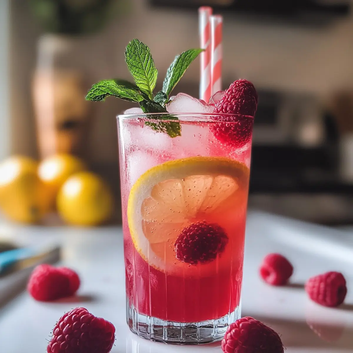6. Fülle die Gläser mit Eiswürfeln, gieße die Limonade darüber und garniere mit Himbeeren und Minzblättern.