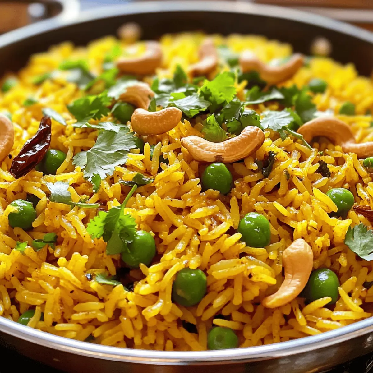 Schalten Sie die Hitze aus und lassen Sie den Reis für weitere 5 Minuten abgedeckt ruhen. Danach lockern Sie den Curryreis mit einer Gabel auf und mischen optional die Erbsen unter. Diese letzte Phase sorgt für einen fluffigen und köstlichen Curryreis Pilaf, bereit zum Servieren.