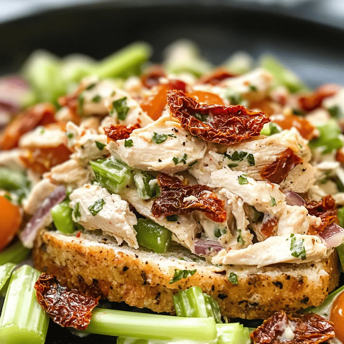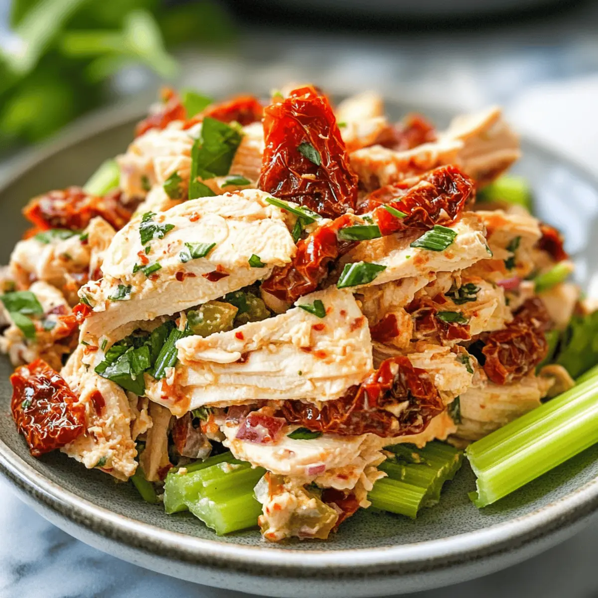 Ein köstlicher und proteinreicher Hühnchensalat mit sonnengetrockneten Tomaten, ideal für jede Gelegenheit und als leichtes Mittagessen.