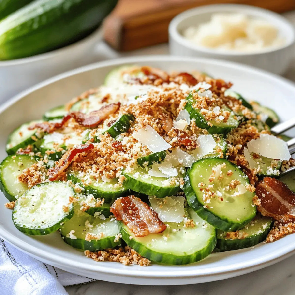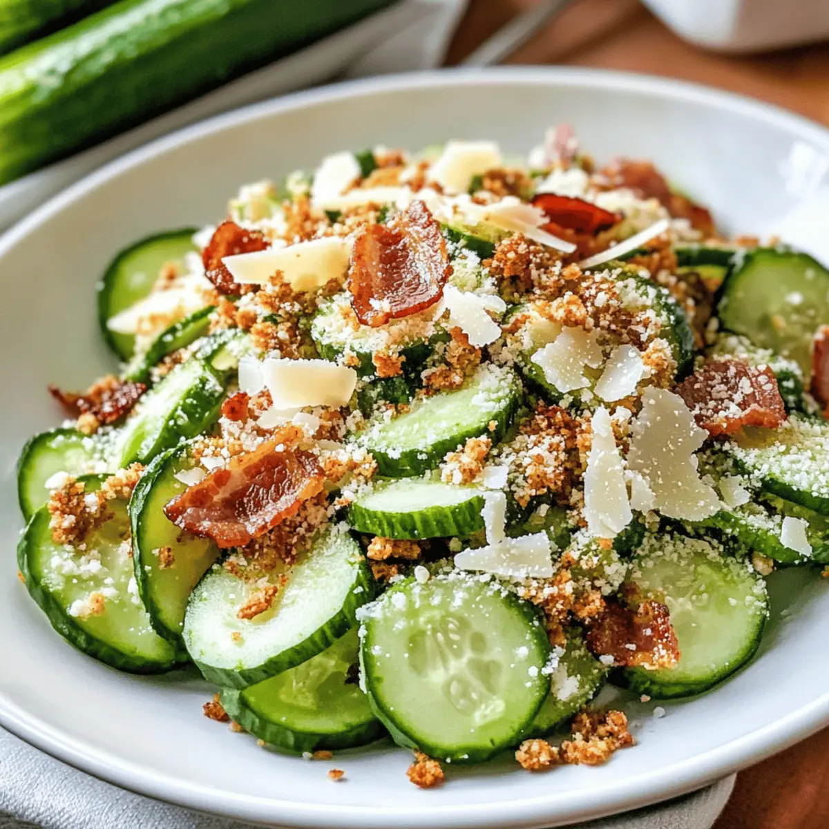 5. Serviere den Cremigen Gurken Caesar Salat in einer schönen Schüssel und garniere ihn mit weiteren Parmesan-Spänen und zerkrümelten Bacon.