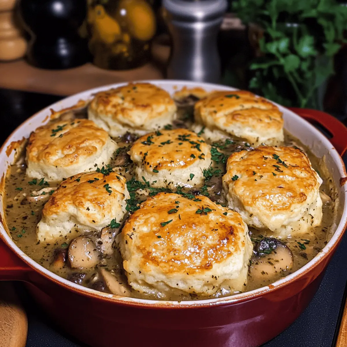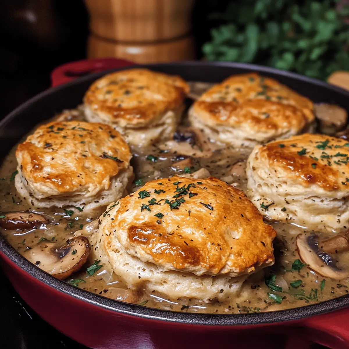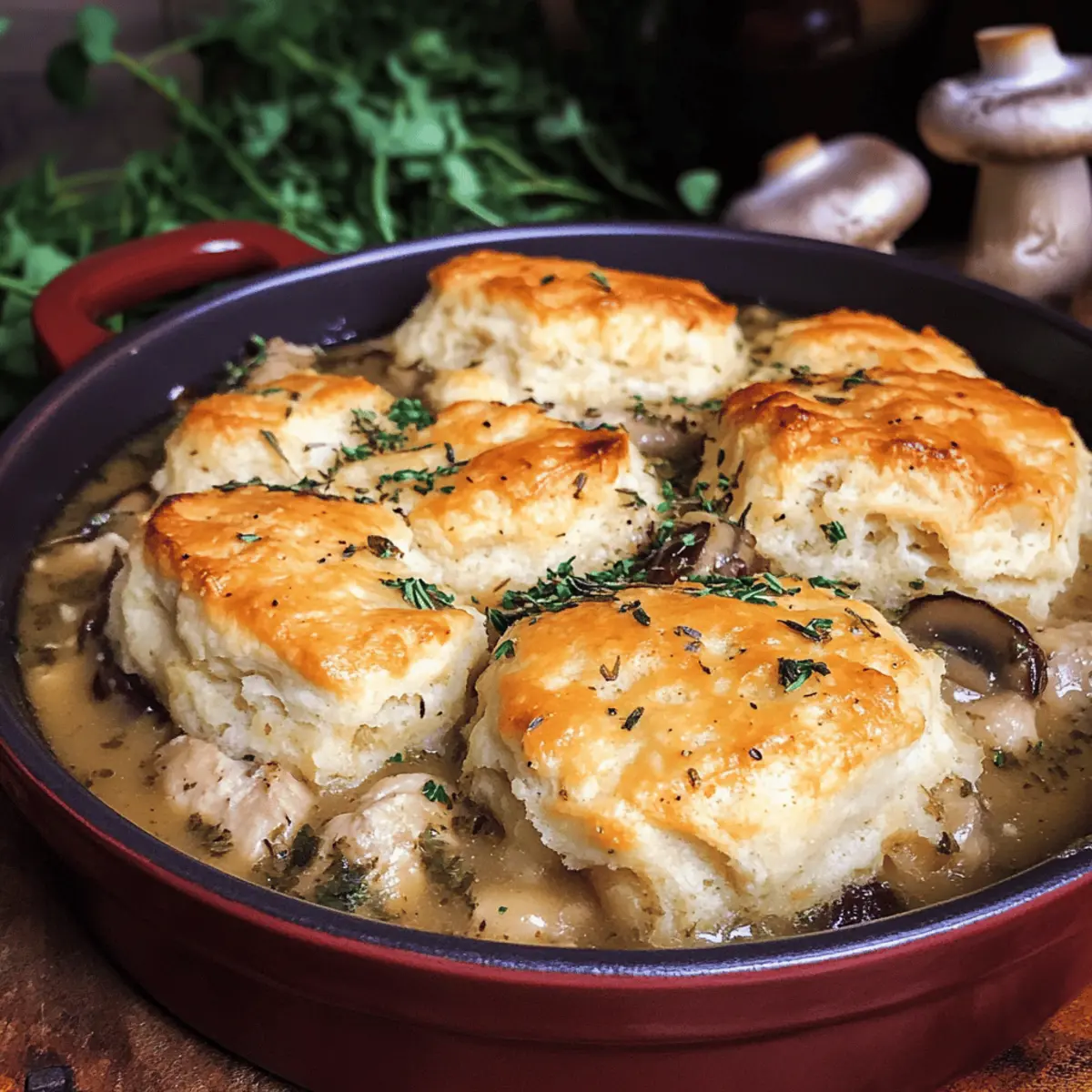 In der kühlen Jahreszeit, wenn die Tage kürzer werden und die Blätter in warmen Farben leuchten, gibt es nichts Besseres als ein herzhaftes Gericht, das Komfort und Geborgenheit vermittelt. Mein Rezept für eine köstliche Chicken and Mushroom Pot Pie mit Cheddar-Salbei-Biscuits bringt genau diese Gemütlichkeit in die Küche. Die cremige Füllung aus zartem Hühnchen und aromatischen Pilzen schmiegt sich unter eine goldbraune, flaumige Biskuit-Decke, die einfach unwiderstehlich ist. Diese Mahlzeit ist nicht nur schnell zubereitet, sondern auch perfekt zum Teilen mit Freunden und Familie an einem kalten Abend. Wer könnte da widerstehen? Lass uns gemeinsam in die Welt des herzhaften Genusses eintauchen und dein Zuhause mit dem Duft dieses herbstlichen Klassikers füllen! Warum wirst du dieses Rezept lieben? Einfachheit: Die Zubereitung ist unkompliziert und erfordert keine besonderen Kochkenntnisse. Reichhaltiger Geschmack: Die Kombination aus Hühnchen und Pilzen in einer cremigen Sauce wird einfach alle begeistern. Perfektes Komfortessen: Ideal für gemütliche Abende mit der Familie oder Freunden, bringt es die Seele zum Schwingen. Vielfältigkeit: Du kannst frische Kräuter oder andere Käsesorten wie Gruyère ausprobieren, um stets neue Geschmackserlebnisse zu schaffen. Verpasse nicht auch das Minestrone Suppe Rezept als köstliche Vorspeise! Schnell und praktisch: Die Füllung kann im Voraus zubereitet werden, was dir wertvolle Zeit spart. Einladender Duft: Der aromatische Geruch frisch gebackener Biscuits aus dem Ofen wird deine Küche in ein wahres Wohlfühlparadies verwandeln. Zutaten für den Ausstoß • Hier sind die Zutaten für das perfekte Hühnchen-Pilz-Pie, das jeden Herbst zu einem Fest für die Sinne macht. Für die Füllung Hühnchenbrust – Hauptprotein, das Herzhaftigkeit liefert; du kannst auch übrig gebliebenes Hähnchen verwenden. Olivenöl – Zum Rösten des Hähnchens und Sautieren der Gemüse. Koscheres Salz und Pfeffer – Verstärkt die Aromen des Gerichts. Butter – Verleiht der Füllung und den Biscuits Reichhaltigkeit. Zwiebel – Sorgt für eine süße, herzhafte Basis für die Sauce. Cremini-Pilze – Fügen Umami-Geschmack und Textur hinzu; stattdessen kann auch ein Mix aus Champignons verwendet werden. Knoblauch – Fügt aromatische Tiefe zur Füllung hinzu. Frischer Thymian – Bringt Kräuternoten; getrockneter Thymian kann als Ersatz dienen. Sherry – Für mehr Komplexität; optional für eine Geschmackssteigerung. Mehl – Dickt die Sauce für die Füllung ein. Hühnerbrühe – Grundlage für die Sauce. Schlagsahne – Sorgt für Cremigkeit in der Füllung. Worcestershiresauce – Fügt Tiefe und Geschmack hinzu. Frische Petersilie – Für Garnierung und zusätzliche Frische. Für die Biscuits Mehl – Gibt Struktur und Halt. Zucker – Balanciert die Aromen in den Biscuits. Backpulver – Treibmittel für die Biscuits. Natron – Unterstützt das Aufgehen der Biscuits. Kaltes Butter – Wichtig für die flauschige Textur der Biscuits. Frischer Salbei – Verleiht den Biscuits einen erdigen Geschmack; getrockneter Salbei kann ein Ersatz sein. Scharfer Cheddar-Käse – Fügt einen reichen, würzigen Geschmack hinzu. Buttermilch – Trägt zur Feuchtigkeit und Zartheit der Biscuits bei; eventuell wird mehr benötigt. Schritt-für-Schritt-Anleitung für den Ausstoß: Herzhaftes Hühnchen-Pilz-Pie Schritt 1: Hühnchen rösten Heize den Ofen auf 200 °C (400 °F) vor. Lege die Hühnchenbrust auf ein mit Backpapier ausgelegtes Blech und beträufle sie mit Olivenöl. Mit koscherem Salz und Pfeffer würzen. Röste das Hühnchen für 40-45 Minuten, bis es durchgegart ist und eine innere Temperatur von 75 °C (165 °F) erreicht hat. Lass es nach dem Backen abkühlen, deboniere und schneide das Fleisch in mundgerechte Stücke. Schritt 2: Gemüse anbraten Erhitze in einer ofenfesten Pfanne bei mittlerer Hitze 1 Esslöffel Olivenöl und 1 Esslöffel Butter. Füge die gewürfelte Zwiebel hinzu und brate sie 3-4 Minuten lang, bis sie weich ist. Gib die geschnittenen Cremini-Pilze dazu, würze mit Salz und Pfeffer und koche sie weiter, bis sie vollständig zart sind und ihre Flüssigkeit abgegeben haben, was etwa 5-7 Minuten dauert. Schritt 3: Füllung zubereiten Rühre den gehackten Knoblauch und den frischen Thymian in die Pfanne ein und koche alles für etwa 1 Minute, bis es duftet. Wenn du Sherry verwendest, gieße ihn in die Pfanne, um den Boden abzulöschen, und lass ihn 2-3 Minuten leicht köcheln, bis der Alkohol verdampft ist. Dies verleiht deiner Füllung zusätzlichen Geschmack. Schritt 4: Sauce eindicken Füge die restliche Butter hinzu, gefolgt von 4 Esslöffeln Mehl, und rühre alles gründlich, bis eine Paste entsteht. Langsam die Hühnerbrühe unterrühren und die Mischung zum Simmern bringen. Lass sie einige Minuten köcheln, bis die Sauce dicklich wird. Jetzt füge die Sahne, Worcestershiresauce, die Hühnerstücke und gehackte Petersilie hinzu und verrühre alles gut. Schritt 5: Biscuits vorbereiten Für die Biscuits vermische in einer Schüssel 2 Tassen Mehl, 1 Esslöffel Zucker, 1 Esslöffel Backpulver und 1 Teelöffel Salz. Schneide die kalte Butter mit einem Pastry Cutter oder zwei Gabeln unter, bis die Mischung krümelig wird. Rühre den frischen Salbei und den scharfen Cheddar-Käse unter. Füge ¾ Tasse Buttermilch hinzu und mische alles, bis ein klebriger Teig entsteht. Schritt 6: Biscuits backen Knete den Teig auf einer leicht bemehlten Oberfläche kurz, um ihn zusammenzubringen, und rolle ihn dann aus. Steche runde Biscuits aus und platziere sie auf der Füllung in der Pfanne. Bestreiche die Oberseiten der Biscuits mit etwas Buttermilch für eine schöne Bräunung. Backe alles 20-25 Minuten lang im Ofen, bis die Biscuits goldbraun sind und die Füllung blubbert. Variationen & Alternativen für den Ausstoß Jetzt kannst du dieses Rezept ganz nach deinem Geschmack anpassen und neue kulinarische Abenteuer entdecken! Vegetaris