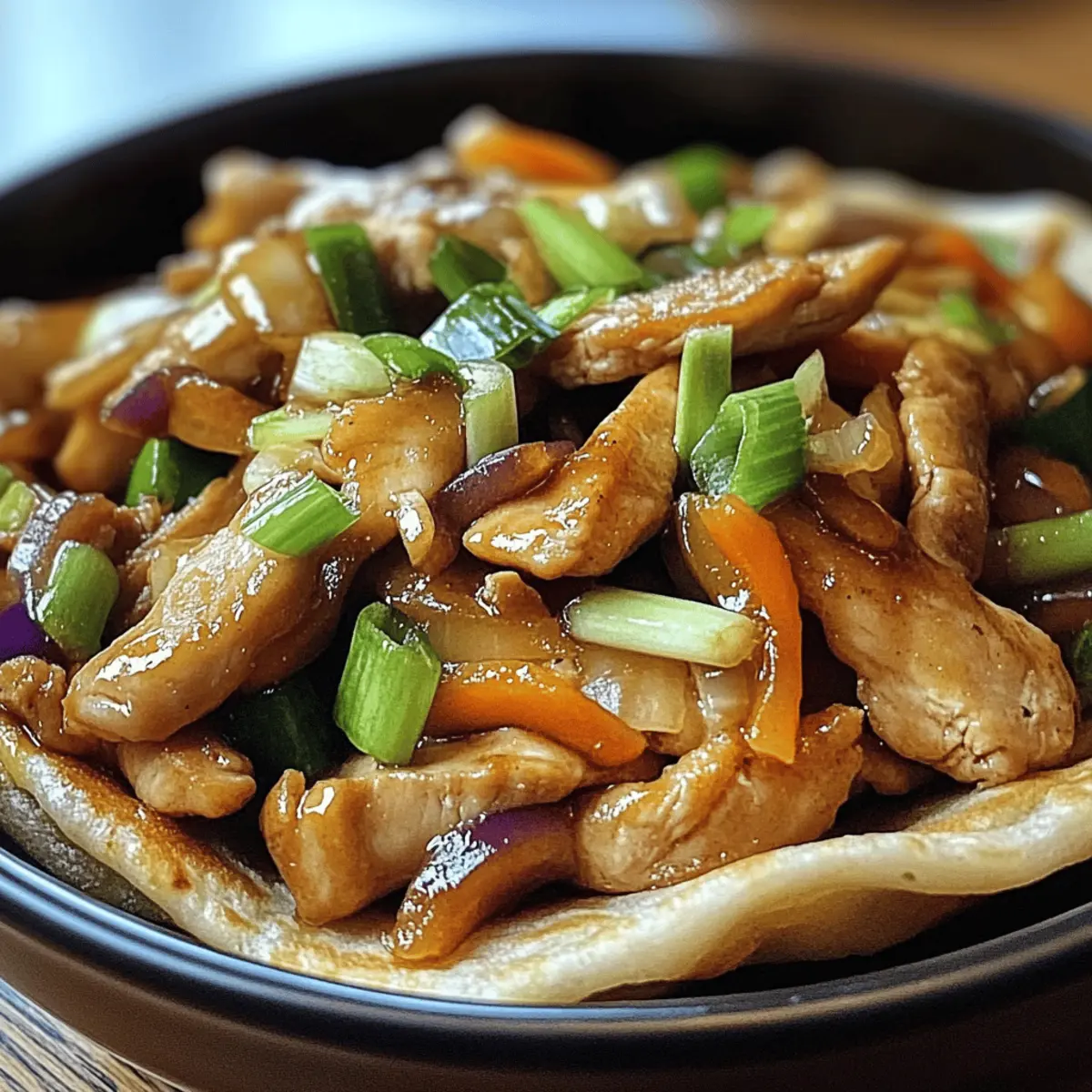 5. Die Mandarin-Pfannkuchen oder Tortillas leicht erhitzen und eine großzügige Portion der Moo Shu Hähnchen-Füllung in die Mitte geben, zusammenrollen und genießen.