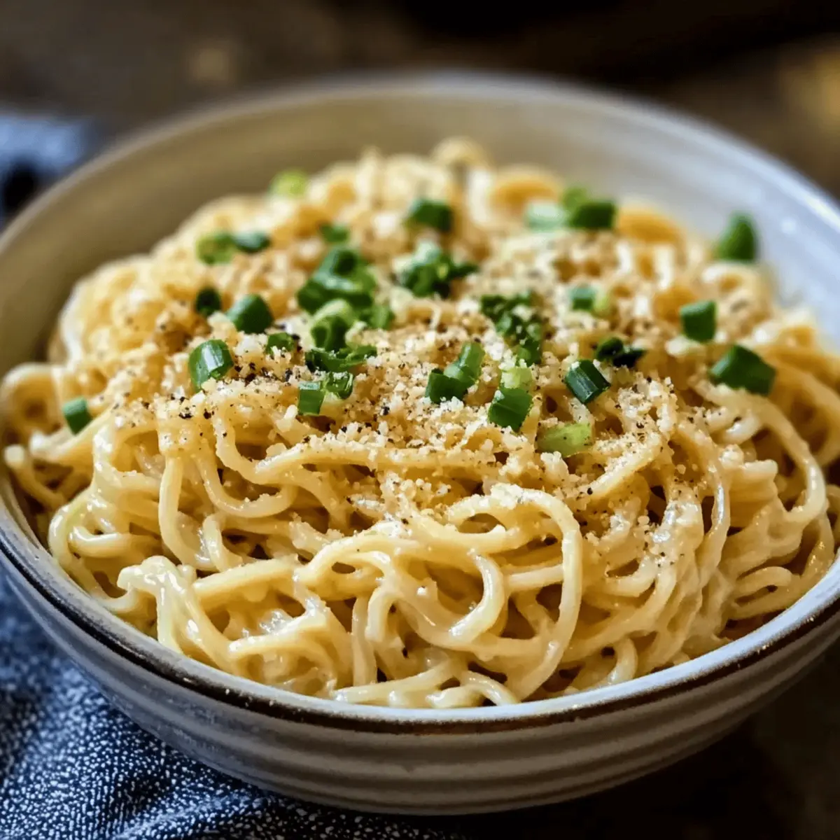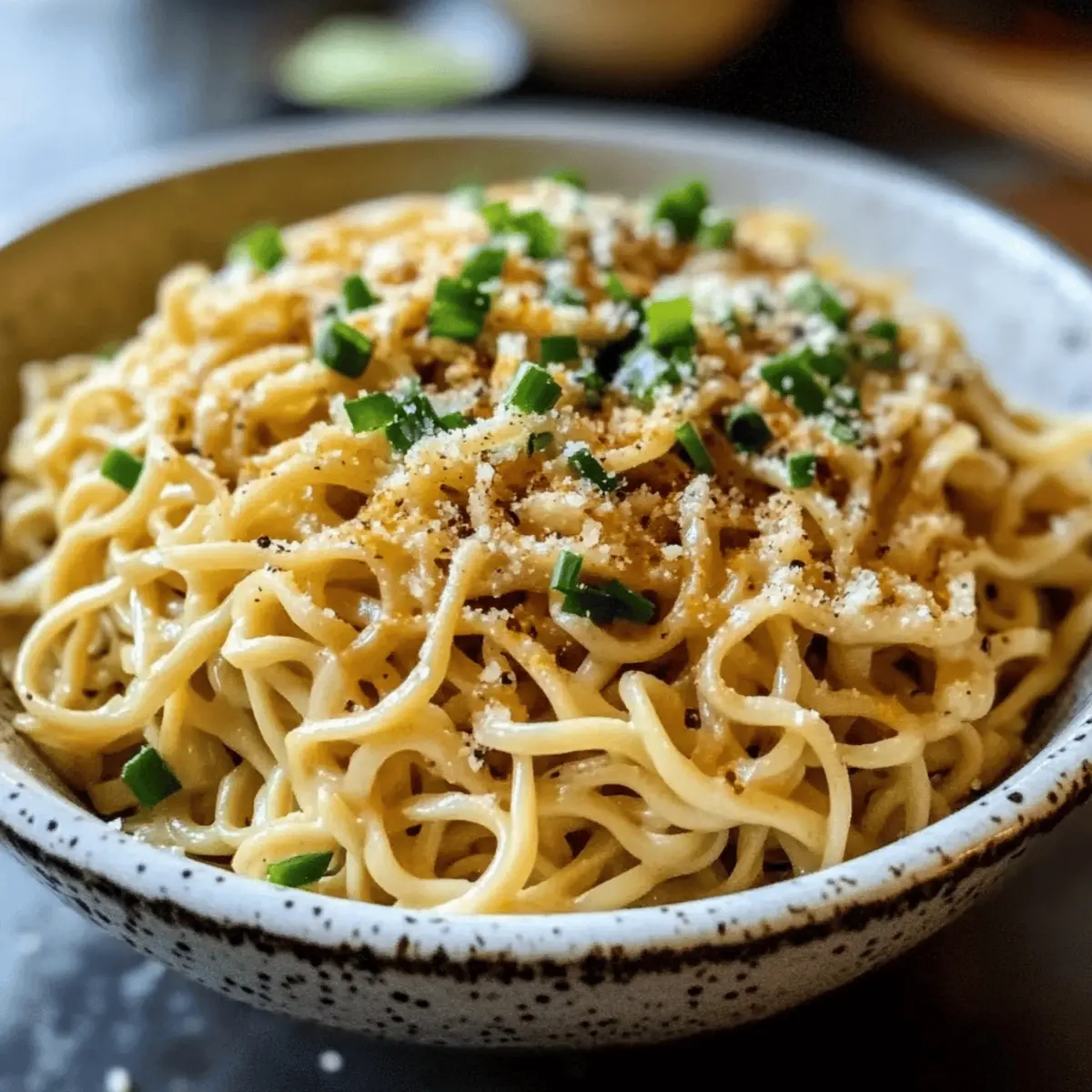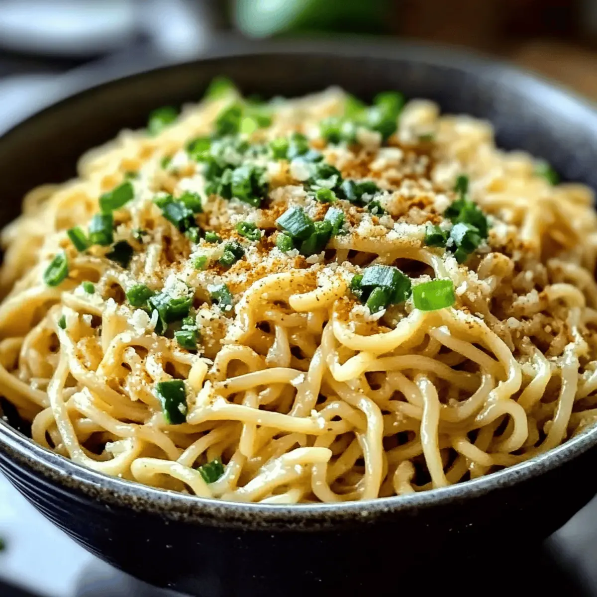 Als ich letztens in meine Küche trat, durchdrang ein verführerischer Knoblauchduft den Raum und ließ mein Herz höher schlagen. Die Zubereitung von Easy Parmesan Garlic Ramen wurde zum perfekten Ritual nach einem langen, hektischen Tag. Mit dieser schnellen und einfachen Rezeptur verwandele ich das vertraute Instant-Ramen in ein cremiges, köstliches Gericht, das in nur sieben Minuten auf dem Tisch steht. Diese herzhafte Mahlzeit ist nicht nur ein wahrer Seelenwärmer, sondern auch ein fantastisches Grundgerüst für eigene Variationen — seien es frische Gemüse oder proteinreiche Toppings wie ein weichgekochtes Ei. Wer möchte da nicht nach einem langen Tag mit einem solchen Genuss auf dem Teller verwöhnt werden? Lasst uns gemeinsam in die köstliche Welt des einfachen Parmesan-Knoblauch-Ramen eintauchen! Warum sind Parmesan Knoblauch Ramen besonders? Einfachheit: Mit nur wenigen Zutaten zaubern Sie in nur sieben Minuten ein schmackhaftes Gericht. Vielseitigkeit: Experimentieren Sie mit Ihrem Lieblingsgemüse oder einem Protein wie Hühnchen oder Tofu für ein vollständiges Essen. Herzhaft: Die Kombination aus cremigem Parmesan und aromatischem Knoblauch sorgt für einen besonderen Genuss. Zufriedenheit: Diese Ramen sind der perfekte Seelenwärmer, ideal für lange Tage. Probieren Sie auch unsere anderen Rezepte wie Parmesan Knoblauch Gemuese oder Savory Birria Ramen für zusätzliche Inspiration! Geselligkeit: Teilen Sie dieses Gericht mit Freunden und Familie – die Einladungen werden garantiert folgen! Parmesan Knoblauch Ramen Zutaten Instant Ramen Nudeln: Basis des Gerichts — jede Geschmacksrichtung oder neutral funktioniert. Substitution: Glutenfreie Ramen für eine glutenfreie Option. Butter (2 Esslöffel, ungesalzen): Fügt Reichhaltigkeit und Geschmack hinzu. Hinweis: Kann durch Olivenöl für eine leichtere Version ersetzt werden. Knoblauch (2 Zehen, gehackt): Sorgt für das aromatische Geschmackserlebnis. Substitution: Knoblauchpulver (1/2 Teelöffel), falls frischer nicht verfügbar ist. Parmesan Käse (1/4 Tasse, gerieben): Kreiert eine cremige Sauce und verstärkt den Umami-Geschmack. Substitution: Pecorino Romano für einen schärferen Geschmack. Sojasauce (1 Teelöffel, optional): Fügt Tiefe zum Geschmack hinzu. Hinweis: Verwenden Sie Tamari für eine glutenfreie Version. Frühlingszwiebeln (1 Esslöffel, gehackt, zum Garnieren): Sorgt für Farbe und Frische. Substitution: Frische Kräuter wie Petersilie oder Basilikum, gehackt. Schritt-für-Schritt-Anleitung für Einfache Parmesan Knoblauch Ramen Schritt 1: Nudeln kochen Bereiten Sie die Instant Ramen Nudeln gemäß den Anweisungen auf der Verpackung vor, und lassen Sie dabei das Würzpaket weg. Kochen Sie die Nudeln in sprudelndem Wasser für etwa 3–4 Minuten, bis sie weich sind. Danach abgießen und beiseite stellen, während Sie die Sauce zubereiten. Schritt 2: Sauce vorbereiten In einer Pfanne die Butter bei mittlerer Hitze schmelzen. Sobald die Butter geschmolzen ist, fügen Sie den gehackten Knoblauch hinzu und sautieren ihn für etwa 1 Minute, bis er aromatisch und leicht goldbraun ist. Achten Sie darauf, dass der Knoblauch nicht anbrennt, da er sonst bitter wird. Schritt 3: Sauce mischen Geben Sie die gekochten Nudeln in die Pfanne mit dem Knoblauch und werfen Sie alles gut durch. Fügen Sie dann den geriebenen Parmesan hinzu und rühren Sie, bis er geschmolzen ist und eine cremige Sauce entsteht. Optional können Sie auch die Sojasauce für zusätzlichen Geschmack hinzufügen. Schritt 4: Servieren Richten Sie die Nudeln auf einem Teller an und garnieren Sie sie nach Belieben mit zusätzlichem Parmesan und gehackten Frühlingszwiebeln. Für eine besondere Note können Sie weichgekochte Eier oder sautiertes Gemüse hinzufügen. Genießen Sie Ihre Einfachen Parmesan Knoblauch Ramen warm! Vorbereitungen für Einfache Parmesan Knoblauch Ramen Einfache Parmesan Knoblauch Ramen sind perfekt für stressige Wochenabende, die eine Vorausplanung erfordern. Sie können die Ramen-Nudeln bereits bis zu 24 Stunden im Voraus kochen und darin abkühlen lassen, um ein Verkleben zu verhindern. Zudem können Sie die Knoblauchbutter zubereiten und im Kühlschrank aufbewahren, was maximal 3 Tage haltbar ist. Wenn es Zeit zum Servieren ist, erwärmen Sie die Nudeln in der Pfanne, fügen die vorbereitete Sauce hinzu und mischen alles gründlich, bis der Parmesan schmilzt. Diese Vorbereitungen garantieren nicht nur, dass Sie in der Eile keine Kompromisse bei der Qualität eingehen, sondern ermöglichen Ihnen auch, ein köstliches, hausgemachtes Gericht im Handumdrehen auf den Tisch zu bringen. Variationen für Parmesan Knoblauch Ramen Es gibt viele kreative Möglichkeiten, dieses Gericht ganz nach deinem Geschmack zu gestalten! Vegetarisch: Tausche die Butter gegen pflanzliche Margarine aus, um eine rein pflanzliche Version zu kreieren. Cremiger Genuss: Füge einen Schuss Sahne oder pflanzliche Sahne hinzu, um die Sauce extra cremig zu machen. Ihr werdet den Unterschied lieben! Proteinreich: Garniere die Ramen mit einem weichgekochten Ei oder gebratenem Tofu für eine nahrhafte Ergänzung. Diese Toppings machen das Gericht noch sättigender. Erhitze es auf: Pfeffer oder Sriracha können für eine pikante Note sorgen. Eine Prise von beiden sorgt für den perfekten Kick! Frische Kräuter: Integriere frische Kräuter wie Basilikum oder Koriander, um einen zusätzlichen Frischekick zu verleihen. Dies gibt dem Gericht eine aromatische Tiefe. Gemüsemix: Sauté geschnittene Zucchini, Karotten oder Brokkoli hinzu, um die Nährstoffe zu steigern und das Gericht bunter zu gestalten. Umami-Fusion: Experimentiere mit einem Spritzer Kokosnussamino oder Worcestershire-Sauce für zusätzlichen Umami-Geschmack. Vergiss nicht, auch unsere anderen leckeren Rezepte auszuprobieren, wie Feurige Haehnchen Ramen für ein noch aufregenderes Geschmackserlebnis! Lagerungstipps für Parmesan Knoblauch Ramen Raumtemperatur: Lassen Sie die Ramen nicht