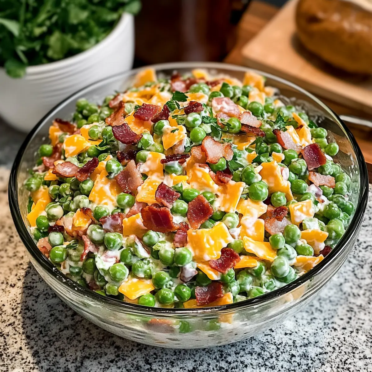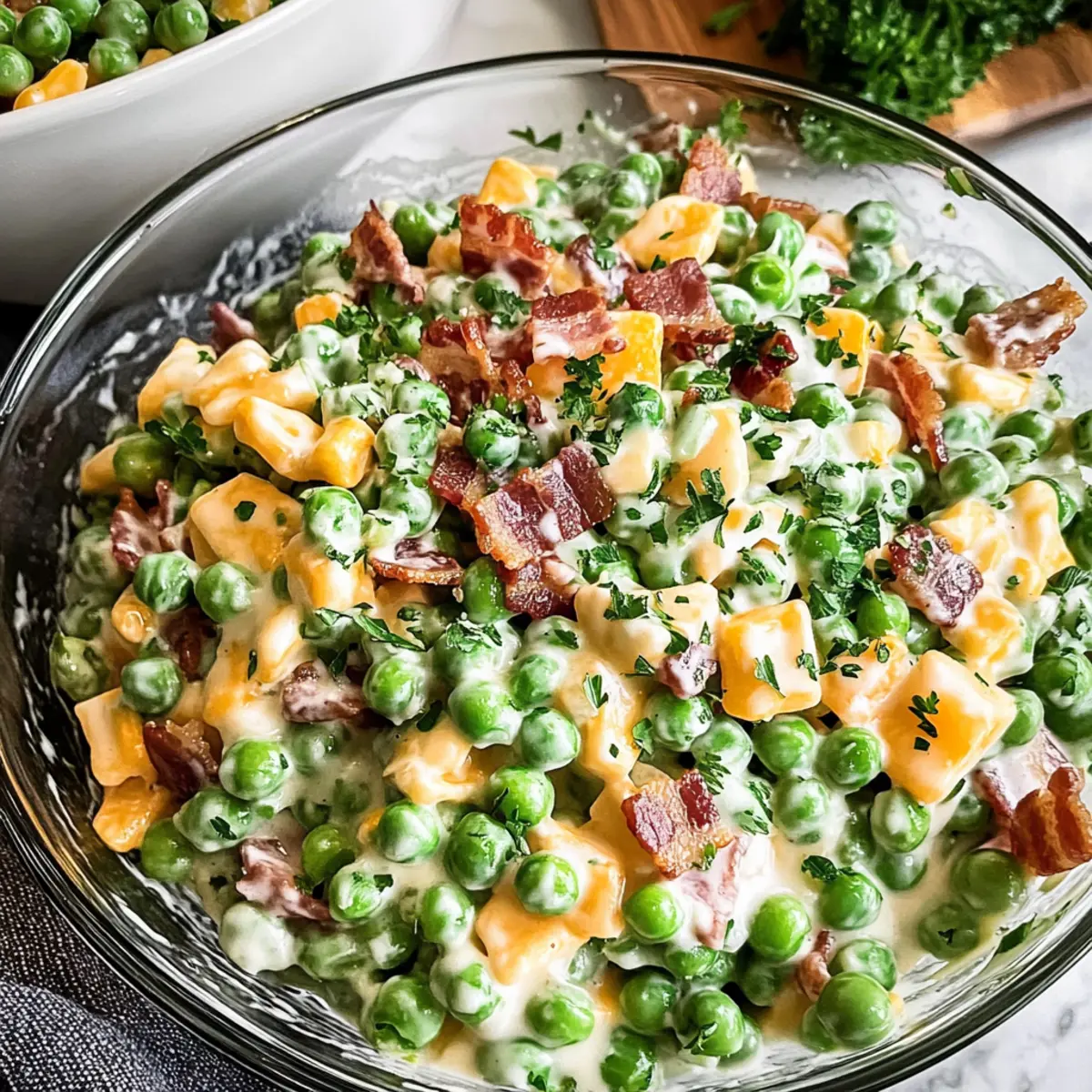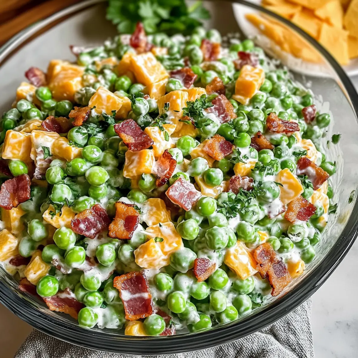 Wenn die Tage kürzer werden und der Duft von frischem Grün in der Luft liegt, gibt es nichts Zeitloseres als einen einfachen, aber schmackhaften Erbsensalat. Mein cremiger Erbsensalat bringt die Leichtigkeit des Frühlings auf den Tisch und ist ein ideales Gericht für jede Gartenparty oder das nächste Potluck. Die Kombination aus knackigem Bacon, würzigem Cheddar und süßen, frischen Erbsen macht jede Portion zu einem Genuss. Er ist nicht nur schnell zubereitet, sondern kann auch im Voraus gemacht werden, was ihn perfekt für stressfreies Kochen macht. Und das Beste daran? Mit ein paar einfachen Variationen kann jeder ihn ganz nach seinem Geschmack anpassen. Wer könnte da widerstehen? Lasst uns gemeinsam entdecken, wie einfach es ist, dieses leckere Rezept zuzubereiten! Warum ist dieser Erbsensalat so besonders? Einfachheit pur: Die Zubereitung erfordert nur ein paar grundlegende Schritte, die auch ungeübte Köche problemlos meistern können. Cremiger Genuss: Die Kombination aus Mayo und saurer Sahne sorgt für eine unvergleichliche Cremigkeit, die diesen Salat unwiderstehlich macht. Vielfältige Anpassungsmöglichkeiten: Ob mit knusprigem Bacon oder vegetarisch – dieser Salat lässt sich ganz nach Ihrem Geschmack abwandeln! Perfekt für Feiern: Ideal für Potlucks und Grill-Events, wird dieser Erbsensalat garantiert zum Star auf jedem Büfettt. Zeitersparnis: Bereiten Sie ihn am Vortag vor, damit sich die Aromen wunderbar entfalten können – so haben Sie mehr Zeit für Ihre Gäste! Familienfreundlich: Dank seiner milden Aromen ist dieser Salat auch bei Kindern ein Hit und wird sicher in vielen Familienrezepten einen Platz finden. Erbsensalat Zutaten Für das Dressing: Mayo – Sorgt für Cremigkeit und einen kleinen Säurekick; für eine leichtere Variante können Sie griechischen Joghurt verwenden. Sauerrahm – Verleiht zusätzlichen Reichtum und eine leicht säuerliche Note; kann auch durch eine nicht-dairy Alternative wie Cashewcreme ersetzt werden. Apfelessig – Fügt eine angenehme Säure hinzu, die die Aromen ausgleicht; für eine neutrale Option kann weißer Essig verwendet werden. Honig – Bringt einen Hauch von Süße; kann durch Agavendicksaft ersetzt oder ganz weggelassen werden, um einen herzhaften Geschmack zu erzielen. Für den Salat: Gefrorene Erbsen – Die Hauptzutat, die Süße und Crunch liefert; auftauen und gut abtropfen lassen; frische Erbsen können auch verwendet werden, wenn sie verfügbar sind. Bacon – Fügt eine salzige, rauchige Note hinzu; kann durch knusprigen Pancetta, gewürfelten Schinken oder ganz weggelassen werden, um eine vegetarische Variante zu schaffen. Rote Zwiebel – Liefert Schärfe; als mildere Alternative können Frühlingszwiebeln oder als süßere Variante Schalotten verwendet werden. Scharfer Cheddar – Sorgt für Cremigkeit und kräftigen Geschmack; Feta oder eine milchfreie Alternative können ebenfalls verwendet werden. Frische Petersilie – Fügt Frische und Farbe hinzu; kann durch frischen Dill oder Schnittlauch ersetzt werden, um einen anderen Kräutergeschmack zu erzielen. Schritt-für-Schritt-Anleitungen für Erbsensalat Step 1: Bacon braten In einer großen Pfanne bei mittlerer Hitze 6 Scheiben Bacon für etwa 6-8 Minuten braten, bis sie knusprig sind. Achten Sie darauf, dass der Bacon eine goldbraune Farbe annimmt. Sobald er fertig ist, nehmen Sie ihn aus der Pfanne und lassen Sie ihn auf einem Papiertuch abtropfen, um überschüssiges Fett zu entfernen. Step 2: Dressing zubereiten In einer kleinen Schüssel ¼ Tasse Mayo, ¼ Tasse Sauerrahm (oder griechischen Joghurt), 1 Esslöffel Apfelessig und 1 Teelöffel Honig gut vermischen. Mit Salz und Pfeffer nach Geschmack würzen. Rühren Sie, bis alle Zutaten gut kombiniert sind, und stellen Sie das Dressing beiseite, damit sich die Aromen entfalten können. Step 3: Salat zusammenstellen In einer großen Rührschüssel 1 Pfund aufgetauter Erbsen, ⅓ Tasse gewürfelte rote Zwiebel, 4 Unzen gewürfelten Cheddar und den abgekühlten Bacon kombinieren. Gießen Sie das vorbereitete Dressing gleichmäßig über den Salat und falten Sie alles vorsichtig mit einem Spatel zusammen, bis alle Zutaten gut bedeckt sind. Step 4: Kühlen Den fertigen Erbsensalat abdecken und für mindestens 30 Minuten im Kühlschrank kaltstellen. Dies ermöglicht es den Aromen, zu verschmelzen und das Gericht noch schmackhafter zu machen. Während dieser Zeit können Sie sich um andere Vorbereitungen kümmern oder einfach entspannen. Erbsensalat – Vielfältige Abwandlungen entdecken Lassen Sie Ihrer Kreativität freien Lauf und passen Sie diesen köstlichen Erbsensalat ganz nach Ihrem Geschmack an! Fleischfrei: Verwenden Sie anstelle von Bacon würfeliges Avocado für eine cremige, pflanzliche Alternative. Dies verleiht dem Salat eine samtige Textur und gesunde Fette. Crunchy Kick: Fügen Sie gewürfelten Sellerie hinzu, um mehr Biss und Frische zu erzeugen. Es verstärkt die knackige Note und sorgt für eine interessante Abwechslung. Nussige Note: Streuen Sie gehackte Walnüsse oder Pekannüsse über den Salat für einen nussigen Twist. Dies sorgt für zusätzliche Textur und einen köstlichen Geschmack. Würzige Schärfe: Für eine feurige Komponente können Sie einen Hauch von Horseradish oder gewürfelte Jalapeños hinzufügen. Diese geben dem Salat eine spannende Schärfe. Käse lieben: Wenn Sie Cheddar nicht mögen, probieren Sie Feta oder eine milchfreie Käsealternative aus, um eine neue Geschmacksrichtung zu erschaffen. Das verleiht dem Salat eine andere Tiefe. Frische Kräuter: Ersetzen Sie Petersilie durch frischen Dill oder Schnittlauch für einen anderen Kräuterton. Es bringt eine neue Frische und Aromatik in den Salat. Süßes Element: Experimentieren Sie mit einer Prise getrockneter Cranberries oder Rosinen für eine fruchtige Süße. Das macht den Salat besonders spannend für Kinder. Vegan: Machen Sie ihn komplett vegan, indem Sie die Mayo und den Sauerrahm durch eine pflanz