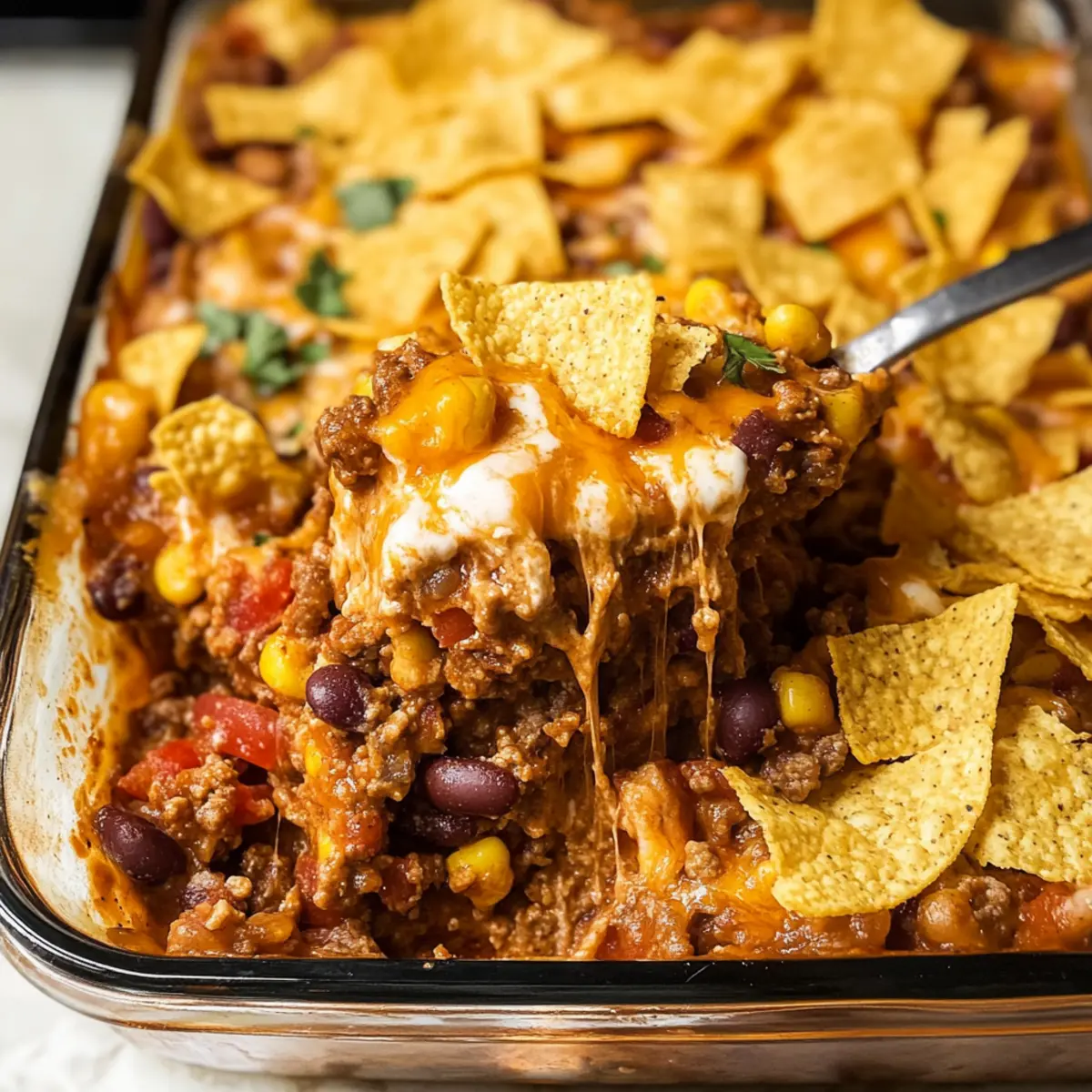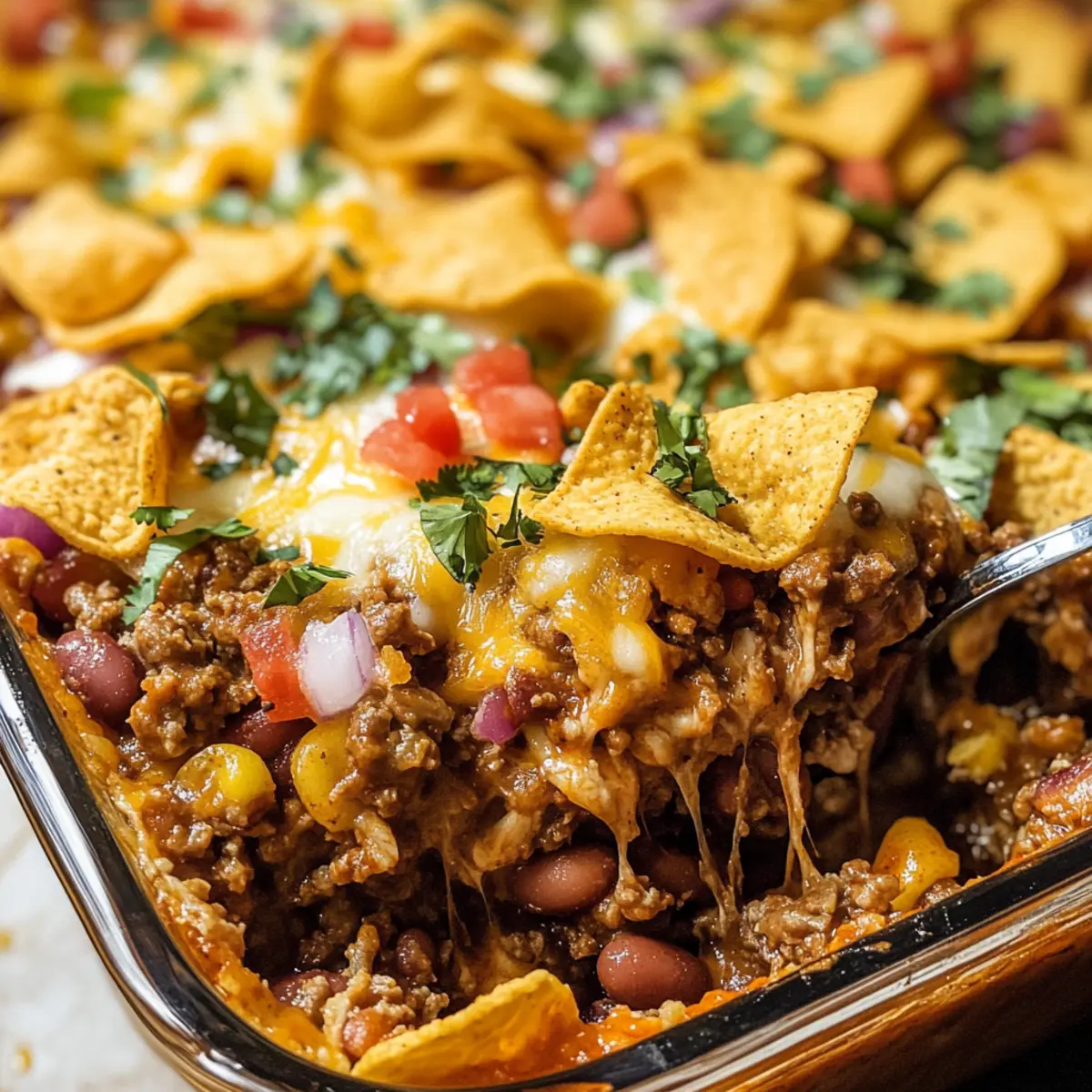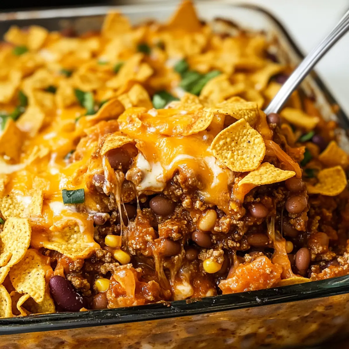 • Crunchy Topping: Statt Fritos kannst du Tortilla-Chips oder Nachos verwenden, um einen anderen Crunch zu erzielen. Diese Variationen fügen eine knusprige Dimension hinzu, die das Gericht aufwerten.