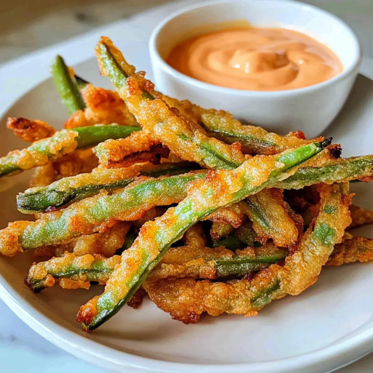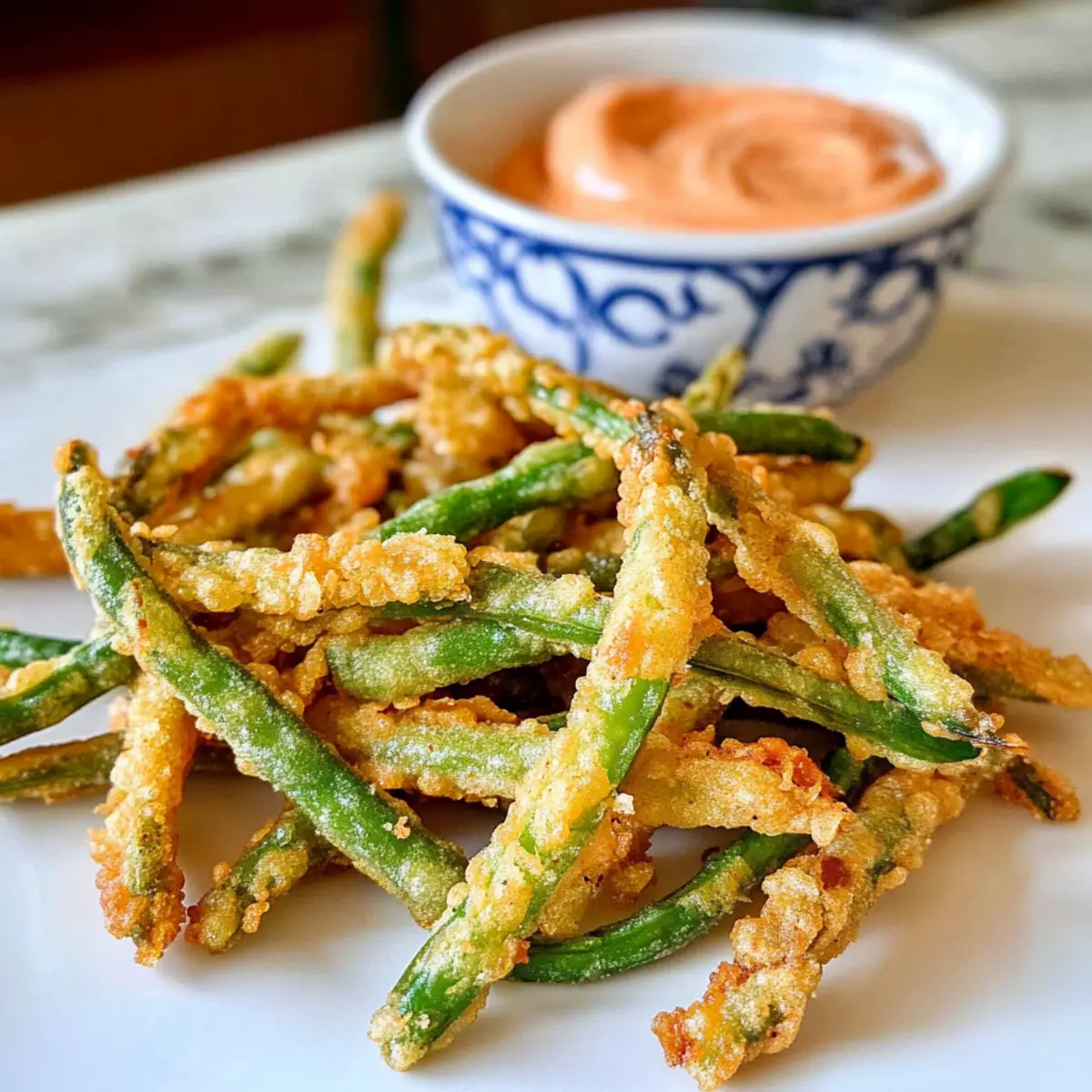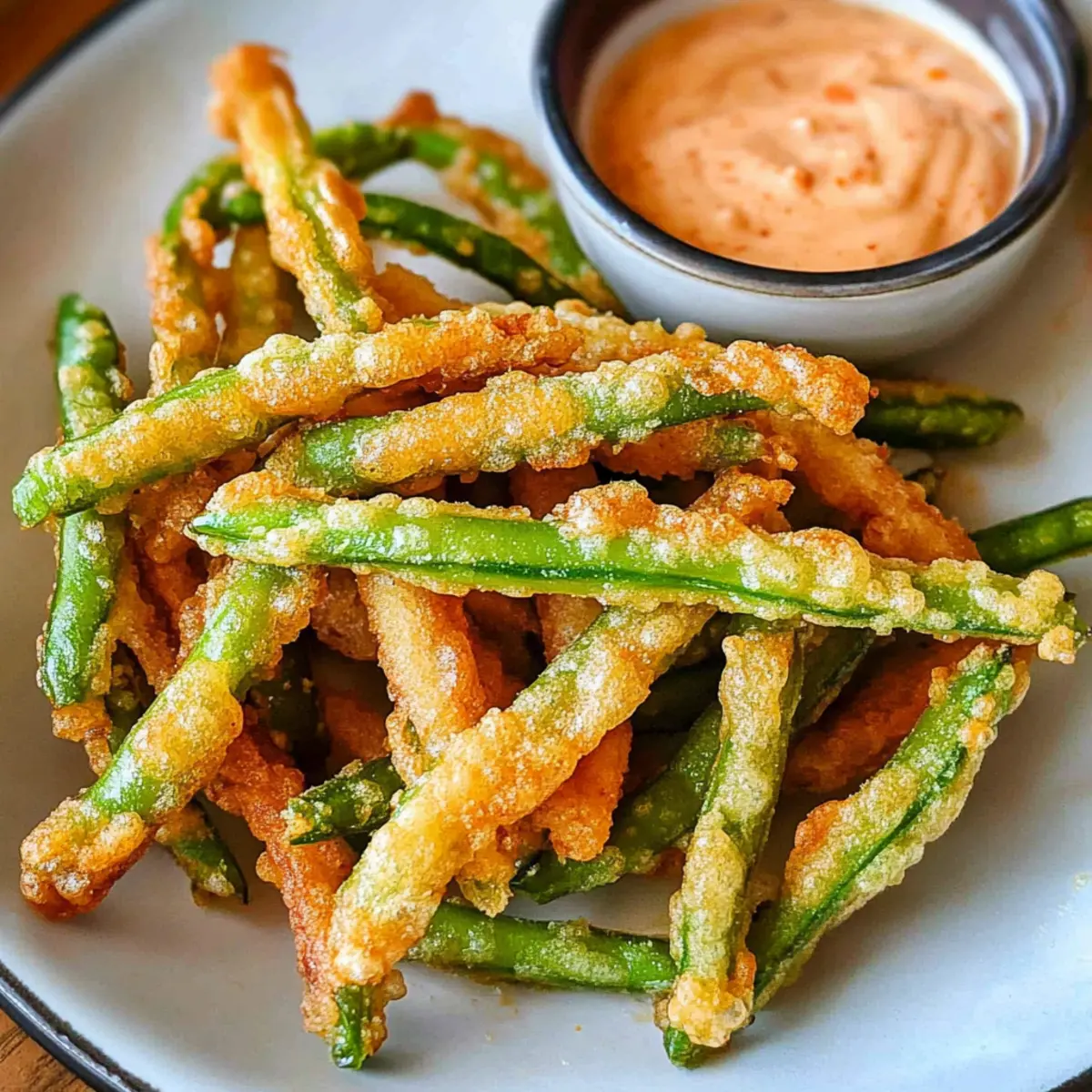 Als ich neulich in der Küche stand und den köstlichen Duft von frisch frittierten Snacks wahrnahm, kam mir die Idee für ein ganz besonderes Rezept: Frittierte grüne Bohnen. Diese goldbraunen, knusprigen Leckerbissen sind nicht nur ein Hit auf jeder Party, sie sind auch blitzschnell zubereitet – in nur etwa 30 Minuten. Die Kombination aus zarten grünen Bohnen und dem würzigen Sriracha-Mayo-Dip bietet eine perfekte Balance zwischen Crunch und Cremigkeit. Ob als Appetizer für den nächsten Filmabend oder als gesunde Alternative zu herkömmlichen Snacks – diese frittierten grünen Bohnen sind eine Geschmacksexplosion, die du nicht verpassen möchtest. Bist du bereit, deine Snackspiel auf das nächste Level zu bringen? Warum werden Sie dieses Rezept lieben? Einfachheit, die begeistert: Die Zubereitung dieser frittierten grünen Bohnen erfordert nur minimale Kochkenntnisse und ist in etwa 30 Minuten erledigt. Knuspriger Genuss: Ihre goldbraune, knusprige Textur sorgt für eine unwiderstehliche Knackigkeit, die das Geschmackserlebnis perfekt macht. Würzige Abwechslung: Der Sriracha-Mayo-Dip bringt eine pikante Note, die Ihre Geschmacksknospen zum Tanzen bringt – ideal sowohl für Parties als auch als gemütlicher Fernsehnacht-Snack. Vielfältige Variationen: Ob mit cremigem Honig-Senf oder einem einfachen Ranch-Dressing – traue dich, verschiedene Dips auszuprobieren, um noch mehr Abwechslung zu schaffen. Gesunde Snack-Option: Im Gegensatz zu vielen anderen frittierten Snacks enthalten diese grünen Bohnen essentielle Vitamine und Ballaststoffe, sodass du ohne schlechtes Gewissen genießen kannst. Bereite dich darauf vor, deine Gäste mit den frittierte grünen Bohnen zu begeistern! Zutaten für frittierte grüne Bohnen • Diese köstlichen frittierte grünen Bohnen benötigen nur frische Zutaten für den perfekten Snack! Für die Sriracha-Mayo Mayonnaise – bildet die cremige Basis für die Sriracha-Mayo; griechischer Joghurt kann für eine leichtere Variante verwendet werden. Sriracha – gibt der Mayo die nötige Schärfe; passe die Menge nach deinem Geschmack an oder tausche gegen eine andere scharfe Sauce aus. Salz – verstärkt den Geschmack; je nach Vorliebe kann auch Meersalz oder koscheres Salz verwendet werden. Zwiebelpulver – sorgt für einen herzhaften Geschmack; variieren kannst du mit Knoblauchpulver. Für die frittierten grünen Bohnen Frische grüne Bohnen – das Hauptgericht, das für die nötige Knackigkeit sorgt; normale grüne Bohnen sind empfehlenswert, da Haricot Verts zu dünn sind. Allzweckmehl – dient als Panade und sorgt für eine knusprige Textur; glutenfreies Mehl kann für eine glutenfreie Option verwendet werden. Gemahlener Cayenne-Pfeffer – verleiht dem Teig eine angenehme Schärfe; nach Belieben anpassen oder für einen milderen Geschmack weglassen. Kreuzkümmel – bringt einen warmen, erdigen Geschmack; kann durch Chilipulver ersetzt oder weggelassen werden. Schwarzer Pfeffer – fügt eine milde Schärfe hinzu; frischer gemahlener Pfeffer wird für besseres Aroma bevorzugt. Bier – sorgt für die Kohlensäure im Teig, wodurch er leichter wird; als alkoholfreie Alternative kann auch Sprudelwasser oder Limonade verwendet werden. Pflanzenöl – ist zum Frittieren notwendig und sorgt für die knusprige Textur; geeignet sind auch Rapsöl oder andere Öle mit hohem Rauchpunkt. Mit diesen Zutaten bist du bestens gerüstet, um köstliche frittierte grüne Bohnen zuzubereiten! Schritt-für-Schritt-Anleitung für frittierte grüne Bohnen Step 1: Sriracha Mayo vorbereiten In einer kleinen Schüssel die Mayonnaise, Sriracha, Salz und Zwiebelpulver gründlich verrühren, bis eine glatte Konsistenz erreicht ist. Stelle die Schüssel beiseite, damit sich die Aromen entfalten können, während du die restlichen Zutaten vorbereitest. Diese würzige Sriracha-Mayo wird der perfekte Dip für deine frittierten grünen Bohnen sein. Step 2: Vorbereitung der Panade Nehme einen flachen Teller und gebe eine Schicht Mehl darauf, um die grünen Bohnen gleichmäßig zu panieren. In einer großen Schüssel mische das restliche Mehl mit Cayennepfeffer, Kreuzkümmel, schwarzem Pfeffer, Salz und Knoblauchpulver. Langsam das Bier hinzufügen und vorsichtig umrühren, bis alle Zutaten gerade so gut vermischt sind, um eine leichte, klumpenfreie Bierteigkonsistenz zu erhalten. Step 3: Frittieren Erhitze etwa einen Zentimeter Pflanzenöl in einem schweren Topf oder einer Fritteuse auf 190 °C (375 °F). Tauche die frischen, gut abgetropften grünen Bohnen zuerst in das Mehl, damit sie gleichmäßig bedeckt sind. Anschließend in den Bierteig eintauchen und die Bohnen vorsichtig in das heiße Öl legen. Frittiere sie für 2-3 Minuten, bis sie goldbraun und knusprig sind, dabei einmal wenden, um eine gleichmäßige Bräunung zu gewährleisten. Step 4: Abtropfen und Servieren Nehme die frittierten grünen Bohnen mit einem Schaumlöffel aus dem Öl und lasse sie auf einem mit Küchenpapier ausgelegten Teller gut abtropfen. Serviere die heißen, knusprigen grünen Bohnen sofort mit der vorbereiteten Sriracha-Mayo. So erhältst du eine perfektes Snack-Erlebnis, das sicher alle begeistern wird! Aufbewahrungstipps für frittierte grüne Bohnen Zimmertemperatur: Lagere Reste nicht länger als 2 Stunden bei Raumtemperatur, um die Frische zu bewahren. Kühlschrank: Bewahre die frittierten grünen Bohnen in einem luftdichten Behälter im Kühlschrank auf. Sie bleiben bis zu 3 Tage frisch, verlieren jedoch etwas von ihrer Knusprigkeit. Gefrierschrank: Die frittierten grünen Bohnen können bis zu 2 Monate im Gefrierfach aufbewahrt werden. Lege sie auf ein Backblech und friere sie zunächst ein, bevor du sie in einen luftdichten Beutel umfüllst. Wiedererwärmung: Für besten Geschmack und Textur backe die gefrorenen Bohnen bei 200 °C im Ofen oder verwende eine Heissluftfritteuse, um die Knusprigkeit zurückzugewinnen. Was passt zu frittierte grüne Bohnen? Der perfekte Snack braucht
