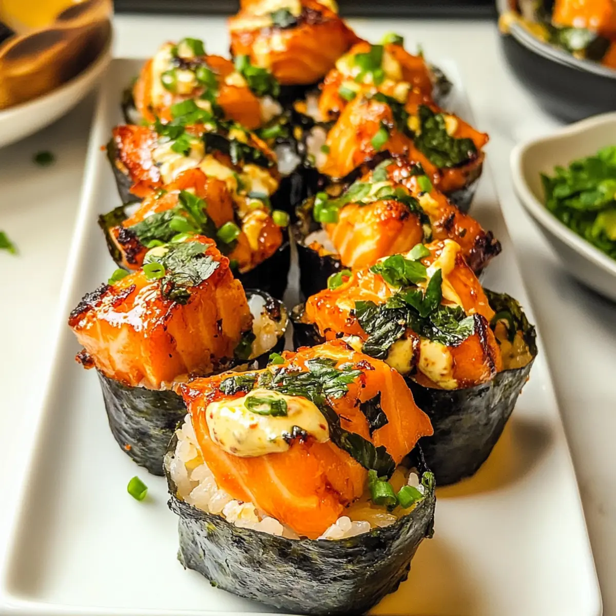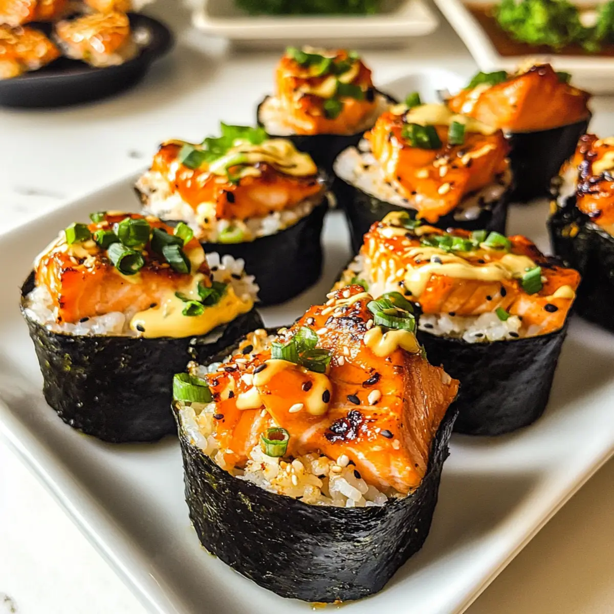 Gerade als ich in der Küche stand und die frischen Zutaten vorbereitete, traf es mich: Warum nicht mal Sushi neu denken? Die gebackenen Lachs Sushi Becher sind eine wundervolle Abwandlung des klassischen Sushi und bieten eine ebenso kreative wie köstliche Lösung für alle, die auf der Suche nach einem schnellen Snack oder einem perfekten Party-Appetizer sind. Diese kleinen Leckerbissen vereinen zarten Lachs, klebrigen Sushi-Reis und nori in einer praktischen Becherform, ideal für geselliges Beisammensein. Und das Beste? Sie sind nicht nur einfach zuzubereiten, sondern auch ein echter Hingucker auf jedem Tisch. Bereit für ein kulinarisches Experiment? Lass uns gemeinsam in die aufregende Welt dieser gebackenen Sushi-Becher eintauchen! Warum sind gebackene Lachs Sushi Becher so besonders? Einfache Zubereitung: Die Kombination aus wenigen, leicht erhältlichen Zutaten macht diesen Snack zur idealen Wahl für jede Gelegenheit. Viral und Beliebt: Mit ihrer einzigartigen Form und dem köstlichen Inhalt sind diese Sushi Becher ein echter Hingucker und haben sich schnell zum Trend entwickelt. Flexibilität: Diese Becher sind variabel und lassen sich mit verschiedenen Füllungen anpassen – von Garnelen bis Gemüse, für jeden Geschmack ist etwas dabei. Perfekte Portionen: Jede Portion ist handlich und lässt sich ideal teilen, perfekt für gesellige Abende oder als Party-Appetizer. Unvergleichlicher Geschmack: Der zarte Lachs kombiniert mit der cremigen Kewpie-Mayo und dem würzigen Sriracha sorgt für ein Geschmackserlebnis der besonderen Art! Für weitere kreative Rezepte könnten die scharfen Knoblauch Rindersteaks oder der erfrischende Erdbeer-Spinat-Salat eine tolle Ergänzung in deinem Kochrepertoire sein! Gebackene Lachs Sushi Becher Zutaten • Entdecke die aromatischen Aromen, die perfekt für deine nächste Veranstaltung sind! Für die Füllung Lachs – Die Hauptquelle für Protein; frischer oder gefrorener Lachs, in Würfel geschnitten, sorgt für eine köstliche Mischung. Leichte Sojasauce – Fügt Umami und Tiefe hinzu; für eine glutenfreie Option mit Tamari substituieren. Kewpie Mayo – Für Cremigkeit und einen Hauch von Säure; kann bei Bedarf durch normale Mayo ersetzt werden. Sriracha – Für die gewisse Schärfe; nach Belieben anpassen oder ganz weglassen. Sesamöl – Bringt einen reichhaltigen, nussigen Geschmack; kann durch neutrales Öl ersetzt werden, wenn nötig. Für den Reis Sushi-Reis – Die Basis des Rezepts, sorgt für die perfekte, klebrige Textur; verwende am besten kurzkörnigen Reis. Reisessig – Verleiht dem Reis zusätzlichen Geschmack; kann im Notfall mit Apfelessig substituiert werden. Schneckenocker – Balanciert die Aromen aus; kann weggelassen werden, wenn du es weniger süß magst. Für die Becher Nori-Blätter – Dienen als Umhüllung für Reis und Lachs; können bei Vorliebe durch Sojapapier ersetzt werden. Furikake – Garnitur für zusätzlichen Geschmack und Textur; optional, beliebige getrocknete Algengewürze sind ebenfalls passend. Frühlingszwiebeln – Frische Garnitur, die Crunch hinzufügt; kann durch Schnittlauch oder Lauch ersetzt werden. Mit diesen gebackenen Lachs Sushi Bechern erlebst du ein Geschmackserlebnis, das du nicht verpassen solltest! Schritt-für-Schritt-Anleitung für Gebackene Lachs Sushi Becher Step 1: Reis kochen Bereite den Sushi-Reis gemäß der Packungsanleitung zu. Spüle den Reis gründlich unter kaltem Wasser, bis das Wasser klar ist, und koche ihn dann in einem Reiskocher oder einem Topf mit der entsprechenden Menge Wasser. Lass den Reis nach dem Kochen 10 Minuten ruhen, damit er die perfekte klebrige Konsistenz erhält. Step 2: Essig-Mischung zubereiten Gib in eine mikrowellengeeignete Schüssel den Reisessig und den Zucker. Erhitze diese Mischung kurz in der Mikrowelle, etwa 20 Sekunden, bis der Zucker vollständig aufgelöst ist. Mische diese essigsüße Mischung vorsichtig unter den noch warmen Sushi-Reis und lass ihn abkühlen. Step 3: Ofen vorheizen Heize den Ofen auf 200 °C (400 °F) vor, sodass er bereit ist, die Gebackenen Lachs Sushi Becher perfekt zu garen. Achte darauf, dass der Ofen die Hitze gleichmäßig verteilt, um eine gleichmäßige Bräunung zu gewährleisten. Step 4: Lachs-Mischung vorbereiten In einer großen Schüssel kombinierst du den gewürfelten Lachs, die leichte Sojasauce, die Kewpie Mayo, die Sriracha und das Sesamöl. Rühre alles gut um, bis alle Zutaten gleichmäßig vermischt und der Lachs mit der würzigen Mischung überzogen ist. Diese Mischung wird die Füllung für die gebackenen Sushi Becher. Step 5: Nori zuschneiden Schneide die Nori-Blätter in Quadrate, die groß genug sind, um die Muffinförmchen auszukleiden. Achte darauf, dass die Blätter die Ränder überragen, damit die Füllung später gut gefasst wird. Diese Nori-Stücke geben den Sushi Bechern die perfekte Umhüllung. Step 6: Becher zusammensetzen Fette ein Muffinblech leicht ein, um ein Ankleben der Sushi Becher zu vermeiden. Lege die Nori-Quadrate in die Förmchen und beginne, den Sushi-Reis gleichmäßig hineinzulegen. Drücke den Reis leicht an, um eine gute Basis zu schaffen, und füge dann die Lachs-Mischung oben drauf, bis die Becher gefüllt sind. Step 7: Backen Setze die Muffinform in den vorgeheizten Ofen und backe die Sushi Becher für etwa 15 Minuten. Achte darauf, dass der Lachs gut durchgegart ist und die Oberfläche der Becher goldbraun wird, was auf das bevorstehende Genuss-Erlebnis hinweist. Step 8: Garniere und serviere Nimm die Becher aus dem Ofen und lasse sie kurz abkühlen. Vor dem Servieren kannst du sie mit etwas zusätzlicher Sriracha oder Kewpie Mayo beträufeln und mit Furikake sowie gehackten Frühlingszwiebeln bestreuen. Genieße die gebackenen Lachs Sushi Becher warm und frisch! Expertentipps für gebackene Lachs Sushi Becher Fischqualität: Wähle frischen oder tiefgekühlten Lachs von guter Qualität, um den besten Geschmack und die beste Textur der gebackenen Lachs Sus