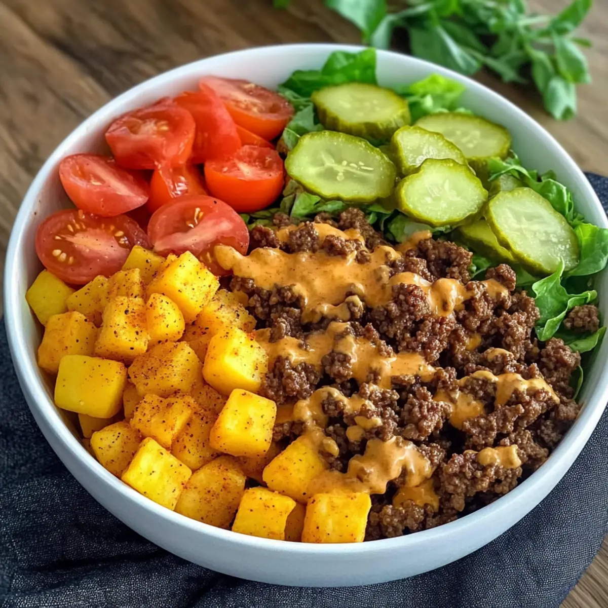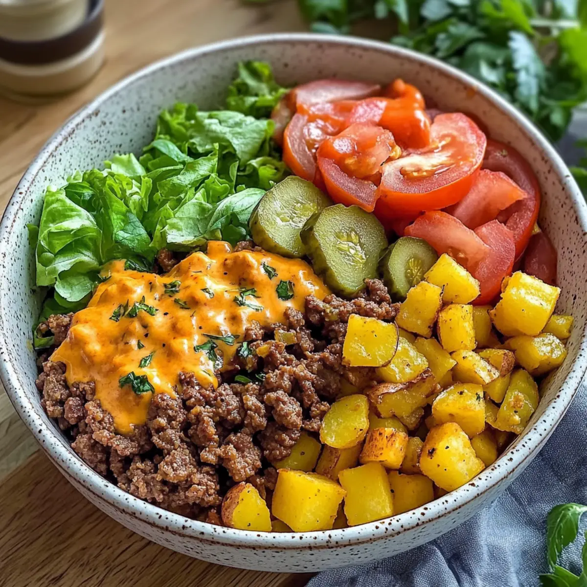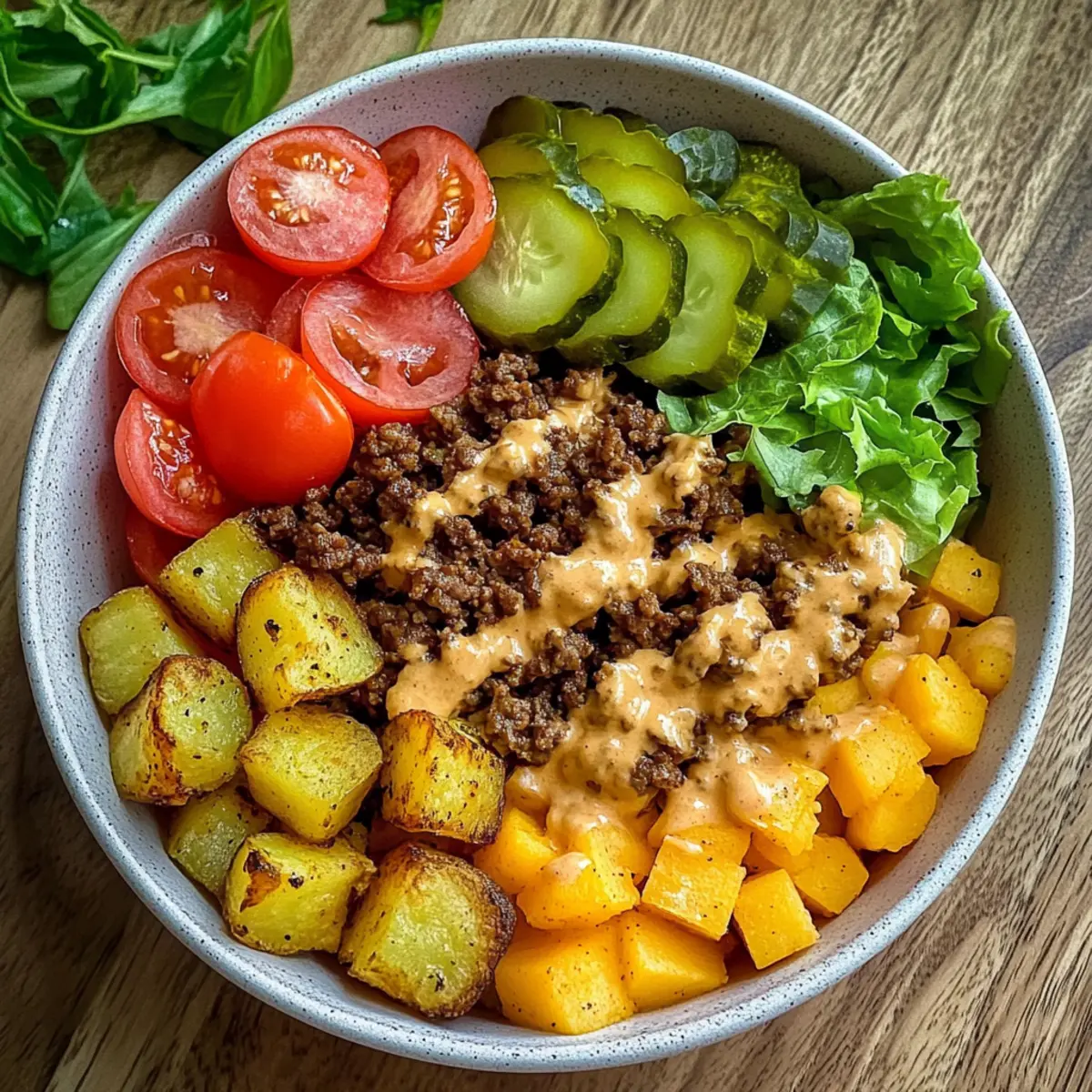 „Ich kann nicht glauben, dass ich noch nie daran gedacht habe!“ rief meine Freundin, als ich ihr von meiner neuen Entdeckung erzählte: die Gesunde Burger Schüssel. Diese kreative Abwandlung des klassischen Burgers kombiniert herzhaftes Rinderhackfleisch, schmelzenden Cheddar und knusprige Kartoffeln mit frischen, knackigen Gemüsebeigaben. Das Beste daran? Sie ist nicht nur schnell und einfach zuzubereiten, sondern auch perfekt für Meal Prep geeignet. Diese gesunde Bowl balanciert Geschmack und Leichtigkeit auf wunderbare Weise und bietet ein befriedigendes Essen, das sich sowohl zum Mittagessen als auch zum Abendessen eignet. Bist du bereit, deine Geschmacksknospen zu überraschen und gleichzeitig deine Liebsten zu begeistern? Lass uns gemeinsam in die Welt der Gesunden Burger Schüssel eintauchen! Warum wirst du diese Burger Schüssel lieben? Einfache Zubereitung: Die Gesunde Burger Schüssel ist im Handumdrehen gemacht, perfekt für hektische Tage. Keine komplizierten Schritte – einfach nach Anleitung kochen! Vielseitige Zutaten: Du kannst die Bowls nach deinem Geschmack anpassen. Tausche das Rinderhack gegen eine pflanzliche Alternative oder füge deine Lieblingsgemüse hinzu. Herzhafter Geschmack: Die Kombination aus geschmolzenem Käse und würzigem Fleisch sorgt für einen köstlichen Genuss, der deine Geschmacksknospen zum Tanzen bringt. Meal Prep freundlich: Ideal für das Vorausplanen von Gerichten. Bereite alle Zutaten vor und genieße jede Portion frisch, wann immer du Lust hast. Familienfreundlich: Ein einfaches Rezept, das sowohl Erwachsene als auch Kinder begeistert; jeder kann seine eigenen toppings wählen und so die Mahlzeit personalisieren. Gesunde Burger Schüssel Zutaten Für das Rindfleisch: • 500 g Rinderhackfleisch – Die Hauptproteinquelle, die Geschmack und Sättigung bietet. Substitution: Rinderhackfleisch durch Puten- oder Hühnchenhack für eine magere Option ersetzen. Für den Käse: • 3 Scheiben Cheddar – Verleiht der Schüssel Cremigkeit und Reichtum. Verwende alternativen Schmelzkäse wie Gouda, wenn gewünscht. Für den Salat: • 3 Romana-Salatherzen – Bieten Frische und Knusprigkeit. Substitution: Eisbergsalat oder gemischte Blattsalate. Für die Tomaten: • 3 große Tomaten – Fügen Saftigkeit und Süße hinzu. Substitution: Kirschtomaten oder Paprika. Für die Essiggurken: • 3 große Essiggurken – Bringen einen würzigen und knackigen Kontrast. Substitution: Dillgurken oder eingelegte Radieschen. Für die Kartoffeln: • 750 g Kartoffeln (vorwiegend festkochend) – Dienen als herzhaftes, wohltuendes Element. Technik: In Würfel schneiden für gleichmäßiges Garen. Für die Soße: • 4 EL Mayonnaise (fettarm) – Die Basis für die cremige Soße, die Reichtum hinzufügt. Option: Griechischen Joghurt für eine leichtere Version verwenden. • 2 EL Ketchup – Süße und Geschmacksverstärker. Substitution: BBQ-Sauce für einen rauchigen Geschmack. • 1 TL Senf – Fügt eine leichte Schärfe hinzu. Die Menge kann nach Geschmack angepasst werden. • 2-3 EL Essiggurkenwasser – Verstärkt die Geschmacksfülle in der Soße. Verwende Gurkenwasser aus dem Glas. • Salz & Pfeffer – Essenzielle Gewürze nach Geschmack. Für den Crunch: • 1 fein gewürfelte Essiggurke – Sorgt für zusätzlichen Biss und Geschmack. Diese Gesunde Burger Schüssel ist nicht nur ein Genuss, sondern auch eine kreative Möglichkeit, frische Zutaten zu kombinieren und eine abwechslungsreiche, schnelle Mahlzeit für die ganze Familie zu kreieren. Schritt-für-Schritt-Anleitung für die Gesunde Burger Schüssel Step 1: Kartoffeln vorbereiten Die Kartoffeln schälen und in gleichmäßige Würfel schneiden. Diese in einer Schüssel mit etwas Öl, Salz, Pfeffer und Paprika würzen. Heize die Heißluftfritteuse auf 220 °C vor und frittiere die Kartoffeln für 15 Minuten, wobei du sie nach der Hälfte der Zeit einmal schüttelst. Alternativ können sie bei 220 °C für 25-30 Minuten im Ofen gebacken werden, bis sie goldbraun und knusprig sind. Step 2: Gemüse vorbereiten Während die Kartoffeln garen, die Romana-Salatherzen in feine Streifen schneiden. Die Tomaten und Essiggurken waschen und in runde Scheiben schneiden. Diese frischen Zutaten verleihen der Gesunden Burger Schüssel Farbe und Crunch. Alles beiseite stellen und vorbereiten für die weitere Verwendung. Step 3: Rinderhackfleisch braten In einer großen Pfanne etwas Öl erhitzen und das Rinderhackfleisch hinzufügen. Bei mittlerer Hitze braten, bis das Fleisch gleichmäßig braun ist und krümelig wird. Mit Salz, Pfeffer und Paprika würzen und gut vermischen. Achte darauf, dass das Fleisch gut durchgegart ist, etwa 6-8 Minuten. Step 4: Käse schmelzen Sobald das Rinderhackfleisch gut gebräunt ist, die Käsescheiben gleichmäßig darauflegen und abdecken. Die Hitze auf mittlere Stufe reduzieren und warten, bis der Käse schmilzt, was etwa 2-3 Minuten dauert. Dies verleiht der Gesunden Burger Schüssel eine cremige Komponente. Step 5: Bowls zusammenstellen In großen Schalen erst eine Schicht aus dem geschnittenen Salat anrichten, gefolgt von den Tomatenscheiben und den Essiggurken. Die knusprigen Kartoffelwürfel darübergeben und das gebratene Rinderhackfleisch mit geschmolzenem Käse als Krönung darauf setzen. Step 6: Soße zubereiten In einer kleinen Schüssel die Mayonnaise, Ketchup, Senf und Essiggurkenwasser gut vermischen. Diese cremige Soße großzügig über die Gesunde Burger Schüssel träufeln, um zusätzlichen Geschmack zu verleihen. Optional kannst du die Bowls nach Belieben mit Sesamkörnern garnieren. Was passt gut zur Gesunden Burger Schüssel? Die Gesunde Burger Schüssel ist nicht nur ein Genuss allein, sondern lässt sich wunderbar mit weiteren köstlichen Begleitern kombinieren, die das Geschmackserlebnis perfekt abrunden. Knusprige Süßkartoffelpommes: Diese Pommes sind eine süße, nahrhafte Alternative zu normalen Kartoffeln. Sie bringen eine angenehme Süße und 