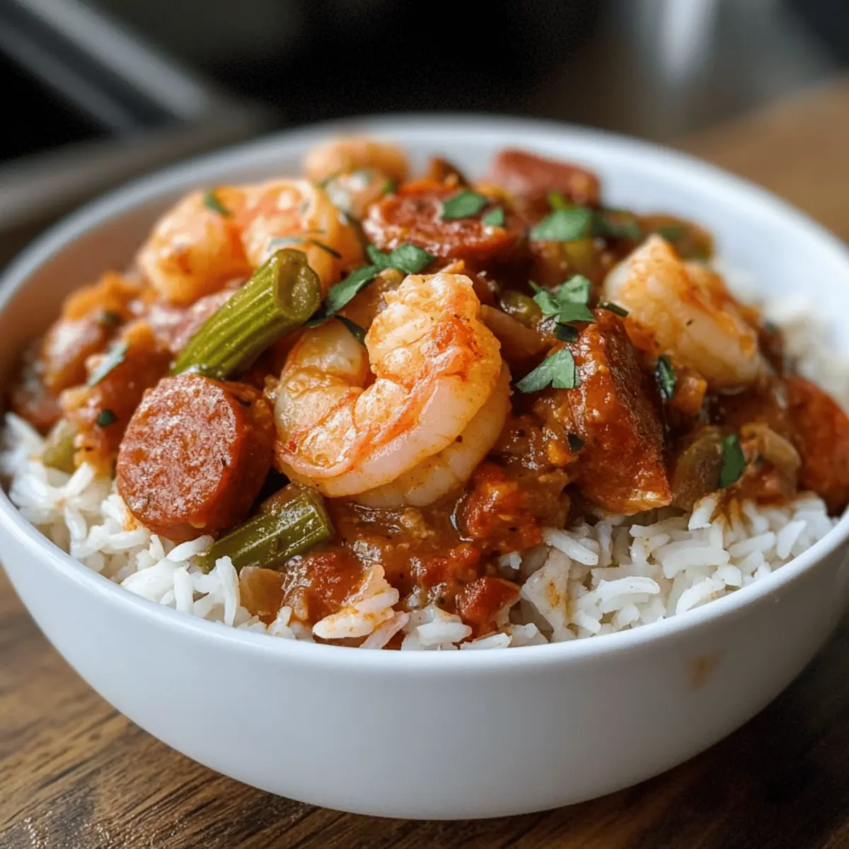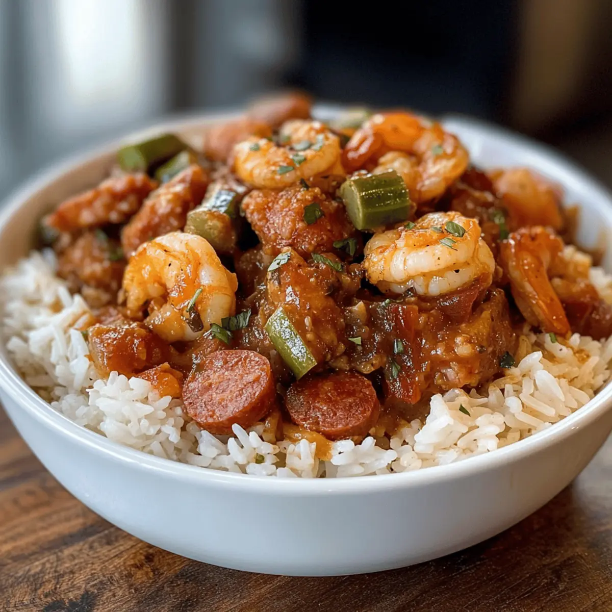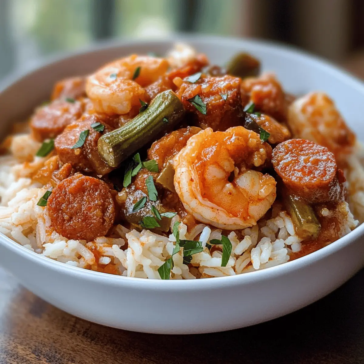 Die Kombination aus Gumbo und Jambalaya ist wie eine kulinarische Umarmung, die uns auf einen geschmacklichen Streifzug nach Louisiana entführt. Mein Rezept für Gumbo-laya bietet die perfekte Symbiose aus den herzhaften Aromen des Gumbos und dem wohligen Komfort von Jambalaya. Es ist nicht nur ein schnelles Gericht, das in unter 30 Minuten zubereitet werden kann, sondern auch extrem anpassbar – ob mit Hühnchen oder ganz ohne Meeresfrüchte, für jeden Geschmack ist etwas dabei. Perfekt für kühle Abende, wenn wir nach etwas Warmem und Nahrhaftem verlangen, wird dieses Gericht Ihr Herz und Ihren Magen gleichermaßen erfreuen. Bereit, in die Welt der würzigen Köstlichkeiten einzutauchen? Warum werden Sie dieses Rezept lieben? Einfache Zubereitung: Die Schritte sind unkompliziert und benötigen keine speziellen Kochkünste, sodass jeder in der Küche brillieren kann. Herzhaft und Würzig: Die Kombination von Gewürzen und Zutaten sorgt für einen geschmacklichen Höhenflug, der jeden Bissen unvergesslich macht. Kreative Anpassungen: Ob Sie Meeresfrüchte oder Hühnchen verwenden, Sie können das Rezept ganz nach Ihrem Geschmack anpassen und variieren. Perfekt für die ganze Familie: Dieses Gericht ist ideal, um große Mengen zuzubereiten und mit Freunden und Familie zu teilen. Schnell und Zeitersparnis: In weniger als 30 Minuten zubereitet, ist das Gumbo-laya das ideale Gericht für vielbeschäftigte Tage. Entdecken Sie auch weitere leckere Optionen wie unsere Avocado Schmelz Sandwich oder Pesto Mozzarella Rezept, die ebenso schnell und köstlich sind! Gumbo-laya Zutaten Für den Eintopf Andouille Wurst – sorgt für einen rauchigen, würzigen Geschmack; kann durch jede geräucherte Wurst ersetzt oder weggelassen werden für eine leichtere Variante. Hühnchen (Oberschenkel oder Brust) – liefert Protein und Fülle; ersetzbar durch Truthahn für eine magerere Option. Garnelen – bietet eine zarte Meeresfrüchte-Note; kann durch zusätzliches Hühnchen ersetzt oder ganz weggelassen werden. Okra – verdickt den Eintopf und sorgt für eine interessante Textur; kann durch grüne Bohnen ersetzt oder weggelassen werden, wenn nicht gewünscht. Paprika, Zwiebel, Sellerie (Trinität) – essentielle Basis für den Geschmack; jede Farbe der Paprika kann verwendet werden; mehr Zwiebel verstärkt die Süße. Knoblauch – fügt aromatische Tiefe hinzu; Sie können auch gehackten Knoblauch für mehr Bequemlichkeit verwenden. Gehackte Tomaten – sorgt für Säure und Feuchtigkeit; sowohl frische als auch Dosentomaten sind austauschbar. Hühnchenbrühe – dient als Basis für den Eintopf; verwenden Sie hausgemachte oder fettarme Brühe aus dem Geschäft. Cayennepfeffer – bringt Schärfe und Würze; nach Geschmack anpassen, je nach persönlicher Vorliebe. Creole Würzmischung – verbessert das gesamte Geschmacksprofil; auch austauschbar mit Cajun Gewürzmischung oder selbstgemischt. Reis (Jasmin) – dient als Beilage; sorgt für eine lockere Textur, um den Eintopf zu begleiten; kann auch durch weißen oder braunen Reis ersetzt werden, der separat gekocht wird. Viel Spaß beim Kochen und Genießen Ihres köstlichen Gumbo-laya! Schritt-für-Schritt-Anleitung für Gumbo-laya Schritt 1: Zutaten vorbereiten Zuerst die Andouille-Wurst, das Hühnchen und das Gemüse in kleine Stücke schneiden. Dies sorgt für gleichmäßiges Kochen und eine ansprechende Textur. Bereiten Sie alle Zutaten vor, bevor Sie mit dem Kochen beginnen, um einen reibungslosen Ablauf zu gewährleisten. Es ist wichtig, alle Schnitte gleichmäßig zu halten. Schritt 2: Wurst anbraten Erhitzen Sie einen großen Topf bei mittlerer Hitze und fügen Sie die geschnittene Wurst hinzu. Kochen Sie die Wurst für etwa 5-7 Minuten, bis sie gut gebräunt und aromatisch ist. Rühren Sie gelegentlich um, um eine gleichmäßige Bräunung zu gewährleisten. Dies wird die Basis für die herzhaften Aromen Ihres Gumbo-laya schaffen. Schritt 3: Hühnchen anbraten Fügen Sie die geschnittenen Hühnchenstücke in den Topf hinzu und braten Sie sie zusammen mit der Wurst für weitere 5-7 Minuten an, bis sie goldbraun sind. Achten Sie darauf, dass das Hühnchen durchgegart ist und keine rosa Stellen mehr sichtbar sind. Dies gibt dem Gericht eine tiefere Geschmacksdimension und eine herzhafte Grundlage. Schritt 4: Gemüse hinzufügen Streuen Sie die gehackte Paprika, Zwiebel und Sellerie in den Topf und braten Sie alles zusammen für etwa 5-6 Minuten an. Rühren Sie regelmäßig um, bis das Gemüse weich und leicht transparent ist. Diese Mischung, auch „Trinität“ genannt, ist entscheidend für den Geschmack des Gumbo-laya. Schritt 5: Aromaten einrühren Fügen Sie den gehackten Knoblauch hinzu und braten Sie ihn für etwa 1 Minute an, bis er aromatisch ist. Achten Sie darauf, dass der Knoblauch nicht anbrennt, da er sonst bitter werden kann. Diese Aromen werden die Basis für den Eintopf weiter intensivieren. Schritt 6: Eintopf-Basis bilden Geben Sie die gehackten Tomaten und die Hühnchenbrühe in den Topf und bringen Sie alles zum Simmern. Das Ganze sollte etwa 10 Minuten köcheln, bis die Geschmäcker gut durchgezogen sind. Rühren Sie gelegentlich um, um ein Anbrennen am Boden zu vermeiden und die Zutaten gut zu vermischen. Schritt 7: Würzen Fügen Sie den Cayennepfeffer und die Creole Würzmischung hinzu. Rühren Sie gut um und passen Sie die Gewürze nach Ihrem persönlichen Geschmack an. Lassen Sie das Gumbo-laya dann weitere 5 Minuten köcheln, damit sich die Aromen entfalten können und das Gericht angenehm würzig wird. Schritt 8: Garnelen und Okra einfühlen Fügen Sie die Garnelen und die Okra in den letzten 5 Minuten des Kochens hinzu. Rühren Sie alles gut um und lassen Sie es kochen, bis die Garnelen rosa und durchgegart sind. Achten Sie darauf, dass die Garnelen nicht überkochen, da sie sonst zäh werden können. Dieser Schritt vollendet das Gumbo-laya mit einer zarten Meeresfrüchte-Note. Schritt 9: Mit Reis servieren Serviere
