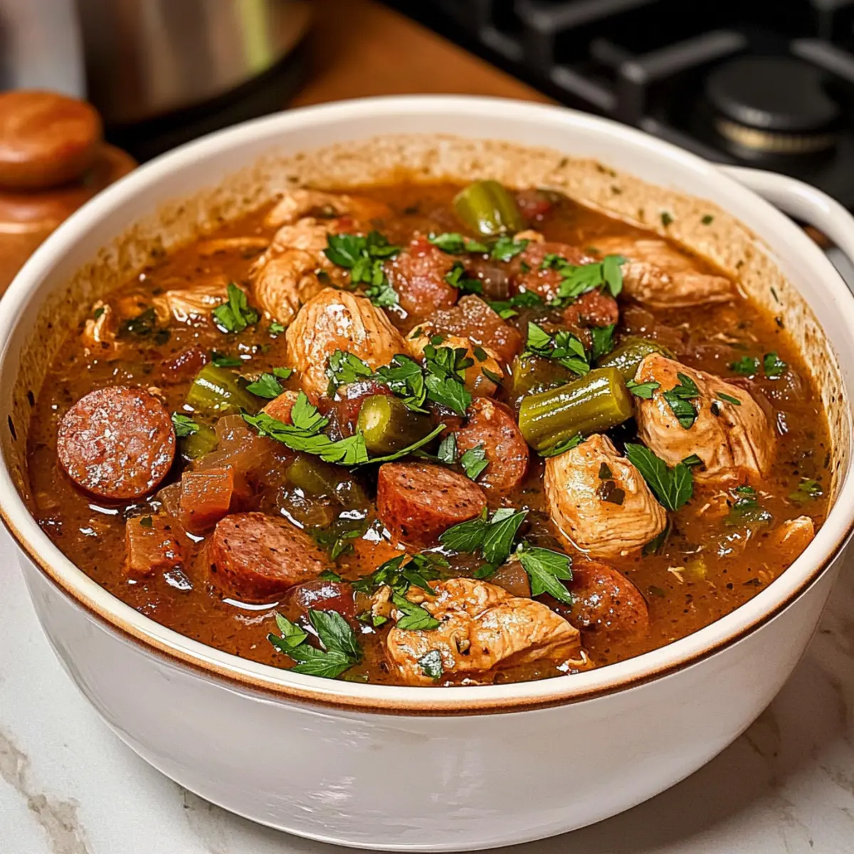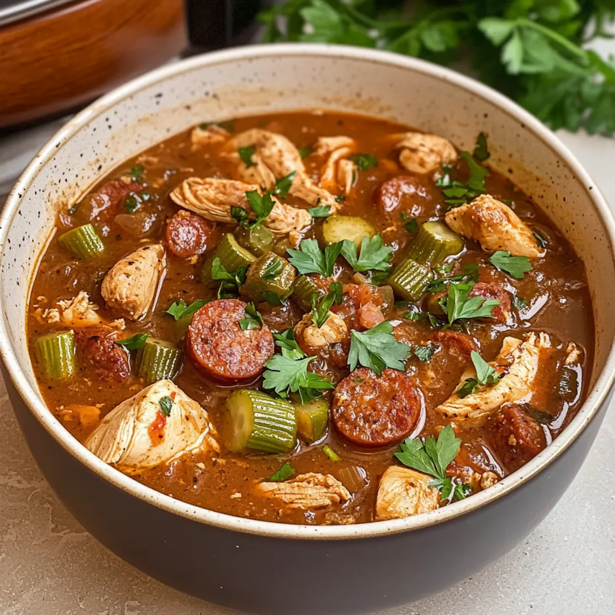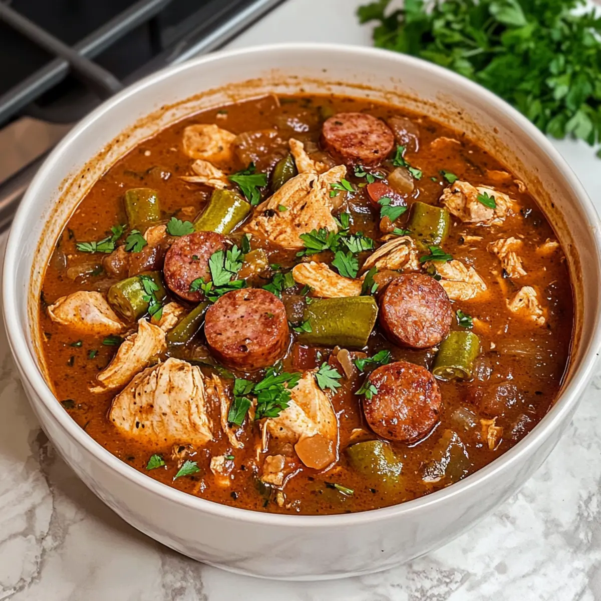 Als die verschiedenen Aromen aus meiner Küche in die Luft stiegen, wusste ich, dass ich etwas Besonderes zaubern würde. Das Rundumgefühl, das eine Schüssel gut gewürzter Chicken and Sausage Gumbo hervorrufen kann, ist einfach unschlagbar. Diese klassische Gumbo-Rezeptur vereint die herzhaften Einflüsse der Cajun- und Kreolischen Küche und entführt dich direkt nach Louisiana. Die Zubereitung ist nicht nur schnell und unkompliziert, sondern auch perfekt für gemütliche Abende mit Familie und Freunden. Und das Beste daran? Du kannst je nach Vorliebe und vorhandenen Zutaten variieren! Welches Geheimnis wirst du in deine eigene Version dieser köstlichen Suppe einbauen? Warum wirst du dieses Gumbo-Rezept lieben? Vielseitigkeit: Egal ob du Hühnchen oder andere Proteine verwenden möchtest, dieses Rezept passt sich perfekt deinen Vorlieben an. Reiche Aromen: Die Kombination aus Cajun-Gewürzen und frischen Zutaten sorgt für einen wahren Geschmacksexplosion. Einfach und schnell: Mit nur wenigen Schritten zauberst du ein herzhaftes Gericht, ideal für den Alltag oder besondere Anlässe. Perfekt für gesellige Abende: Teile diese köstliche Suppe mit Freunden und Familie und genieße gemeinsam diese Geschmacksreise in die Südstaaten. Gesundheitsbewusst: Mit der Option für glutenfreies Mehl und frischen Zutaten kannst du deine Mahlzeit ganz nach deinen Bedürfnissen anpassen. Kreativität: Experimentiere mit Zutaten, um deine persönliche Note einzubringen – vielleicht das Hinzufügen von Meeresfrüchten für eine köstliche Variante? Gumbo Zutaten • Für den Eintopf Rotisserie-Hühnchen – Vorbereitete Proteinquelle für Komfort. Substitution: Gekochte Hähnchenbrust oder -schenkel können verwendet werden. Andouille-Wurst – Authentische Cajun-Wurst, die einen rauchigen Geschmack hinzufügt. Substitution: Geräucherte Rinderwurst oder Kielbasa. Hühnerbrühe – Bildet die Basis für die Gumbo. Hinweis: Verwende natriumarme Brühe für weniger Salzigkeit. Würfelte Tomaten – Fügt dem Gericht einen kreolischen Touch hinzu. Substitution: Für eine rein Cajun-Variante weglassen. Cajun-Gewürzmischung – Fängt den Geist der Cajun-Küche ein. Substitution: Kreolische Gewürzmischung für einen milderen Geschmack. Grüne Paprika, Zwiebel, Sellerie – Die „heilige Dreifaltigkeit“ der Cajun-Küche, die Süße und Tiefe hinzufügt. Cayennepfeffer – Sorgt für Schärfe; nach Geschmack anpassen. Getrockneter Thymian – Fügt erdigen Duft hinzu; kann bei Bedarf durch italienische Kräutermischung ersetzt werden. Lorbeerblatt – Verstärkt den Geschmack während des Kochens; vor dem Servieren entfernen. Pflanzenöl – Wird zur Herstellung der Roux verwendet; kann durch Olivenöl ersetzt werden. Okra – Sorgt für Textur; verwende gefrorene, geschnittene Okra für Komfort. Substitution: Zucchini bei Allergie. Knoblauch – Fügt aromatischen Geschmack hinzu; kann durch Knoblauchpulver ersetzt werden. Weißes Mehl – Hauptbestandteil für die Roux. Hinweis: Verwende glutenfreies Mehl für eine glutenfreie Version. Salz und schwarzer Pfeffer – Nach Geschmack. Anpassen abhängig von der Brühe und Salzigkeit der Wurst. Frische Petersilie – Optionale Garnierung für Frische und Farbe. Entdecke mit diesem Gumbo die aufregenden Aromen der Cajun-Küche! Step-by-Step Instructions for Classic Chicken and Sausage Gumbo Step 1: Wurst anbraten Erhitze einen großen Topf bei mittelhoher Hitze. Brate die Andouille-Wurst in Scheiben für etwa 5 Minuten an, bis sie auf beiden Seiten schön goldbraun ist. Nimm die Wurst heraus und stelle sie beiseite, während du das Aroma im Topf bewahrst. Step 2: Roux zubereiten Reduziere die Hitze auf mittel und füge 1/2 Tasse Pflanzenöl und 1/2 Tasse Mehl hinzu. Rühre ständig für etwa 35 Minuten, bis die Mischung eine dunkle, schokoladenfarbene Roux entwickelt. Achte darauf, dass sie nicht anbrennt, da dies den Geschmack beeinflusst. Step 3: Gemüse hinzufügen Füge die gewürfelte grüne Paprika, Zwiebel, Sellerie und gehackten Knoblauch zur Roux hinzu. Koche die Mischung für 5–8 Minuten, bis die Zwiebeln glasig sind und die Aromen sich entfalten. Rühre gelegentlich um, damit nichts am Boden des Topfes festklebt. Step 4: Zutaten kombinieren Gib nun die Wurst zurück in den Topf und füge das zerkleinerte Rotisserie-Hühnchen, 4 Tassen Hühnerbrühe, die gewürfelten Tomaten (optional), Cajun-Gewürz, Cayennepfeffer, Thymian und das Lorbeerblatt hinzu. Mische alles gut und bringe die Mischung zum Kochen. Step 5: Simmern Sobald das Gemisch kocht, reduziere die Hitze auf niedrig und lasse die Gumbo ohne Deckel 1–2 Stunden köcheln. Rühre regelmäßig um, damit sich die Aromen gut vermischen und nichts ansetzt, während du auf die perfekte Konsistenz wartest. Step 6: Okra hinzufügen In den letzten 30 Minuten der Kochzeit füge die gefrorene Okra hinzu. Dies verleiht der Gumbo die gewünschte Textur und hilft, die Brühe zu verdicken. Rühre gut um und überprüfe die Konsistenz, um sicherzustellen, dass sie deinem Geschmack entspricht. Step 7: Fertigstellen und servieren Am Ende der Kochzeit probiere das Gumbo und passe die Gewürze nach deinem Geschmack an. Serviere die heiße Gumbo mit frischer, gehackter Petersilie garniert. Diese würzige Mischung aus Hühnchen und Wurst ist der perfekte Hochgenuss für dein nächstes gemütliches Abendessen. Was passt gut zu Classic Chicken and Sausage Gumbo? Das perfekte Mahlzeitserlebnis wird durch köstliche Beilagen ergänzt, die die Aromen der Cajun-Küche wunderbar unterstützen. Fluffiger Reis: Serviere deinen Gumbo über cremigem weißen Reis, um die würzige Brühe aufzusaugen und eine herzhafte Basis zu bieten. Der Reis rundet das Gericht perfekt ab. Süßer Maisbrot: Die herzhaften Aromen des Gumbo harmonieren hervorragend mit einem Stück frisch gebackenem, süßen Maisbrot, das die Schärfe wunderbar ausgleicht. Zitronige Coleslaw: Der frische, knackige Charakter eines Zitronen-Coleslaws 