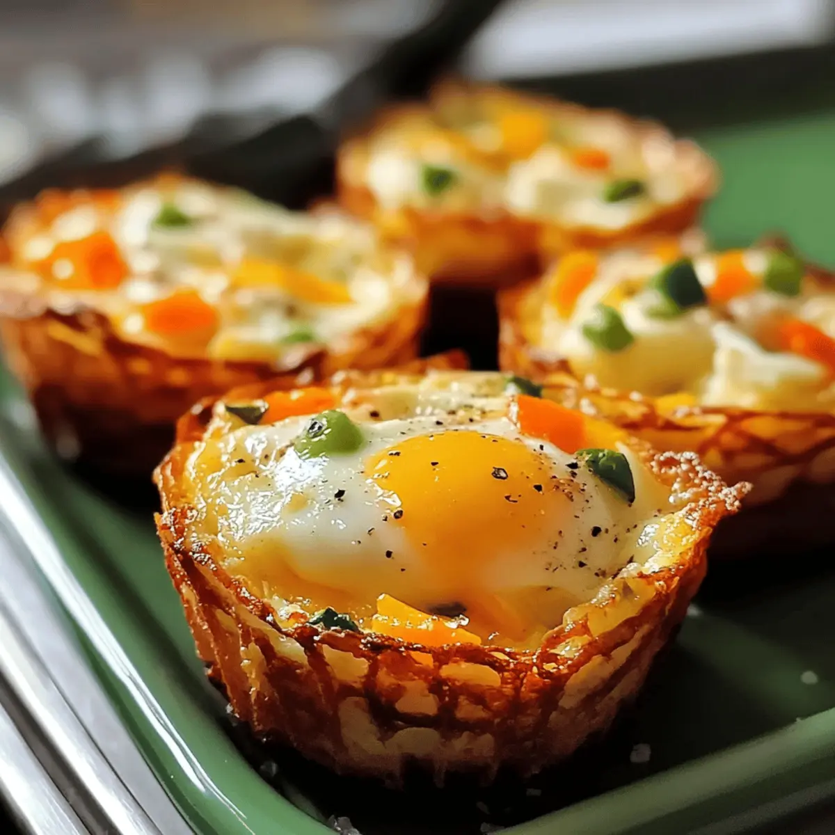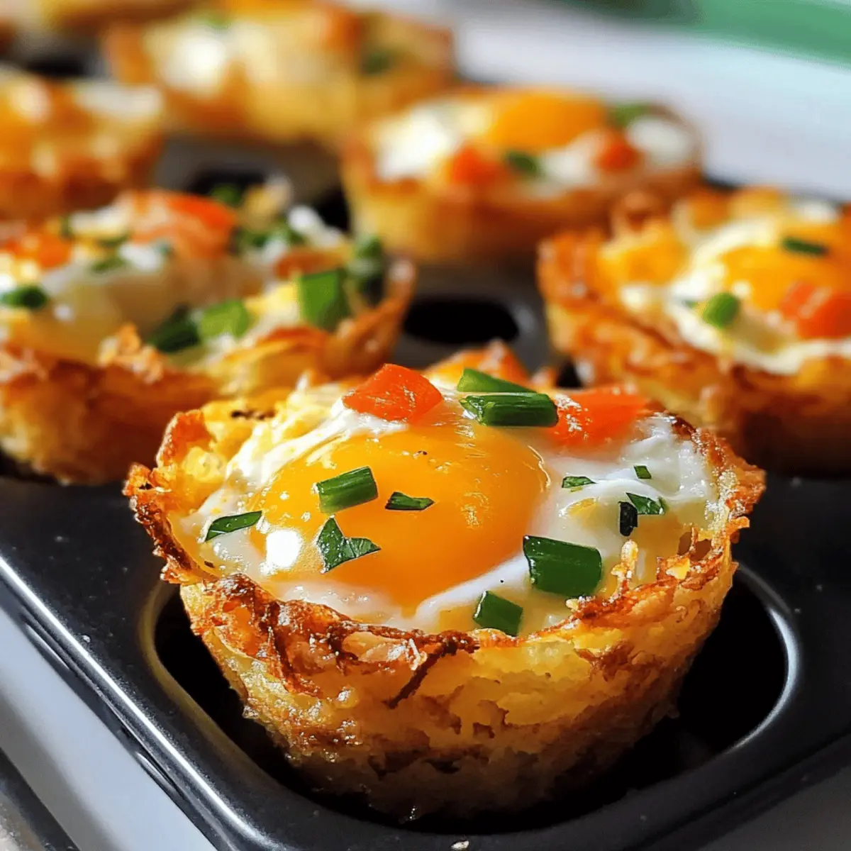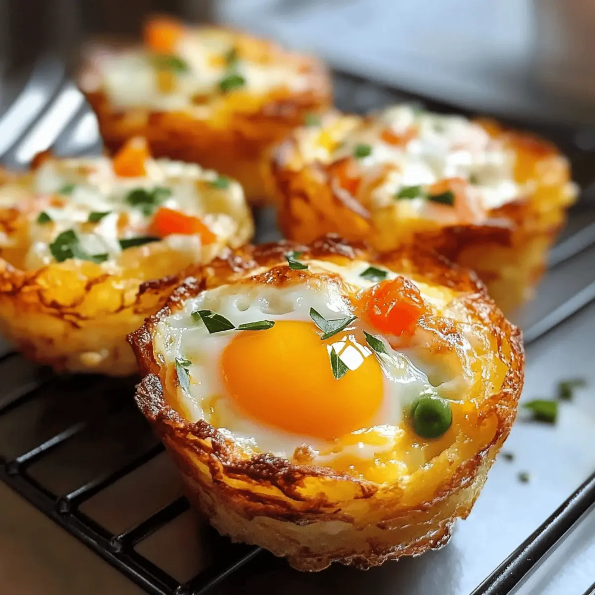 Der Duft frisch gebackener Frühstücksmuffins durchdringt die Küche und lässt mein Herz höher schlagen. Diese herzhaften Hash Brown Egg Cups sind nicht nur ein schnelles und einfaches Frühstück, sie sind auch perfekt zum Mitnehmen – ideal für hektische Morgen! Mit einer knusprigen Kartoffelbasis aus Hash Browns und einer fluffigen Ei-Mischung bieten sie unendliche Möglichkeiten zur Personalisierung. Egal, ob Sie Käse lieben, Gemüse einfügen oder sogar eine fleischige Note hinzufügen möchten, diese kleinen Körbchen lassen sich in weniger als 30 Minuten zubereiten. Sie sind eine großartige Option für die ganze Familie und halten sich im Kühlschrank oder Gefrierfach prima. Bereit für eine kulinarische Entdeckungsreise in die Welt der Hash Brown Egg Cups? Lassen Sie uns zusammen loslegen! Warum sind diese Hash Brown Egg Cups einzigartig? Vielseitigkeit: Sie sind vollständig anpassbar! Ob Sie verschiedene Käsesorten, Gemüse oder sogar Fleisch hinzufügen möchten, der Kreativität sind keine Grenzen gesetzt. Schnelligkeit: In weniger als 30 Minuten zubereitet, eignen sich diese Becher perfekt für hektische Morgen. Praktisch: Ideal zum Mitnehmen, können sie problemlos im Kühlschrank aufbewahrt oder eingefroren werden. Geschmack: Die Kombination aus knusprigen Hash Browns und fluffigen Eiern sorgt für einen unverwechselbaren Geschmack, den alle lieben werden. Gesundheitlich: Mit nur etwa 150 Kalorien pro Becher sind sie eine nahrhafte und sättigende Frühstücksoption. Lassen Sie sich auch von ähnlichen Rezepten inspirieren, wie unseren Zitronen Brownies Rezept oder den herzhaften Parmesan Knoblauch Rezept! Hash Brown Egg Cups Zutaten Für die Basis • Hash Browns – Sorgt für die knusprige Grundlage. Hinweis: Verwenden Sie aufgetaute geriebene Hash Browns oder frische, gut ausgedrückte Kartoffeln. • Eier – Wirkt als proteinreiche Füllung. Substitution: Verwenden Sie Eiersatz für eine cholesterinarme Option. • Milch – Hilft, die Eimischung für Fluffigkeit zu binden. Substitution: Verwenden Sie pflanzliche Milch für eine milchfreie Version. Für die Füllung • Geriebener Cheddar-Käse – Fügt Cremigkeit und Geschmack hinzu. Substitution: Eine Mischung aus Käsen wie Mozzarella oder Pepper Jack kann verwendet werden. • Gekochter Speck (optional) – Bietet herzhaften Geschmack und Textur. Substitution: Sautierte Pilze oder Spinat für eine vegetarische Option. • Würfelig geschnittene Paprika (optional) – Sorgt für Farbe und Biss. Hinweis: Verwenden Sie Ihr Lieblingsgemüse. • Würfelig geschnittene Zwiebel (optional) – Fügt aromatischen Geschmack hinzu. • Frische Kräuter (optional) – Für Garnierung und zusätzlichen Geschmack. Variationen: Schnittlauch, Petersilie oder Thymian können verwendet werden. Würzen • Salz und Pfeffer – Essenziell für die Würze. Die Hash Brown Egg Cups sind nicht nur köstlich, sondern auch anpassbar, wodurch sie sich perfekt für jeden Geschmack eignen! Schritt-für-Schritt-Anleitung für schnelle Hash Brown Egg Cups Step 1: Ofen vorheizen und Muffinblech vorbereiten Heizen Sie den Ofen auf 200 °C vor und fetten Sie ein 12er Muffinblech gut ein. Dies verhindert, dass die Hash Brown Egg Cups später kleben bleiben. Warten Sie, bis der Ofen die Temperatur erreicht hat, bevor Sie mit dem nächsten Schritt fortfahren. Step 2: Hash Browns vorbereiten In einer Schüssel die aufgetauten Hash Browns mit 1/4 Tasse geriebenem Cheddar-Käse vermengen. Drücken Sie die Mischung gleichmäßig in die Muffinförmchen, um kleine Nester zu formen. Achten Sie darauf, dass die Hash Browns gut gepresst sind, um eine feste Struktur zu erhalten, damit die Becher gut halten. Step 3: Hash Browns backen Backen Sie die Nester für 20 Minuten im vorgeheizten Ofen, bis sie goldbraun und knusprig sind. Halten Sie während des Backens Ausschau nach einer schönen goldenen Farbe; das zeigt an, dass sie perfekt sind. Step 4: Eiermischung vorbereiten Während die Hash Brown-Nester backen, die Eier in einer separaten Schüssel mit der Milch, Salz und Pfeffer verquirlen. Fügen Sie die restlichen Käsestücke, den Speck und die gewünschten Gemüse hinzu. Diese Mischung wird die köstliche Füllung für Ihre Hash Brown Egg Cups. Step 5: Ofentemperatur reduzieren Nehmen Sie die gebackenen Hash Brown-Nester aus dem Ofen und reduzieren Sie die Ofentemperatur auf 175 °C. Dies sorgt dafür, dass die Eier gleichmäßig und sanft garen, ohne zu verbrennen. Step 6: Eiermischung einfüllen Füllen Sie die gebackenen Hash Brown-Nester vorsichtig mit der vorbereiteten Eiermischung. Achten Sie darauf, sie nicht zu überfüllen, damit die Mischung beim Backen nicht überläuft. Es sollte genügend Platz für die Eierfüllung bleiben. Step 7: Weiterbacken Backen Sie die gefüllten Nester für weitere 15-18 Minuten im Ofen. Die Eier sollten fest und leicht gebräunt sein; diese visuelle Anleitung zeigt Ihnen, dass die Hash Brown Egg Cups fertig sind. Step 8: Abkühlen und garnieren Lassen Sie die Hash Brown Egg Cups nach dem Backen kurz abkühlen, bevor Sie sie aus dem Muffinblech nehmen. Garnieren Sie die Becher nach Belieben mit frischen Kräutern. Servieren Sie sie warm für ein köstliches Frühstückserlebnis. Lagerungstipps für Hash Brown Egg Cups Kühlschrank: Bewahren Sie die Reste in einem luftdichten Behälter auf, um die Frische zu erhalten, bis zu 3 Tage lang. Gefrierfach: Wickeln Sie die Hash Brown Egg Cups individuell in Frischhaltefolie und lagern Sie sie in einem Gefrierbeutel für bis zu 2 Monate. Auftauen: Lassen Sie gefrorene Becher über Nacht im Kühlschrank auftauen, bevor Sie sie aufwärmen. Wiedererwärmen: Erhitzen Sie die Hash Brown Egg Cups im Ofen, in der Mikrowelle oder im Airfryer, bis sie durchgehend warm sind. Vorbereitungen für die Hash Brown Egg Cups Die Hash Brown Egg Cups sind perfekt für die Vorausplanung! Sie können die Hash Brown-Nester bis zu 24 Stunden im Voraus zubereiten, indem Sie die aufgetaute