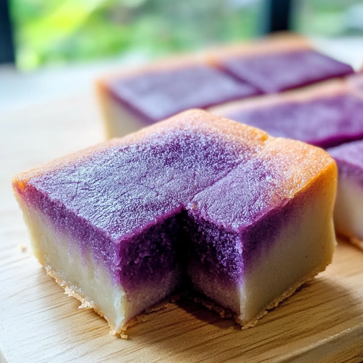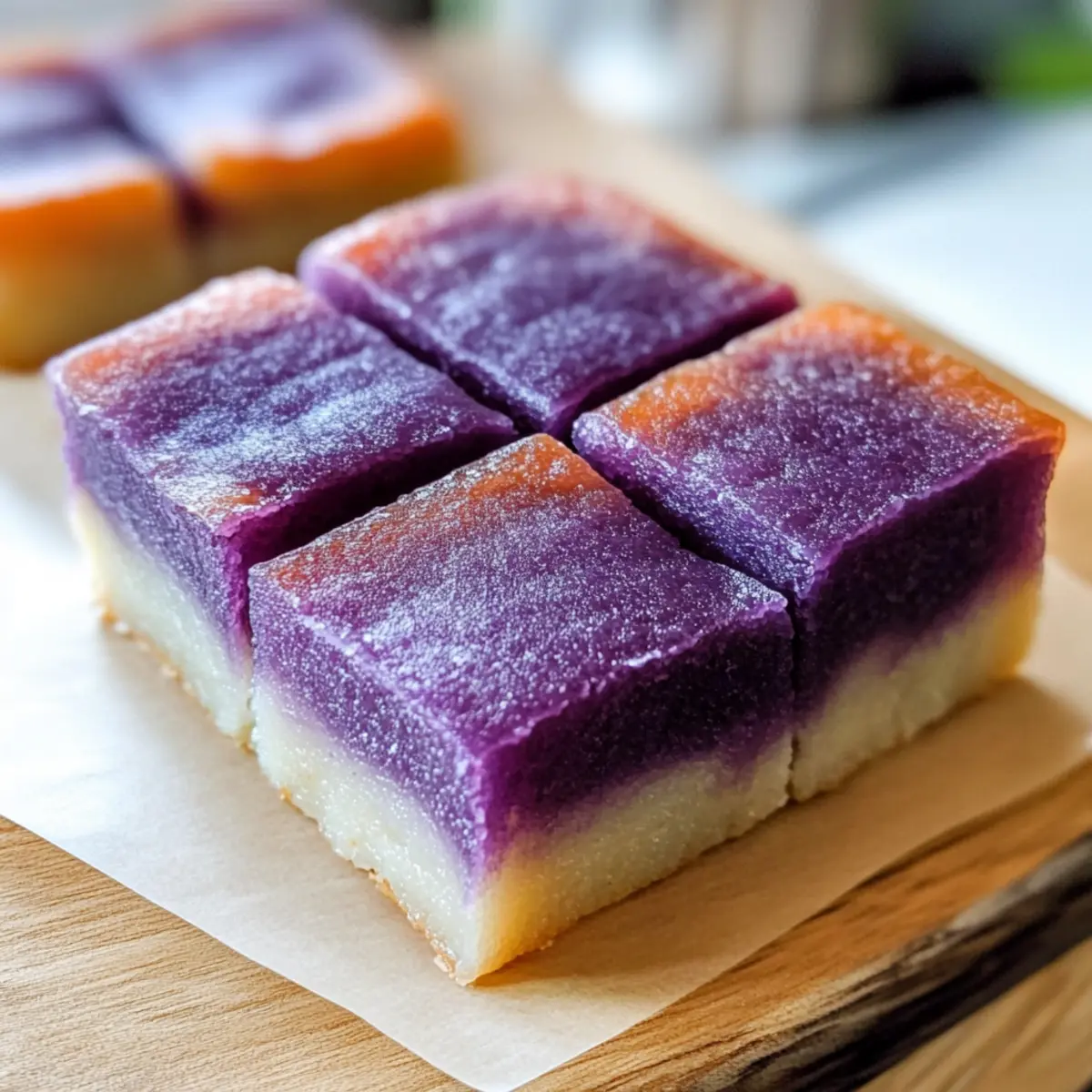 Ich kann die tropische Brise fast spüren, während ich an den letzten Sommerabend am Strand zurückdenke, wo das sanfte Rauschen der Wellen die perfekte Kulisse für süße Leckereien bieten konnte. Wenn du dich nach einem Dessert sehnst, das sowohl einfach zuzubereiten als auch glutenfrei ist, ist mein Rezept für Hawaiian Butter Mochi mit Ube genau das Richtige für dich! Diese köstliche süße Verführung vereint die zarte, kaubare Textur von Mochi mit dem einzigartigen Geschmack der lila Yam, die jedem Bissen eine besondere Note verleiht. Lass dich nicht nur von der einfachen Zubereitung überzeugen, sondern auch von der Möglichkeit, damit deine Freunde und Familie zu begeistern. Bist du bereit, in die Welt dieser genialen tropischen Köstlichkeit einzutauchen? Warum ist dieses Rezept ein Must-Have? Einfacher Genuss: Die Zubereitung für Hawaiian Butter Mochi mit Ube ist kinderleicht und erfordert keine speziellen Backkünste. Glutenfrei und lecker: Ideal für alle, die glutenfreie Desserts lieben, ohne auf Geschmack verzichten zu müssen. Tropischer Geschmack: Der einzigartige Mix aus Kokosnuss und Ube verleiht diesem Dessert eine exotische Note, die besonders zum Träumen einlädt. Vielfältige Variationen: Du kannst leicht mit Aromen wie Matcha oder Schokolade experimentieren, um neue Geschmäcker zu entdecken. Egal, ob bei festlichen Anlässen oder als casual Snack – dieses Mochi wird alle begeistern! Hawaiian Butter Mochi mit Ube Zutaten • Perfekt für dein nächstes Dessert-Abenteuer! Für den Teig Süßreis- oder Klebreismehl – sorgt für die wunderbare, kaubare Textur, die Mochi ausmacht; keine direkten Substitutionen empfohlen. Vollfett-Kokosmilch – verleiht eine cremige Konsistenz und tropischen Geschmack; leichte Kokosmilch könnte den Reichtum beeinträchtigen. Zucker – süßt das Mochi; brauner Zucker kann für einen tieferen Geschmack sorgen, jedoch die Textur leicht verändern. Ungesalzene Butter – liefert Feuchtigkeit und Reichtum; kann durch Kokosöl ersetzt werden für eine milchfreie Variante. Wasser – hilft, die richtige Konsistenz des Teigs zu erreichen; keine Substitutionen nötig. Ube-Extrakt – bringt den einzigartigen Geschmack und die Farbe; Ube-Pulver oder Extrakt können verwendet werden, wobei die Geschmacksintensität variieren kann. Lass dich inspirieren und genieße die tropische Frische, die dieses Dessert in dein Zuhause bringt! Schritt-für-Schritt-Anleitung für Hawaiian Butter Mochi mit Ube Schritt 1: Ofen vorheizen Heize deinen Ofen auf 175°C (350°F) vor. Ein gut vorgeheizter Ofen sorgt dafür, dass das Hawaiian Butter Mochi mit Ube gleichmäßig backt und die ideale Textur erhält. Lass den Ofen einige Minuten laufen, bis die Temperatur erreicht ist, so wird das Mochi perfekt goldbraun. Schritt 2: Backform vorbereiten Fette eine 20×20 cm (8×8 Zoll) große Backform gründlich ein, um ein Ankleben des Teigs zu vermeiden. Verwende dazu ungesalzene Butter oder ein Pflanzenöl, um sicherzustellen, dass dein Hawaiian Butter Mochi mit Ube nach dem Backen leicht aus der Form zu entnehmen ist. Schritt 3: Trockene Zutaten vermischen In einer großen Schüssel das Süßreis- oder Klebreismehl und den Zucker gut miteinander vermengen. Mische die trockenen Zutaten gründlich, bis sie gleichmäßig verteilt sind. Achte darauf, dass keine Klumpen zurückbleiben, um eine feine Konsistenz deines Mochis zu erzielen. Schritt 4: Nasse Zutaten mischen In einer separaten Schüssel die geschmolzene Butter, die Kokosmilch, das Wasser und den Ube-Extrakt gut verrühren, bis eine glatte Mischung entsteht. Diese feuchten Zutaten sorgen für den köstlichen, tropischen Geschmack des Hawaiian Butter Mochi mit Ube und verleihen ihm seine reichhaltige Konsistenz. Schritt 5: Mischungen kombinieren Gieße die nassen Zutaten langsam in die trockenen Zutaten und rühre sanft um, bis alles gerade so vermischt ist. Vermeide das Übermixen, um die perfekte kaubare Textur des Mochis zu gewährleisten. Kleine Klümpchen sind in Ordnung; sie tragen zum charakteristischen Mundgefühl bei. Schritt 6: Teig in die Backform gießen Gieße die fertige Mischung gleichmäßig in die vorbereitete Backform und verstreiche sie glatt. Achte darauf, dass der Teig in der Form gleichmäßig verteilt ist, damit das Hawaiian Butter Mochi mit Ube gleichmäßig backen kann und die Kanten nicht zu trocken werden. Schritt 7: Backen Backe das Mochi im vorgeheizten Ofen für 45–50 Minuten, bis die Oberseite goldbraun und leicht fest ist, wenn du sie berührst. Du solltest einen köstlichen Duft in deiner Küche wahrnehmen, während es backt. Das Mochi ist fertig, wenn die Oberfläche sich leicht von den Rändern löst. Schritt 8: Abkühlen lassen Lass das Hawaiian Butter Mochi mit Ube vollständig in der Form abkühlen, bevor du es in Quadrate schneidest. Dies ist wichtig, damit sich die Textur setzt und das Mochi nicht zu klebrig wird. Warmer Mochi kann schwierig zu schneiden sein, also hab Geduld und lass es etwas ruhen. Expertentipps für Hawaiian Butter Mochi mit Ube Nicht Übermixen: Achte darauf, den Teig nur kurz zu mischen, um die kaubare Textur des Hawaiian Butter Mochi mit Ube zu bewahren. Übermixen führt zu einer gummiartigen Konsistenz. Kühlzeit Warten: Lass das Mochi nach dem Backen vollständig abkühlen, bevor du es schneidest. So verhinderst du, dass es zu klebrig wird und einfacher zu portionieren ist. Variationen Ausprobieren: Scheue dich nicht, mit verschiedenen Aromen zu experimentieren! Neben Ube kannst du auch Matcha oder Schokoladengeschmack ausprobieren, um das klassische Rezept neu zu interpretieren. Was serviert man zu Hawaiian Butter Mochi mit Ube? Genieße die harmonische Verbindung von süßen und frischen Aromen, während du dein Dessert mit these köstlichen Begleitern kombinierst. Frische Mango: Die Süße und Saftigkeit von Mango ergänzen die tropischen Noten des Mochis wunderbar und bringen einen Hauch von Frische. Kokosnusseis: Dieser cremige Lec