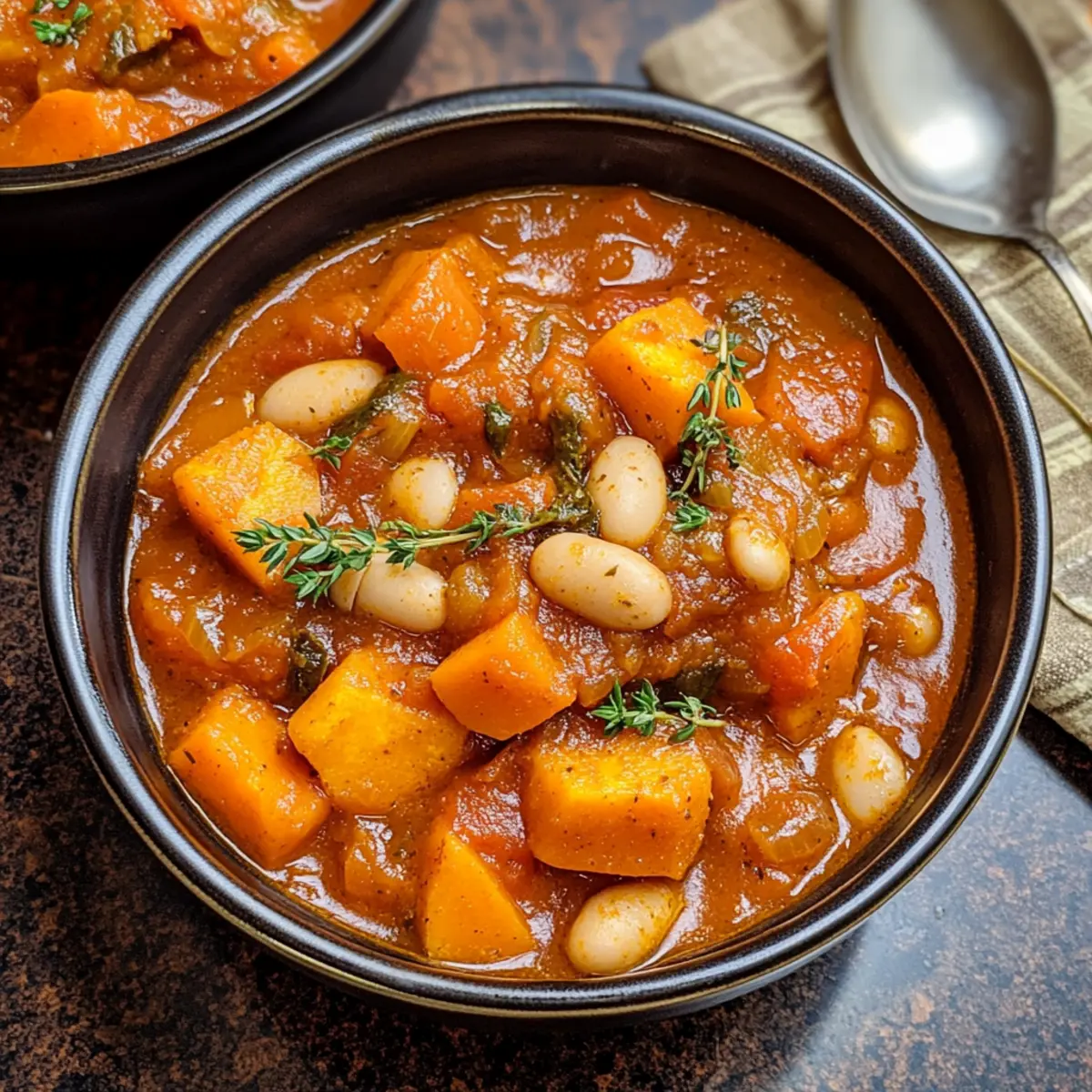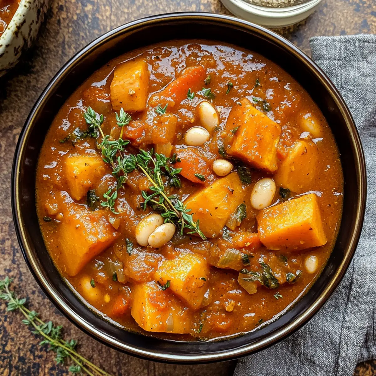 Auf den ersten Blick mag es wie ein weiteres einfaches Gericht erscheinen, aber dieser herzhaft vegane Süßkartoffel-Eintopf hat das Potenzial, selbst die skeptischsten Gaumen zu überzeugen. An kalten Abenden kommt dieser Eintopf wie gerufen: Er vereint süße, zarte Süßkartoffeln, nahrhafte Bohnen und eine Auswahl an aromatischen Gemüse in einer reichhaltigen Tomatenbrühe. Perfekt für alle, die auf der Suche nach einer schnellen und unkomplizierten Mahlzeit sind, lässt sich dieser Eintopf mit nur einem Topf zubereiten und bietet dazu noch den Vorteil, dass er voll gepackt mit pflanzlicher Energie ist. Wer könnte da widerstehen? Welche kreativen Variationen würdest du diesem köstlichen Gericht hinzufügen? Warum ist dieser Eintopf so besonders? Herzhaft und nahrhaft: Dieser herzhaft vegane Süßkartoffel-Eintopf ist nicht nur sättigend, sondern auch voller gesunder Zutaten, die deinem Körper guttun. Einfache Zubereitung: Mit nur einem Topf und minimalem Aufwand kannst du ein fantastisches Gericht zaubern, perfekt für stressige Wochentage. Vielseitig: Variiere ihn nach Lust und Laune! Füge saisonales Gemüse hinzu oder verwandele ihn mit einem Schuss Kokosmilch in eine cremige Köstlichkeit. Für jeden Geschmack: Egal, ob du Veganer bist oder einfach neue, gesunde Rezepte ausprobieren möchtest, dieser Eintopf wird alle überzeugen. Optimale Lagerung: Perfekt für Meal Prep! Du kannst Reste problemlos einen Tag später genießen oder sogar portionieren und einfrieren. Herzhaftes Veganes Süßkartoffel-Eintopf Zutaten • Ein köstliches und nahrhaftes Gericht, das nicht nur Veganer begeistert! Für den Eintopf Extra Virgin Olive Oil – sorgt beim Anbraten für gesunde Fette; kann durch ungesalzenes Butter oder Kokosöl ersetzt werden. Zwiebel (1, gehackt) – liefert eine herzhafte Grundnote; weiß, gelb oder rot sind möglich. Sellerie (1 Stange, gewürfelt) – bringt einen knackigen Biss und erdigen Geschmack; optional und kann weggelassen werden. Karotten (1-2, geschält und gehackt) – fügt Süße und Farbe hinzu; kann durch Pastinaken ersetzt werden, wenn gewünscht. Knoblauch (4 Zehen, gehackt) – hebt das Aroma des Eintopfs; frischer Knoblauch ist am besten, kann aber auch durch Knoblauchpulver ersetzt werden. Frischer Thymian (3 Zweige) – gibt dem Eintopf eine herzhafte Note; kann durch 1 Teelöffel getrockneten Thymian ersetzt werden. Bio-Weiße Bohnen (1 Dose, 15 oz., abgetropft und gespült) – sorgt für Proteine und Fülle; Kichererbsen oder Linsen sind ebenfalls geeignet. Würfelig geschnittene Süßkartoffeln (2 Tassen) – bringt Süße und eine cremige Textur; kann durch Butternusskürbis ersetzt werden. Würfelig geschnittene Russet- oder Yukon-Kartoffeln (2 Tassen) – sorgt für Substanz im Eintopf; auch Baby-Cremekartoffeln können verwendet werden. Bio-Tomatenmark (4 EL) – verstärkt die Reichhaltigkeit des Eintopfs; Tomatenpüree kann als Ersatz dienen. Bio-Weißmehl (3 EL) – verdickt den Eintopf; für glutenfreie Version mit Maisstärke oder glutenfreiem Mehl ersetzen. On Everything All-Purpose Blend (2 TL) – bietet eine Mischung aus Gewürzen; selber machen oder kaufen. Geräuchertes Paprika (1 TL) – bringt Wärme und Tiefe; normales Paprika ist eine mildere Alternative. Meersalz (1 TL) – hebt alle Aromen; nach Geschmack anpassen. Tomatensauce (1 Dose, 28 oz. oder gewürfelte Tomaten) – bildet die Basis des Eintopfs; frische Tomaten sind auch möglich, wenn sie länger gekocht werden. Bio-Gemüsebrühe (3 Tassen) – hält den Eintopf vegan und geschmackvoll; eigene oder gekaufte, natriumarme Brühe verwenden. Worcestershire-Sauce (1 EL) – sorgt für umami Geschmack; die vegane Version beachten, Sojasauce wäre ein Ersatz. Optionales Topping Frische Kräuter (z.B. Petersilie oder Koriander) – für den letzten Schliff und frische Aromen. Avocado-Würfel – bringt eine cremige Textur, die perfekt zu Eintöpfen passt. Lass dich inspirieren und entdecke die zahlreichen Variationen, die der herzhafte vegane Süßkartoffel-Eintopf zu bieten hat! Schritt-für-Schritt-Anleitung für Herzhaftes Veganes Süßkartoffel-Eintopf Step 1: Öl erhitzen Erhitze in einem mittleren Schmortopf bei mittlerer bis hoher Hitze 2 Esslöffel Olivenöl. Achte darauf, dass das Öl heiß ist, bevor du mit dem nächsten Schritt fortfährst, um die Zwiebeln und den Knoblauch schnell aromatisch zu braten. Step 2: Zwiebeln und Knoblauch anbraten Gib die gehackten Zwiebeln und den fein gehackten Knoblauch in den Topf und brate sie für etwa 1-2 Minuten an, bis sie duften und leicht glasig sind. Mische sie gut, damit sie gleichmäßig garen und ein tolles Aroma entwickeln. Step 3: Gemüse hinzufügen Füge die gewürfelten Karotten und den Sellerie hinzu und brate sie weitere 1-2 Minuten. Achte darauf, dass alles gut vermischt ist, damit die Aromen sich entfalten können und die Karotten weich werden, aber noch bissfest bleiben. Step 4: Gewürze und Tomatenmark einrühren Rühre die „On Everything“-Gewürzmischung, das geräucherte Paprika, das Meersalz und das Tomatenmark ein. Vermenge alles gut, sodass die Gewürze gleichmäßig verteilt sind, und lass es 1 Minute anbraten, um deren Aromen freizusetzen. Step 5: Mehl einarbeiten Streue das Weißmehl über die Mischung und rühre es gut ein, sodass es mit den anderen Zutaten homogen verbunden wird. Das Mehl verdickt den Eintopf; lass es etwa 1 Minute kochen, um den rohen Mehlgeschmack zu beseitigen. Step 6: Brühe hinzufügen Gieße langsam die Gemüsebrühe unter ständigem Rühren hinzu, bis alles gut vermischt ist. Erhöhe die Hitze ein wenig, damit die Mischung anfängt zu köcheln und sich eine schöne Konsistenz bildet. Step 7: Tomatensauce und Gemüse einrühren Füge die Tomatensauce, die Worcestershire-Sauce, die weißen Bohnen, die gewürfelten Süßkartoffeln und die traditionellen Kartoffeln hinzu. Rühre alles gründlich um, damit die süßen und herzhaften Zutaten gut miteinander verbunden s
