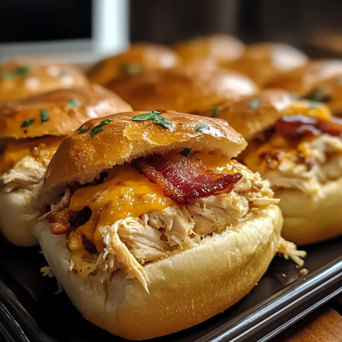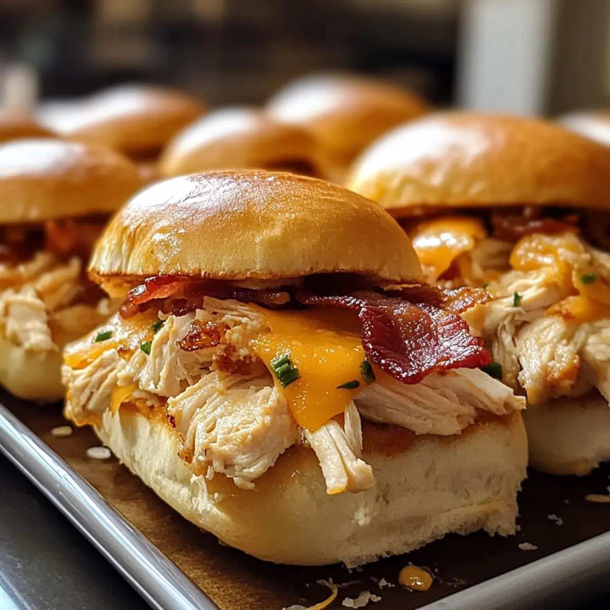 Der verführerische Duft von frisch gebackenem Brot und knusprigem Bacon zieht mich sofort in die Küche. Heute stelle ich euch ein Rezept vor, das nicht nur den Gaumen verwöhnt, sondern auch blitzschnell zubereitet ist: die Hühnchen Bacon Ranch Brötchen! Diese kleinen Leckerbissen kombinieren zartes, zerrissenes Hühnchen mit dem herzhaften Geschmack von Bacon und einer cremigen Ranchsauce zwischen weichen Brötchen. In nur 40 Minuten habt ihr eine köstliche Mahlzeit, die bei jedem Treffen – sei es beim Spieltag oder beim Familienessen – der Star auf dem Tisch wird. Das Beste daran? Ihr könnt sie nach Herzenslust mit euren Lieblingszutaten anpassen! Seid ihr bereit, eure Küche in eine Wohlfühloase des Geschmacks zu verwandeln? Warum sind diese Brötchen so unwiderstehlich? Schnelle Zubereitung: In nur 40 Minuten könnt ihr diese köstlichen Hühnchen Bacon Ranch Brötchen zaubern – perfekt für spontane Treffen! Vielseitig und anpassbar: Verwendet eure Lieblingszutaten und persönliches Flair. Ob Jalapeños oder Avocado, eure Ideen machen das Rezept einzigartig. Harmonische Geschmackskombination: Zartes Hühnchen, knuspriger Bacon und cremige Ranchsauce verschmelzen zu einem Geschmackserlebnis, das begeistert. Ideal für jede Gelegenheit: Egal ob beim Spieltag oder einem gemütlichen Abendessen, diese Brötchen sind der Hit bei Gästen und Familie. Praktisch und unkompliziert: Die einfache Zubereitung macht diese Brötchen zum idealen Snack für alle, die sich von Fast Food verabschieden möchten. Schaut euch auch unser Rezept für Bacon Ranch Hühnchen an, wenn ihr noch mehr Inspiration sucht! Hühnchen Bacon Ranch Brötchen Zutaten Für die Füllung Hühnchenbrust – eine hervorragende Proteinquelle; ihr könnt auch Putenfleisch verwenden, wenn ihr es leichter mögt. Bacon – bringt den perfekten Crunch und herzhaften Geschmack; für eine leichtere Variante ist auch Putenbacon möglich. Ranch Dressing – sorgt für die cremige Textur und den besonderen Geschmack; ersetzt es durch griechischen Joghurt für eine gesündere Variante. Slider-Brötchen – diese binden die Füllung zusammen; Mini-Ciabatta-Brötchen sind eine schmackhafte Alternative. Cheddar-Käse – schmilzt über den Brötchen und sorgt für einen reichhaltigen Geschmack; probiert auch Pepper Jack für eine würzige Note. Für die Zubereitung Olivenöl – wird zum Anbraten des Hühnchens verwendet; jede Pflanzenölsorte kann hier auch verwendet werden. Gewürze (Knoblauchpulver, Zwiebelpulver, Paprika, Salz, Pfeffer) – heben das Geschmacksprofil hervor; mischt und kombiniert die Gewürze nach eurem Geschmack. Erlebt mit diesen Hühnchen Bacon Ranch Brötchen eine exotische Geschmacksexplosion, die jedem gefällt! Schritt-für-Schritt-Anleitung für Hühnchen Bacon Ranch Brötchen Schritt 1: Ofen vorheizen Heizt euren Ofen auf 175 °C (350 °F) vor, während ihr die Zutaten vorbereitet. Dadurch wird sichergestellt, dass die Hühnchen Bacon Ranch Brötchen gleichmäßig backen und der Käse schön geschmolzen wird. Ein vorgeheizter Ofen ist entscheidend für das optimale Ergebnis! Schritt 2: Hühnchen anbraten Erhitzt in einer großen Pfanne 1-2 Esslöffel Olivenöl bei mittlerer Hitze. Würzt die Hühnchenbrust mit Salz, Pfeffer, Knoblauchpulver und Paprika und bratet sie etwa 6-7 Minuten pro Seite, bis sie goldbraun und durchgegart sind. Wenn die Hühnchenbrust innen nicht mehr rosa ist, ist sie bereit zum Abkühlen. Schritt 3: Hühnchen zerkleinern Lasst das gebratene Hühnchen nach dem Garen etwas abkühlen, damit ihr euch nicht verbrennt. Zerkleinert das Hühnchen anschließend mit zwei Gabeln in eine große Schüssel. Fügt das Ranch Dressing hinzu und mischt alles gut, sodass das zarte Hühnchen gleichmäßig mit der cremigen Sauce bedeckt ist. Schritt 4: Brötchen vorbereiten Schneidet die Slider-Brötchen horizontal in zwei Hälften und platziert die unteren Hälften in einer Backform. Achten Sie darauf, dass die Brötchen schön nah beieinander liegen, damit die Füllung gut zusammenhält und die Hühnchen Bacon Ranch Brötchen nach dem Backen nicht auseinanderfallen. Schritt 5: Füllung hinzufügen Verteilt die Hühnchenmix gleichmäßig auf den unteren Hälften der Brötchen. Legt dann die knusprigen Baconscheiben gleichmäßig darüber und streut großzügig den geriebenen Cheddar-Käse darüber. Diese Schichten sorgen für den perfekten Geschmackskick und die richtige Textur in euren Hühnchen Bacon Ranch Brötchen! Schritt 6: Brötchen deckeln und backen Setzt die oberen Hälften der Brötchen auf die Füllung und deckt die gesamte Form mit Aluminiumfolie ab. Backt die Brötchen 15 Minuten lang im vorgeheizten Ofen, damit sie warm werden und der Käse zu schmelzen beginnt. Schritt 7: Käse zum Schmelzen bringen Entfernt die Folie vorsichtig und backt die Brötchen für weitere 5 Minuten, bis der Käse vollständig geschmolzen und die Oberseite goldbraun ist. Haltet ein Auge auf die Brötchen, damit sie nicht verbrennen; der perfekte Käse wird blubbern und einladend aussehen. Schritt 8: Servieren und genießen Lasst die Hühnchen Bacon Ranch Brötchen einige Minuten abkühlen, bevor ihr sie in Einzelportionen schneidet. Serviert sie warm mit optionalen Beilagen wie frischem Gemüse oder einer leichten Salatsauce für einen ausgewogenen Snack. Diese Brötchen sind nicht nur ein Genuss, sondern auch perfekt für jede Gelegenheit! Vorbereiten der Hühnchen Bacon Ranch Brötchen für stressfreie Mahlzeiten Diese Hühnchen Bacon Ranch Brötchen sind eine großartige Wahl für euer Meal Prep! Ihr könnt das Hühnchen bis zu 24 Stunden im Voraus zubereiten. Bratet die Hühnchenbrust an, lasst sie abkühlen und zerkleinert sie, bevor ihr sie mit dem Ranch Dressing vermischt. Diese Mischung lässt sich hervorragend im Kühlschrank aufbewahren und sorgt dafür, dass die Brötchen frisch und schmackhaft bleiben. Auch die Brötchen könnt ihr bis zu 3 Tage vorher vorbereiten, indem ihr sie schneidet 