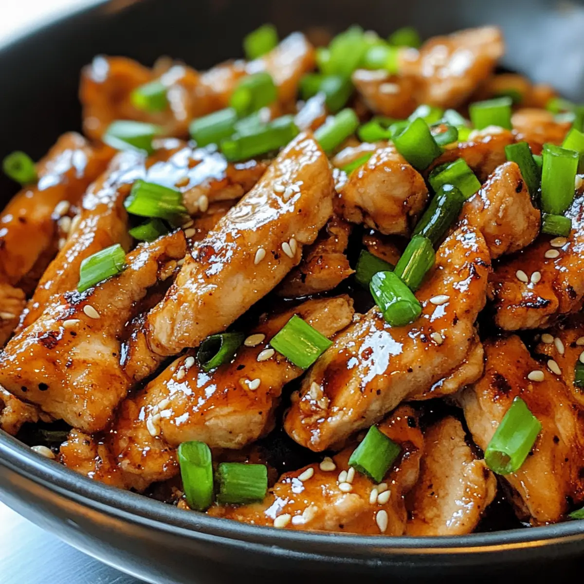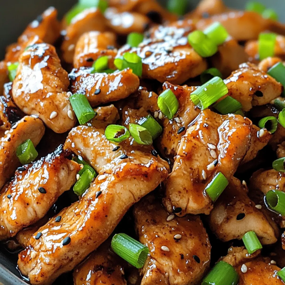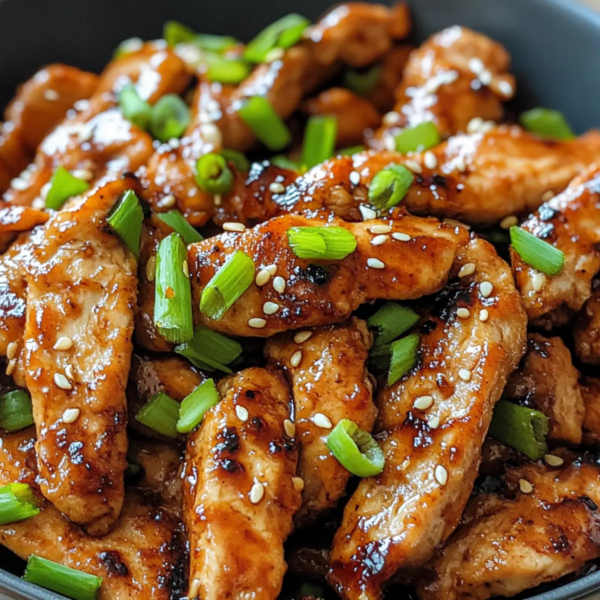 Als ich neulich in eine kleine koreanische Küche eintauchte, überwältigte mich der verführerische Duft von mariniertem Hühnchen, das sanft auf dem Grill brutzelte. Dieses Rezept für Hühnchen Bulgogi bringt genau dieses Erlebnis direkt auf unseren Tisch und ermöglicht es uns, in weniger als 30 Minuten ein köstliches, glutenfreies Gericht zu zaubern. Der Mix aus süßen und herzhaften Aromen sorgt dafür, dass es sich perfekt für ein schnelles Abendessen unter der Woche eignet – ideal für alle, die fastfood-müde sind und sich nach etwas Hausgemachtem sehnen. Das Beste daran? Du kannst die Marinade ganz nach deinen Wünschen anpassen und kreativ werden! Bist du bereit, deine Küche in eine kleine koreanische Oase zu verwandeln? Warum ist Hühnchen Bulgogi so besonders? Vielfältige Anpassungsmöglichkeiten: Dieses Rezept ermöglicht es dir, die Aromen nach deinem Geschmack zu gestalten – von mild bis scharf! Schnelle Zubereitung: In nur 27 Minuten verwandelst du Zutaten in ein köstliches Gericht, das perfekt für hektische Wochentage ist. Glutenfrei: Genieße ein authentisches koreanisches Erlebnis, ohne auf glutenhaltige Zutaten zurückzugreifen, indem du glutenfreie Sojasauce verwendest. Aroma und Geschmack: Die Kombination aus Sojasauce, Knoblauch und Ingwer verleiht dem Hühnchen eine unglaubliche Geschmacksdimension, die jeden Gaumen begeistert. Vielseitig: Ob mit Reis oder in einem frischen Salat – Hühnchen Bulgogi passt zu vielen Beilagen und sorgt für Abwechslung auf deinem Tisch! Erweitere dein Menü mit <!–220 kcal pro Portion** machen es zu einer gesunden Option am Abend. Hol dir weitere Ideen für deine Küche mit Manhattan Slow Cooker! Hühnchen Bulgogi Zutaten Hinweis: Hier sind die notwendigen Zutaten für dein köstliches Hühnchen Bulgogi, das in weniger als 30 Minuten zubereitet werden kann! Für die Marinade Sojasauce – sorgt für den unverzichtbaren Umami-Geschmack; du kannst glutenfreie Tamari verwenden. Brauner Zucker – fügt Süße hinzu und balanciert die salzigen Noten der Sojasauce; Kokoszucker ist eine gesunde Alternative. Gehackter Knoblauch – verleiht ein aromatisches Tiefe; frisch ist am besten, aber Knoblauchpulver kann schnell verwendet werden. Geriebener Ingwer – steigert die Geschmacksvielfalt und Frische; für Bequemlichkeit kann man auch gemahlenen Ingwer nutzen. Sesamöl – bringt ein nussiges Aroma und Reichhaltigkeit ein; kann durch Rapsöl ersetzt werden, falls gewünscht. Chopped Green Onions – sorgen für Frische und Farbe; kannst auch Schnittlauch verwenden, wenn nötig. Schwarzer Pfeffer & Chiliflocken (optional) – fügen Würze hinzu und verstärken den Geschmack; optional für mildere Geschmacksknospen. Für die Servieroptionen Gekochter Reis – perfekt als Beilage oder um das Hühnchen darin zu genießen. Frisches Gemüse – sorgt für zusätzliche Knackigkeit und Nährstoffe, besonders gut als Salat oder Beilage. Röstete Sesamsamen – für eine nussige Garnitur, die das Gericht aufwertet. Mit diesen Zutaten kannst du dein Hühnchen Bulgogi zubereiten und eine authentische koreanische Küche in dein Zuhause bringen! Schritt-für-Schritt-Anleitung für Hühnchen Bulgogi Step 1: Marinade vorbereiten In einer mittelgroßen Schüssel die Sojasauce, den braunen Zucker, den gehackten Knoblauch, den geriebenen Ingwer, das Sesamöl, die gehackten Frühlingszwiebeln, schwarzen Pfeffer und die optionalen Chiliflocken gut vermengen. Mit einem Schneebesen alles verrühren, bis der Zucker vollständig aufgelöst ist. Step 2: Hühnchen marinieren Das Hühnchen in dünne Streifen schneiden und mit der vorbereiteten Marinade gründlich vermengen. Achte darauf, dass das Hühnchen gleichmäßig beschichtet ist. Lass es mindestens 20 Minuten lang im Kühlschrank marinieren, um die Aromen intensiver zu machen – für noch mehr Geschmack sogar bis zu 2 Stunden. Step 3: Hühnchen braten Eine beschichtete Pfanne bei mittelhoher Hitze leicht ölen. Das marinierte Hühnchen in einer einzelnen Schicht hinzufügen und für 5-7 Minuten braten, dabei gelegentlich umrühren. Achte darauf, dass das Hühnchen durchgegart ist und eine leicht karamellisierte Oberfläche hat, was einen appetitlichen Glanz erzeugt. Step 4: Servieren Das fertige Hühnchen Bulgogi auf einen Teller geben und nach Belieben mit gerösteten Sesamsamen und zusätzlichen Frühlingszwiebeln garnieren. Es eignet sich hervorragend für einen sofortigen Genuss, besonders in Begleitung von dampfendem Reis oder in frischen Blättern von Salat. Vorbereitung für dein Hühnchen Bulgogi Hühnchen Bulgogi ist perfekt für vielbeschäftigte Küchenchefs, die Zeit sparen möchten! Du kannst die Marinade bis zu 24 Stunden im Voraus zubereiten und im Kühlschrank aufbewahren. Einfach die Zutaten – Sojasauce, braunen Zucker, Knoblauch, Ingwer, Sesamöl und Frühlingszwiebeln – gut vermischen, um die Aromen perfekt zu vereinen. Außerdem kannst du das Hühnchen bis zu 2 Stunden im Voraus marinieren, wobei eine längere Marinierzeit seine Saftigkeit erhöht und den Geschmack intensiviert. Um die Qualität zu erhalten, achte darauf, das marinierte Hühnchen eingewickelt im Kühlschrank zu lagern. Wenn du bereit bist zu kochen, erhitze eine Pfanne, füge das Hühnchen hinzu und brate es in 5-7 Minuten goldbraun. So gelingt dir ein schnelles, köstliches Gericht mit minimalem Aufwand! Expert Tipps für Hühnchen Bulgogi Marinierzeit beachten: Lasse das Hühnchen mindestens 20 Minuten marinieren, um den Geschmack optimal zu entfalten; je länger, desto besser. Fleischvariationen: Verwende Hühnchenschenkel statt Brustfilets für saftigere Ergebnisse; diese bleiben auch beim Erhitzen zart. Temperatur richtig einstellen: Achte darauf, die Pfanne gut vorzuheizen, um ein schnelles Anbraten und die gewünschte Karamellisierung zu erreichen. Rezeptanpassungen: Füge bei Bedarf mehr Chili oder koreanische Chili-Paste hinzu, um deinem Hühnchen Bulgogi mehr Schärfe zu verleihen. Aufbewah