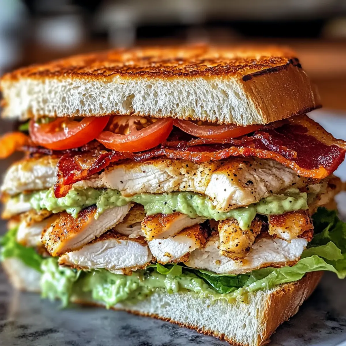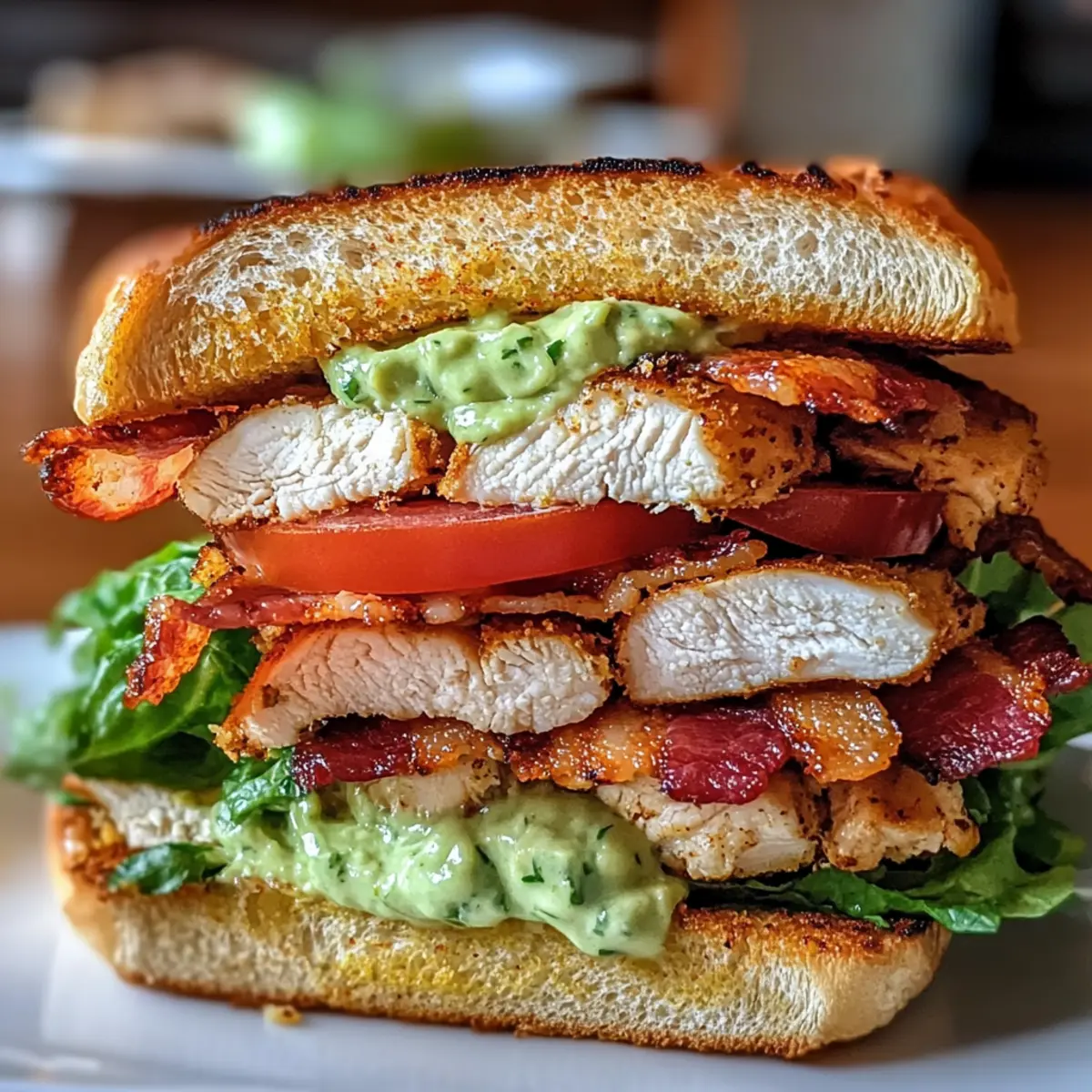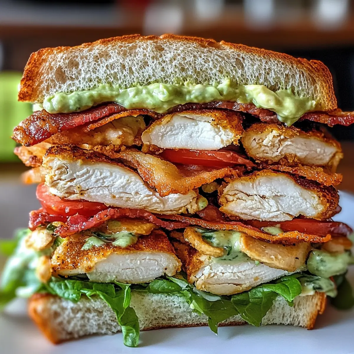 Beim ersten Bissen dieses Hühnchen-Club-Sandwiches mit knusprigem Speck und Avocado-Ranch-Aufstrich wird dein Geschmackssinn auf eine unvergessliche Reise geschickt. Saftiges Hähnchen, perfekt gewürzt, wird mit knusprigem Speck und feinem Cheddar auf knusprigem Sauerteigbrot geschichtet – ein echtes Festmahl für deine Mittagspause! Diese Kombination ist nicht nur ein echter Publikumsliebling, sondern auch schnell und einfach zuzubereiten, ideal für strapazierte Wochentage oder entspannte Wochenenden. Lass uns herausfinden, wie du dieses geschmackvolle Sandwich ganz einfach selbst kreieren kannst – bist du bereit für diese genussvolle Herausforderung? Warum wirst du dieses Rezept lieben? Einfachheit: Die Zubereitung ist unkompliziert und benötigt nur grundlegende Kochkenntnisse, sodass du im Handumdrehen ein köstliches Sandwich zaubern kannst. Intensiver Geschmack: Die Kombination aus zartem Hühnchen, knusprigem Speck und cremigem Avocado-Ranch-Aufstrich sorgt für ein Geschmackserlebnis, das deine Geschmacksknospen verzaubern wird. Zufriedenstellende Texturen: Knuspriges Sauerteigbrot, zartes Hähnchen und knackiges Gemüse bieten ein perfektes Zusammenspiel, das jeden Bissen zu einem Genuss macht. Vielseitigkeit: Du kannst das Rezept leicht anpassen, indem du verschiedene Brotsorten oder Beilagen wählst. Probiere zum Beispiel unser Hühnchen-Club-Sandwich mit knusprigem Speck mit einzigartigen Zutaten! Schnell zubereitet: Mit einer Zubereitungszeit von nur 30 Minuten ist dieses Sandwich die perfekte Lösung für ein schnelles Mittagessen oder Dinner. Beliebtheit: Egal, ob für die Familie oder Freunde, dieses Rezept wird immer gut ankommen und garantiert ein Lächeln auf die Gesichter der Gäste zaubern! Hühnchen-Club-Sandwich Zutaten Für den Aufstrich • Avocado – sorgt für eine cremige Textur und gesunde Fette; je reifer, desto besser! • Ranch-Dressing – fügt Cremigkeit und einen köstlichen, würzigen Geschmack hinzu; probiere selbstgemachtes für eine leichtere Variante. • Limettensaft – bringt Säure und hilft, die Avocado frisch zu halten; frischer Saft hat den besten Geschmack. Für das Sandwich • Hähnchenbrust – liefert Protein und Fülle; verwende für eine Variation Putenfleisch oder geräuchertes Tempeh. • Speck – sorgt für einen herzhaften Geschmack und knusprigen Biss; wechsle zu Truthahnbacon für eine fettärmere Option. • Olivenöl – zum Braten des Hähnchens, um den Geschmack zu intensivieren; auch neutrales Öl funktioniert gut. • Knoblauchpulver – intensiviert das Aroma; frischer Knoblauch kann auch verwendet werden, aber reduziere die Menge. • Zwiebelpulver – ergänzt die Gewürze für das Hähnchen; kann für einen milderen Geschmack weggelassen werden. • Räucherpaprika – verleiht eine rauchige Note; normale Paprika kann für weniger Rauch verwendet werden. • Salz und Pfeffer – essenzielle Würze; passe sie nach eigenem Geschmack an. • Sauerteigbrot – die Basis des Sandwiches, sorgt für eine tolle Textur; experimentiere mit Ciabatta oder Vollkornbrot. • Römersalat – bringt Frische und Crunch; Spinat oder gemischte Blattsalate sind ebenfalls möglich. • Tomatenscheiben – sorgen für Frische und geschmacklichen Kontrast; heirloom oder fleischige Tomaten verleihen noch mehr Geschmack. • Cheddar-Käse – ergänzt das Sandwich mit einer köstlichen, schmelzenden Schicht; auch anderer Käse kann genutzt werden. Genieße dein Hühnchen-Club-Sandwich mit knusprigem Speck und Avocado-Ranch-Aufstrich! Schritt-für-Schritt-Anleitung für das Hühnchen-Club-Sandwich mit knusprigem Speck und Avocado-Ranch-Aufstrich Step 1: Speck knusprig braten Erhitze eine Pfanne bei mittlerer Hitze und lege die Speckscheiben hinein. Brate sie für 6–8 Minuten, bis sie goldbraun und knusprig sind. Lass den gebratenen Speck anschließend auf einem Küchentuch abtropfen, um überschüssiges Fett zu entfernen. Step 2: Hähnchenbrust vorbereiten Patte die Hähnchenbrüste gründlich trocken und würze sie mit Knoblauchpulver, Zwiebelpulver, Räucherpaprika, Salz und Pfeffer. Achte darauf, dass die Gewürze gleichmäßig verteilt sind, damit das Hühnchen gut schmeckt. Step 3: Hähnchen anbraten Verwende die gleiche Pfanne, in der du den Speck gebraten hast, und füge einen Esslöffel Olivenöl hinzu. Brate das gewürzte Hähnchen bei mittlerer Hitze für 6–7 Minuten pro Seite an, bis es eine goldbraune Farbe hat und die Innentemperatur 75 °C erreicht. Step 4: Avocado-Ranch-Aufstrich zubereiten Während das Hühnchen brät, nimm eine Schüssel und zerdrücke die Avocado mit einer Gabel. Mische sie mit dem Ranch-Dressing und dem Limettensaft, bis eine cremige Konsistenz entsteht. Dieser Avocado-Ranch-Aufstrich verleiht dem Hühnchen-Club-Sandwich einen frischen Geschmack. Step 5: Sauerteigbrot rösten Röste die Sauerteigbrotscheiben in der selben Pfanne bei mittlerer Hitze, bis sie auf beiden Seiten goldbraun und knusprig sind (ca. 1–2 Minuten pro Seite). Das geröstete Brot sorgt für einen wunderbaren Crunch in deinem Sandwich. Step 6: Sandwich zusammenstellen Auf zwei Scheiben des gerösteten Sauerteigbrots verteilst du großzügig den Avocado-Ranch-Aufstrich. Schichte dann die Römersalatblätter, die geschnittene Hähnchenbrust, die knusprigen Speckstreifen und die Tomatenscheiben auf das Brot. Step 7: Finish und Servieren Lage eine Scheibe Cheddar-Käse auf die anderen Zutaten und decke das Sandwich mit den restlichen Brotscheiben ab. Presse das Sandwich sanft zusammen und schneide es in der Mitte durch. Dein köstliches Hühnchen-Club-Sandwich mit knusprigem Speck und Avocado-Ranch-Aufstrich ist nun bereit zum Genießen! Tipps für das beste Hühnchen-Club-Sandwich Richtige Temperatur: Stelle sicher, dass das Hähnchen eine Innentemperatur von 75 °C erreicht, um ein sicheres und zartes Ergebnis zu erzielen. Avocado frisch halten: Zerdrücke die Avocado kurz vor dem Servieren, um die grüne Farbe zu bewahren u