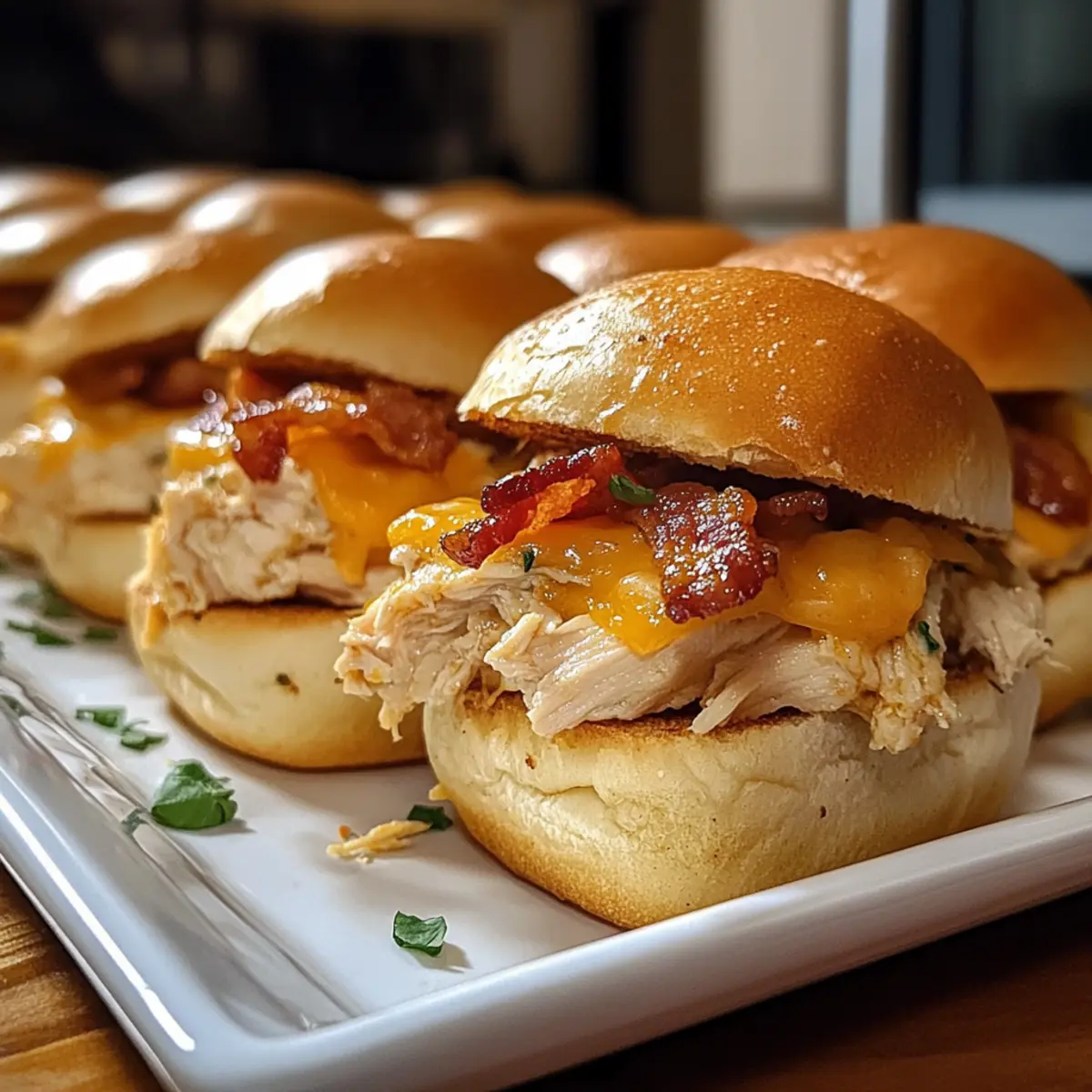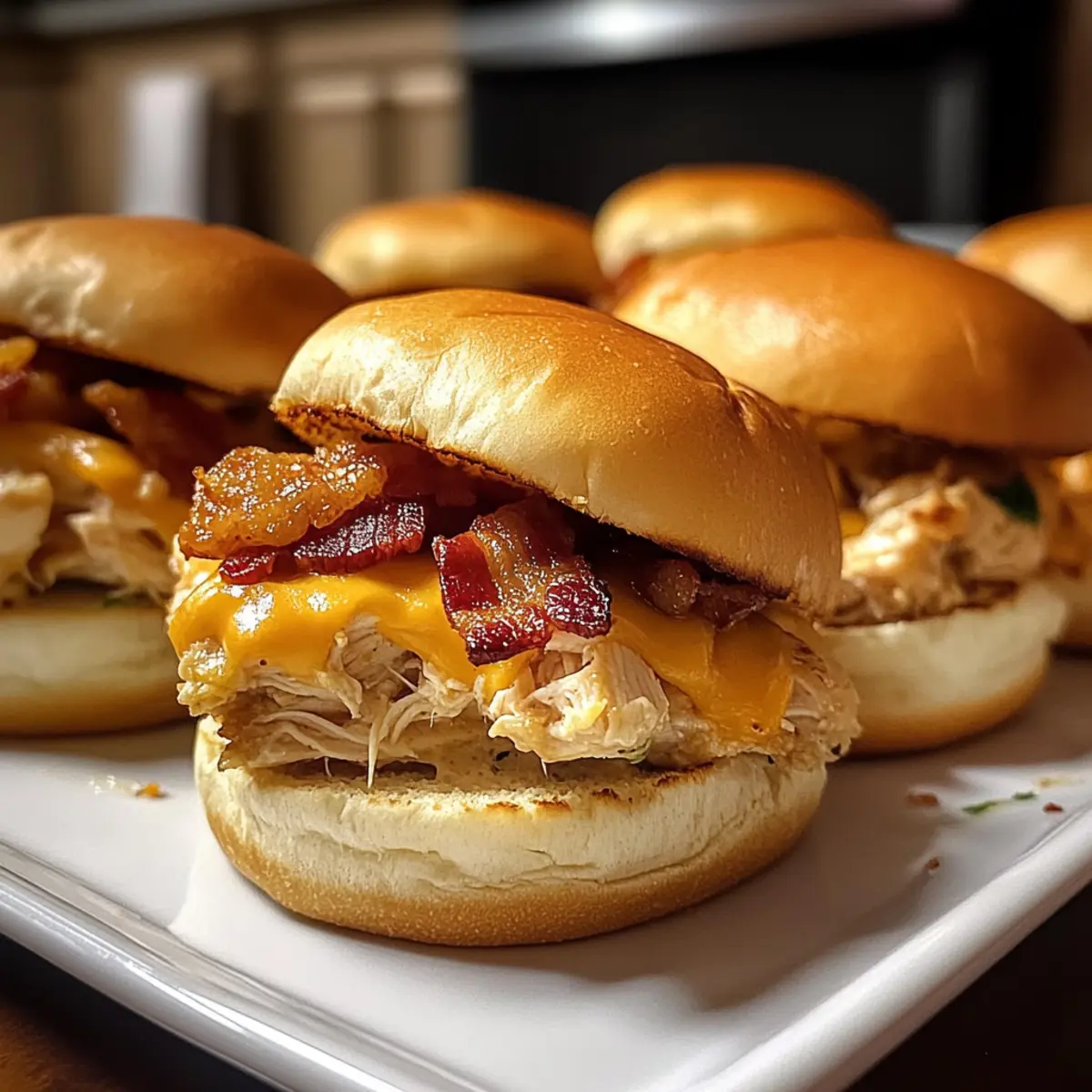 Stell dir vor, du bist auf einer Party und der verführerische Duft von frisch gebackenem Brot und herzhaftem Speck zieht durch den Raum. Genau das erwartet dich mit meinen Hühnchen Speck Ranch Sliders! Diese kleinen Häppchen sind in nur 40 Minuten zubereitet und sorgen für ein echtes Geschmackserlebnis, das deine Gäste begeistern wird. Perfekt für gesellige Abende, bieten sie eine wunderbare Kombination aus zartem, geschmorten Hühnchen, knusprigem Speck und cremigem Ranch-Dressing – alles sanft eingekuschelt in ein weiches Brötchen. Ganz gleich, ob für eine Feier oder ein schnelles Familienessen, diese Sliders sind anpassungsfähig und können mit verschiedenen Zutaten aufgepeppt werden. Neugierig, wie einfach du sie selbst zaubern kannst? Lass uns loslegen! Warum wirst du diese Sliders lieben? Einfachheit: Die Zubereitung ist kinderleicht und benötigt keine speziellen Kochkünste. In nur 40 Minuten hast du ein leckeres Gericht parat, das perfekt für spontane Gäste ist. Vielseitigkeit: Diese Hühnchen Speck Ranch Sliders können ganz nach deinem Geschmack angepasst werden. Probiere verschiedene Käsesorten oder füge frisches Gemüse wie Spinat oder Paprika hinzu! Unwiderstehlicher Geschmack: Die Kombination aus zartem Hühnchen, knusprigem Speck und cremigem Ranch-Dressing sorgt für ein Geschmackserlebnis, das deine Gäste lieben werden. Beeindruckende Portionen: Ideal für Partys oder Familiensnacks – mit nur wenigen Zutaten bereitest du viele Sliders zu und erfreust damit deine Liebsten. Du willst mehr solche köstlichen Snacks? Probiere auch unser Bacon Ranch Huehnchen für einen weiteren Genuss! Hühnchen Speck Ranch Sliders Zutaten • Diese köstlichen Häppchen erfordern nur wenige, aber geschmackvolle Zutaten! Für die Füllung Zartes Hühnchen – sorgt für die Hauptproteinquelle; Verwende Brathühnchen für eine zeitsparende Option. Speck – fügt Knusprigkeit und rauchigen Geschmack hinzu; Für eine leichtere Variante wähle Truthahnbacon. Ranch-Dressing – sorgt für Cremigkeit und einen spritzigen Kick; Selbstgemachtes Ranch hat eine noch intensivere Geschmacksnote. Cheddar-Käse – schmilzt wunderbar und bringt reichhaltigen Geschmack; Ersetze ihn durch Mozzarella oder Pepper Jack für einen anderen Akzent. Slider-Brötchen – halten alle Zutaten zusammen; Vollkorn- oder glutenfreie Brötchen sind ebenfalls eine gute Wahl. Olivenöl – zum Anbraten des Hühnchens; Kann durch Pflanzenöl ersetzt werden. Knoblauchpulver, Zwiebelpulver, Paprika, Salz, Pfeffer – Gewürze für das Hühnchen; Für einen frischeren Geschmack können auch Kräuter verwendet werden. Schritt-für-Schritt-Anleitung für Hühnchen Speck Ranch Sliders Step 1: Ofen vorheizen Heize deinen Ofen auf 175°C (350°F) vor. Dies ist wichtig, um sicherzustellen, dass die Hühnchen Speck Ranch Sliders gleichmäßig garen und der Käse beim Backen schön schmilzt. Während der Ofen aufheizt, kannst du bereits mit der Zubereitung der Füllung beginnen. Step 2: Hühnchen anbraten Erhitze etwas Olivenöl in einer großen Pfanne bei mittlerer Hitze. Füge das gewürzte Hühnchen hinzu, das mit Knoblauchpulver, Zwiebelpulver, Paprika, Salz und Pfeffer bestreut ist. Koche das Hühnchen für etwa 6-7 Minuten pro Seite, bis es durchgegart ist und eine angenehme goldene Farbe hat. Danach lasse es kurz abkühlen. Step 3: Hühnchen zerkleinern Sobald das Hühnchen etwas abgekühlt ist, zerkleinere es mit zwei Gabeln oder einem Fleischzerkleinerer in eine Schüssel. Dies sorgt für die perfekte Textur in deinen Hühnchen Speck Ranch Sliders. Mische das zerkleinerte Hühnchen anschließend gründlich mit dem Ranch-Dressing, bis alles gut vermengt ist. Step 4: Brötchen vorbereiten Nehme die Slider-Brötchen und schneide sie in der Mitte durch, sodass du zwei Hälften hast. Platziere die unteren Hälften ordentlich in einer großen Auflaufform. Dies bildet die Basis deiner leckeren Sliders und sorgt dafür, dass die Füllung gut gehalten wird. Step 5: Füllen der Brötchen Verteile die Hühnchen-Ranch-Mischung gleichmäßig über die unteren Brötchenhälften. Achte darauf, dass du jede Hälfte gut belegst, damit jeder Biss voller Geschmack ist. Lege dann die knusprigen Speckscheiben darauf und streue großzügig geriebenen Cheddar-Käse darüber. Step 6: Zusammenbauen und backen Setze die oberen Hälften der Brötchen vorsichtig auf die belegten unteren Hälften. Decke die Auflaufform mit Alufolie ab, um die Feuchtigkeit während des Backens zu bewahren. Backe die Hühnchen Speck Ranch Sliders für etwa 15 Minuten im vorgeheizten Ofen, bis sie warm und der Käse leicht geschmolzen ist. Step 7: Finalisieren Nehme die Alufolie ab und backe die Sliders für weitere 5 Minuten, bis der Käse schön geschmolzen ist und die Oberseite goldbraun wird. Dies sorgt für einen köstlichen, knusprigen Abschluss. Achte darauf, dass sie nicht zu lang im Ofen bleiben, damit die Brötchen nicht austrocknen. Step 8: Servieren und genießen Nehme die Hühnchen Speck Ranch Sliders aus dem Ofen und lasse sie ein wenig abkühlen. Schneide sie in Portionen und garniere sie bei Bedarf mit frischer Petersilie. Serviere sie warm und erfreue dich an den herzhaften Aromen, die deine Gäste begeistern werden. Hühnchen Speck Ranch Sliders Variationen Lass deiner Kreativität freien Lauf und verleihe diesen Sliders deine ganz persönliche Note! Dairy-Free: Ersetze den Käse durch pflanzliche Alternativen und verwende ein cremiges Dressing auf Basis von Cashew oder Avocado. Gluten-Free: Nutze glutenfreie Brötchen aus Nussmehl oder Gemüse für eine gesunde, schmackhafte Option. Würzig: Füge gehackte Jalapeños oder einen Spritzer scharfer Sauce hinzu, um den Sliders eine feurige Note zu verleihen. Veggie-Version: Verwandle das Rezept in ein herzhaftes Gemüsegericht, indem du das Hühnchen durch gebratenes Gemüse wie Zucchini und Paprika ersetzt. Pikante BBQ: Tausche das Ranch-Dressing gegen BBQ-Sauce aus. Das sorgt für einen h