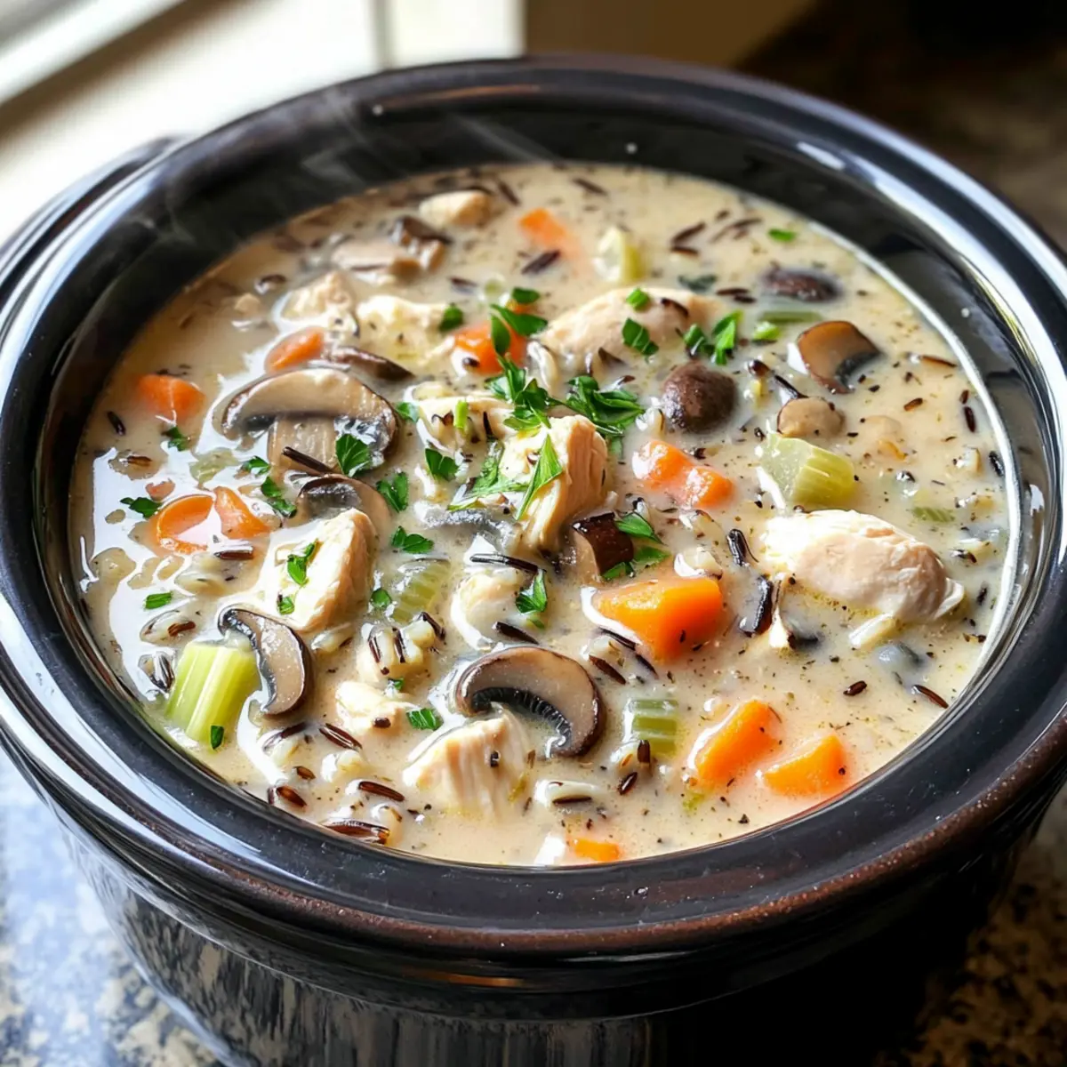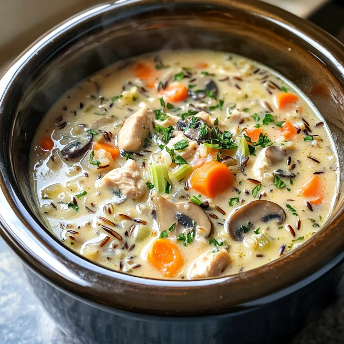 Die Küche ist für mich ein Ort voller Erinnerungen, und nichts bringt mich schneller in festliche Stimmung als der Duft von Hühnchen und Wildreis Suppe, die sanft im Slow Cooker vor sich hin köchelt. Diese cremige Köstlichkeit ist nicht nur ein wahrer Genussträger an kalten Tagen, sondern brilliert auch durch ihre mühelose Zubereitung – perfekt für stressige Wochentage! Mit saftigem Hühnerfleisch, aromatischen Pilzen und dem nussigen Biss von Wildreis wird diese Suppe zu einem Herzstück jeder Mahlzeit. Zudem eignet sie sich hervorragend zum Vorkochen und ist wirklich ein Publikumsliebling. Neugierig geworden? Lass uns gemeinsam ins Kochabenteuer eintauchen!