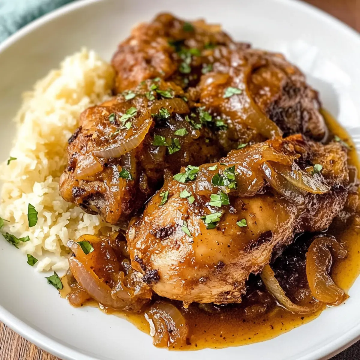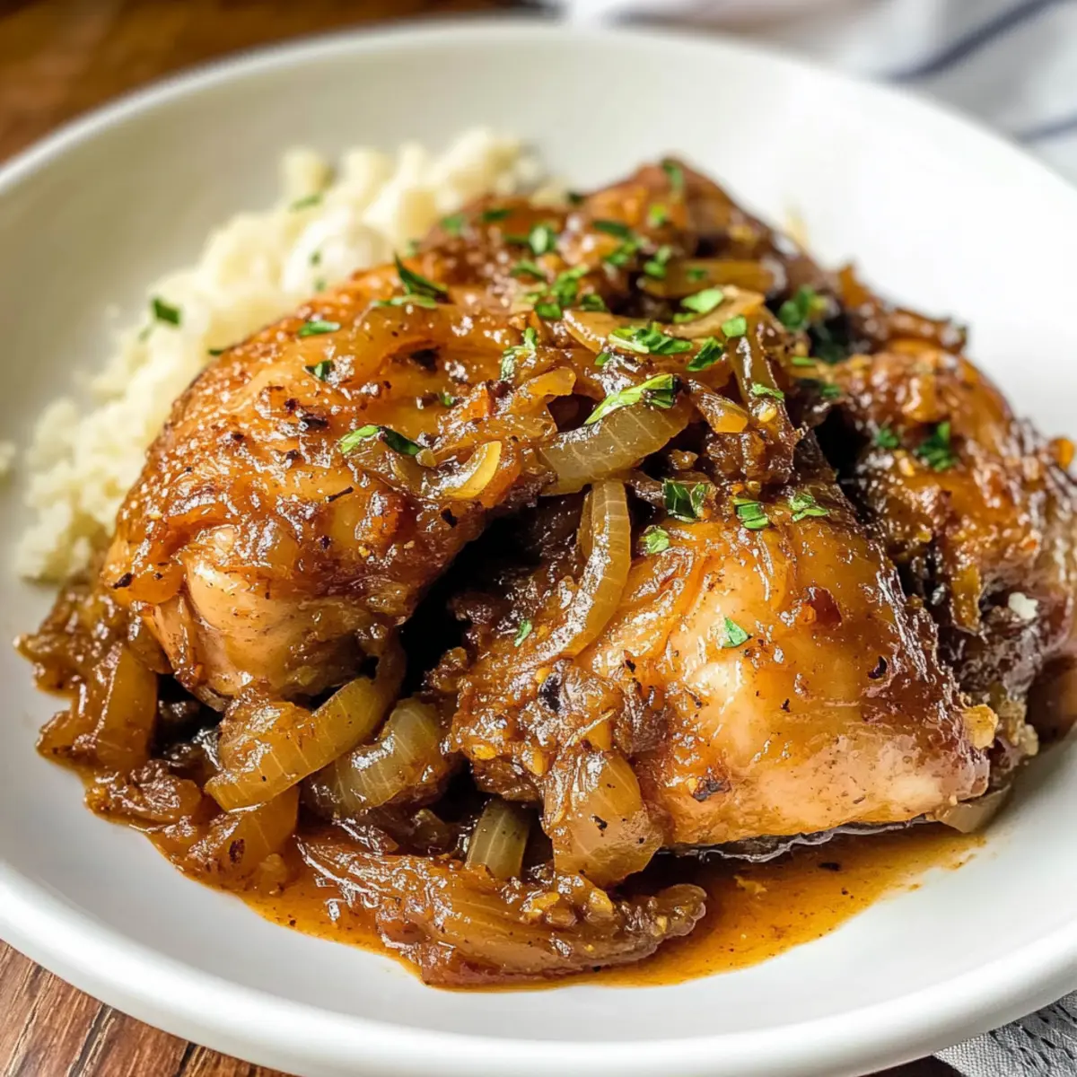 Ein kleiner Ausflug nach Westafrika gefällig? Mit Poulet Yassa, dem köstlichen senegalesischen Hühnchengericht, wird das nicht nur ein Geschmackserlebnis, sondern auch eine aufregende Reise in die Welt der Gewürze und Aromen. Dieses Rezept ist nicht nur einfach zubereitet, sondern auch kohlenhydratfreundlich – perfekt für alle, die gesunde Alternativen suchen. Die Kombination aus saftigem Hühnchen, karamellisierten Zwiebeln und einer pikanten Marinade aus Knoblauch, Zitrone und Dijon-Senf verwandelt jede Mahlzeit in ein Fest für die Sinne. Geht es dir auch so, dass das Kochen mehr ist als bloße Nahrungszubereitung? Lass uns gemeinsam in die Geheimnisse von Poulet Yassa eintauchen und die Freude am Kochen neu entdecken! Warum wirst du dieses Gericht lieben? Einzigartiger Geschmack: Poulet Yassa bringt die aufregende Aromenvielfalt Westafrikas direkt in deine Küche. Einfach zuzubereiten: Mit wenigen Zutaten und klaren Schritten gelingt dir dieses Gericht im Handumdrehen. Kohlenhydratfreundlich: Ideal für gesunde Esser, da es perfekt zu low-carb-Diäten passt. Vielseitig: Du kannst es nach Lust und Laune mit Gemüse oder anderen Proteinen wie Tofu variieren. Perfektes Comfort Food: Die Kombination aus saftigem Hühnchen und süßen, karamellisierten Zwiebeln wird jeden begeistern. Entdecke auch unsere lagest passende Beilagen, die dein Gericht abrunden! Hühnchen Yassa Zutaten • Für die Marinade: Hühnchenschenkel – Sie sind der Hauptproteingehalt; andere Teile des Hühnchens können ebenfalls verwendet werden. Knoblauchzehen – Sie verleihen dem Gericht eine aromatische Wärme; ersetze sie alternativ durch Knoblauchpulver. Zitronensaft – Fügt Frische und Säure hinzu; frischer Saft sorgt für das beste Aroma. Dijon-Senf – Für eine pikante Note; du kannst auch Vollkornsenf oder scharfen braunen Senf verwenden. Cayennepfeffer – Für die gewünschte Schärfe; passe die Menge nach deinem Geschmack an oder verwende Chiliflocken. • Für das Gericht: Olivenöl – Zum Braten und für zusätzlichen Geschmack; kann durch Raps- oder Pflanzenöl ersetzt werden. Große Zwiebeln – Fördern die Süße, wenn sie karamellisiert werden; alternative Variante sind Schalotten für einen milderen Geschmack. Hühnchenbrühe – Sorgt für Feuchtigkeit und Reichtum; Gemüsebrühe ist eine gute vegetarische Alternative. Räucherpaprika – Verleiht ein rauchiges Aroma; süßes Paprikapulver ist ebenfalls eine Option. Bouillonpulver – Verstärkt den Geschmack; kann weggelassen werden, um den Natriumgehalt zu verringern. Salz – Unverzichtbar für die Würze; nach Geschmack anpassen. Entdecke die Aromenvielfalt mit diesem Hühnchen Yassa Rezept und lass dich von der Einfachheit und dem einzigartigen Geschmack begeistern! Schritt-für-Schritt-Anleitung für Hühnchen Yassa Step 1: Hähnchen vorbereiten Wasche die Hühnchenschenkel gründlich und tupfe sie mit einem Küchentuch trocken. Schneide die großen Zwiebeln in dünne Ringe und hacke die Knoblauchzehen fein. Diese Vorbereitungen sind wichtig, um die Geschmäcker gleichmäßig zu verteilen, wenn du das Hühnchen Yassa zubereitest. Step 2: Marinieren In einer großen Schüssel das Hühnchen, die Zwiebeln, den Knoblauch, den Zitronensaft, den Dijon-Senf und die Gewürze vermengen. Stelle sicher, dass das Hühnchen gut mit der Marinade bedeckt ist. Decke die Schüssel ab und lasse das Ganze für mindestens 2 Stunden oder über Nacht im Kühlschrank ziehen, damit die Aromen gut einziehen können. Step 3: Hühnchen anbraten Nehme das marinierte Hühnchen aus der Schüssel und stelle die Marinade samt den Zwiebeln beiseite. Erhitze etwas Olivenöl in einer großen Pfanne bei mittlerer bis hoher Hitze. Brate die Hühnchenschenkel für etwa 4-5 Minuten auf jeder Seite an, bis sie schön goldbraun sind. Dies sorgt dafür, dass das Hühnchen eine köstliche Kruste erhält. Step 4: Zwiebeln karamellisieren Nehme das angebratene Hühnchen aus der Pfanne und lege es auf einen Teller. Füge die Zwiebeln aus der Marinade in die gleiche Pfanne hinzu und koche sie für etwa 5 Minuten, bis sie weich und leicht karamellisiert sind. Dies wird dem Gericht eine wunderbare Süße verleihen, die das Hühnchen perfekt ergänzt. Step 5: Hühnchen und Brühe hinzufügen Lege das angebratene Hühnchen zurück in die Pfanne zu den karamellisierten Zwiebeln. Gieße die Hühnchenbrühe dazu und bringe alles zum Kochen. Reduziere die Hitze auf mittlere Stufe und lasse das Hühnchen für 15-20 Minuten köcheln, bis es zart ist und die Säfte klar sind. Step 6: Abschmecken und servieren Überprüfe die Würze und passe das Salz nach Bedarf an. Wenn alles gut abgeschmeckt ist, kannst du dein Hühnchen Yassa nun servieren. Genieße das Gericht heiß, idealerweise mit gedämpftem Reis oder Blumenkohlreis, um das kohlenhydratarme Erlebnis abzurunden. Aufbewahrungstipps für Hühnchen Yassa Kühlschrank: Bewahre das Hühnchen Yassa in einem luftdichten Behälter auf, wo es bis zu 3 Tage frisch bleibt. Stelle sicher, dass es gut abgekühlt ist, bevor du es verschließt. Gefrierer: Du kannst Hühnchen Yassa bis zu 6 Monate in einem luftdichten Behälter einfrieren. Achte darauf, dass das Gericht vollständig abgekühlt ist, um Gefrierbrand zu vermeiden. Wiedererwärmen: Zum Aufwärmen des Hühnchen Yassa gib einen Schuss Hühnchenbrühe oder Wasser in die Pfanne, um sicherzustellen, dass es nicht austrocknet. Erhitze es auf mittlerer Hitze, bis es durchgewärmt ist. Servieren: Das Hühnchen Yassa ist am besten, wenn es frisch serviert wird, aber es bleibt auch nach dem Aufbewahren im Kühlschrank oder Gefrierer köstlich und geschmackvoll. Expertentipps für Hühnchen Yassa Hühnchen richtig anbraten: Achte darauf, das Hühnchen goldbraun zu braten, um die Aromen zu intensivieren und eine schöne Kruste zu erreichen. Frische Zutaten verwenden: Verwende frischen Zitronensaft für den besten Geschmack. Abgefüllter Saft kann das Aroma des Gerichts beeinträchtigen. Kara