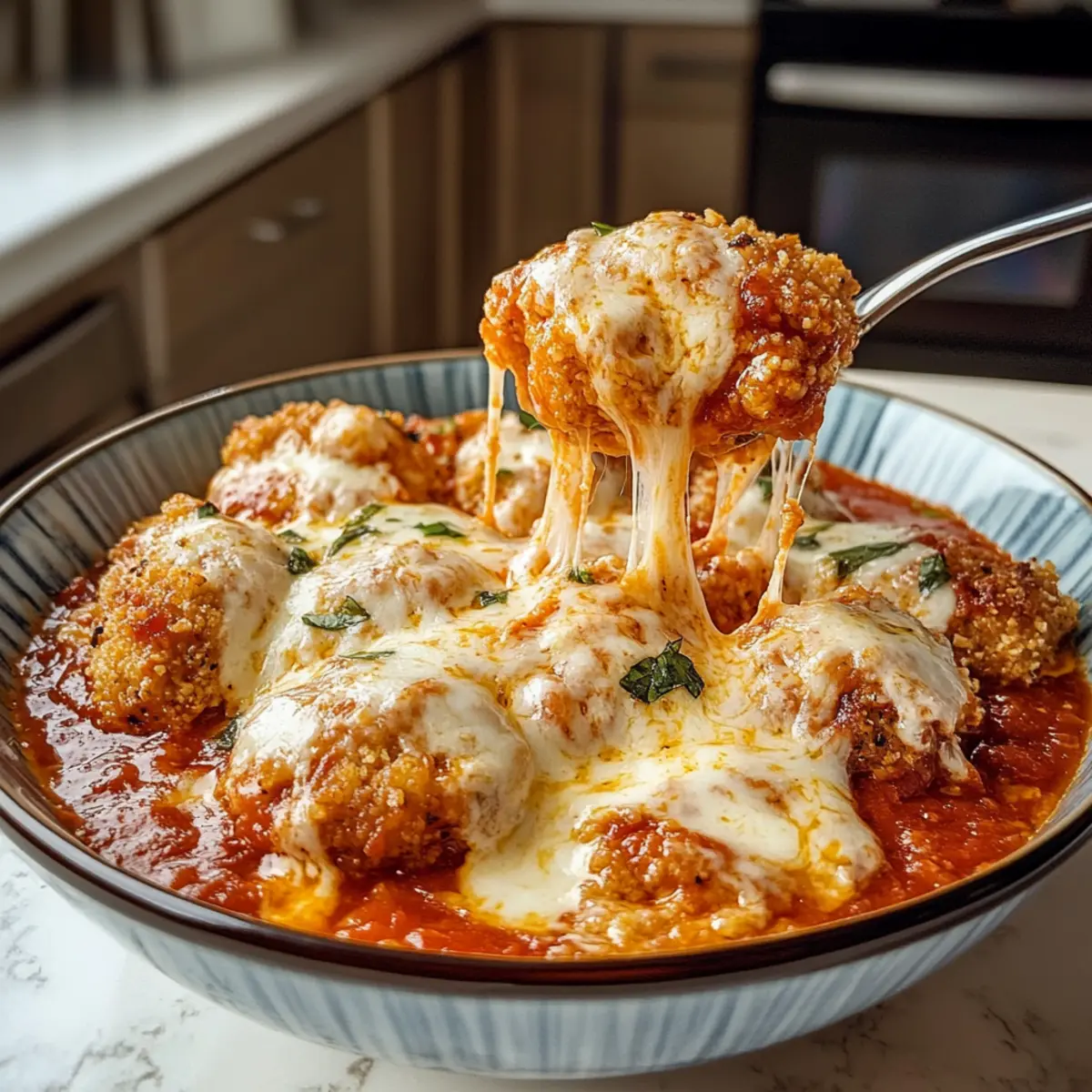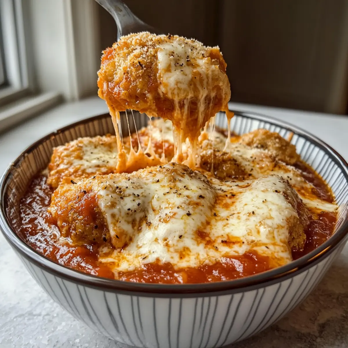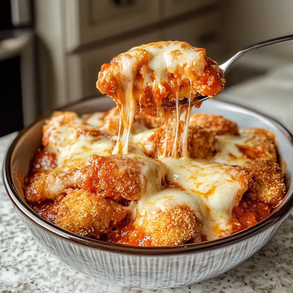 Hast du schon einmal darüber nachgedacht, wie du deinen Lieblingsklassiker in etwas Gesundes verwandeln kannst? Diese Hüttenkäse Hühnchen Parm Schüssel ist genau das, was du brauchst! Mit zarten Chicken Nuggets, cremigem Hüttenkäse und einer spritzigen Marinara-Soße bietet dieses proteinreiche Gericht nicht nur einen köstlichen Geschmack, sondern ist auch perfekt für hektische Wochentage. Das Beste daran? Es lässt sich beliebig anpassen! Egal, ob du es über Nudeln oder Reis servierst oder mit Gemüse aufpeppen möchtest – diese Schüssel ist ein echter Alleskönner. Möchtest du herausfinden, wie einfach es ist, sich dieses gesunde Comfort Food zuzubereiten? Lass uns loslegen! Warum wirst du dieses Rezept lieben? Einfachheit: Die Zubereitung der Hüttenkäse Hühnchen Parm Schüssel ist kinderleicht und benötigt nur ein paar Minuten. Perfekt für vielbeschäftigte Abende! Vielseitigkeit: Du kannst die Zutaten je nach deinem Geschmack anpassen – vielleicht mit frischem Gemüse oder sogar Quinoa für eine gesunde Abwandlung? Proteinreich: Dieses Gericht steckt voller Protein und macht dich satt, ohne schwer im Magen zu liegen. Ideal für gesundheitsbewusste Genießer! Familienfreundlich: Mit seinem köstlichen Geschmack wird die ganze Familie um Nachschlag bitten. Schau dir auch unser Minestrone Suppe Rezept an, das daneben hervorragend passt! Göttlicher Geschmack: Die Kombination aus cremigem Hüttenkäse, würziger Marinara und geschmolzenem Mozzarella sorgt für ein unvergessliches Geschmackserlebnis. Probier dazu auch unsere Zitronen Brownies Rezept als süßes Finale! Hüttenkäse Hühnchen Parm Schüssel Zutaten • Hier sind die wesentlichen Zutaten für deine köstliche Hüttenkäse Hühnchen Parm Schüssel: Für die Basis Hüttenkäse – sorgt für Cremigkeit und eine proteinreiche Basis. Vollfett wird empfohlen, da es den besten Geschmack bietet. Marinara-Soße – fügt einen spritzigen Geschmack hinzu. Du kannst auch eine fertige Soße verwenden, um Zeit zu sparen. Chicken Nuggets – die Hauptquelle für Protein. Wähle luftgebackene Nuggets für eine leichtere und knusprige Variante. Für das Topping Mozzarella-Käse – schmilzt hervorragend und sorgt für die perfekte Käsemäßigkeit. Frischer Käse bringt das beste Aroma. Für die Würze Italienische Gewürze – verstärken die Aromen. Die Menge kannst du je nach Geschmack anpassen. Knoblauchpulver – sorgt für zusätzliche Tiefe; verwende es zusammen mit den italienischen Gewürzen, um den Hüttenkäse zu würzen. Wenn du Lust auf eine gesunde und sättigende Mahlzeit hast, ist diese Hüttenkäse Hühnchen Parm Schüssel genau das Richtige für dich! Schritt-für-Schritt-Anleitung für die Hüttenkäse Hühnchen Parm Schüssel Schritt 1: Hüttenkäse-Mischung vorbereiten In einer mikrowellenfesten Schüssel vermengst du den Hüttenkäse, die Marinara-Soße, die Hälfte des Mozzarella-Käses, italienische Gewürze und Knoblauchpulver. Achte darauf, die Zutaten gut zu vermischen, sodass eine gleichmäßige Masse entsteht. Stelle die Schüssel in die Mikrowelle und erhitze sie auf hoher Stufe für eine Minute. Rühre die Mischung nach der Hälfte der Zeit um, bis sie gleichmäßig warm ist. Schritt 2: Chicken Nuggets vorbereiten Nehme die luftgebackenen Chicken Nuggets aus dem Ofen oder der Fritteuse und schneide sie in kleinere Stücke. Dies erleichtert es, die Nuggets gleichmäßig in der Hüttenkäse-Mischung zu verteilen. Achte darauf, dass die Nuggets schön goldbraun und knusprig sind, bevor du mit dem nächsten Schritt fortfährst. Schritt 3: Chicken Nuggets in die Mischung integrieren Füge die geschnittenen Chicken Nuggets in die vorbereitete Hüttenkäse-Mischung. Rühre alles gut um, damit die Nuggets gleichmäßig mit der cremigen Masse umhüllt sind. Stelle die Mischung wieder in die Mikrowelle und erhitze sie für weitere 30 Sekunden, bis der Käse geschmolzen und alles gut durchwärmt ist. Schritt 4: Anrichten und garnieren Nehme die Schüssel aus der Mikrowelle und gönne dir einen Blick auf die geschmolzene, cremige Köstlichkeit. Serviere die Hüttenkäse Hühnchen Parm Schüssel sofort in einer großen Schale. Garniere die Portion mit dem restlichen Mozzarella und, wenn gewünscht, mit frischen Kräutern für einen zusätzlichen Geschmackskick. Schritt 5: Genießen Jetzt ist es Zeit, deine Hüttenkäse Hühnchen Parm Schüssel zu genießen! Diese warme, herzliche Mahlzeit sorgt für ein tolles Geschmackserlebnis und ist perfekt für einen gesunden Abend. Denk daran, deine Schüssel nach Belieben mit Beilagen zu ergänzen, um noch mehr Geschmack und Nährstoffe hinzuzufügen. Hüttenkäse Hühnchen Parm Schüssel Variationen Lass deiner Kreativität freien Lauf und passe dieses Rezept ganz nach deinem Geschmack an! Gegrilltes Hähnchen: Tausche die Chicken Nuggets gegen gegrillte Hähnchenbrust aus. Dies reduziert den Verarbeitungsgrad und sorgt für einen gesunden Genuss. Zucchini-Nudeln: Verwende anstelle von Pasta oder Reis Zucchini-Nudeln für eine kohlenhydratarme Variante. Diese frischen Nudeln fügen ein leichtes, knackiges Element hinzu. Quinoa: Ersetze die klassische Beilage durch proteinreiche Quinoa. Diese Option macht die Schüssel noch sättigender und nahrhafter. Spinat und Paprika: Füge eine Handvoll frischen Spinat oder gewürfelte Paprika hinzu, um mehr Vitamine und Farbe in dein Gericht zu bringen. Es macht nicht nur gesund, sondern sieht auch toll aus! Scharfe Note: Gib einige Chiliflocken oder etwas scharfe Sauce hinzu, um deiner Schüssel einen feurigen Kick zu verleihen. Für alle, die es würziger mögen! Käsemix: Statt nur Mozzarella kannst du auch eine Kombination aus verschiedenen Käsesorten verwenden, wie Cheddar oder Parmesan, für einen intensiveren Geschmack. Darüber hinaus verleiht es der Schüssel mehr Vielfalt. Nussige Note: Bestreue deine Schüssel mit gerösteten Nüssen oder Samen, um eine knusprige Textur und zusätzliche Nährstoffe zu erhalte