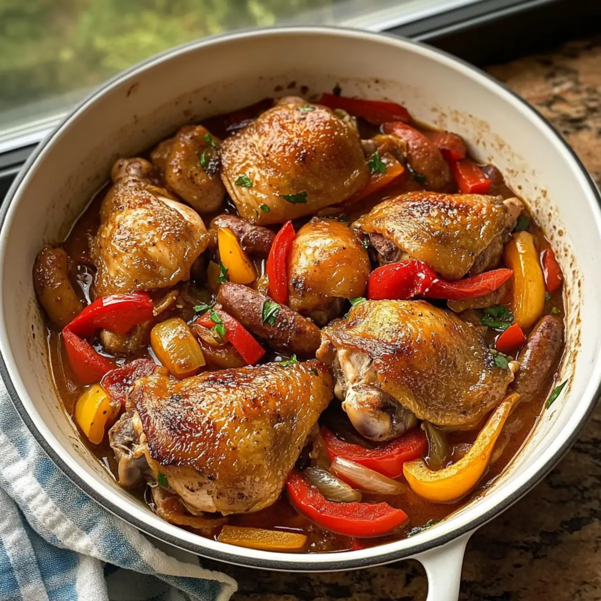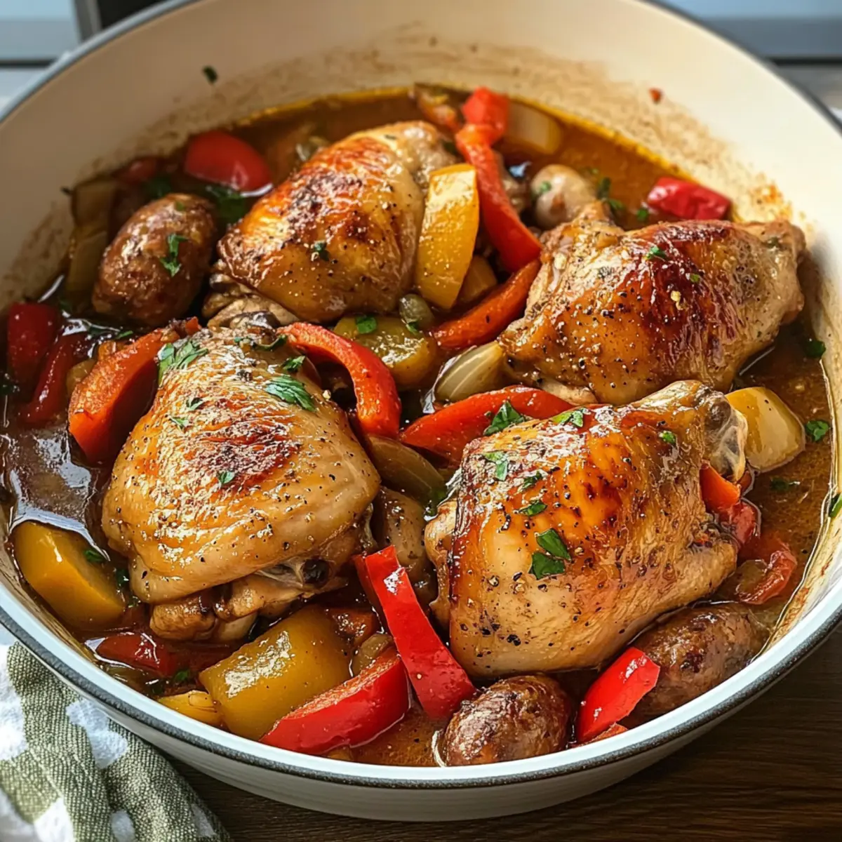 Oh, die Erinnerungen an meine letzte italienische Reise! Das Aroma von frisch gebratenem Hühnchen, vermischt mit der Intensität von würziger Wurst und einer Prise Essig, schwebte durch die Straßen. Heute lade ich euch dazu ein, diesen Genuss in eurem eigenen Zuhause mit meinem Rezept für Hühnchen Scarpariello nachzuempfinden. Diese Mischung aus zarten Hühnchenschenkeln und herzhaften Würstchen, die in einem würzigen, leicht säuerlichen Sud geschmort werden, ist nicht nur eine wahre Geschmacksexplosion, sondern auch schnell und einfach zuzubereiten. Perfekt für ein entspanntes Abendessen unter der Woche oder für besondere Anlässe, bei denen ihr eure Gäste beeindrucken möchtet. Seid ihr bereit, eure Küche in ein italienisches Bistro zu verwandeln? Warum ist Hühnchen Scarpariello so besonders? Unwiderstehlicher Geschmack: Die Kombination aus würziger Wurst und zartem Hühnchen bringt ein Geschmackserlebnis auf den Tisch, das nicht nur sättigt, sondern auch begeistert. Einfache Zubereitung: Mit wenigen, unkomplizierten Schritten verwandelt ihr einfache Zutaten in ein raffiniertes Gericht – perfekt für Kochanfänger und Profis. Vielseitigkeit: Ihr könnt das Rezept je nach Vorlieben anpassen und zum Beispiel Gemüse oder Gewürze hinzufügen, die ihr liebt. Zeitersparnis: Im Handumdrehen seid ihr bereit, während die Aromen in der Pfanne harmonieren – perfekt für geschäftige Wochentage! Familienfreundlich: Dieses Gericht wird bei großen und kleinen Feinschmeckern gleichermaßen gut ankommen. Ein echtes Highlight für gemeinsame Dinnerabende! Entdeckt noch mehr aufregende Rezepte in unserer Rezeptsammlung für einfache Hähnchengerichte. Hühnchen Scarpariello Zutaten Für das Hühnchen • Hühnchenschenkel mit Haut und Knochen – Hauptquelle für Geschmack und Saftigkeit; Immer Hühnchenschenkel mit Knochen verwenden für den besten Geschmack. • Koscheres Salz – Zum Würzen, hebt die Aromen hervor; Je nach Geschmack anpassen. • Frisch gemahlener schwarzer Pfeffer – Fügt Wärme hinzu; Frisch gemahlen für besten Geschmack verwenden. Für die Pfanne • Extra-natives Olivenöl – Zum Anbraten; Kann bei Bedarf durch ein anderes Öl ersetzt werden. • Italienische Wurst (scharf oder mild) – Gibt Würze und Herzhaftigkeit; Wählt je nach Vorliebe für Schärfe. • Große gelbe Zwiebel – Aromatische Basis; Schalotten können eine gute Alternative sein. • Rote Paprika – Für Süße und Farbe; Kann durch grüne Paprika ersetzt werden, wenn ihr es etwas schärfer mögt. • Knoblauchzehen – Für zusätzliche Geschmackstiefe; Gehackter Knoblauch erhält die Geschmacksintensität. Für die Flüssigkeit • Trocken Weißwein – Zum Ablöschen und bringt Säure; Kann durch Hühnerbrühe für eine alkoholfreie Variante ersetzt werden. • Eingelegte Kirschen oder Pepperoncini – Steigerung der Würze; Je nach Vorliebe anpassen. • Niedrig natriumhaltige Hühnerbrühe – Fügt Kochflüssigkeit hinzu; Selbstgemachte Brühe für besten Geschmack verwenden. • Weißweinessig – Für zusätzliche Säure; Apfelessig kann ebenfalls verwendet werden. • Getrockneter Oregano – Aromatischer Akzent; Frischer Oregano kann verwendet werden, aber verdoppelt die Menge. Küchenhelfer • Fleischthermometer – Stellt sicher, dass das Hühnchen bei 74°C gekocht ist; Vermeidet überkochtes, trockenes Fleisch. Dieses Rezept für Hühnchen Scarpariello wird euren Gaumen begeistern und ist so einfach, dass es regelmäßig auf euren Tisch kommen kann! Schritt-für-Schritt-Anleitung für Hühnchen Scarpariello Step 1: Hühnchen vorbereiten Würzt die Hühnchenschenkel großzügig mit koscherem Salz und frisch gemahlenem schwarzem Pfeffer. Erhitzt das extra-native Olivenöl in einer großen Pfanne bei mittlerer bis hoher Hitze. Sear die Hühnchenschenkel für ca. 4-5 Minuten pro Seite, bis sie eine goldbraune Kruste haben. Entnehmt das Hühnchen aus der Pfanne und stellt es beiseite. Step 2: Würstchen und Gemüse anbraten In der gleichen Pfanne gebt ihr die italienische Wurst und bratet sie an, bis sie braun wird, etwa 5-7 Minuten. Fügt die gehackte Zwiebel und die rote Paprika hinzu und kocht sie, bis sie weich sind, in etwa 4-5 Minuten. Rührt gelegentlich um, damit nichts anbrennt und sich die Aromen entfalten können. Step 3: Knoblauch hinzufügen Mistet die Hitze etwas ab und gebt den gehackten Knoblauch in die Pfanne. Bratet alles für eine weitere Minute an, bis der Knoblauch duftet, aber nicht verbrannt ist. Dies fügt der Mischung eine köstliche Tiefe hinzu und bereitet den Weg für das Hühnchen Scarpariello. Step 4: Ablöschen der Pfanne Löscht die Pfanne nun mit trockenen Weißwein ab und kratzt mit einem Holzlöffel über den Boden, um die angebrannten Stücke zu lösen. Lasst den Wein für 2-3 Minuten köcheln, bis sich die Flüssigkeit um die Hälfte reduziert hat. Dieses Deglazieren intensiviert den Geschmack und bringt alles zusammen. Step 5: Hühnchen und Flüssigkeiten hinzufügen Legt die angebratenen Hühnchenschenkel wieder in die Pfanne. Gebt die eingelegten Kirschen oder Pepperoncini, die niedrignatriumhaltige Hühnerbrühe, den Weißweinessig und den getrockneten Oregano hinzu. Bringt die Mischung zum Simmern und stellt sicher, dass alles gut vermischt ist, damit sich die Aromen entfalten können. Step 6: Schmoren und servieren Deckt die Pfanne mit einem Deckel ab und lasst das Hühnchen auf niedriger Hitze für 45-60 Minuten schmoren, bis das Fleisch zart und durchgegart ist. Mit einem Fleischthermometer könnt ihr überprüfen, ob das Hühnchen eine Temperatur von 74°C erreicht hat. Serviert das Hühnchen Scarpariello warm und genießt das herzhaft-würzige Aroma! Vorbereitung für Hühnchen Scarpariello Hühnchen Scarpariello ist ideal für die Vorbereitung im Voraus und spart euch wertvolle Zeit während einer geschäftigen Woche! Ihr könnt die Hühnchenschenkel bis zu 24 Stunden vorher würzen und im Kühlschrank marinieren; das inten