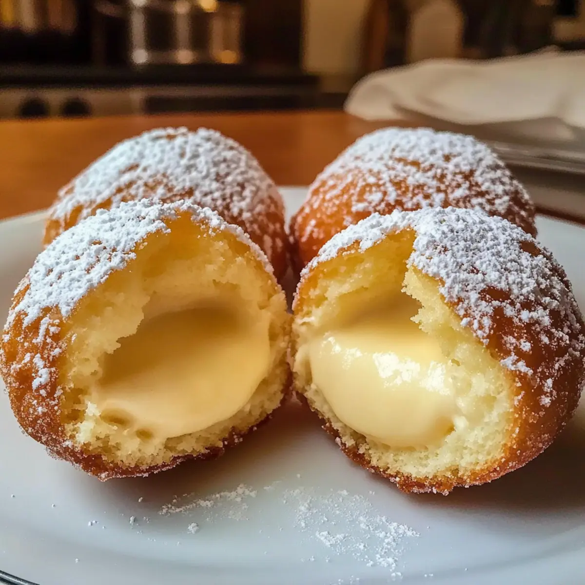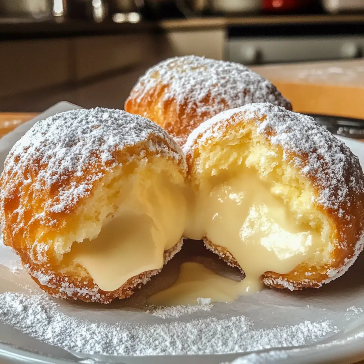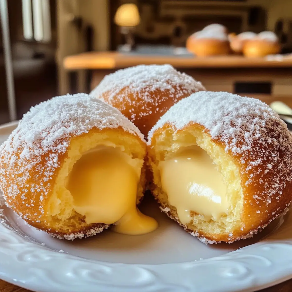 Als ich zum ersten Mal einen Biss in diese italienischen Cremebomben nahm, war es, als würde ich in einem kleinen Café in Florenz sitzen. Bomboloni alla Crema – so heißen sie – sind nicht nur einfache Gebäckstückchen, sondern kleine Glücksmomente, die jedem Tag einen Hauch von Dolce Vita verleihen. Diese weichen, zuckergestreuten Leckereien sind mit einer himmlischen Vanillecreme gefüllt und eignen sich hervorragend als süßer Snack oder zum Frühstück. Sie sind schnell zubereitet und zaubern ein Stück italienische Tradition auf Ihren Tisch. Wer könnte dazu schon Nein sagen? Sind Sie bereit, sich in die Welt der Bomboloni zu stürzen und herauszufinden, wie Sie diese köstlichen kleinen Kunstwerke selbst backen können? Warum sind diese Bomboloni einzigartig? Unwiderstehlicher Geschmack: Jede Bombolone explodiert förmlich vor köstlicher Vanillecreme, die sich harmonisch mit dem weichen Teig verbindet. Vielseitige Varianten: Ob klassische Vanille, leckere Schokolade oder erfrischende Zitrone – diese italienischen Cremebomben lassen sich nach Lust und Laune anpassen. Einfache Zubereitung: Selbst wenn Sie kein Meisterbäcker sind, können Sie mit diesen Schritten erstaunliche Ergebnisse erzielen. Perfekt für jeden Anlass: Ob zum Frühstück, als Nachmittagsleckerei oder bei Feierlichkeiten – sie bringen das italienische Flair direkt zu Ihnen nach Hause. Genießen Sie auch andere italienische Köstlichkeiten wie Pad Kra Pao oder Cremiges Thailaendisches Kokosnuss. Damit wird Ihr kulinarisches Erlebnis rundum perfekt! Italienische Cremebomben Zutaten • Für den Teig Weizenmehl – sorgt für die Struktur und Textur; Sie können auch Ersatzmehl verwenden, um eine luftigere Konsistenz zu erzielen. Prise Salz – verstärkt den Geschmack und sorgt für die richtige Balance der Süße. Zucker – verleiht dem Teig und der Creme Süße; kann durch alternative Süßstoffe ersetzt werden. Vollmilch – aktiviert die Hefe und macht den Teig reichhaltiger; nutzen Sie Mandelmilch für eine milchfreie Variante. Frische Hefe – dient als Treibmittel für das Aufgehen des Teiges; ersetzen Sie sie durch 1 Päckchen Trockenhefe. Butter – sorgt für einen reichhaltigen Geschmack und eine goldene Kruste; Margarine kann ebenfalls verwendet werden. Große Eier – tragen zur Feuchtigkeit und Struktur des Teigs bei; für eine vegane Version können Sie geschrotete Leinsamen mit Wasser verwenden. Pflanzenöl – wird zum Frittieren verwendet; Erdnuss- oder Rapsöl sind gute Alternativen. • Für die Füllung Vollmilch (für die Creme) – essenziell, um die Füllung cremig zu machen; Optionen für milchfreie Alternativen sind verfügbar. Eigelb – sorgt für eine reichhaltige Creme; kann nicht ohne Veränderung der Textur ersetzt werden. Maisstärke – verdickt die Creme; Pfeilwurzpulver eignet sich ebenfalls als Ersatz. Vanilleextrakt – verleiht der Creme Aroma; Vanilleschotenpaste ist eine hochwertige Option für intensiveren Geschmack. • Zum Garnieren Puderzucker – wird zum Bestäuben verwendet; kann durch Kokoszucker ersetzt werden, um eine andere Ästhetik zu erzielen. Diese Italienischen Cremebomben werden Ihren Gaumen verwöhnen und sind ein wahrer Genuss! Step-by-Step Instructions for Italienische Cremebomben Step 1: Teig vorbereiten Mischen Sie in einer großen Schüssel das Weizenmehl, die Prise Salz und den Zucker. Formen Sie in der Mitte eine Mulde und geben Sie die warme Vollmilch und die frische Hefe hinein. Lassen Sie die Hefe etwas aktivieren, bevor Sie die Butter und die großen Eier hinzufügen. Kneten Sie den Teig etwa 8-10 Minuten lang, bis er glatt und elastisch ist. Step 2: Erste Gehzeit Legen Sie den Teig in eine leicht geölte Schüssel und decken Sie ihn mit einem sauberen Küchentuch ab. Stellen Sie die Schüssel an einen warmen Ort und lassen Sie den Teig etwa 90 Minuten lang aufgehen, bis er sich deutlich vergrößert hat und sein Volumen ungefähr verdoppelt hat. Step 3: Bomboloni formen Nach der Gehzeit stürzen Sie den luftigen Teig auf eine leicht bemehlte Arbeitsfläche und rollen Sie ihn etwa einen halben Zentimeter dick aus. Schneiden Sie mit einem runden Ausstecher oder einem Glas Kreise aus dem Teig und lassen Sie diese für etwa 10 Minuten ruhen, damit sie sich entspannen. Step 4: Bomboloni frittieren Erhitzen Sie das Pflanzenöl in einem großen Topf auf 175 °C (350 °F) und testen Sie die Temperatur mit einem kleinen Teigstück. Frittieren Sie die Kreise in Portionen, bis sie goldbraun sind und sich zu schönen Kugeln aufblähen. Nehmen Sie sie mit einem Schaumlöffel heraus und lassen Sie sie auf Küchenpapier abtropfen. Step 5: Cremefüllung zubereiten In einem kleinen Topf erhitzen Sie die Vollmilch, während Sie in einer Schüssel die Eigelbe, den Zucker und die Maisstärke gut verquirlen. Fügen Sie langsam die heiße Milch hinzu und verrühren Sie alles gut. Kochen Sie die Mischung bei mittlerer Hitze unter ständigem Rühren, bis sie eindickt, und nehmen Sie sie dann vom Herd. Step 6: Füllen und servieren Lassen Sie die Creme vollständig abkühlen, bevor Sie die frisch gebratenen Bomboloni mit einer Spritztülle füllen. Stauben Sie die gefüllten Italienischen Cremebomben großzügig mit Puderzucker und servieren Sie sie warm. Genießen Sie den perfekten Biss, der Tradition und Genuss vereint! Expertentipps für Italienische Cremebomben • Temperaturüberwachung: Achten Sie genau auf die Frittieröltemperatur von 175 °C; zu heißes Öl lässt die Bomboloni außen dunkel und innen roh werden. • Teigruhe: Lassen Sie den geschnittenen Teig mindestens 10 Minuten ruhen, um die glutenhaltigen Strukturen zu entspannen – so werden die Bomboloni besonders luftig. • Cremefüllen: Lassen Sie die Creme vollständig abkühlen, bevor Sie die Italienischen Cremebomben füllen, um ein sauberes und einfaches Befüllen zu gewährleisten. • Frittiermenge: Überladen Sie den Topf beim Frittieren nicht; arbeiten Sie in kleinen Portionen, 