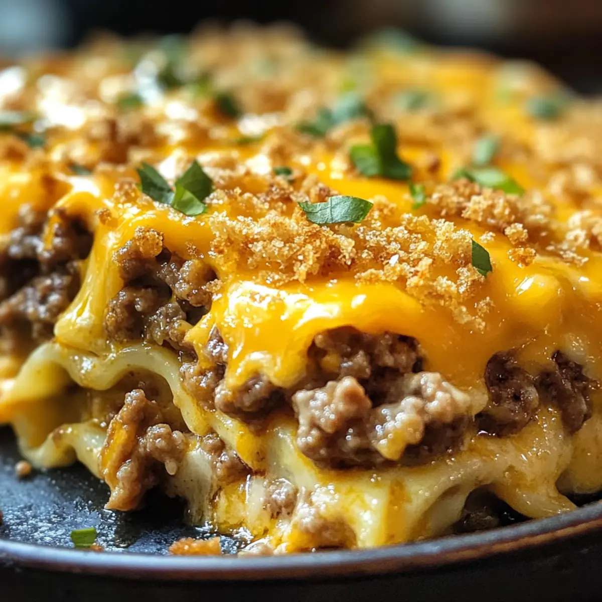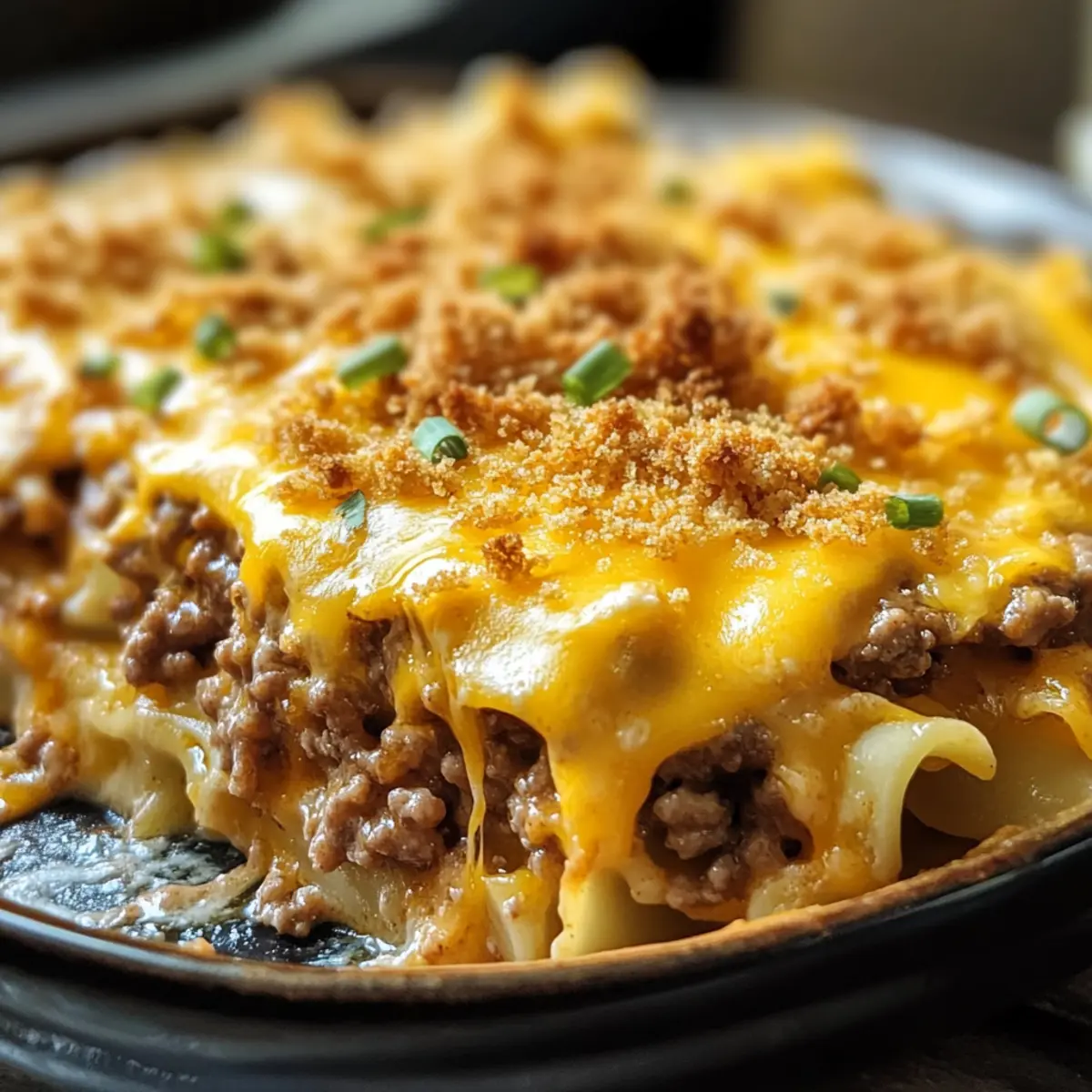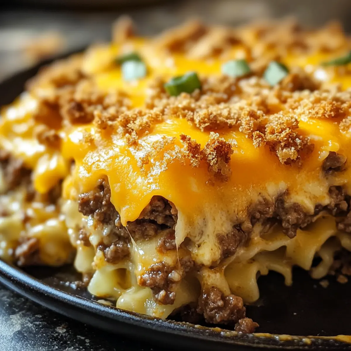 Herzhafter Genuss: Die Kombination aus geschmolzenem Käse, würzigem Hackfleisch und zarten Nudeln sorgt für ein geschmackliches Erlebnis, das deine Geschmacksknospen verwöhnt.