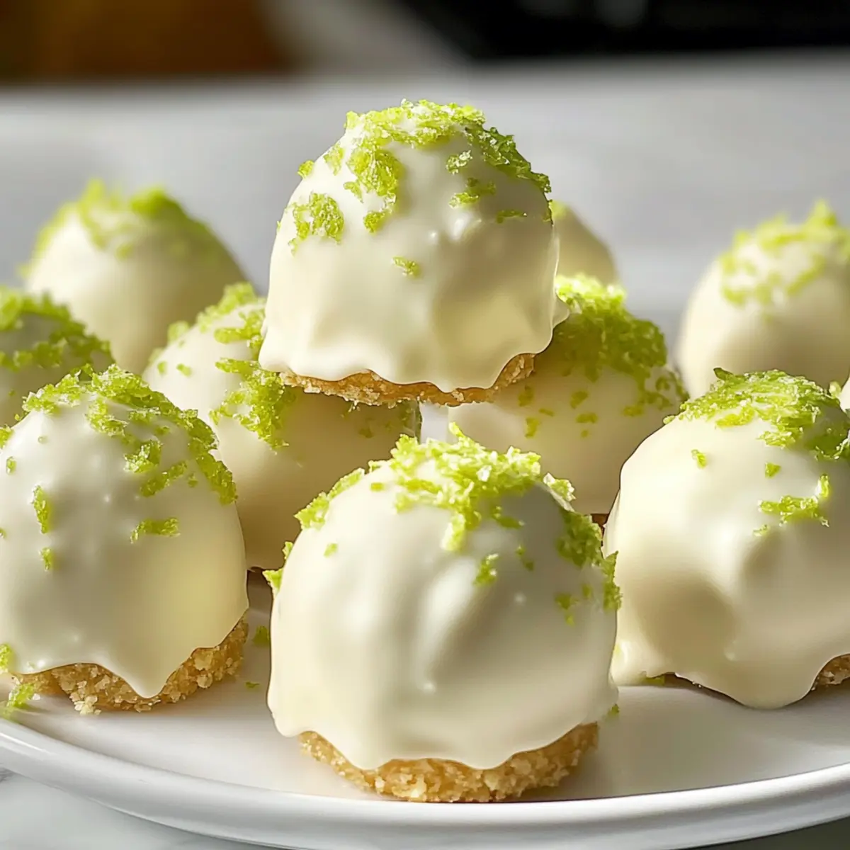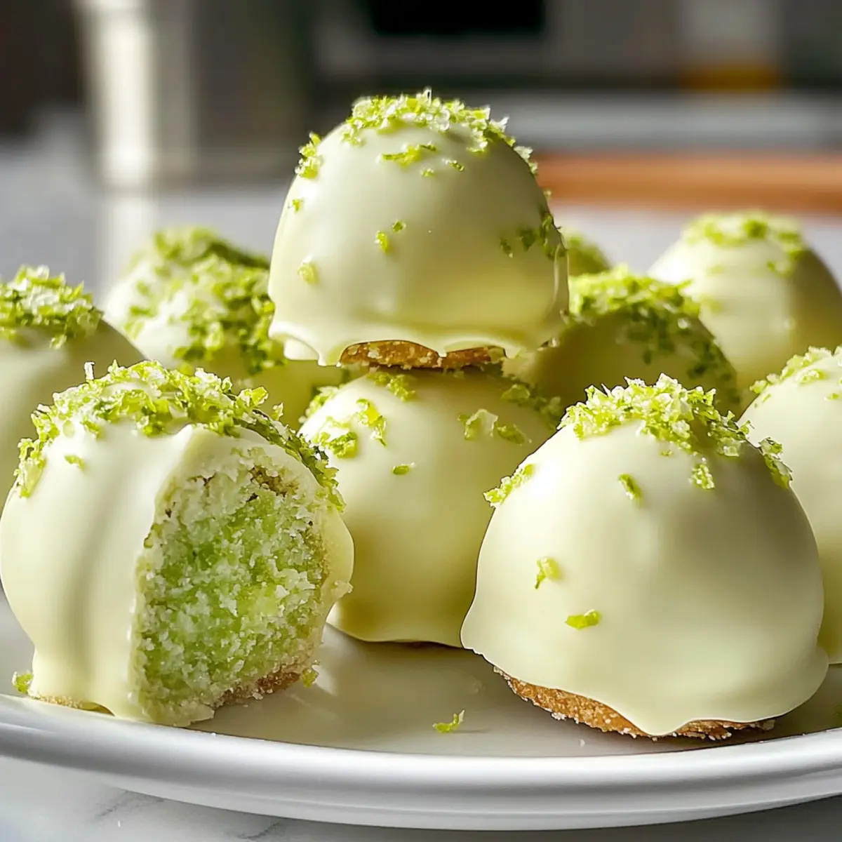 Leckere Key Lime Trüffel mit cremiger Füllung und weißer Schokoladenschicht, ideal für Sommerpartys.